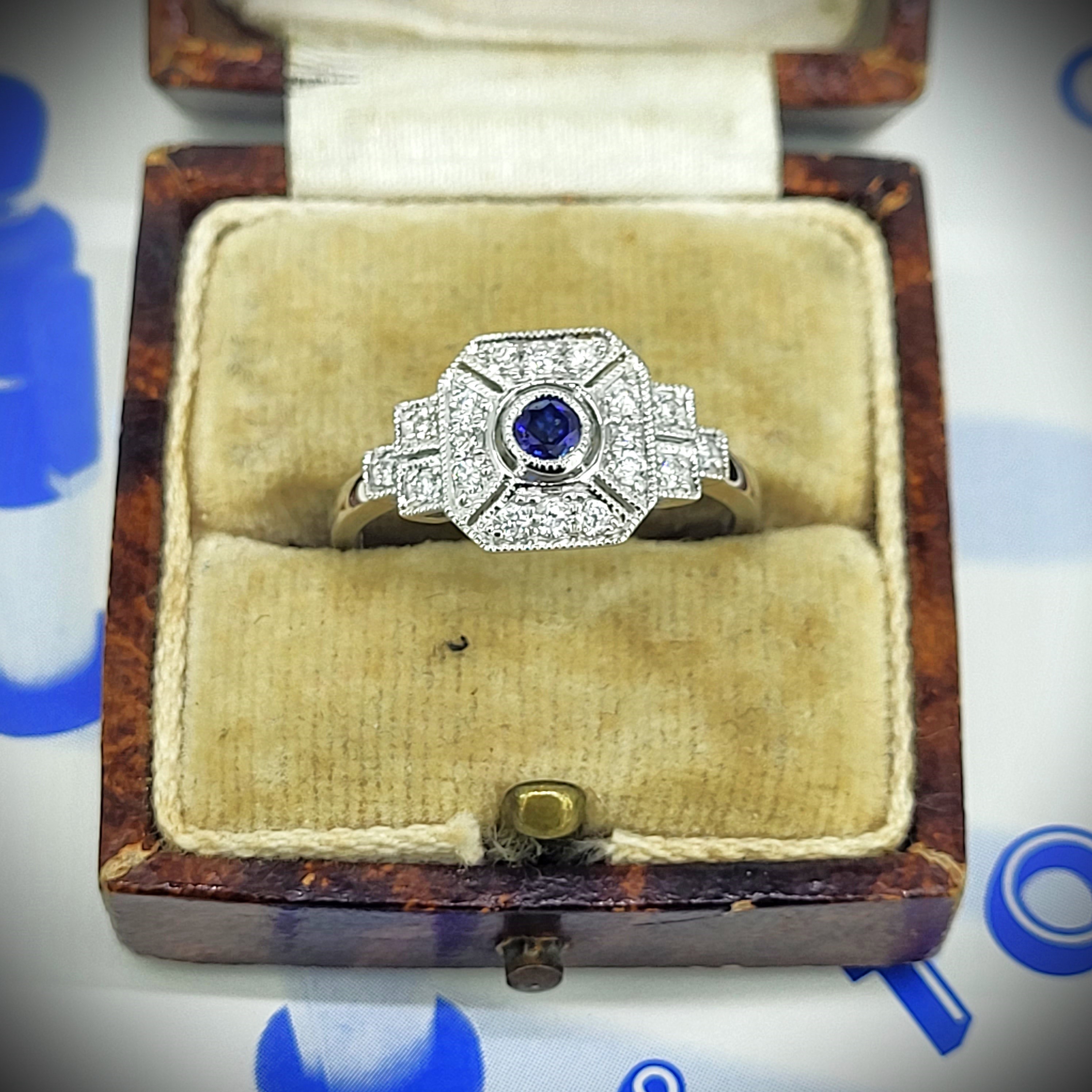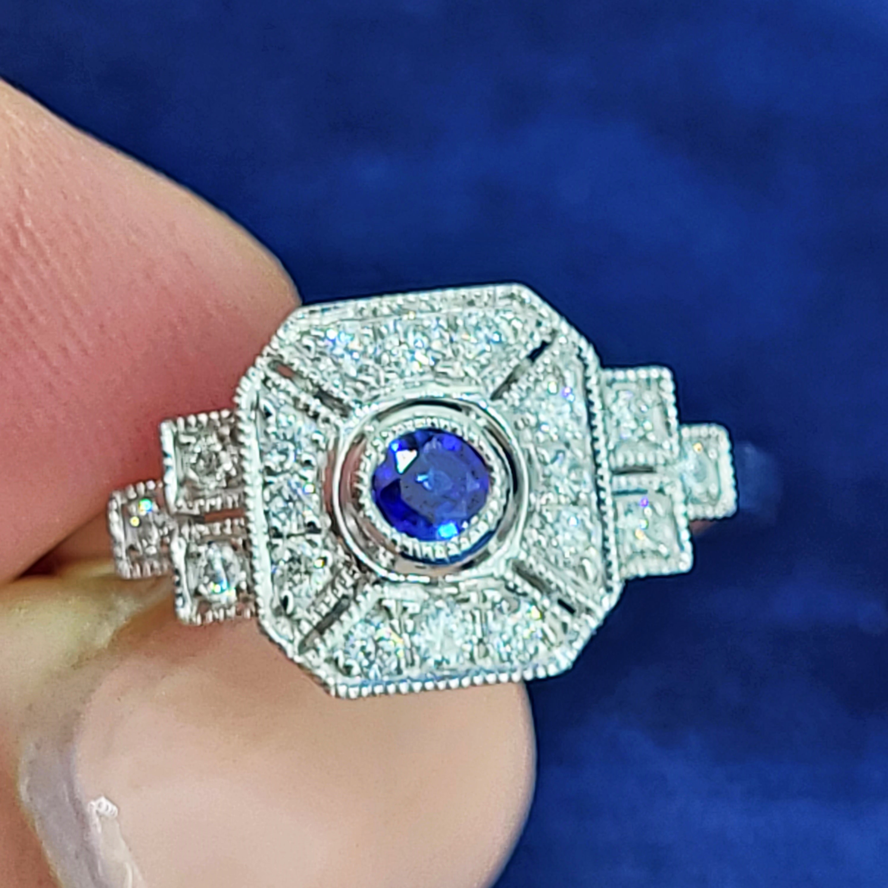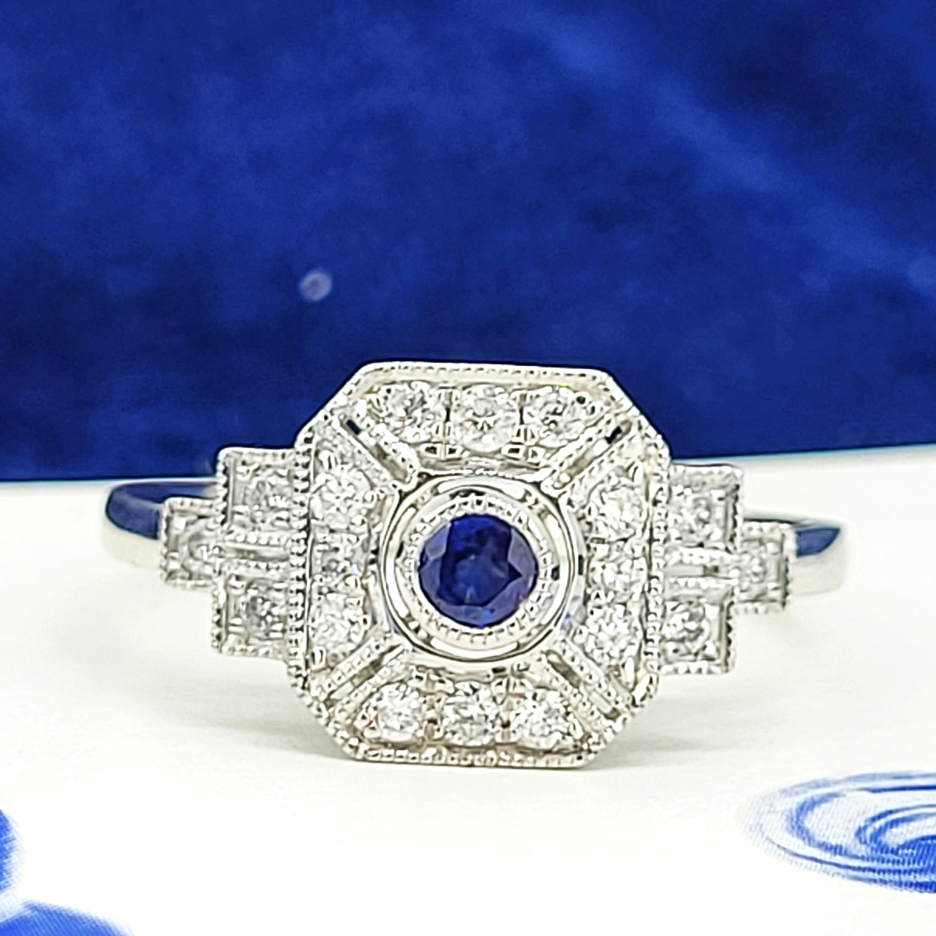 A gorgeous Sapphire and Diamond Art Deco Ring crafted from Platinum.