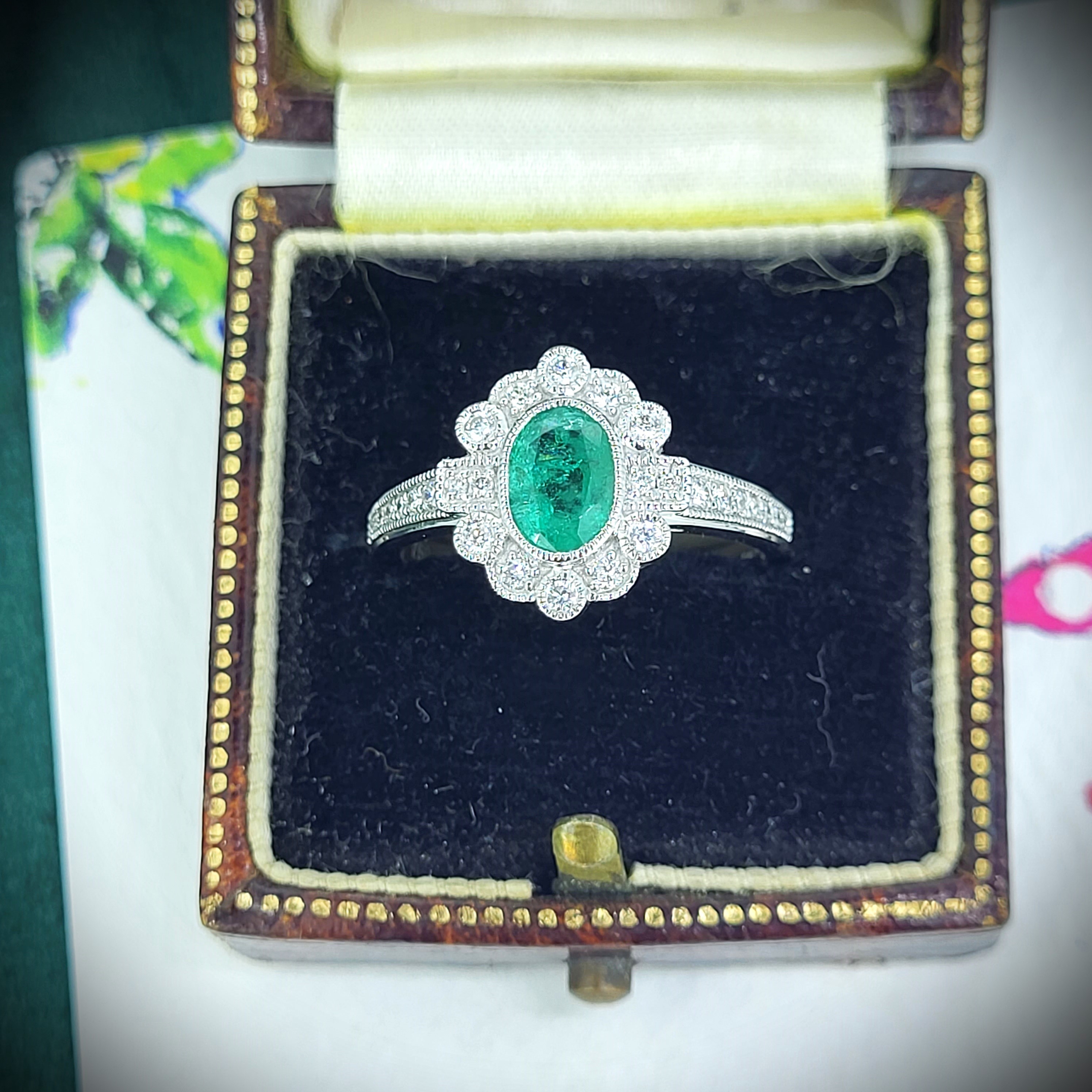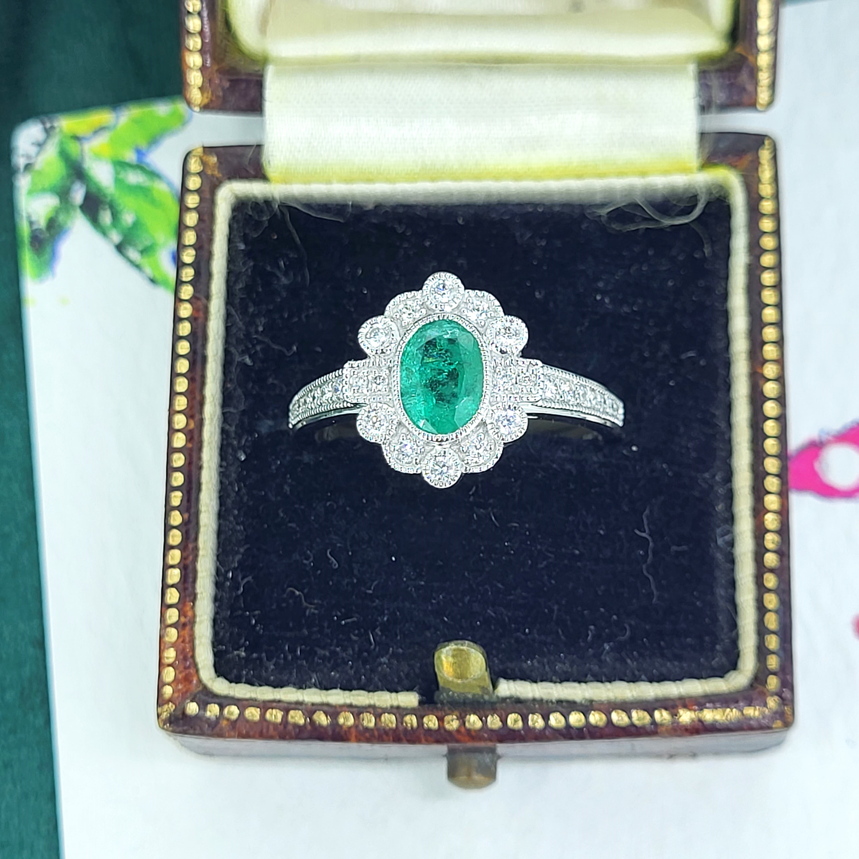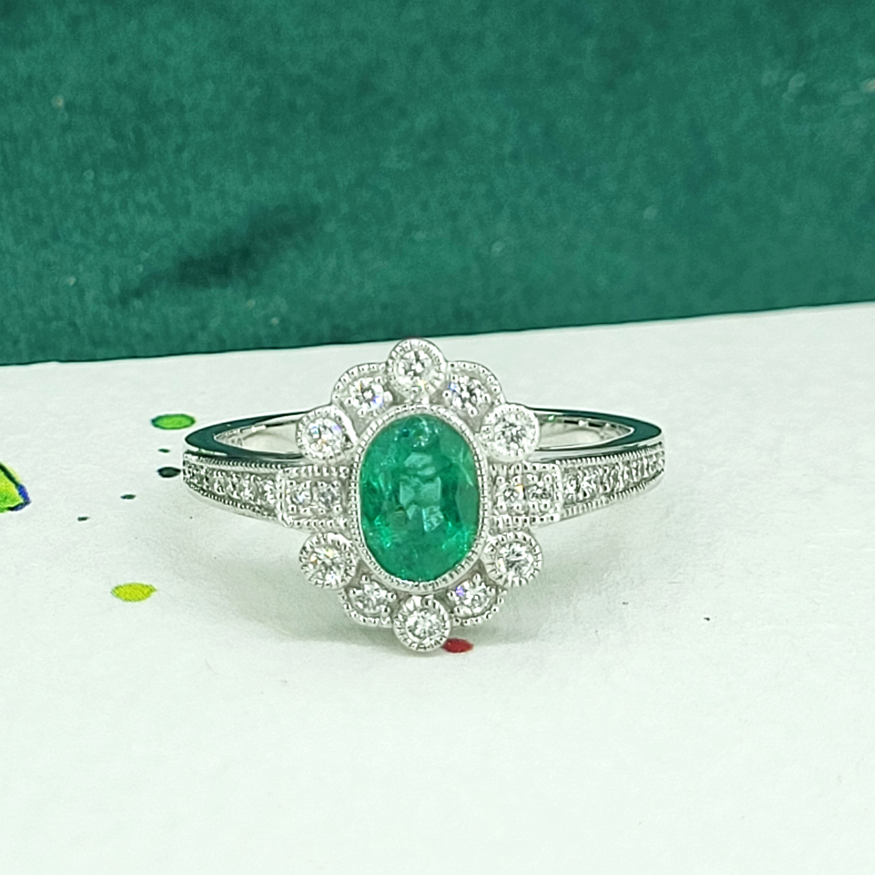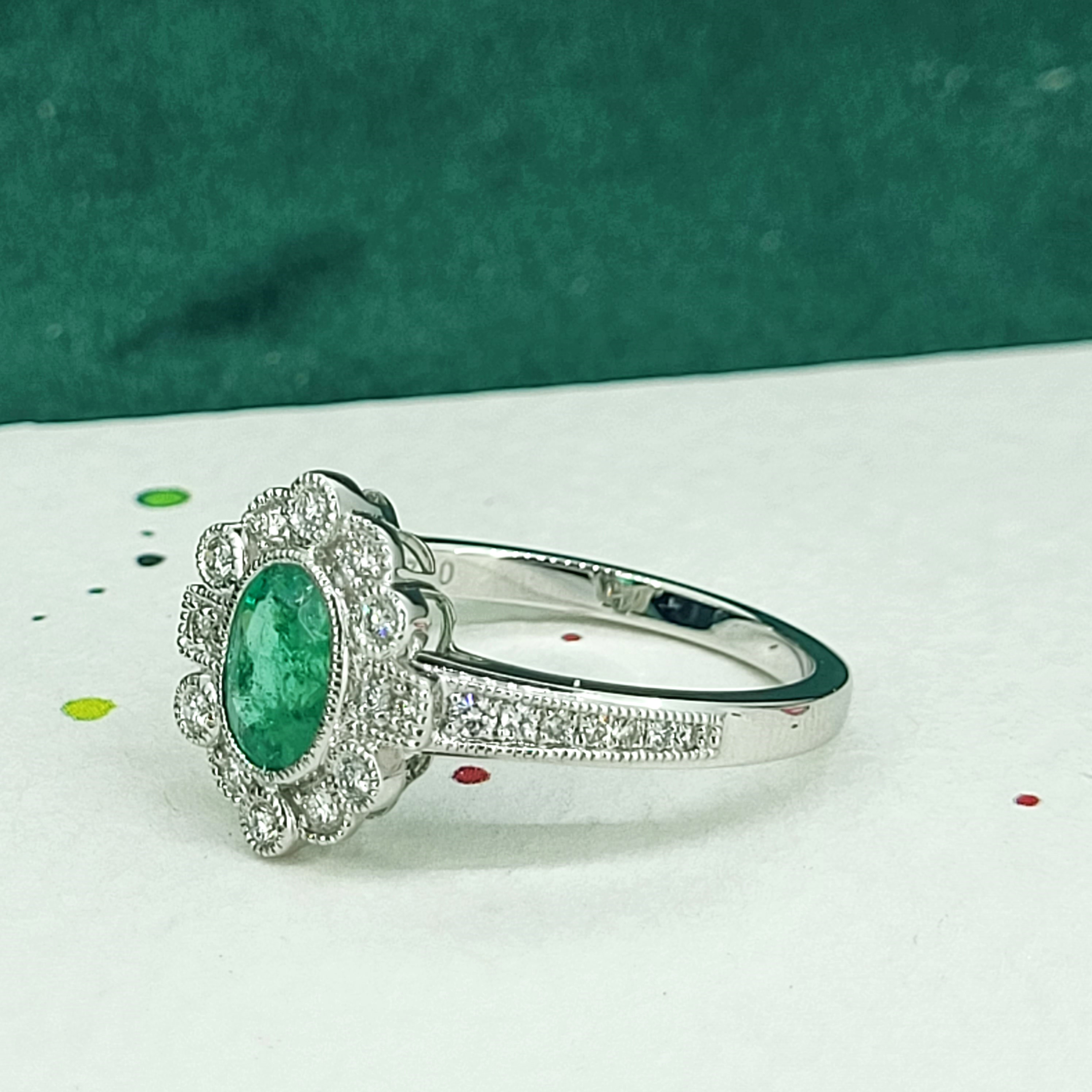 The ring is crafted from 18ct White Gold and features a central oval Emerald measuring 5mm by 7mm, weighing 0.85cts. The Emerald is surrounded by grain set Round Brilliant Diamonds weighing 0.25cts. These Diamonds are set at alternating heights with the higher ones replicating a flower shape.
