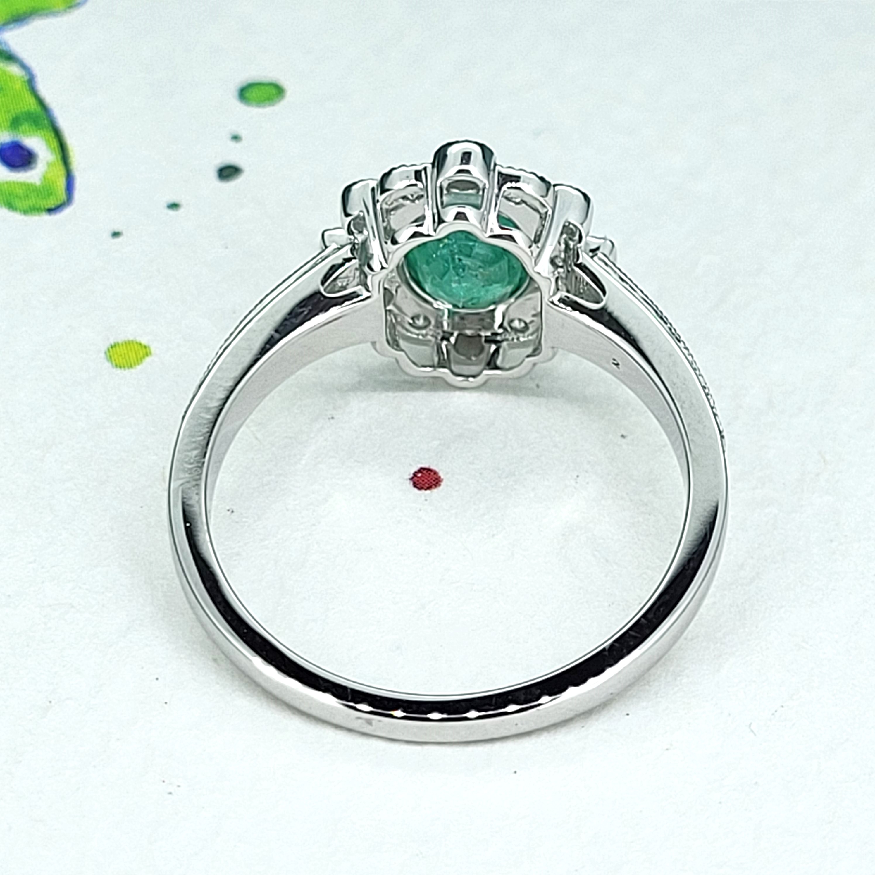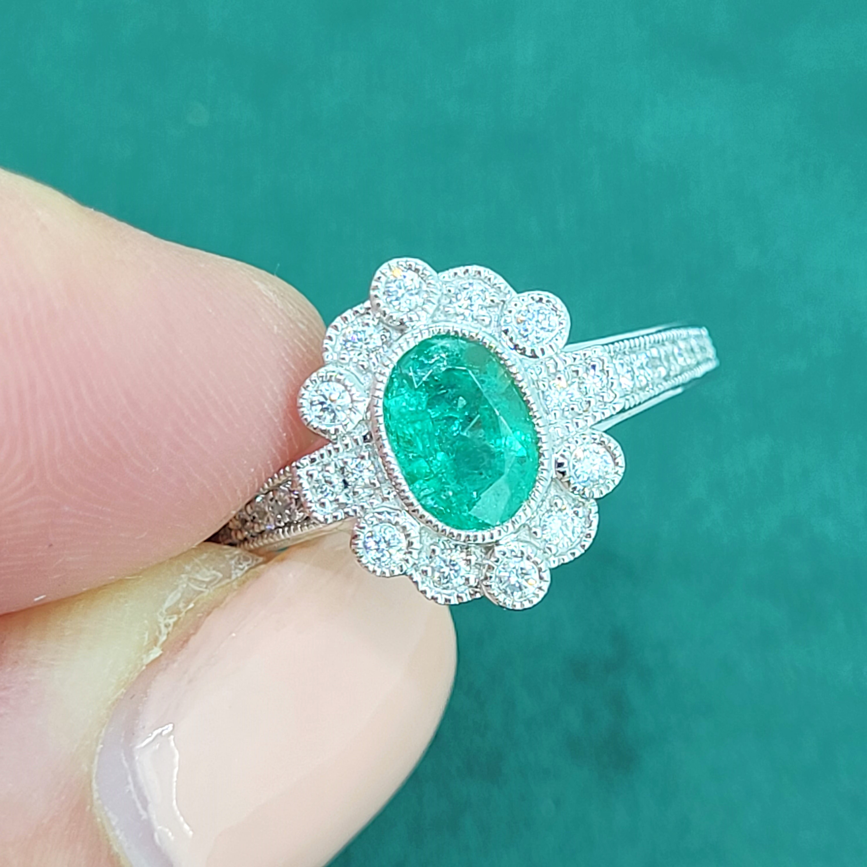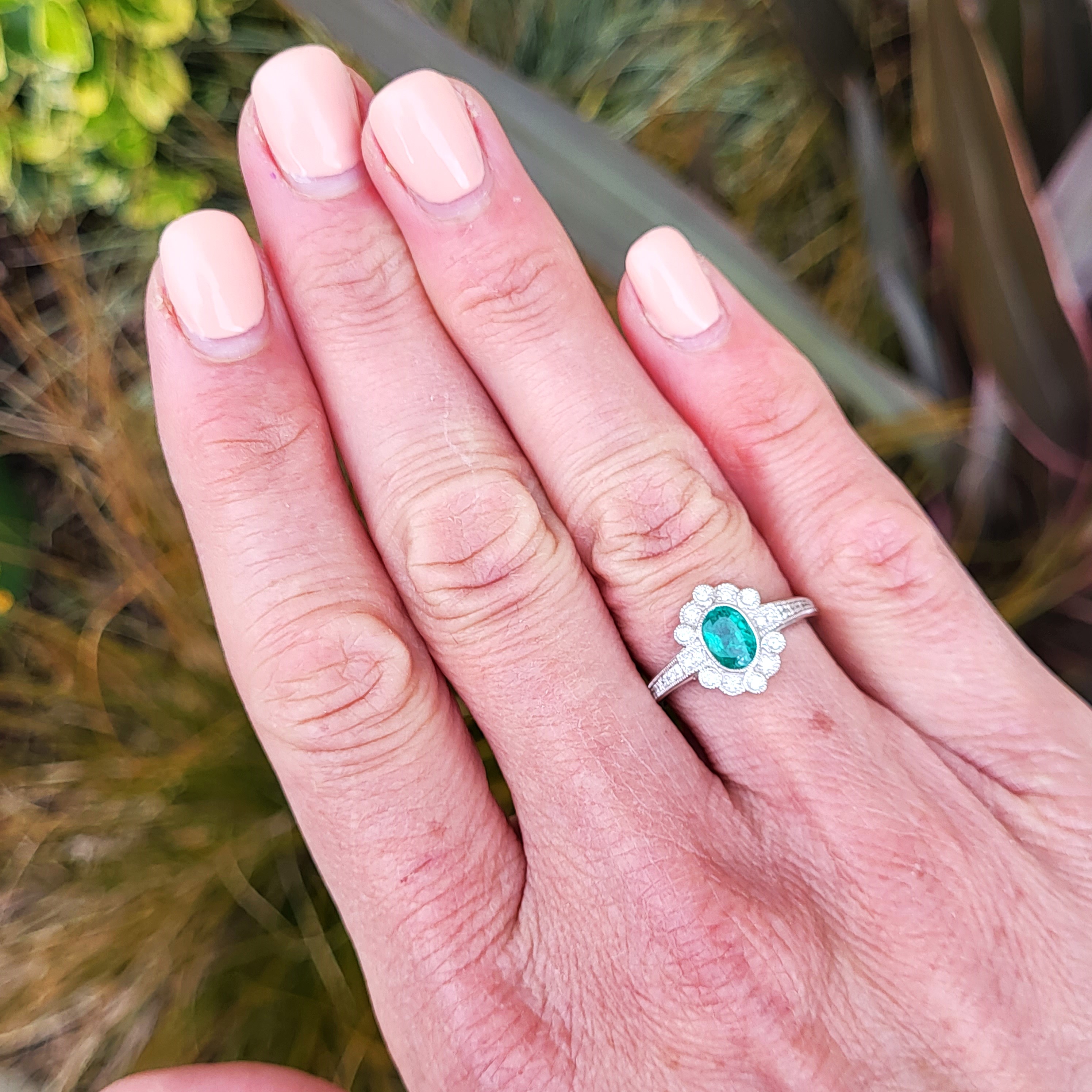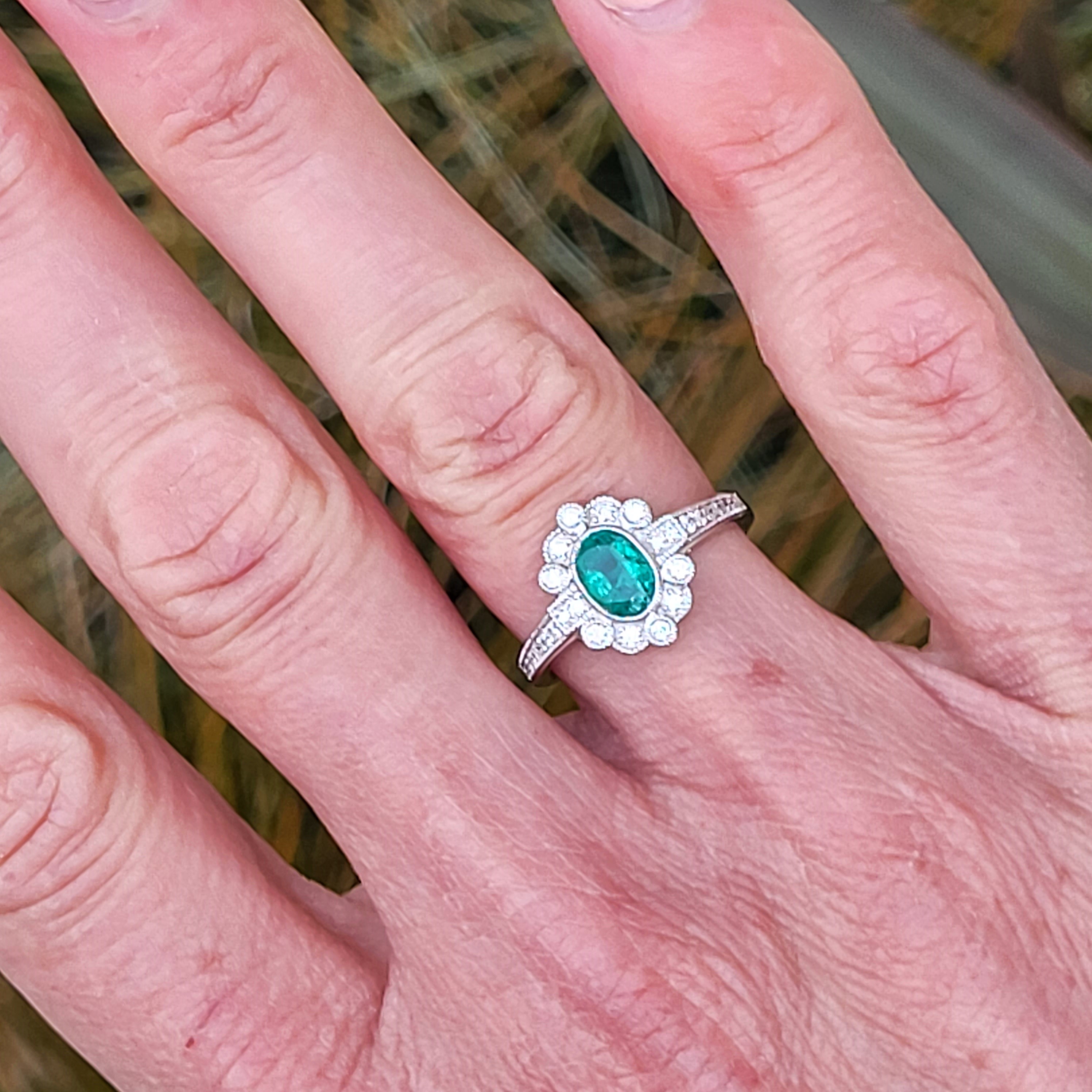 The ring is crafted from 18ct White Gold and features a central oval Emerald measuring 5mm by 7mm, weighing 0.85cts. The Emerald is surrounded by grain set Round Brilliant Diamonds weighing 0.25cts. These Diamonds are set at alternating heights with the higher ones replicating a flower shape.