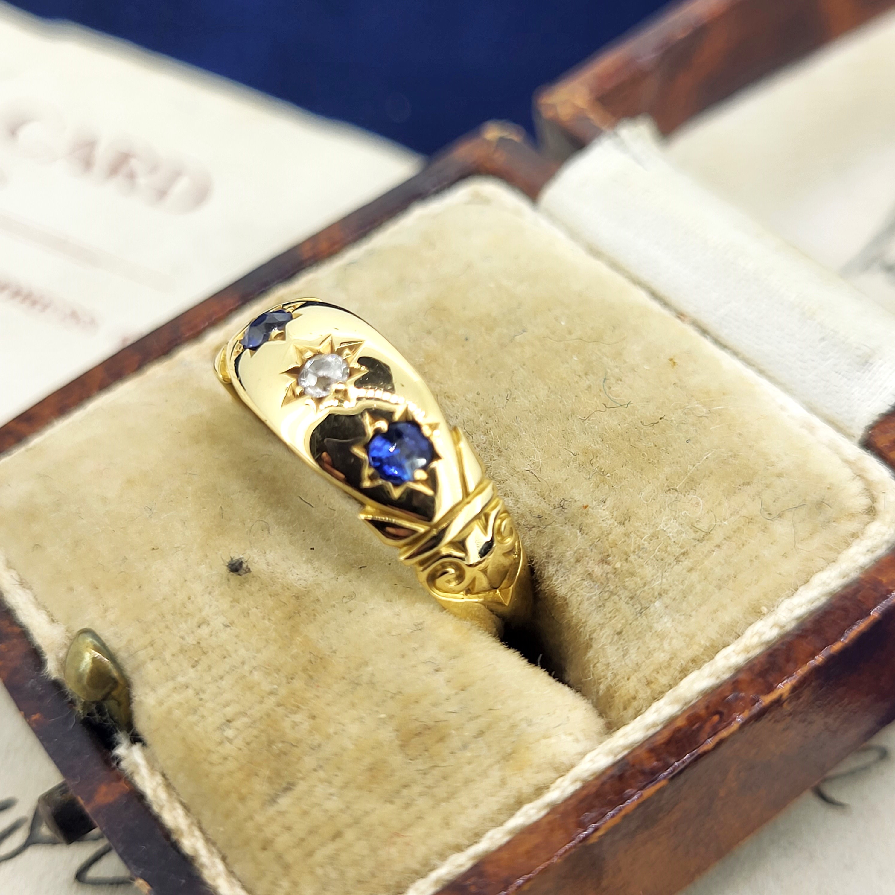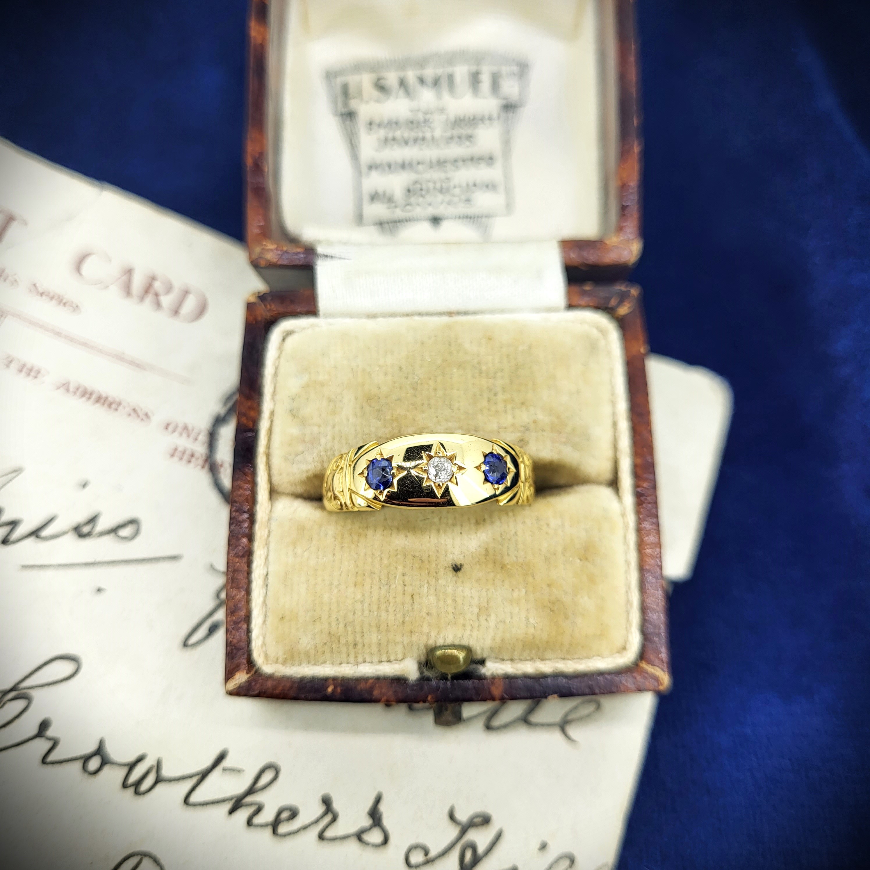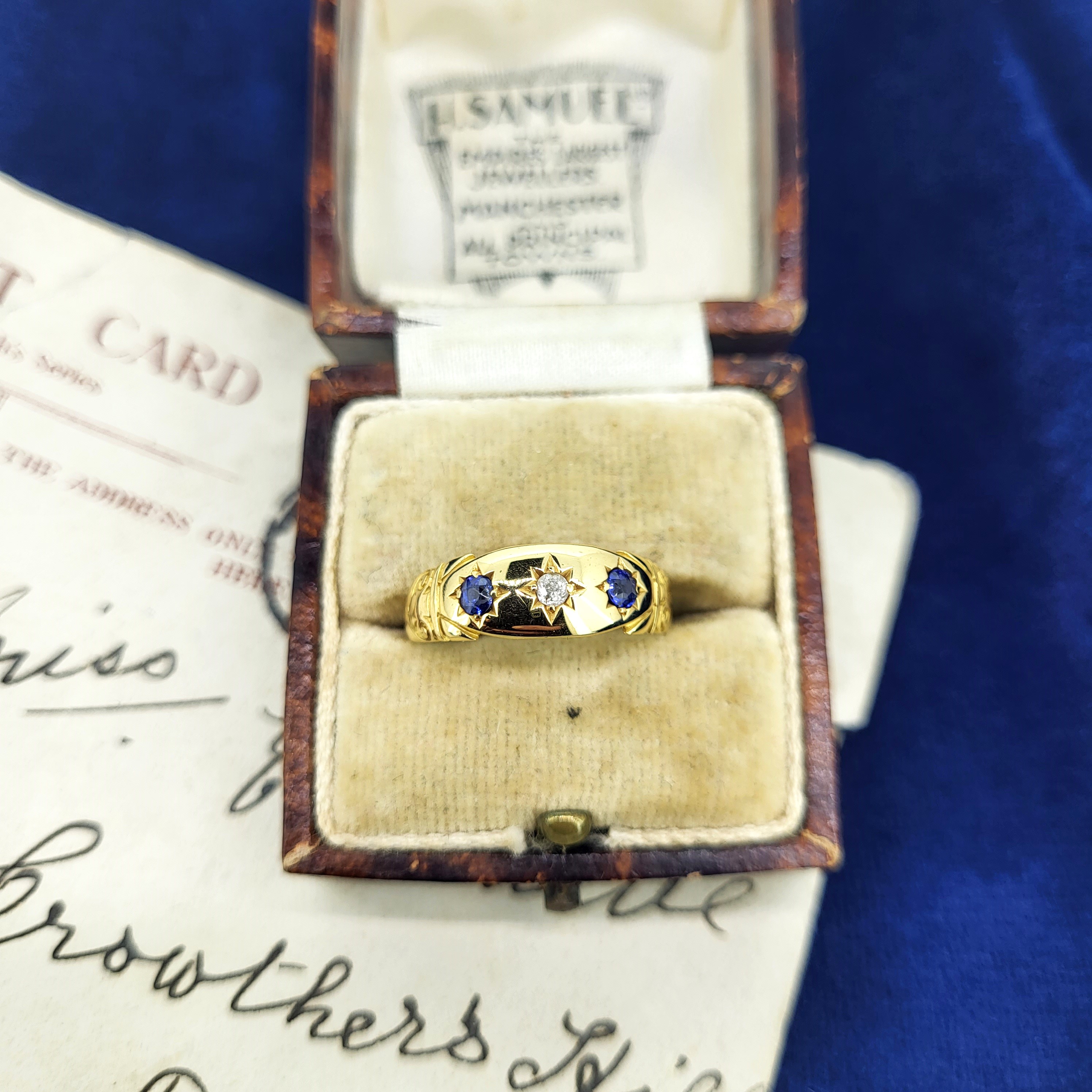 The ring features vibrant star set Sapphires and a star set Diamond in the centre.