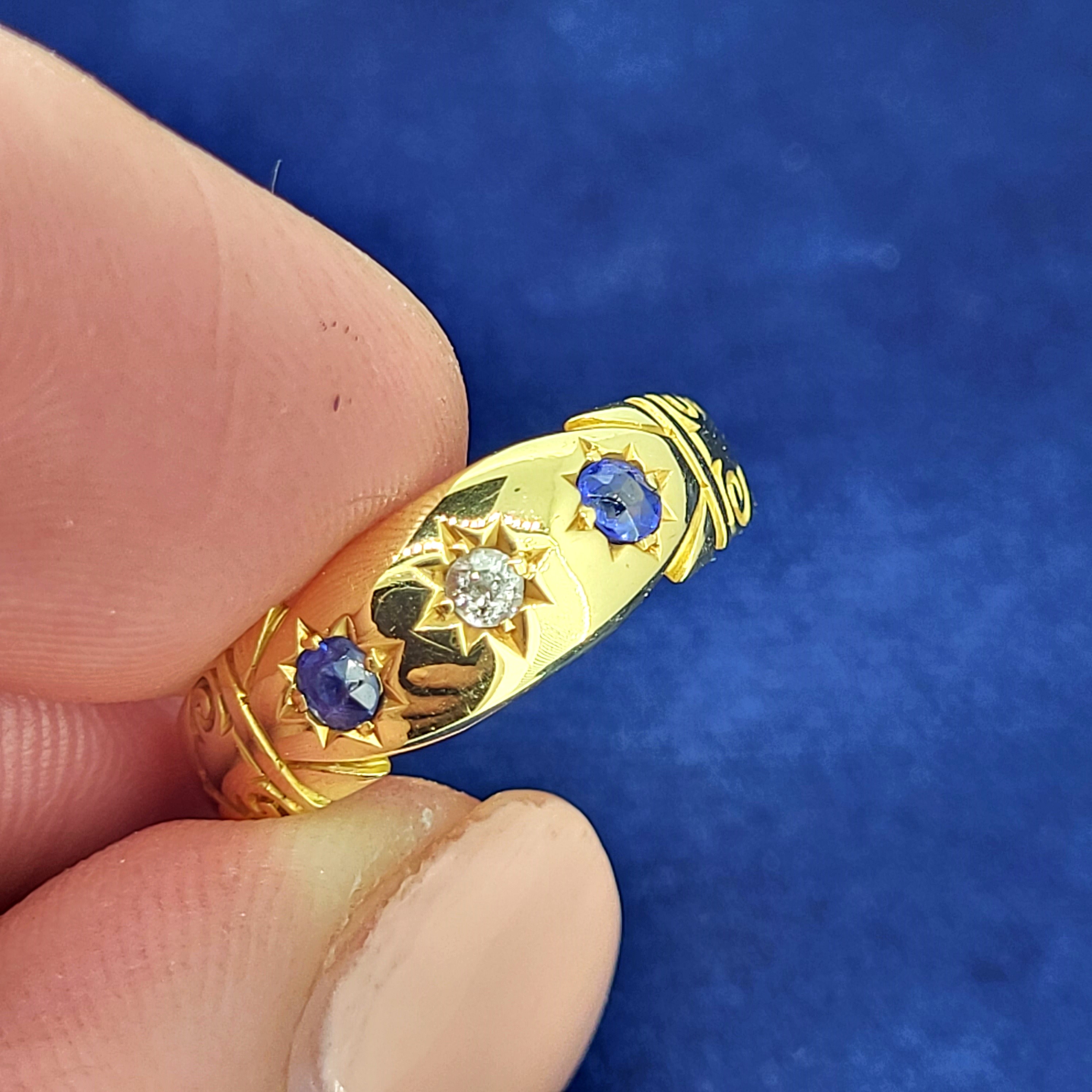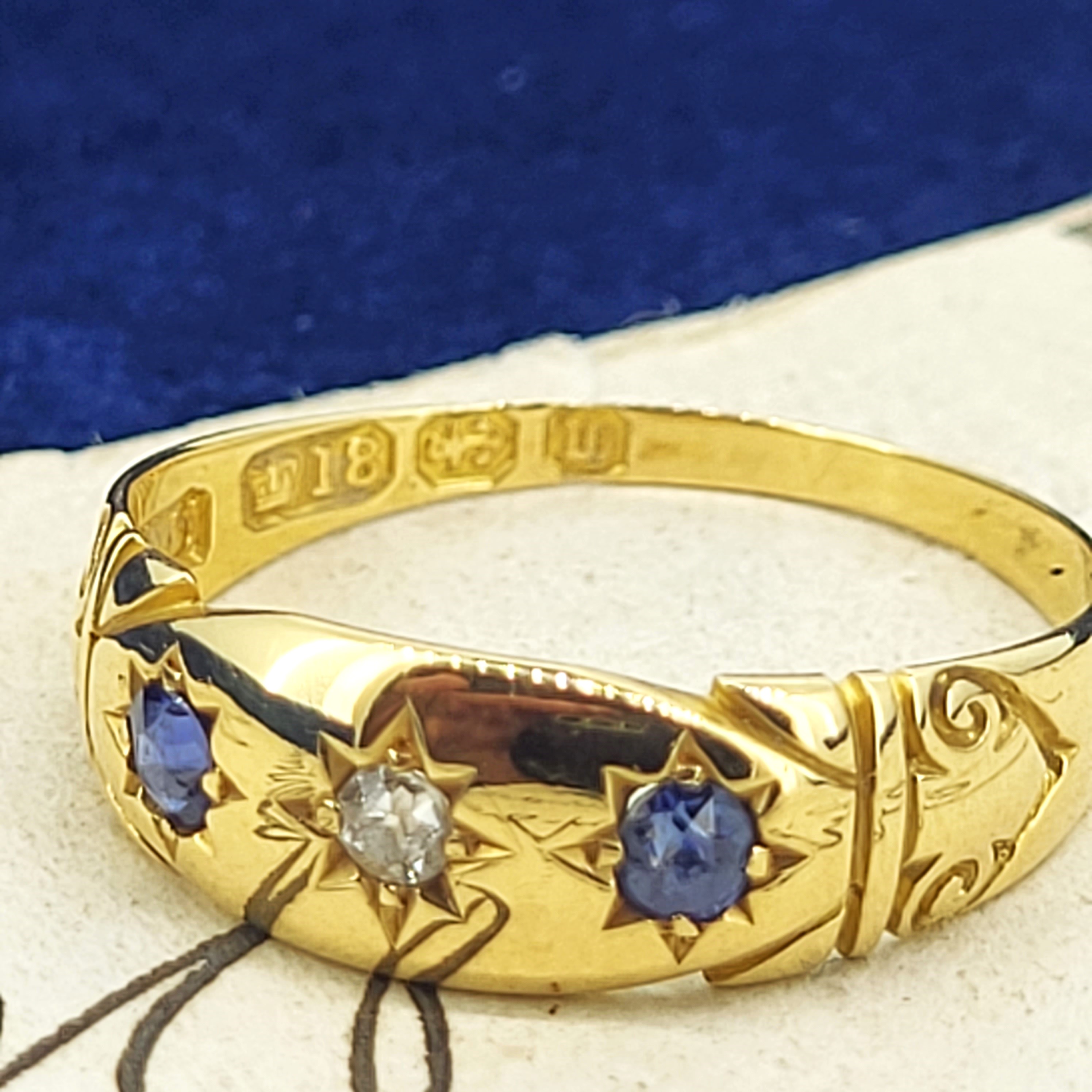The ring was hallmarked in Birmingham during 1896 - 1897 and has scroll work engraved on the shoulders.