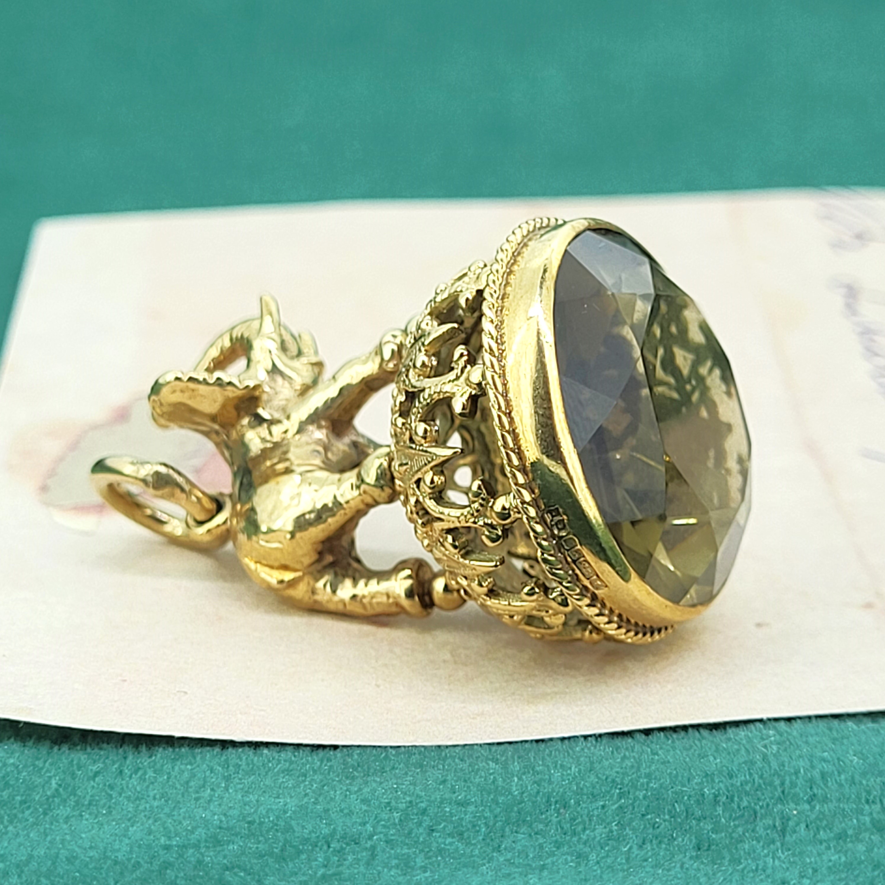 The base of this charm measures 23mm and it measures 35mm in height. It is set with a faceted smoky quartz on the underneath and it is fully hallmarked on its side. The design is incredibly detailed with intricate detailing on the gold that in cases the gemstone and rope design that wraps around the base.