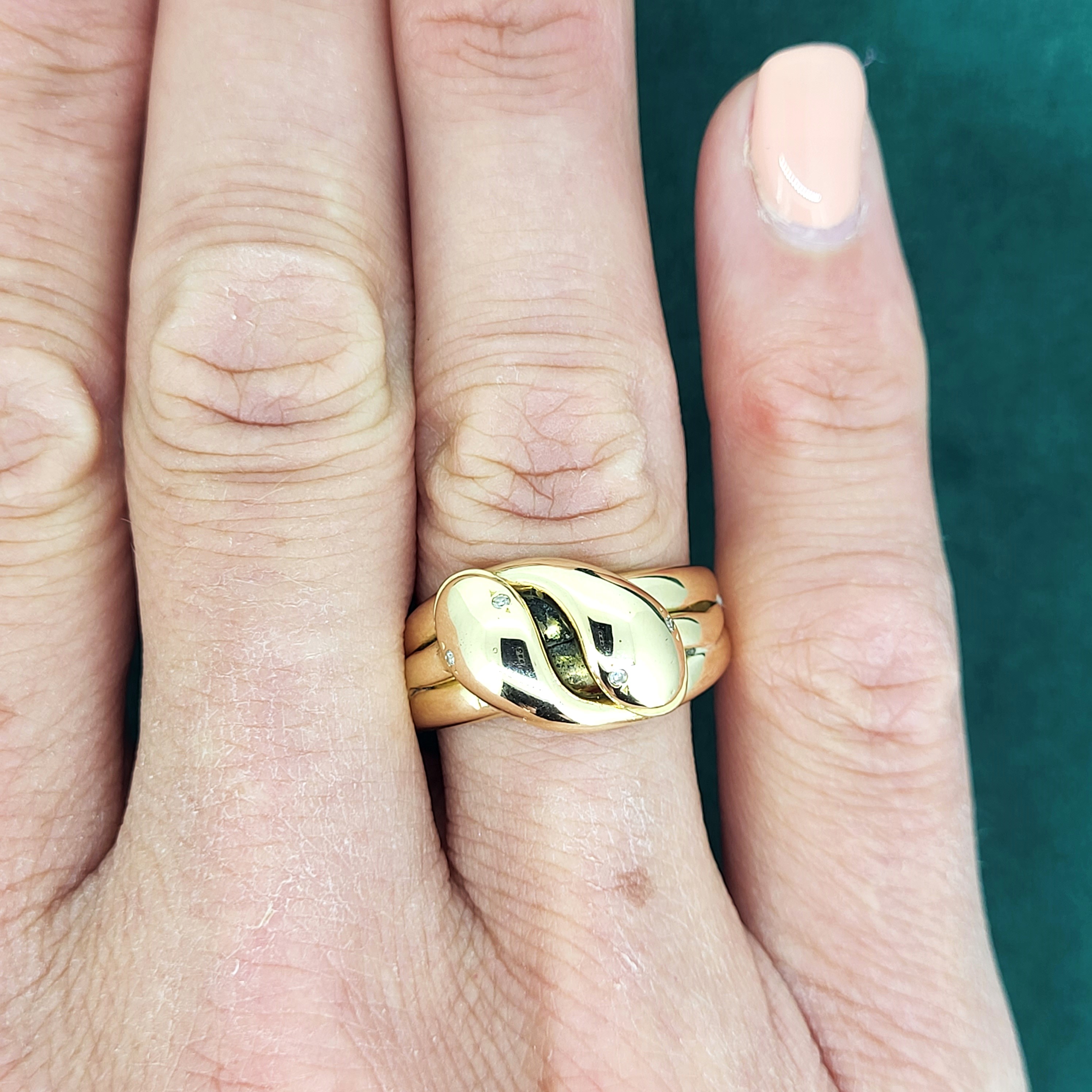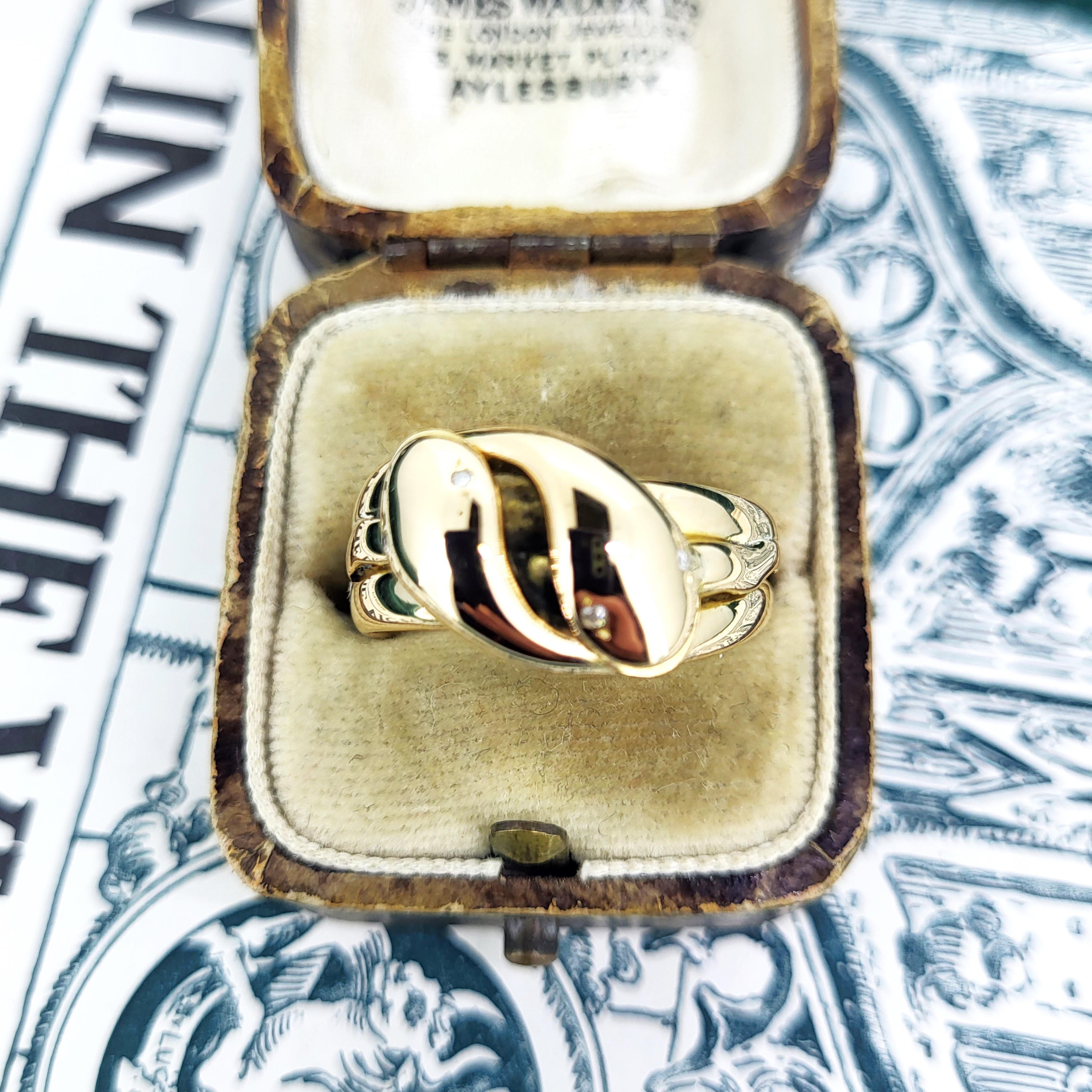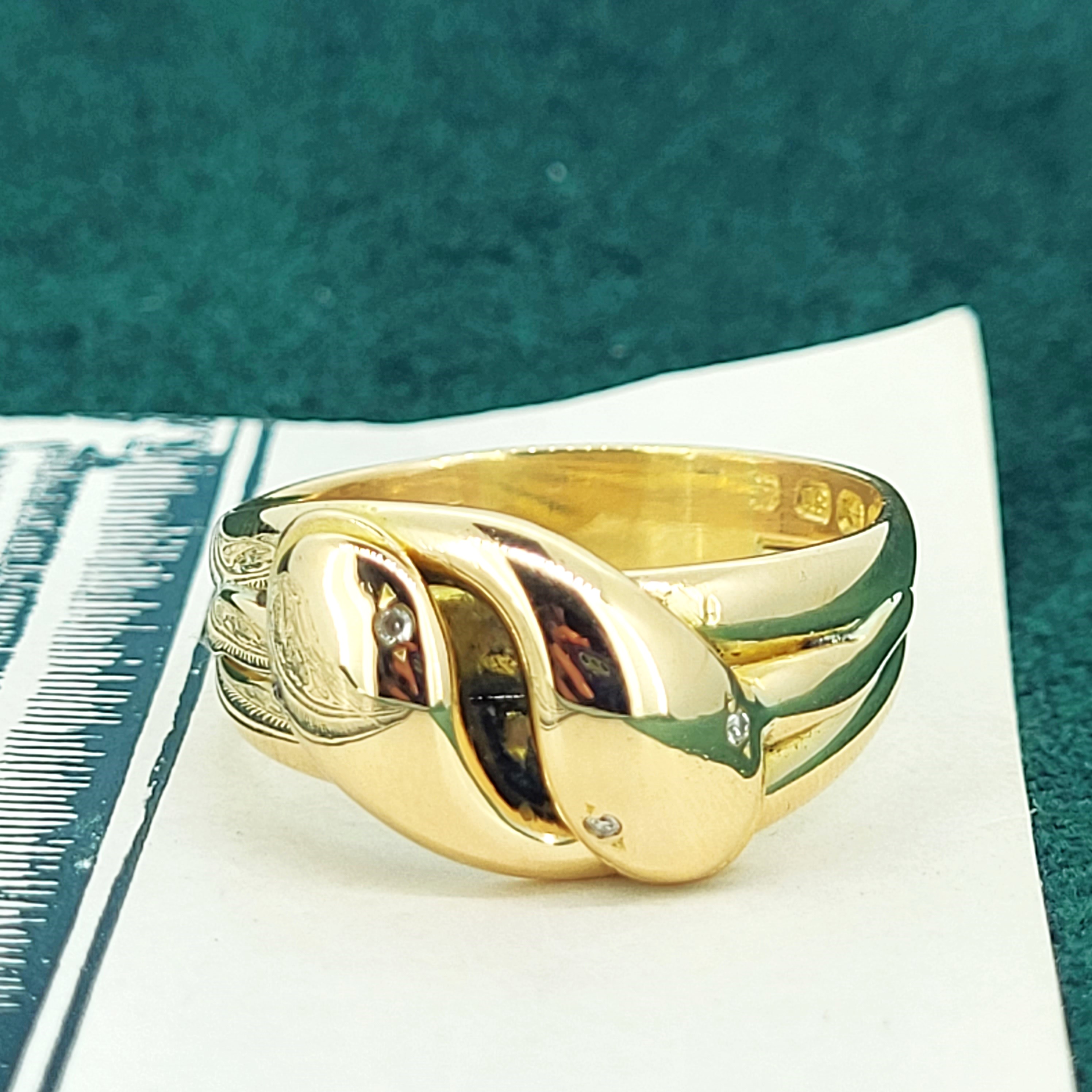 It features two identical rings merged together with both snakes heads being set with diamond eyes. The ring spreads from 6mm to 12mm in width and looks stunning on the hand. It is bound to capture the attention of others and make a statement!