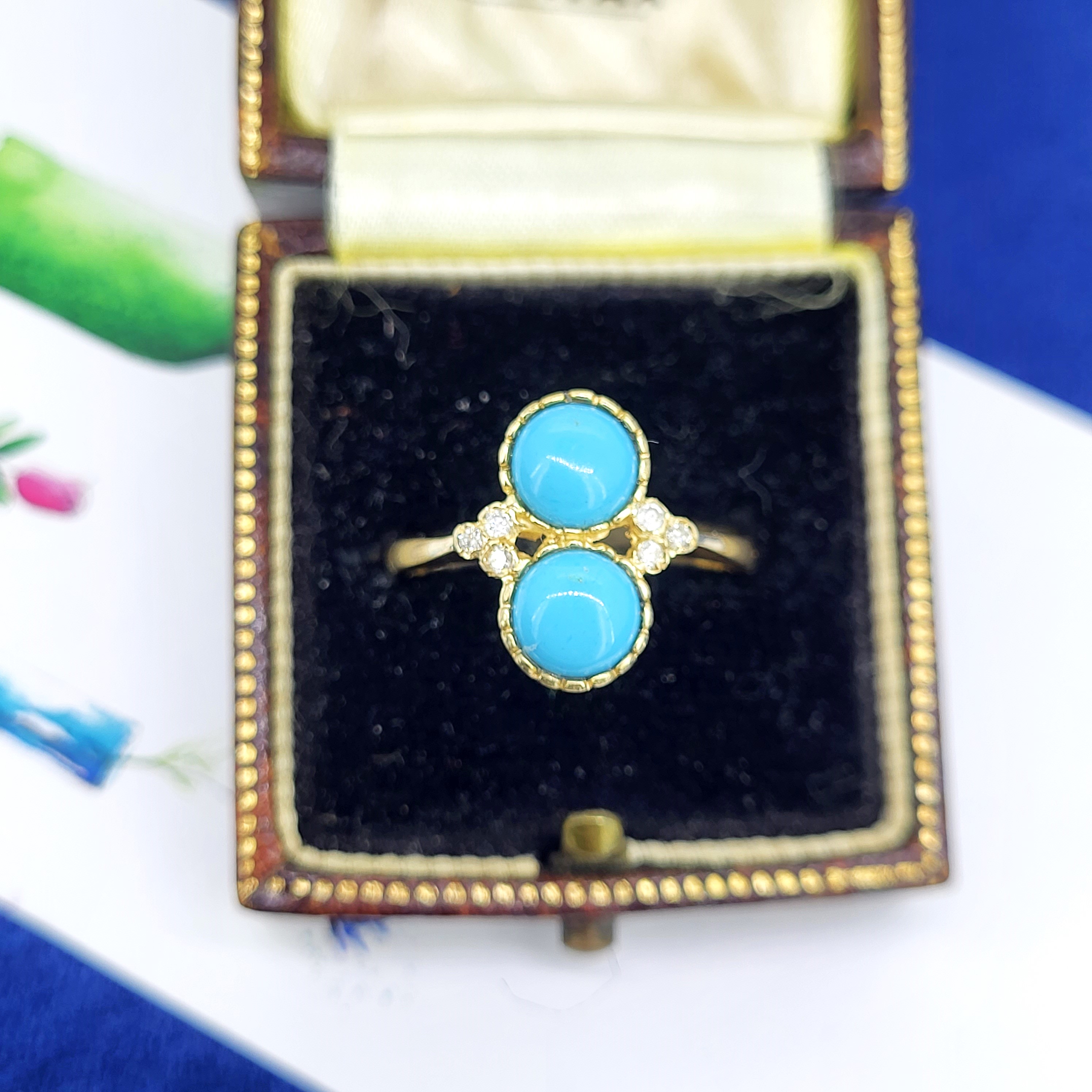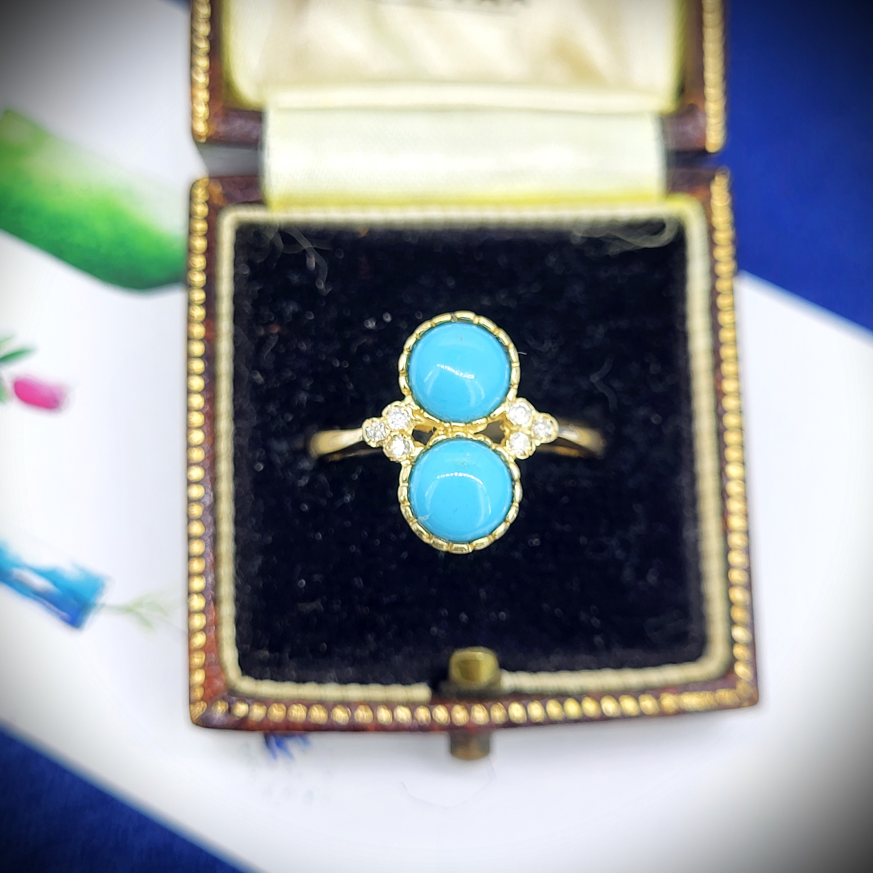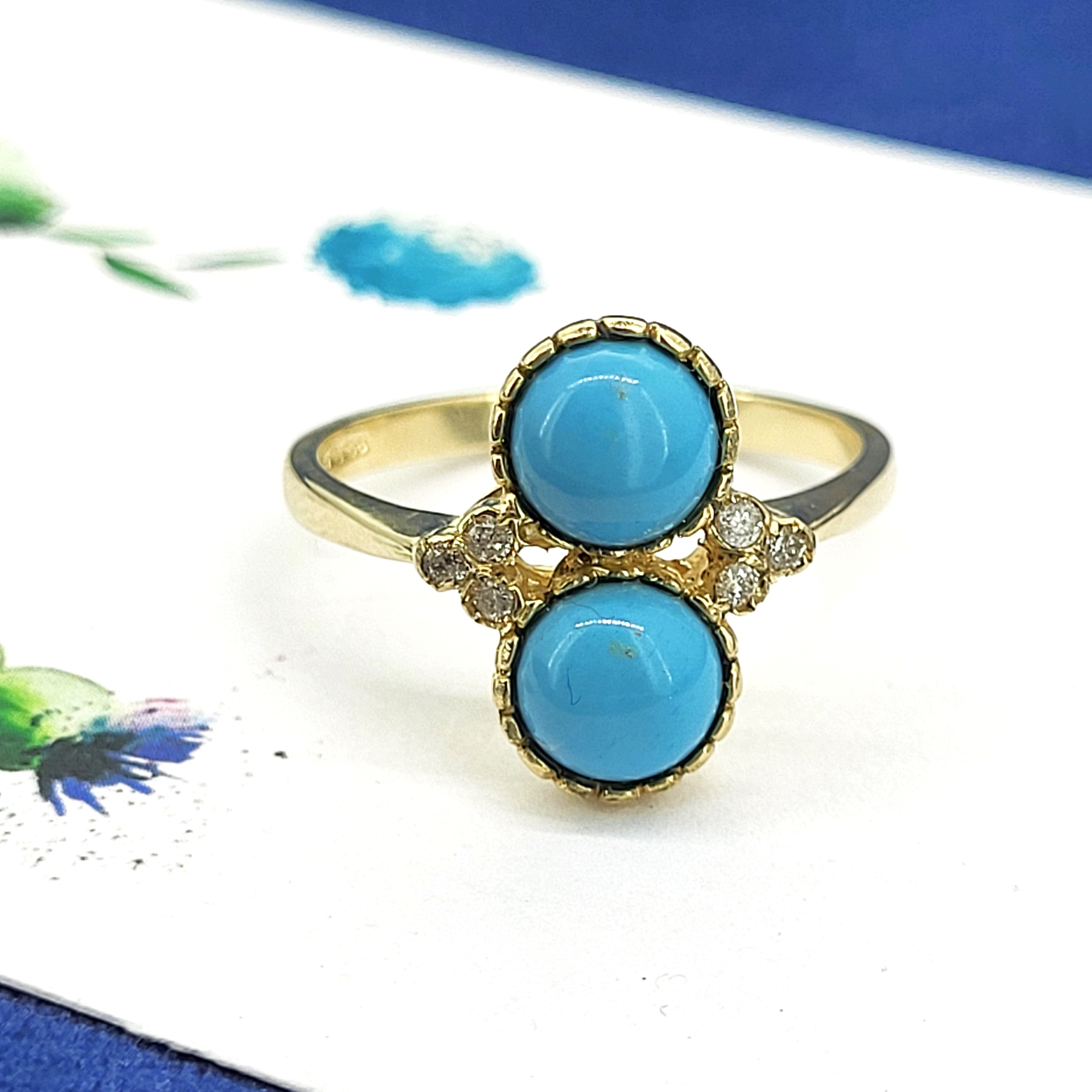 The ring features two Cabochon Turquoise Gemstones set in a rub-over setting that measure 6.5mm each. These are accompanied by three diamonds either side that weigh 0.10cts in total.