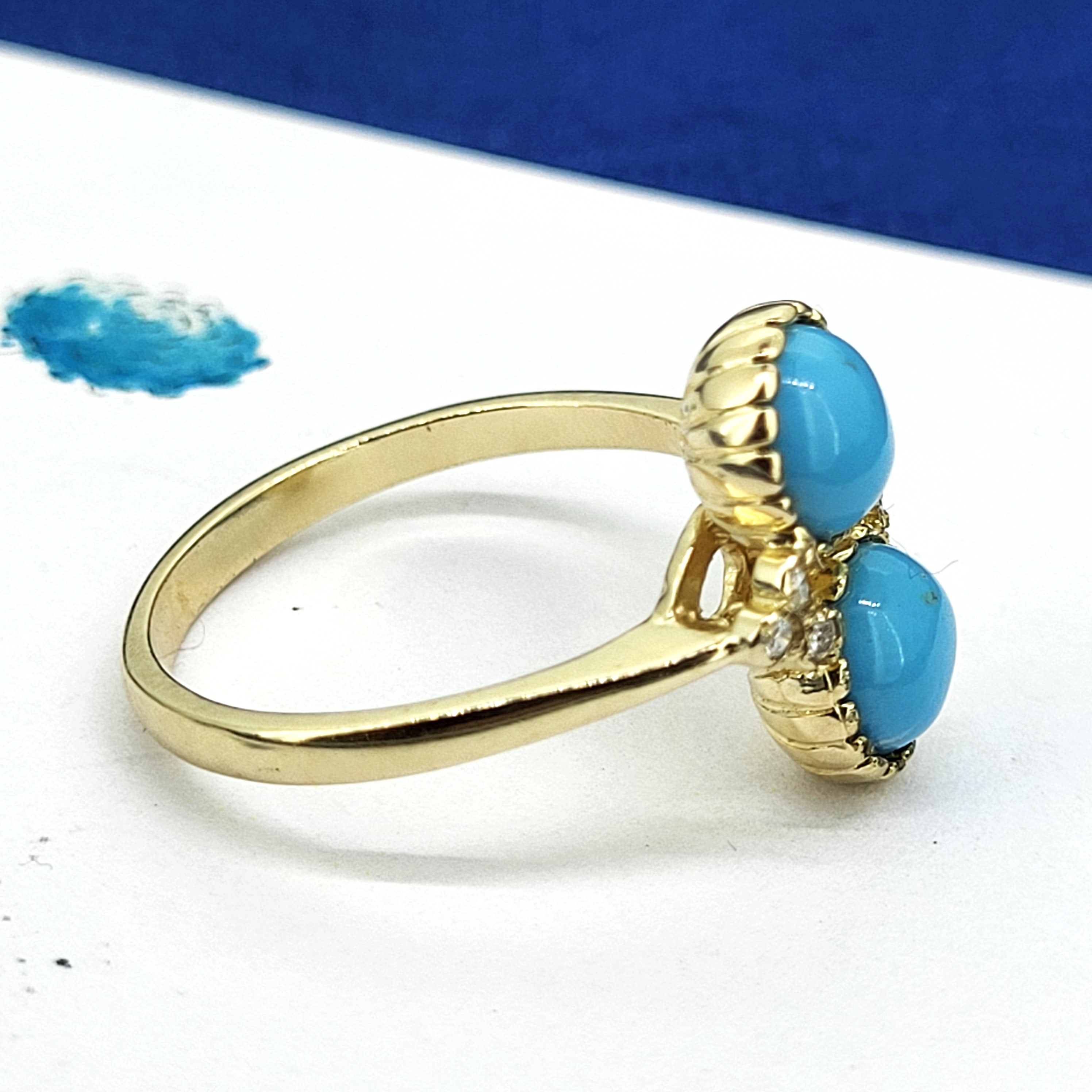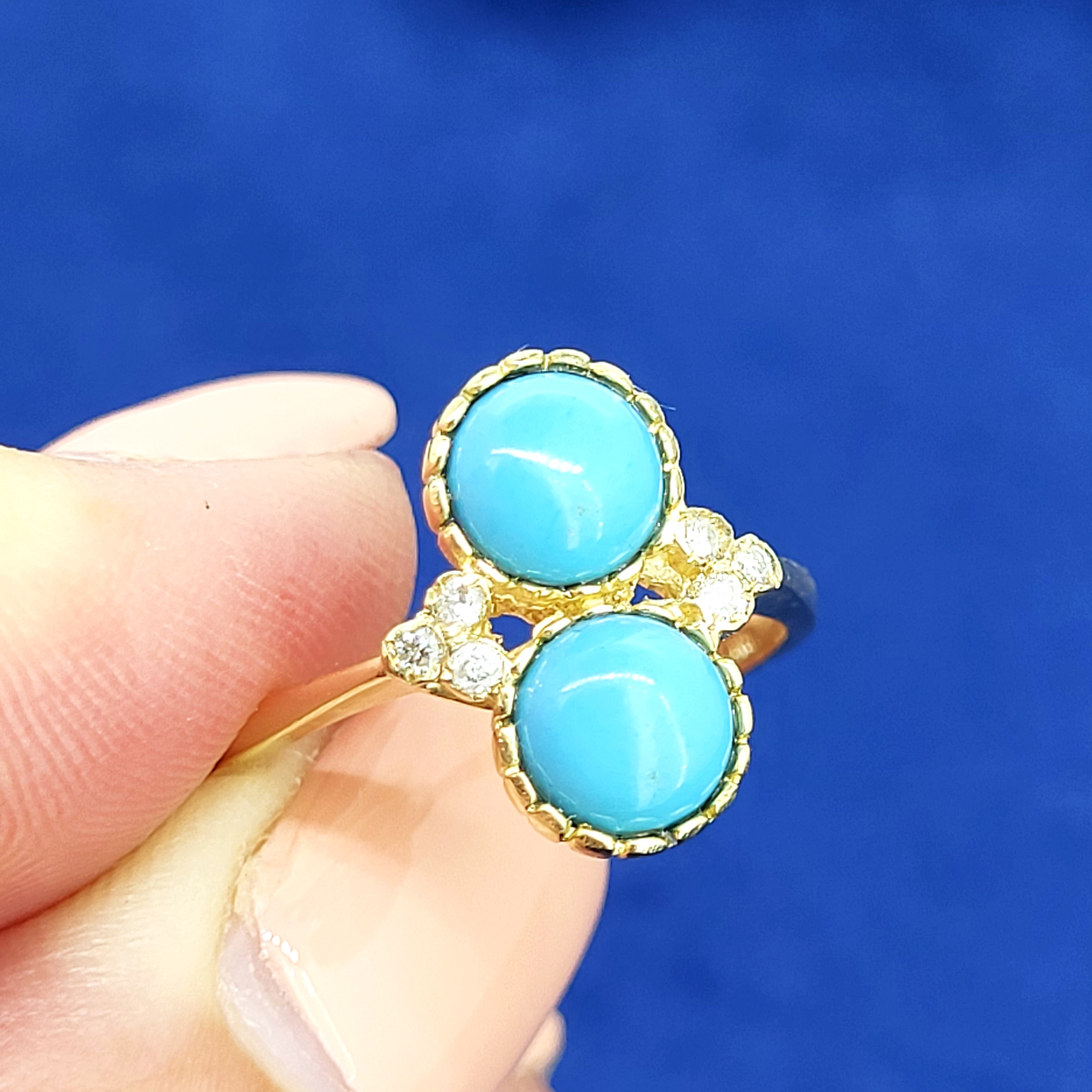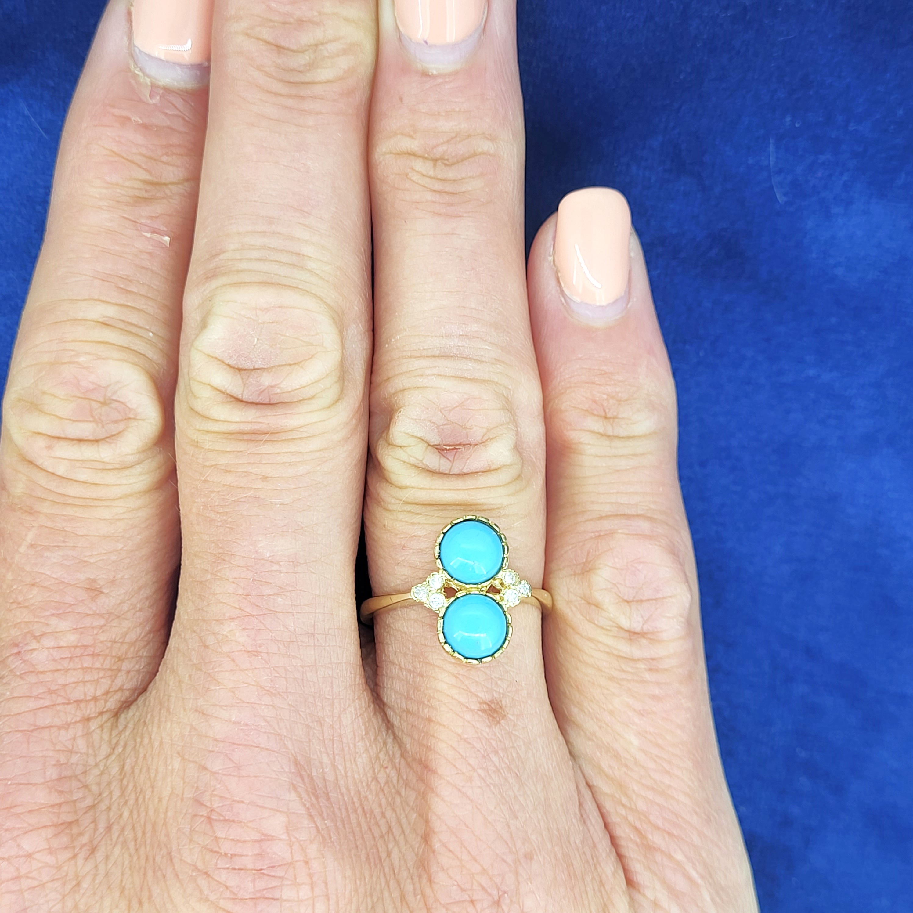 The ring features two Cabochon Turquoise Gemstones set in a rub-over setting that measure 6.5mm each. These are accompanied by three diamonds either side that weigh 0.10cts in total.