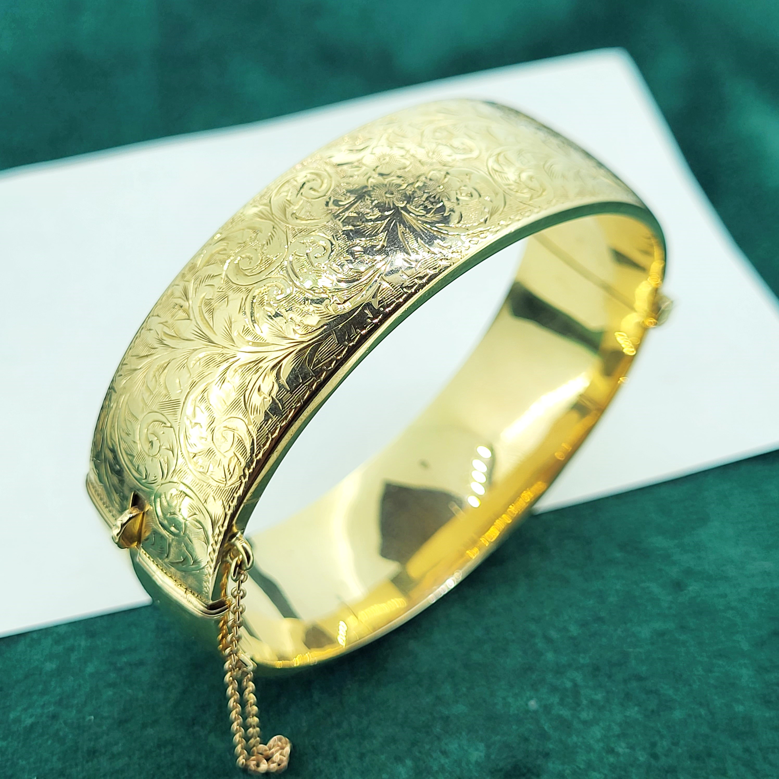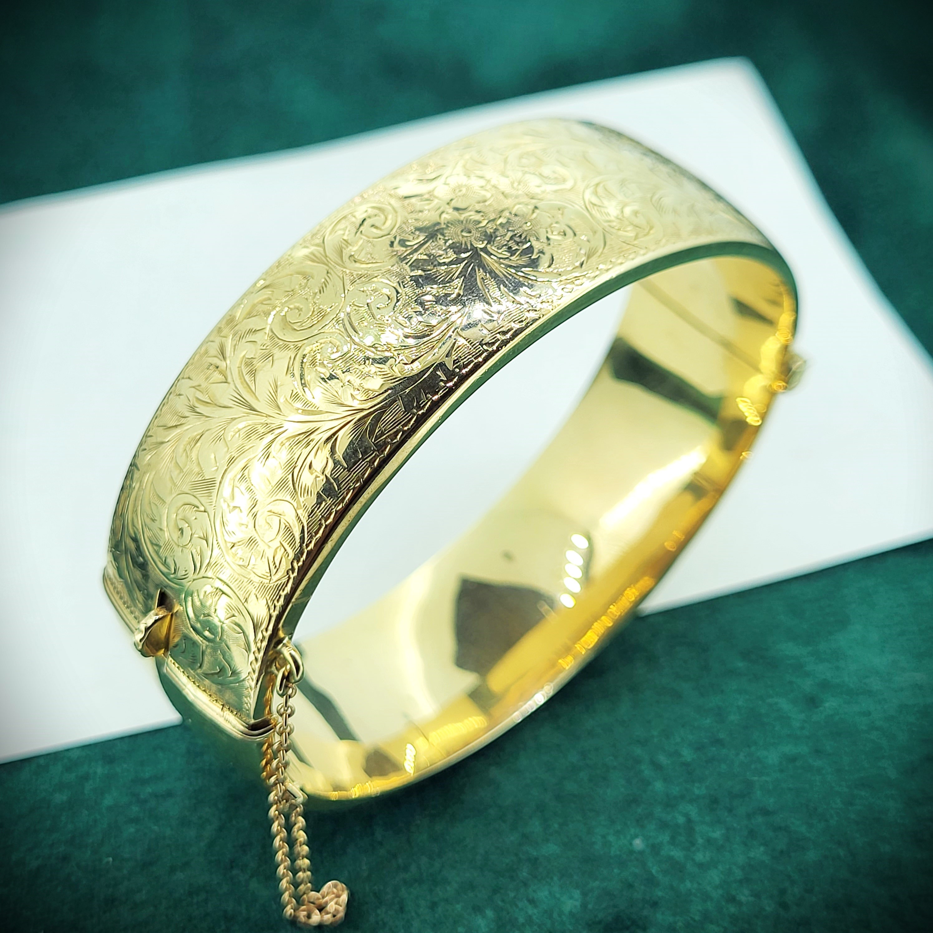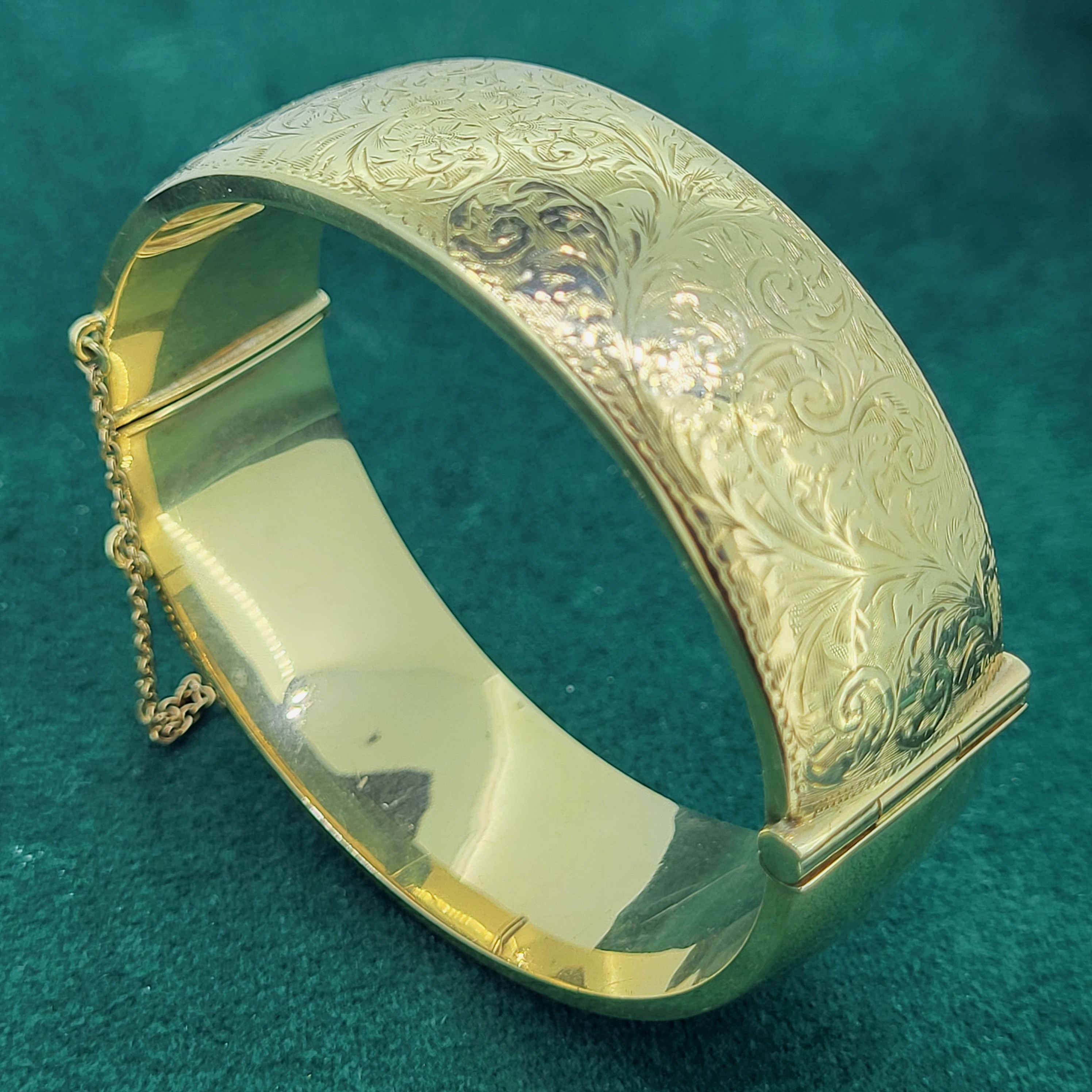 A beautiful 9ct Yellow Gold half hinged Bangle with exceptional "foliate" hand engraving that covers the entire upper half.