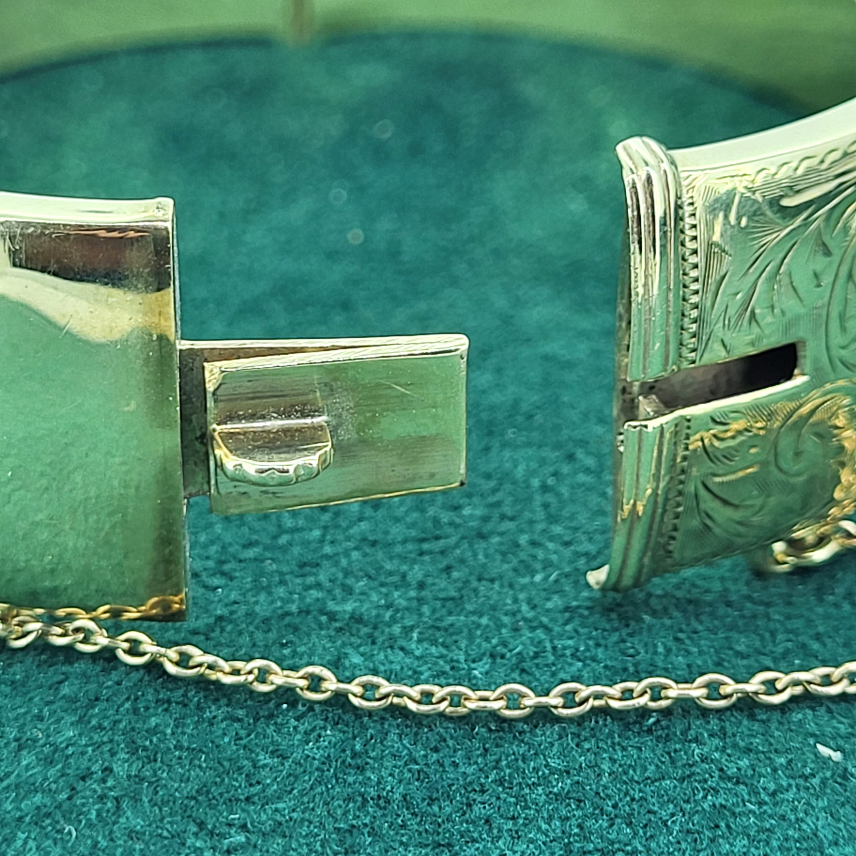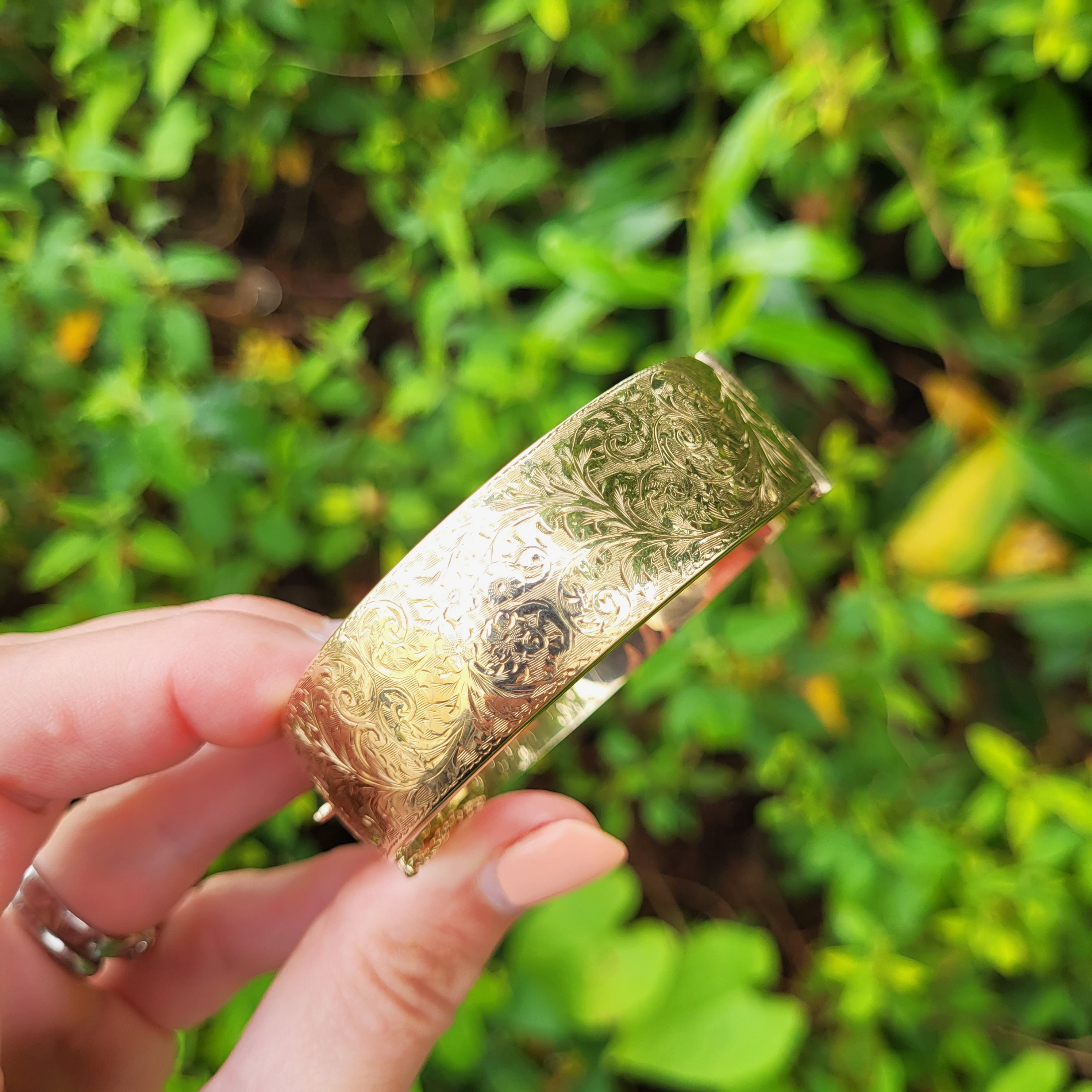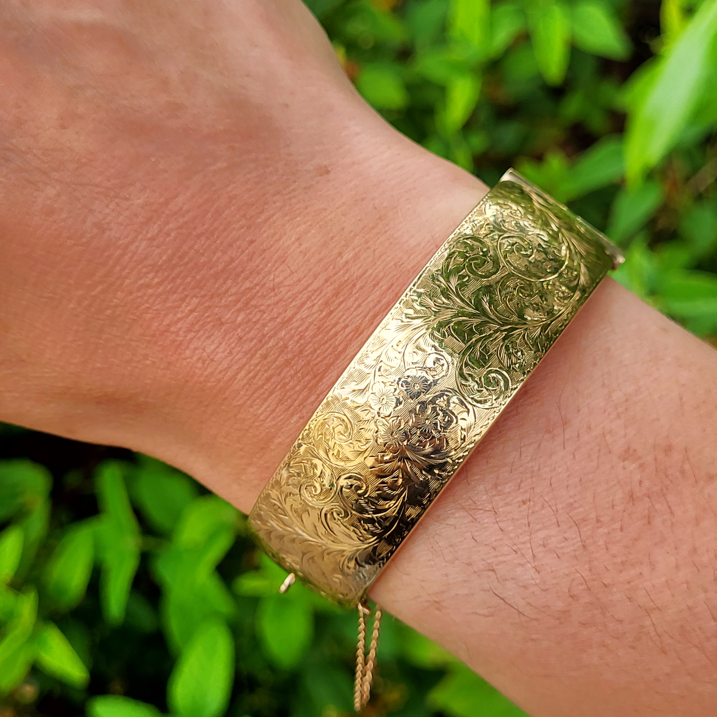 A beautiful 9ct Yellow Gold half hinged Bangle with exceptional "foliate" hand engraving that covers the entire upper half.