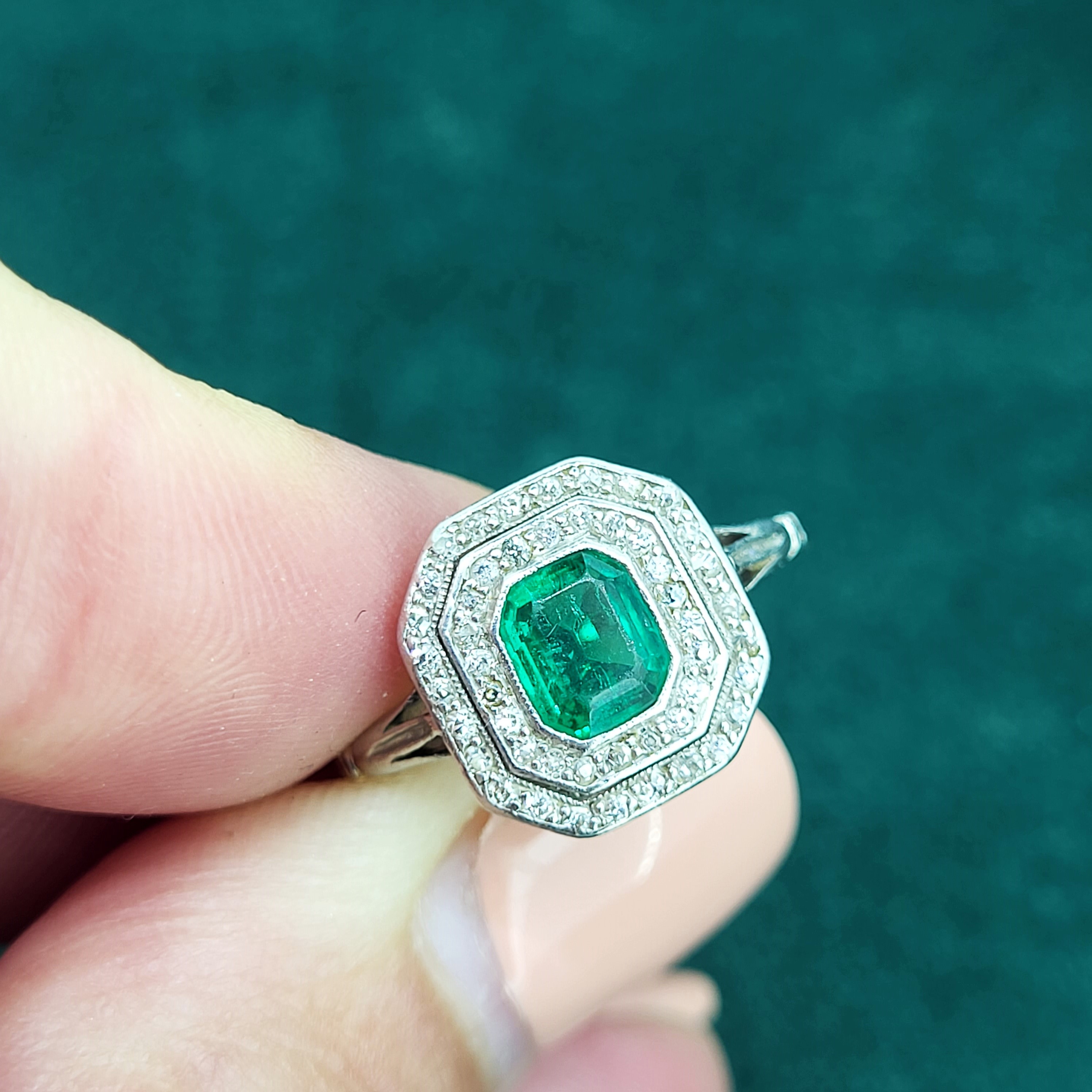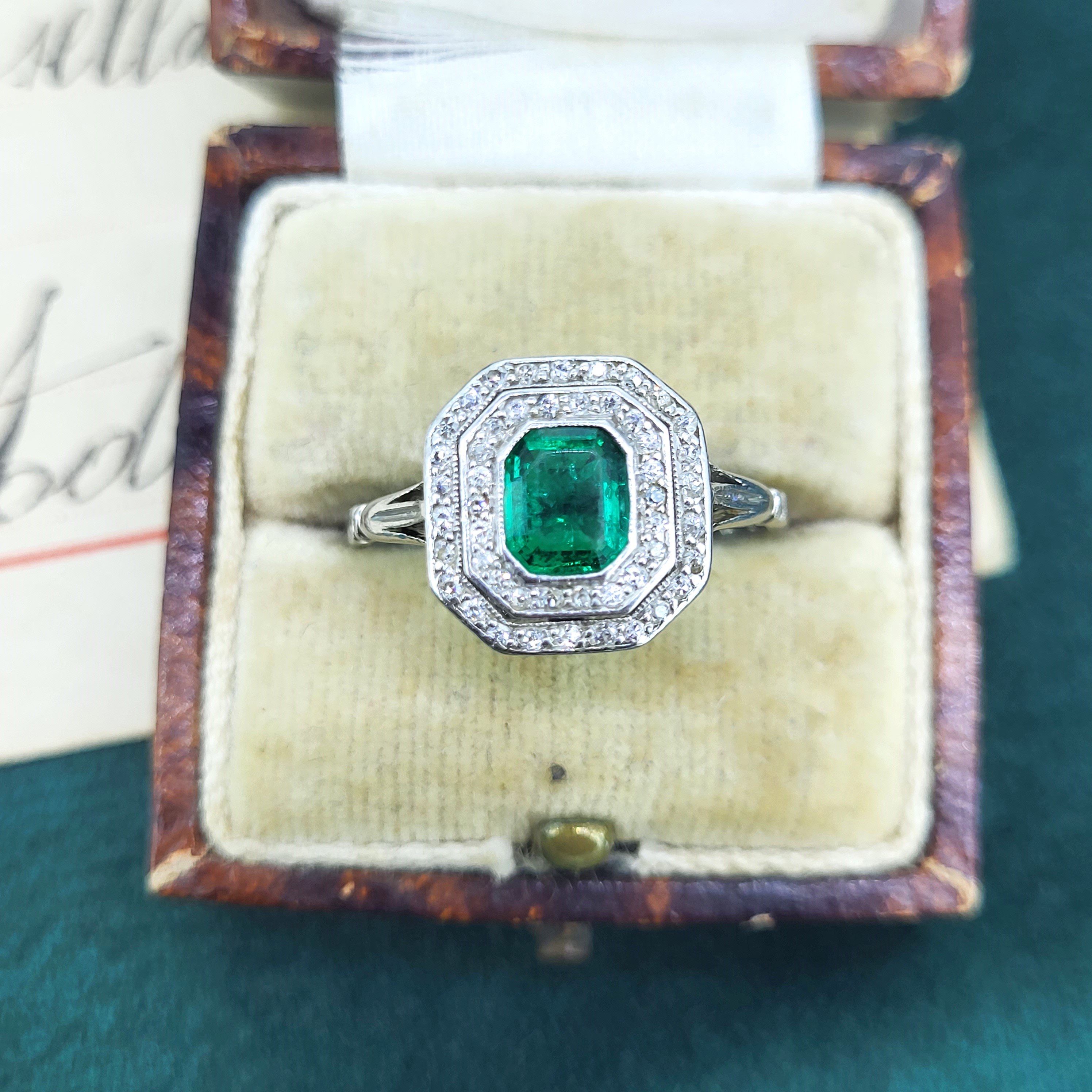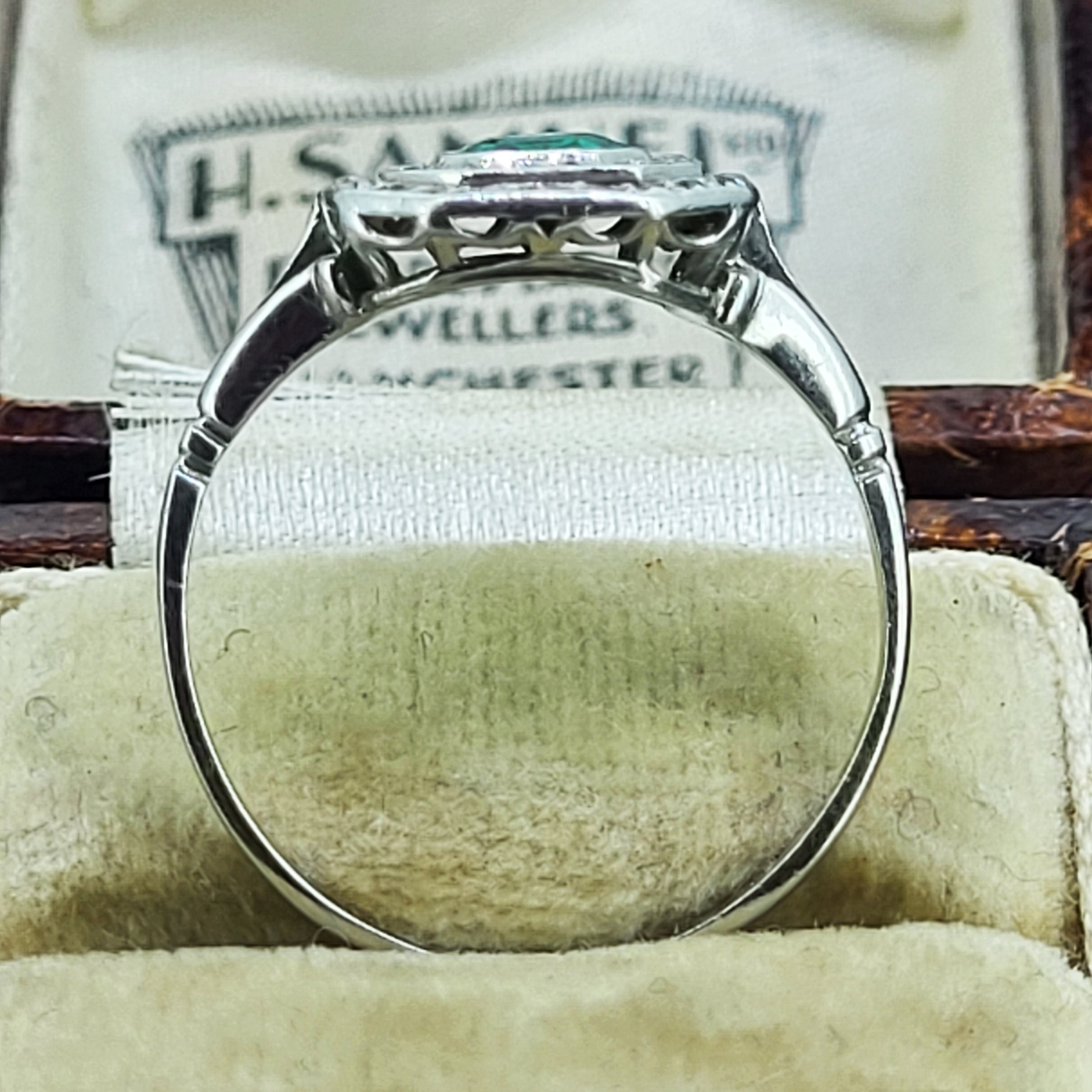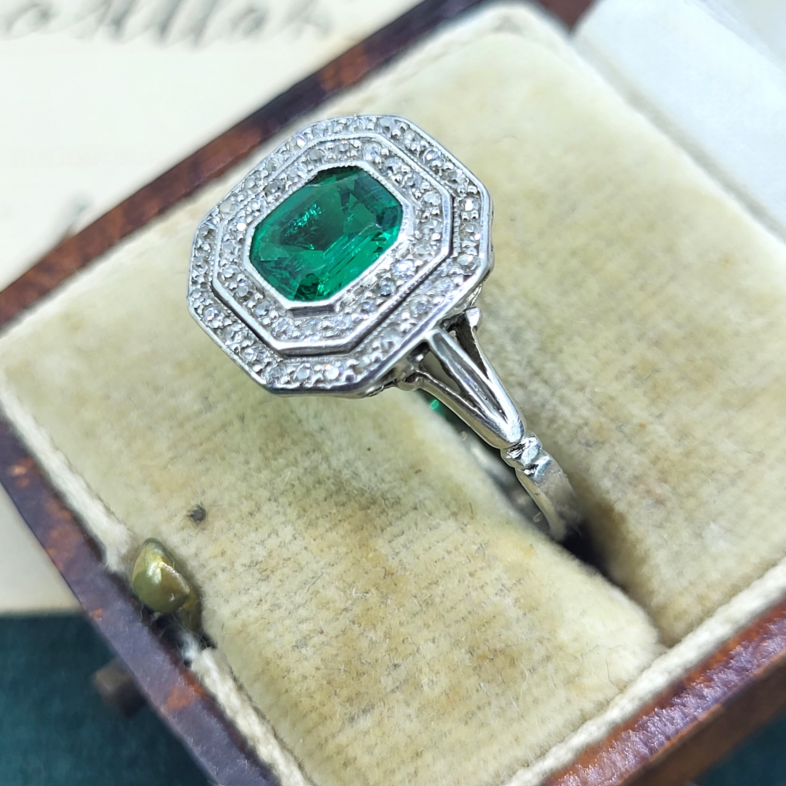 An absolutely stunning Emerald and Diamond Original Art Deco Ring crafted from Platinum.