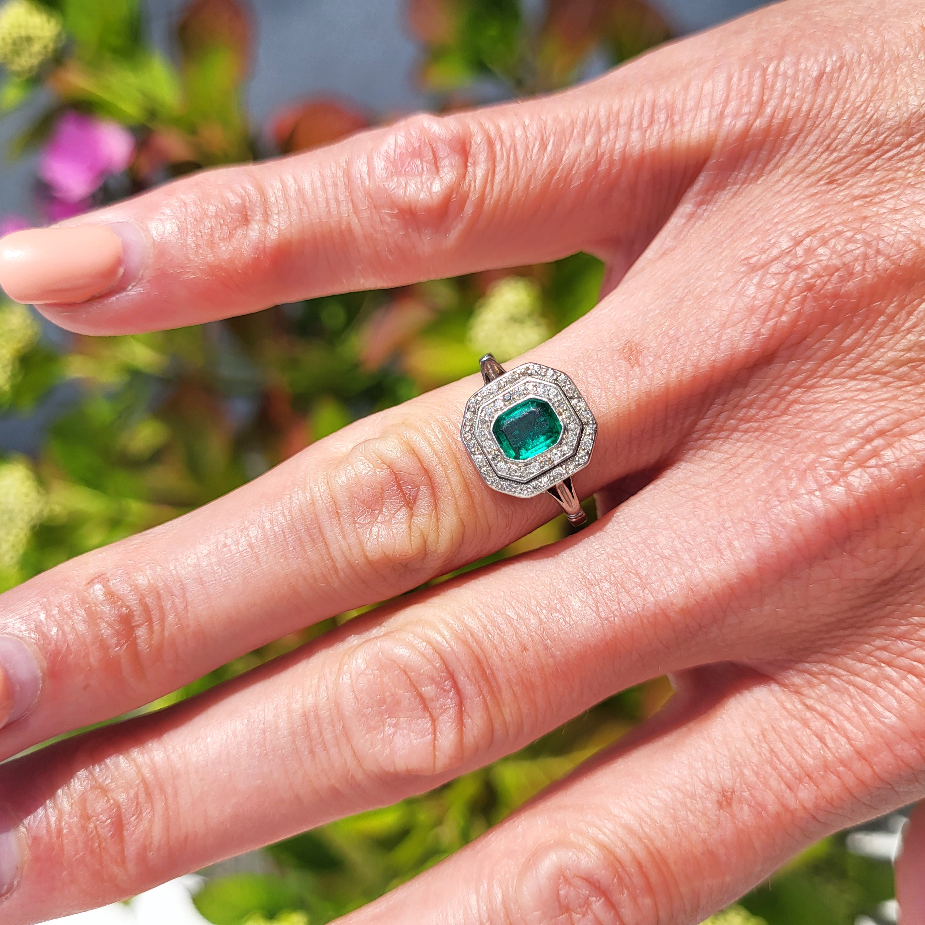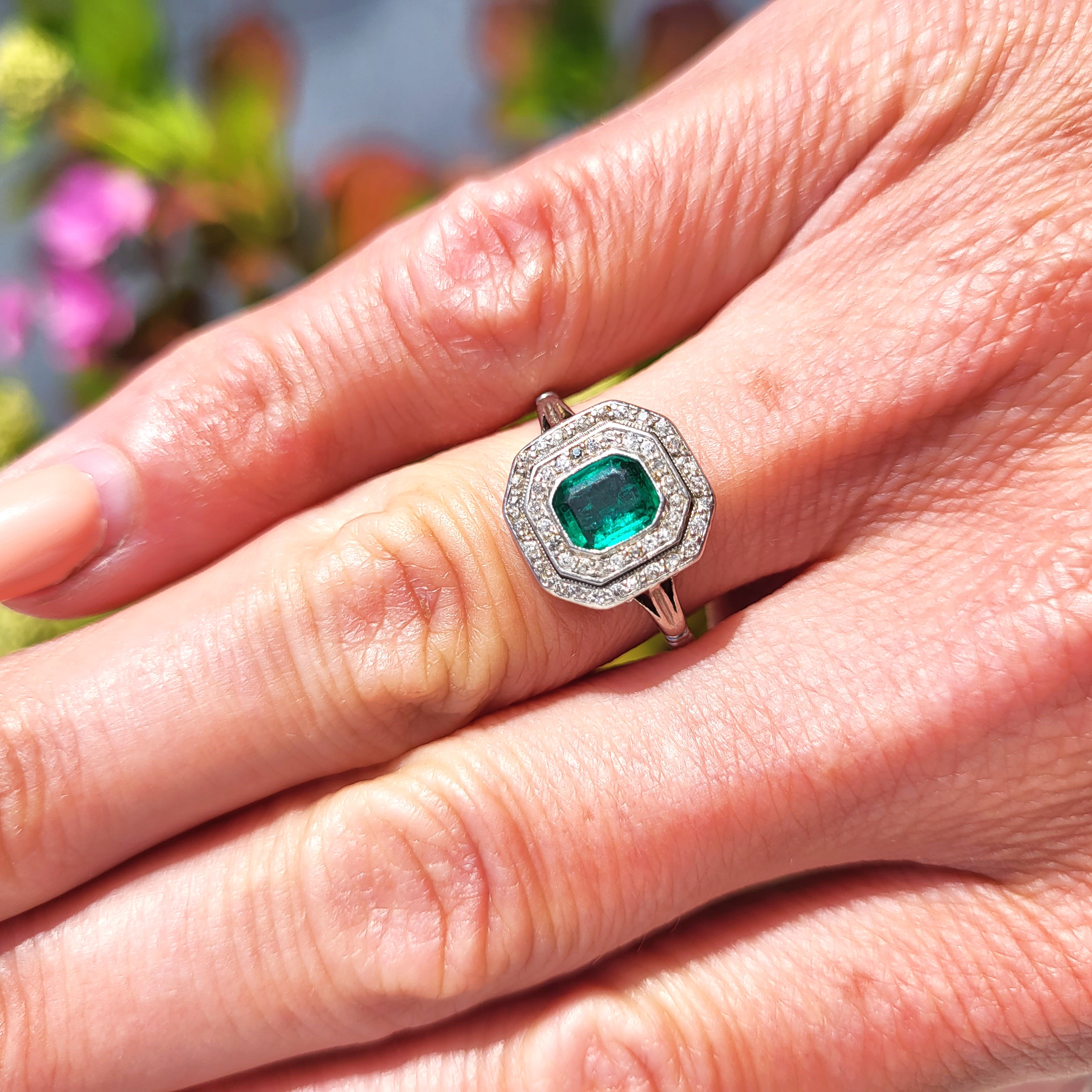 The ring features a gorgeous, vivid green Emerald which measures 6mm by 5mm, estimated at 0.60cts. The Emerald is surrounded by two rows of sparkling, grain set Round Brilliant Diamonds weighing an estimated 0.25cts. The centre Emerald and Diamonds contrast beautifully.