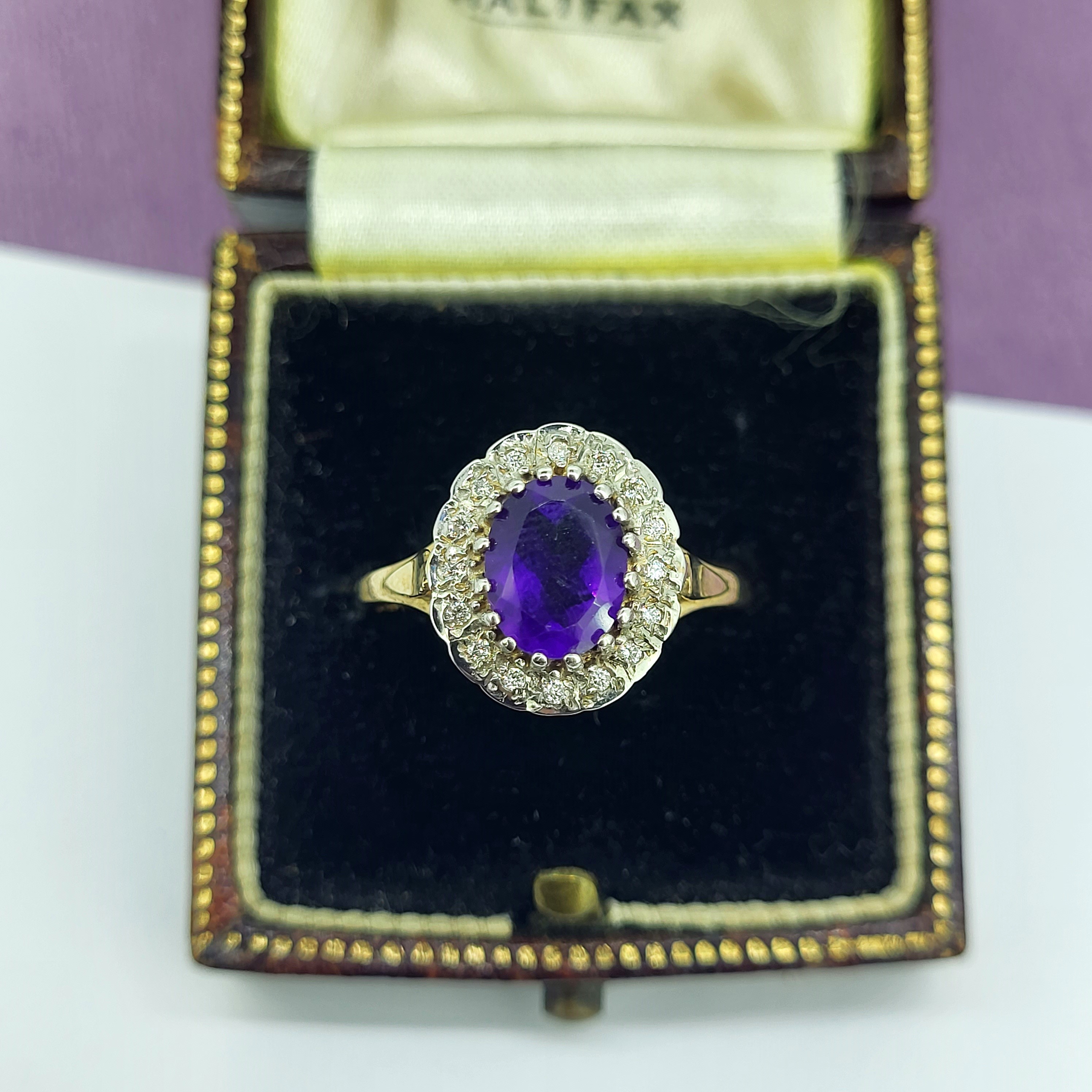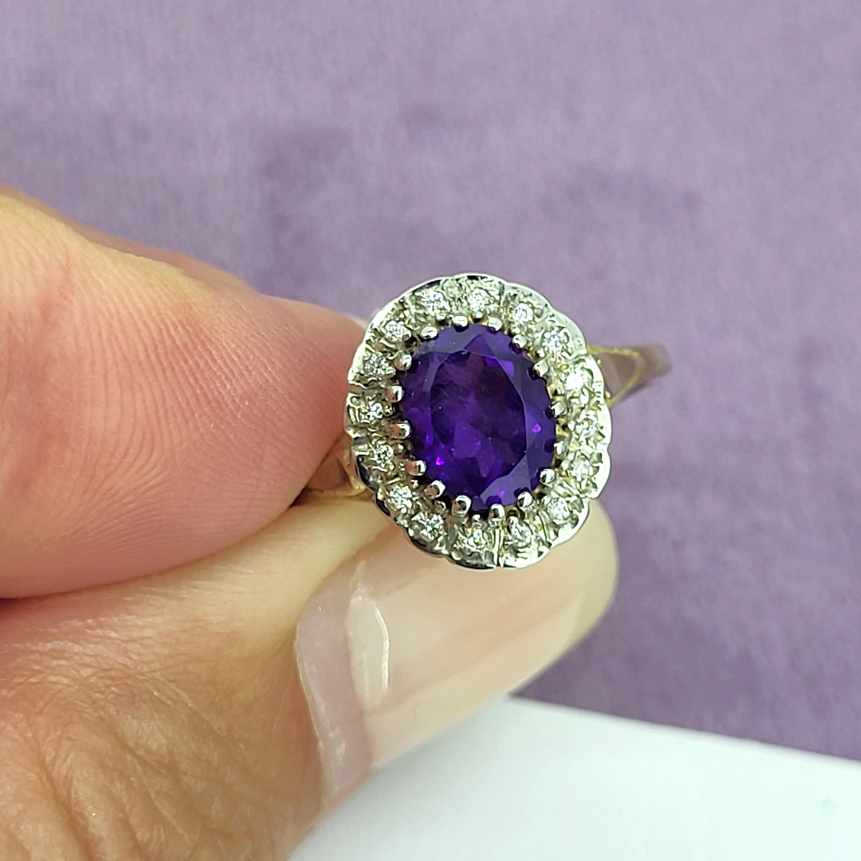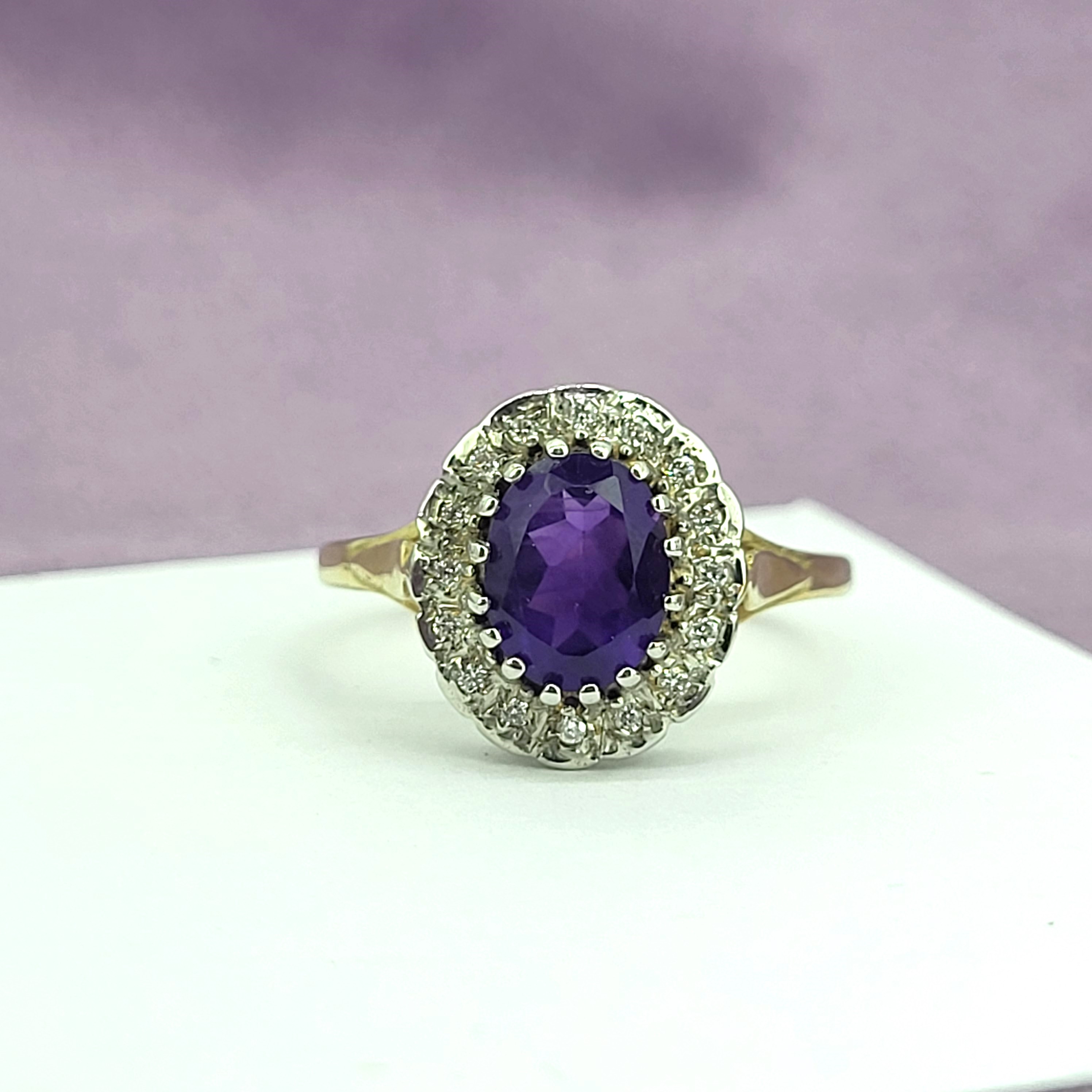 It features a central, oval Amethyst that measures 8mm by 6.5mm. The Amethyst is a gorgeous deep purple and is surrounded by grain set, round brilliant diamonds weighing 0.12cts.