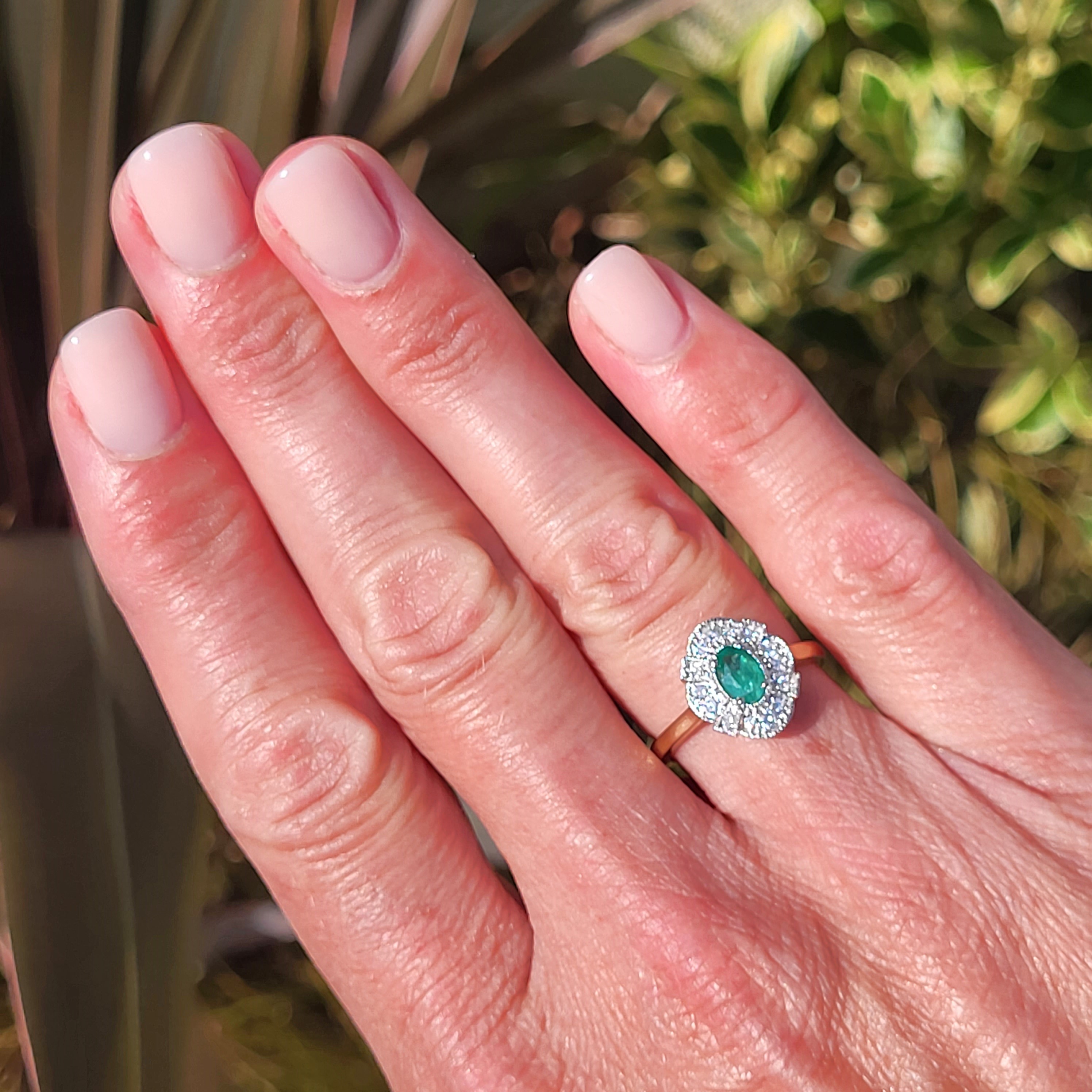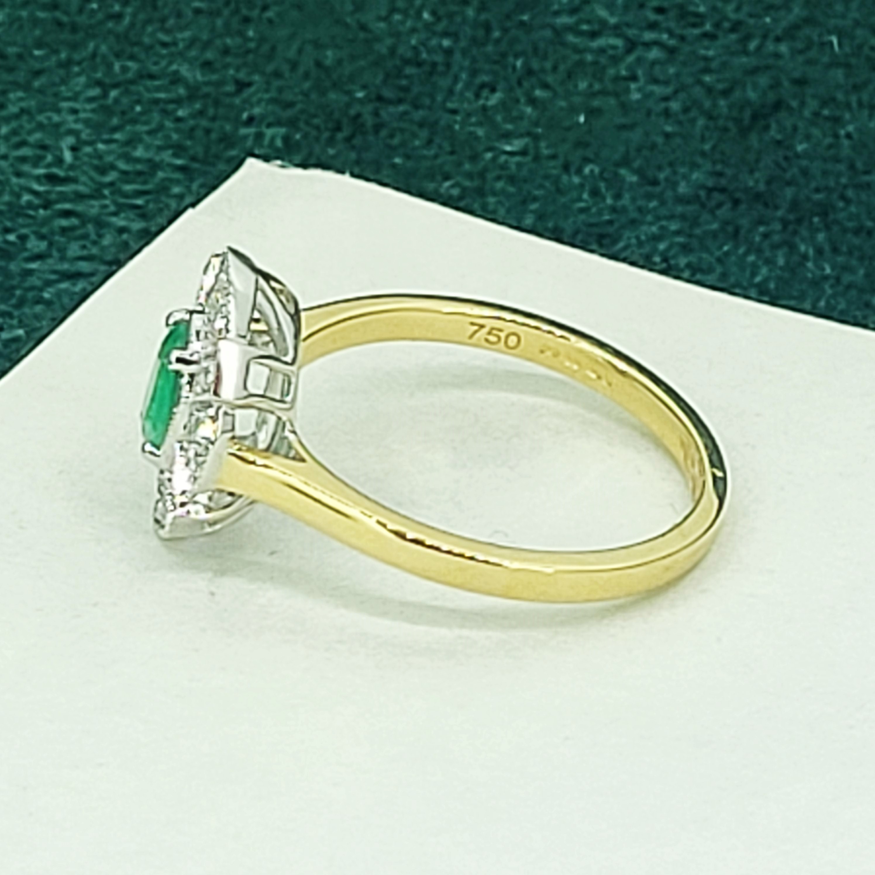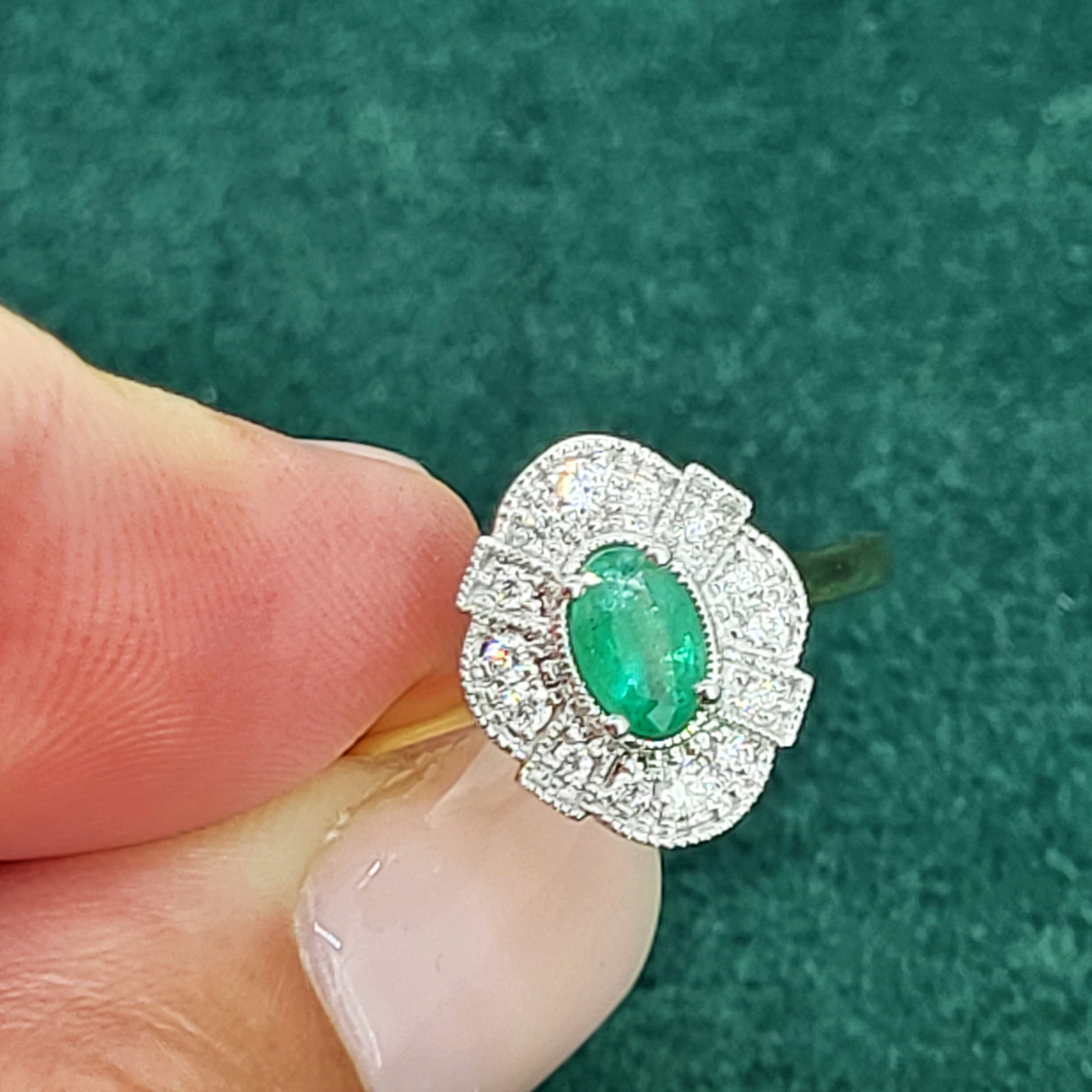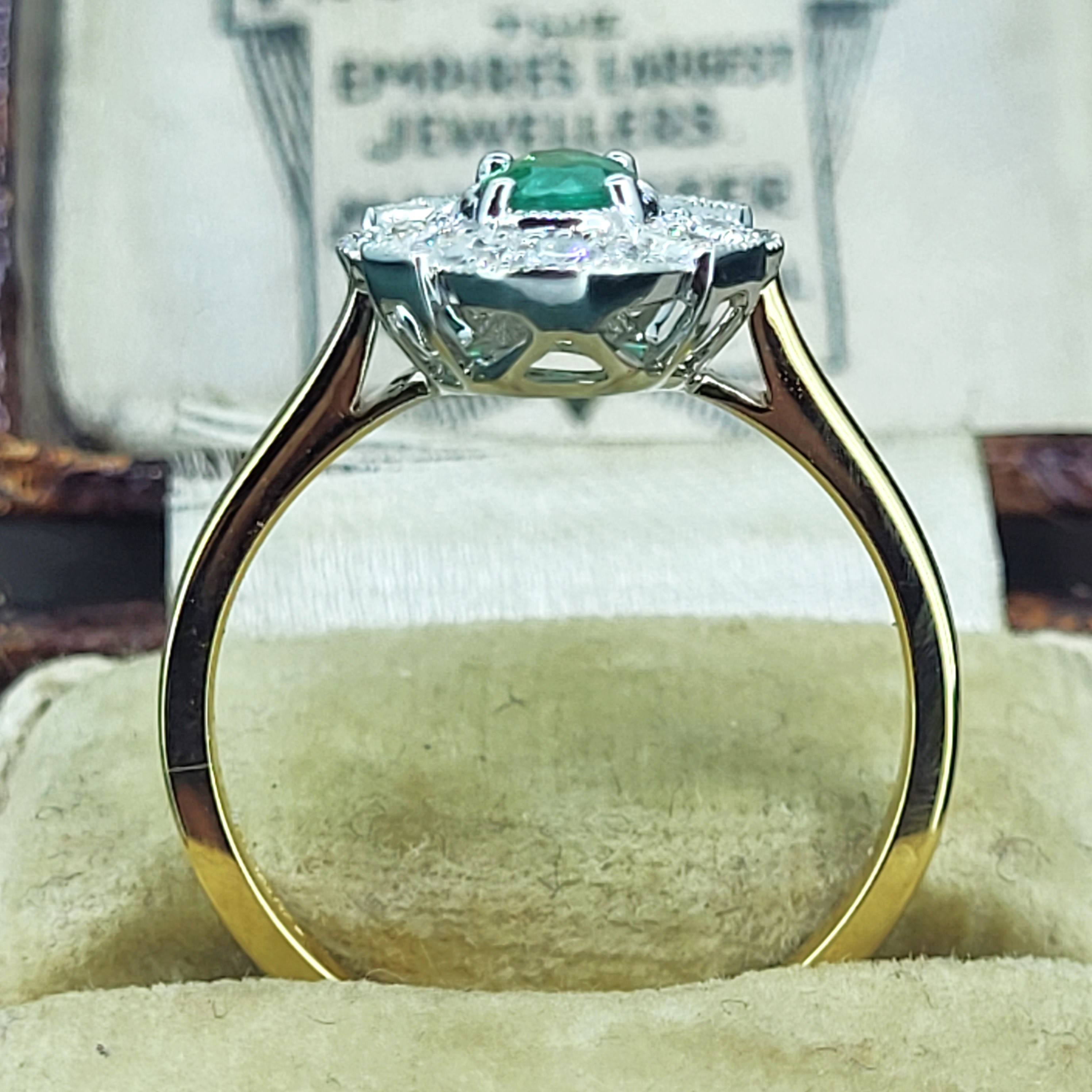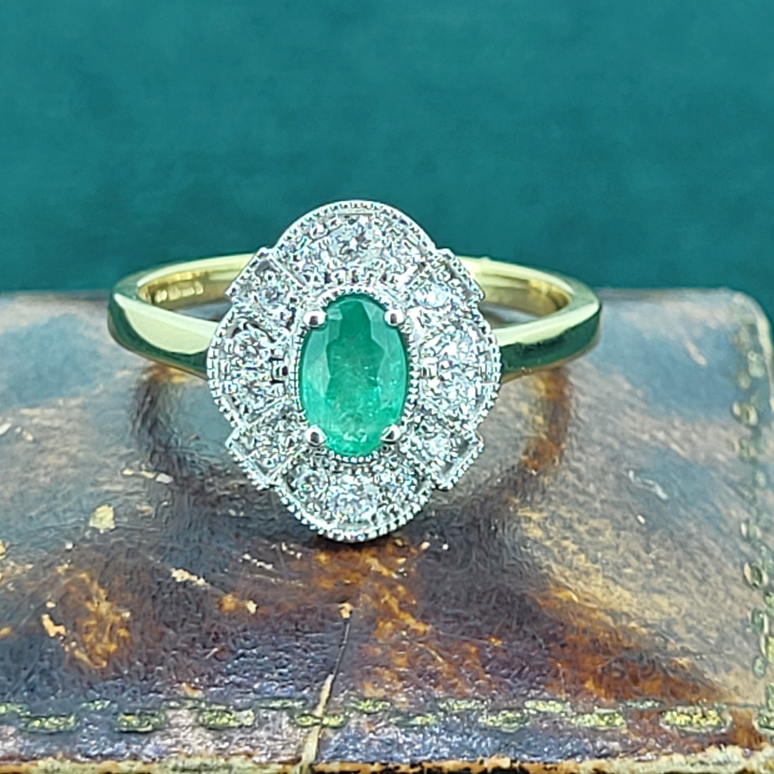 The ring features a vibrant, Oval Emerald in the centre which measures 5mm x 4mm, weighing 0.50cts. The Emerald is surrounded by bright, Round Brilliant grain set Diamonds. The Diamonds weigh 0.20cts and are further details by a fine milgrain edge.