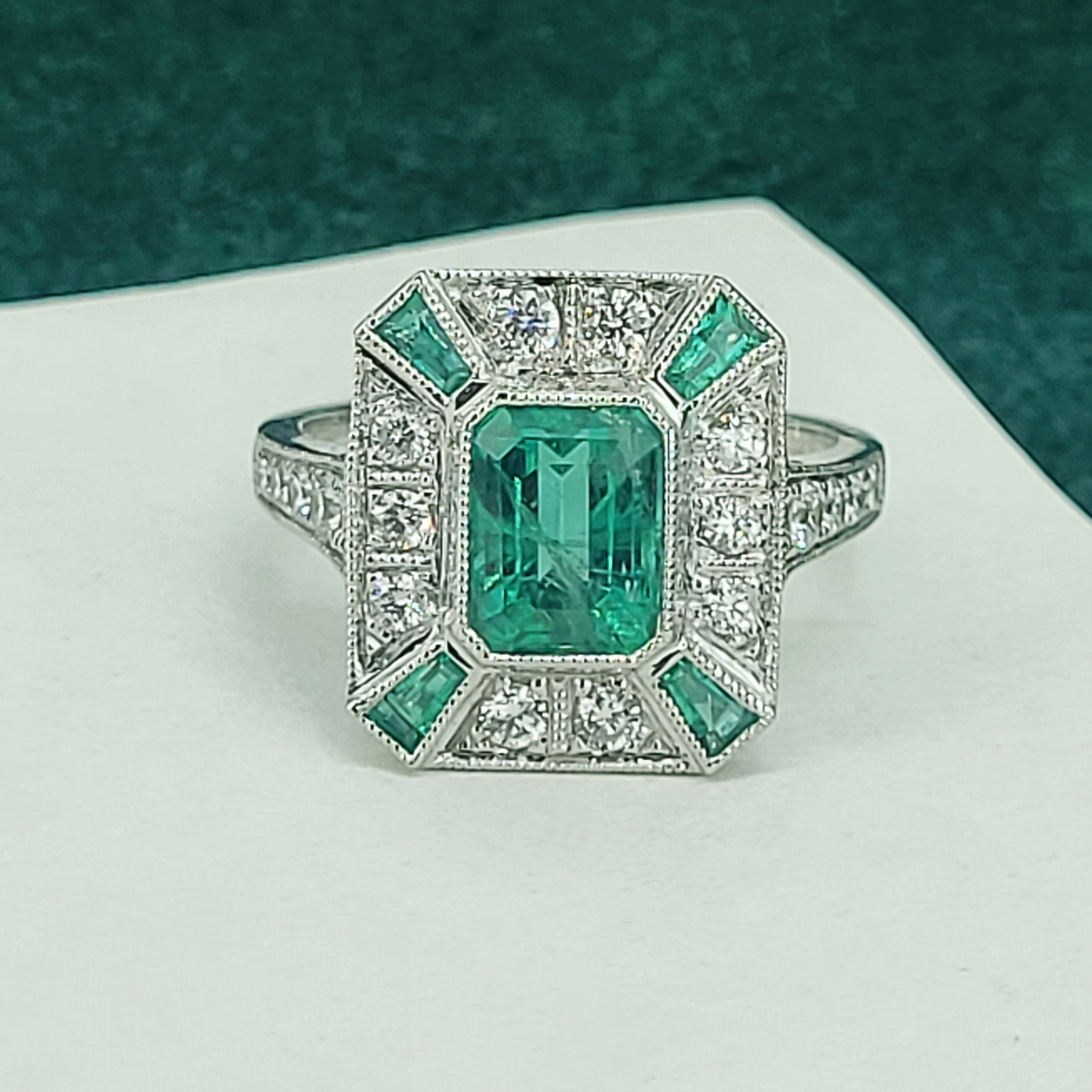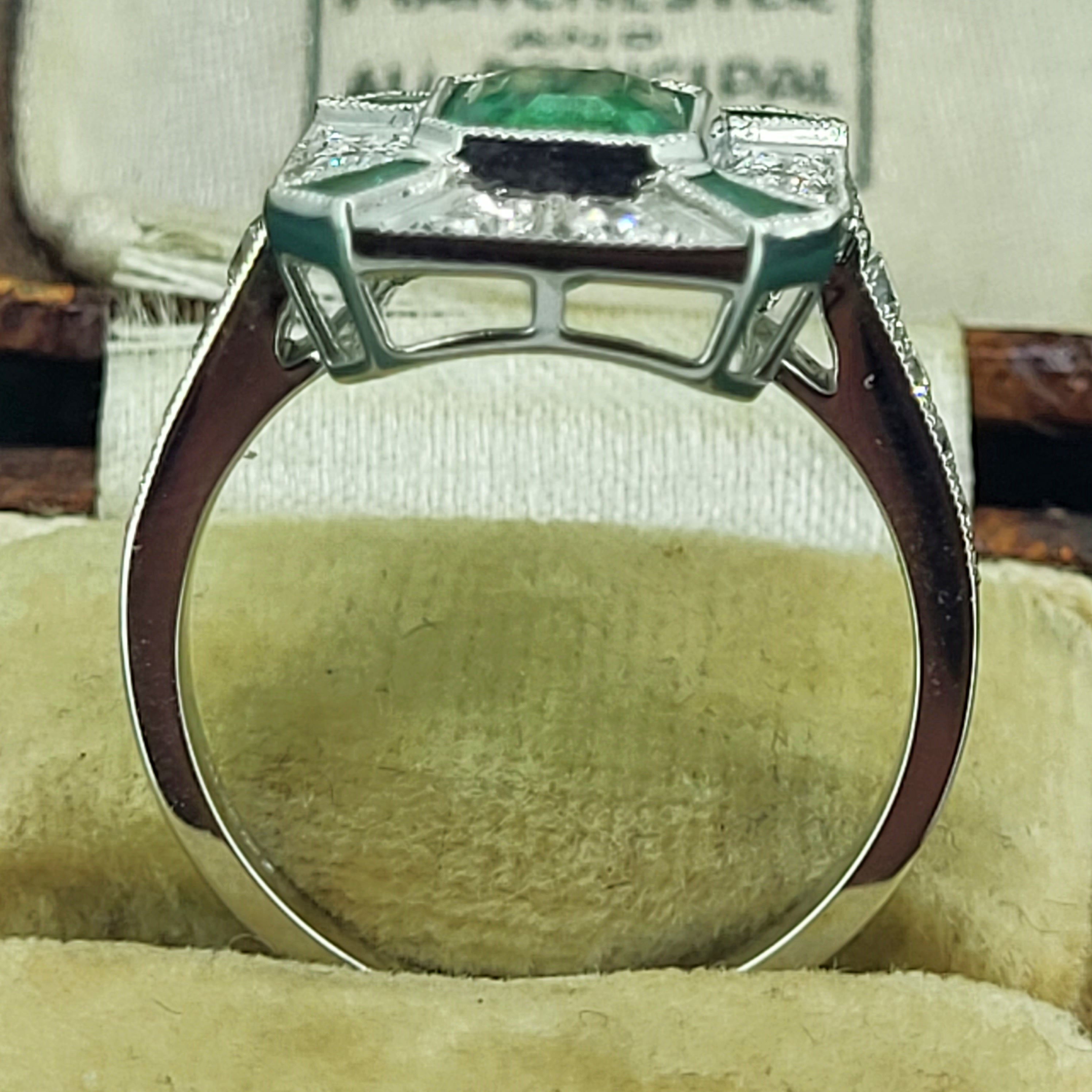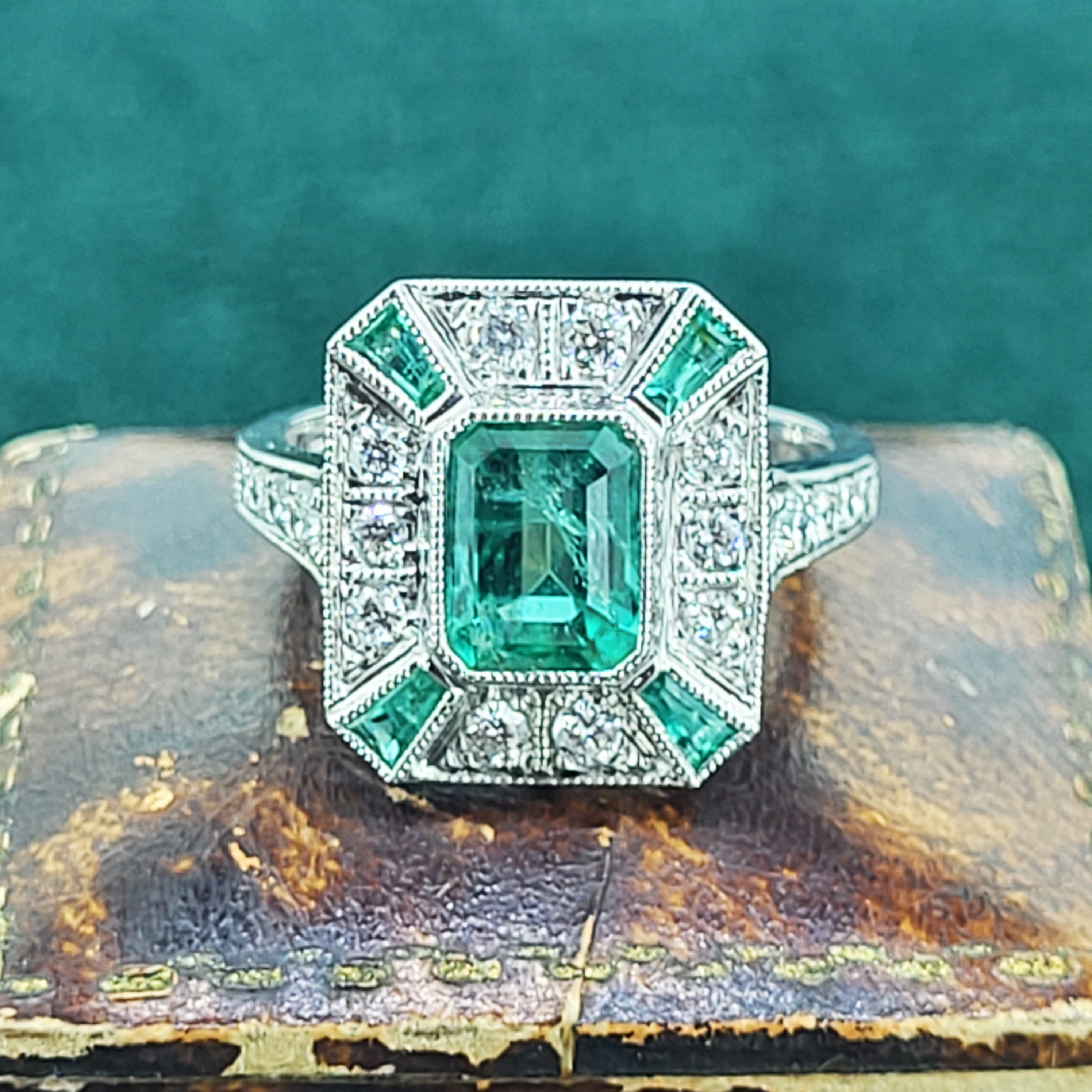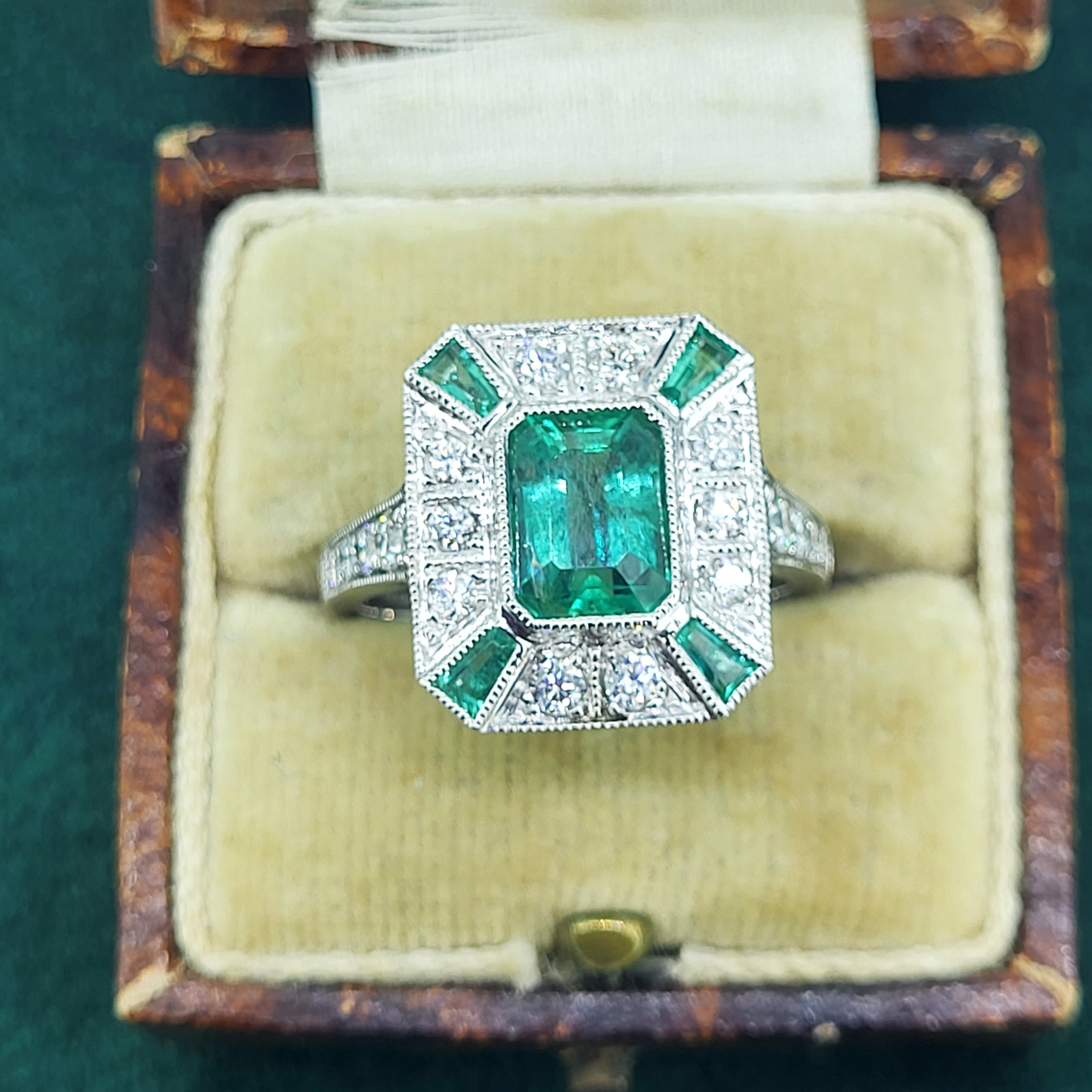 A wonderfully crafted Emerald and Diamond Art Deco Ring crafted from 18ct White Gold.