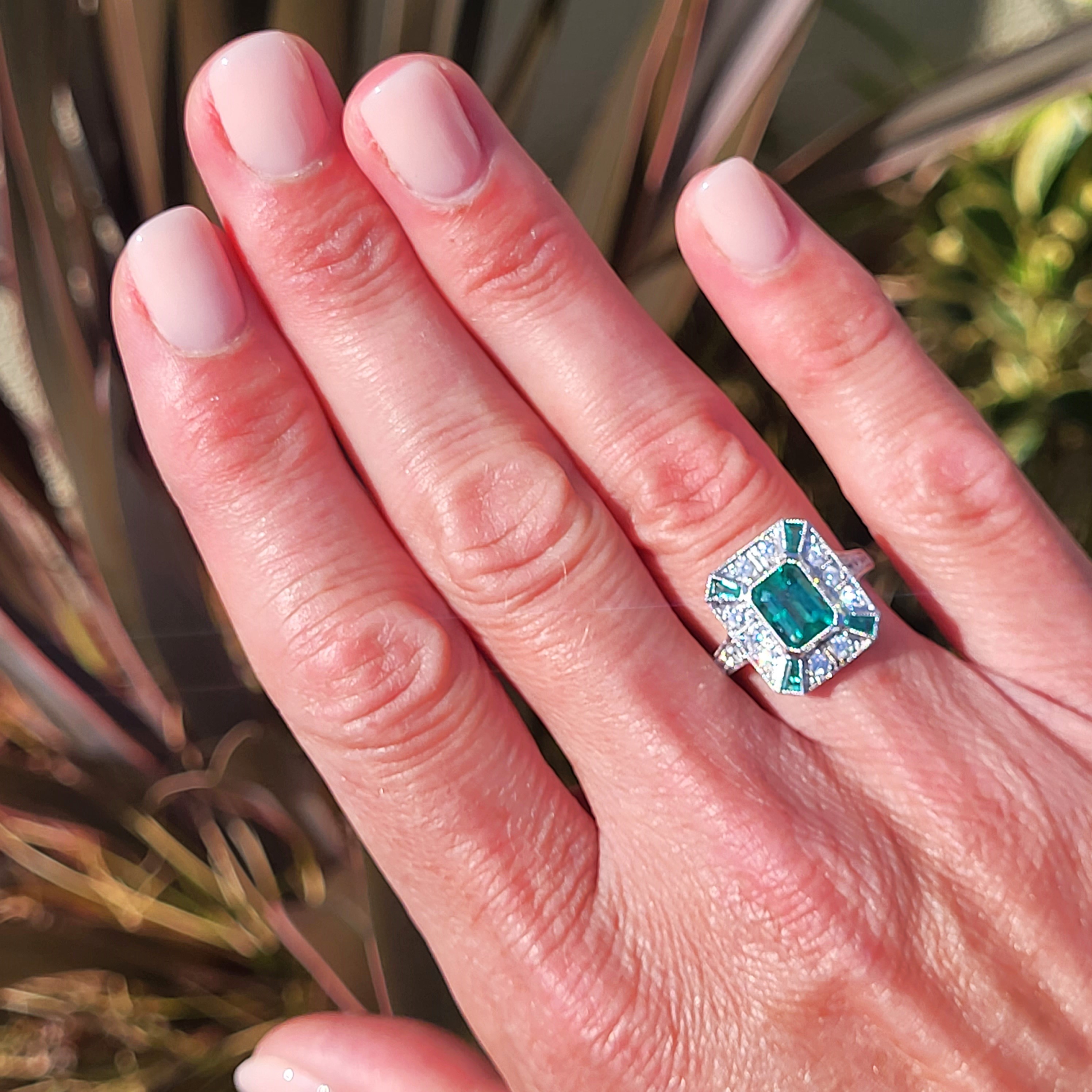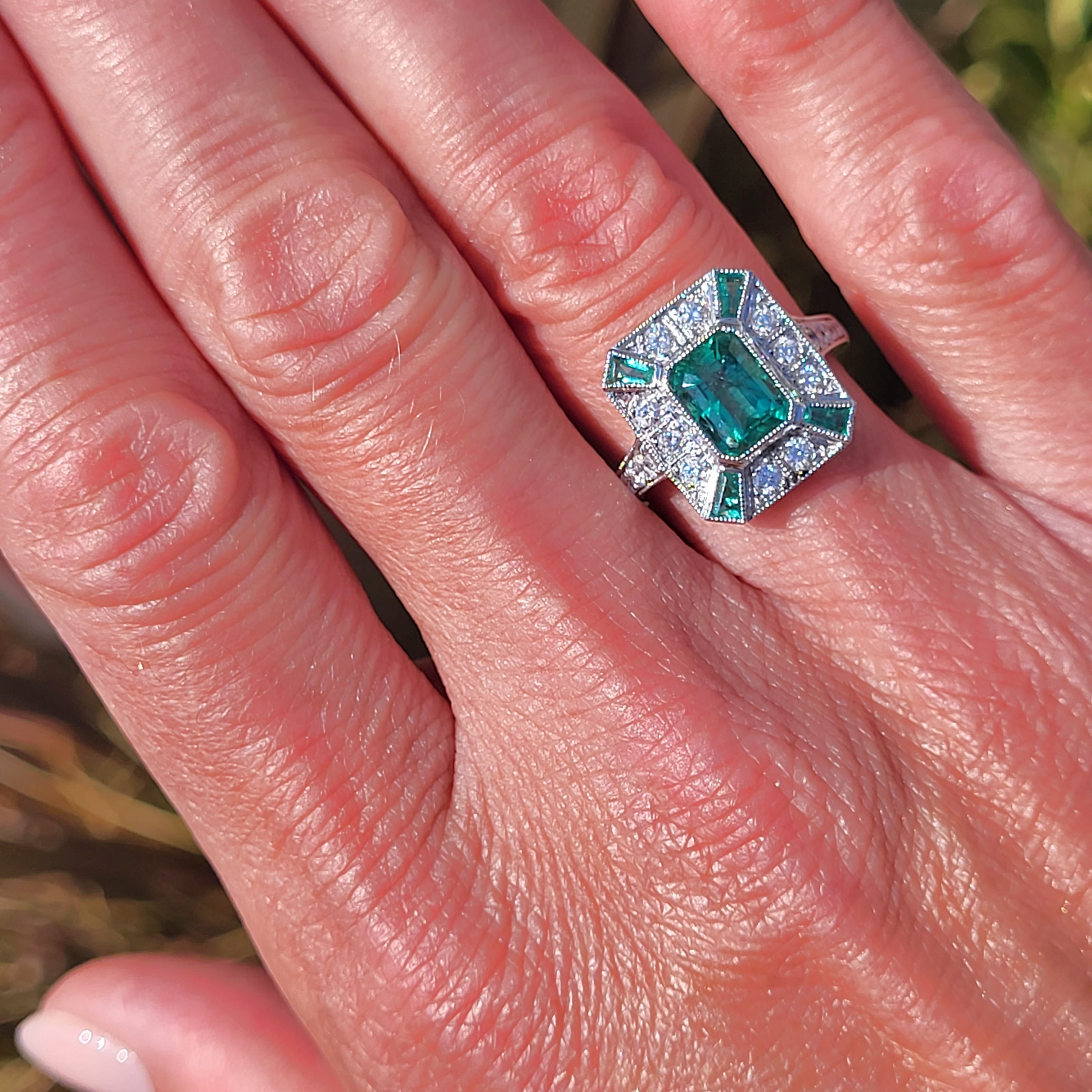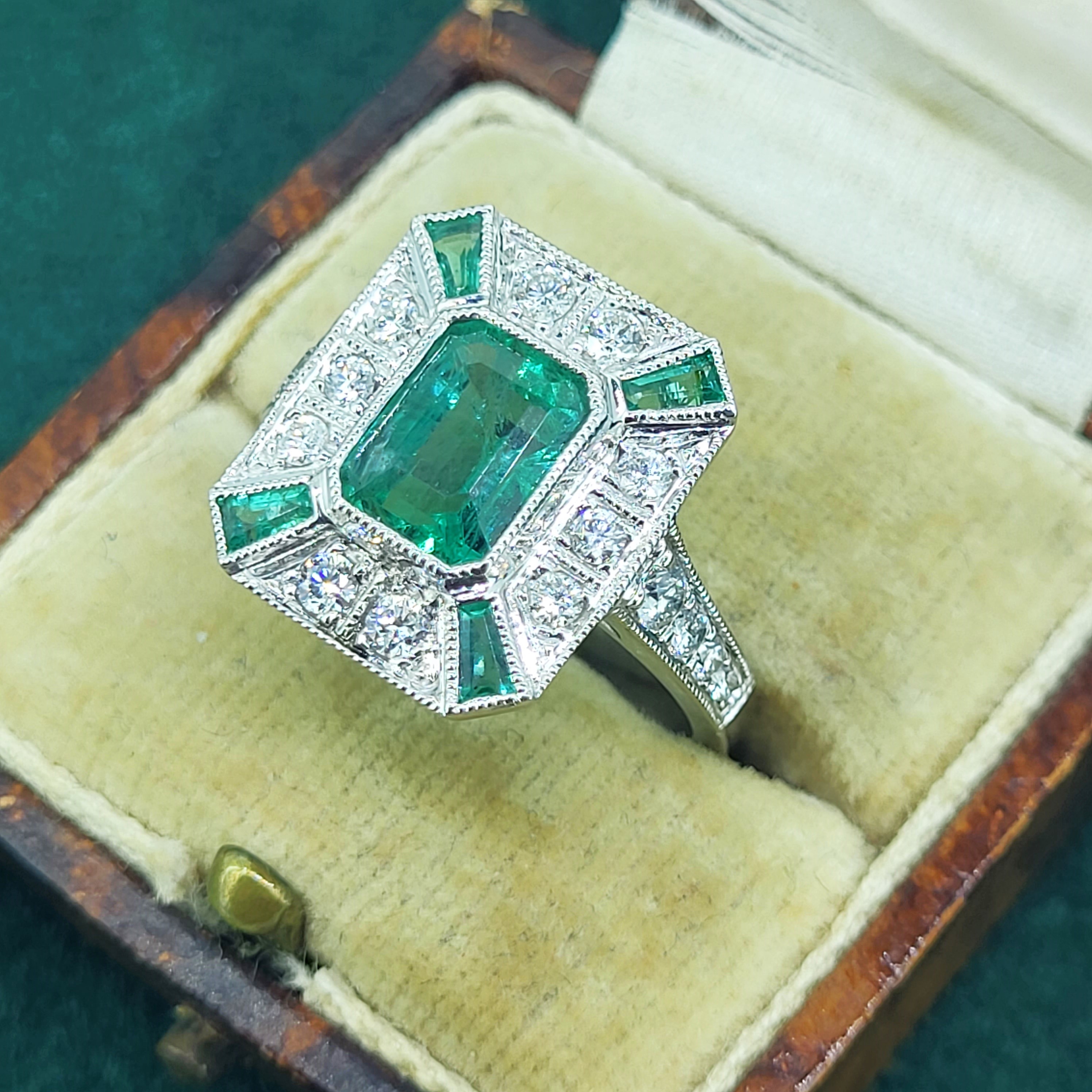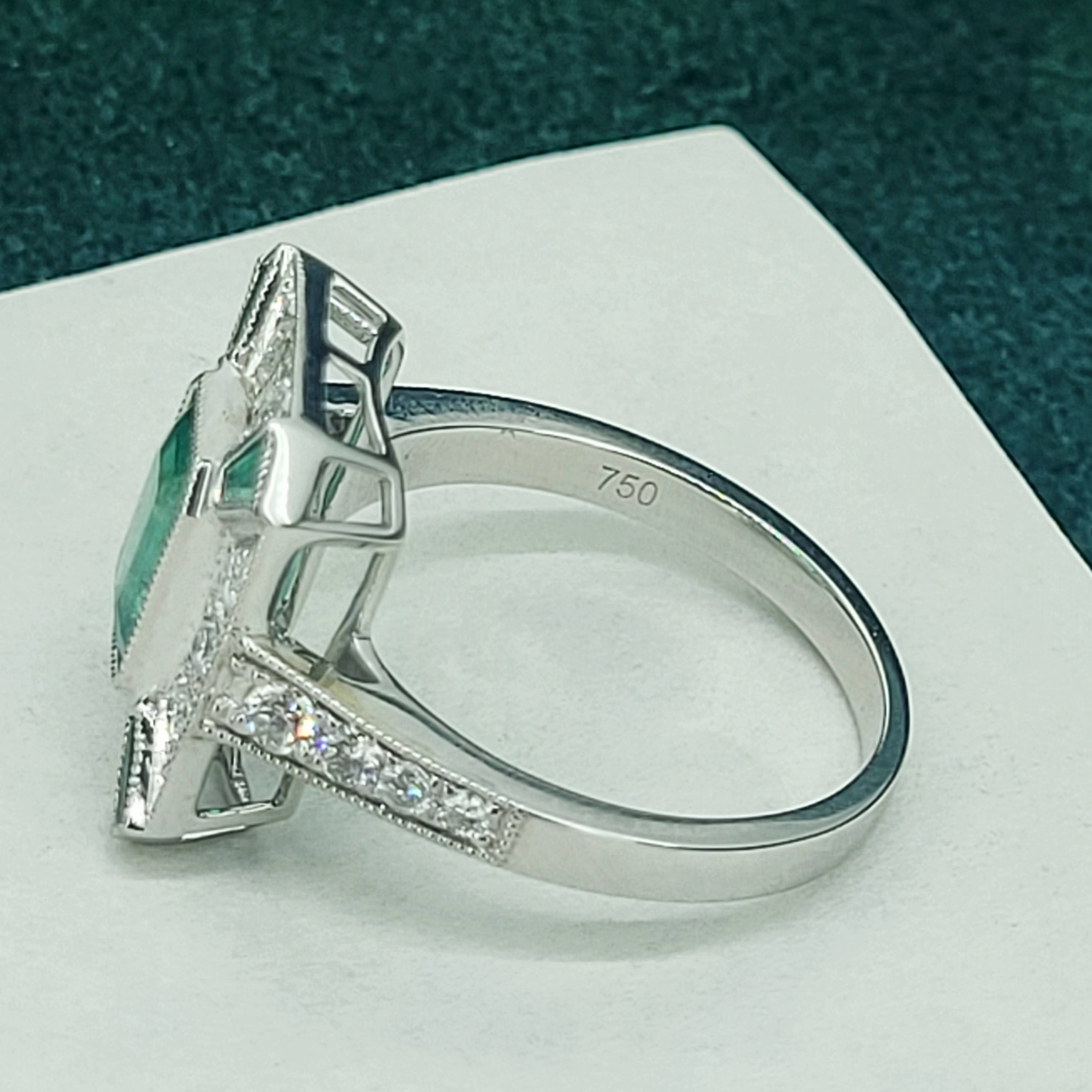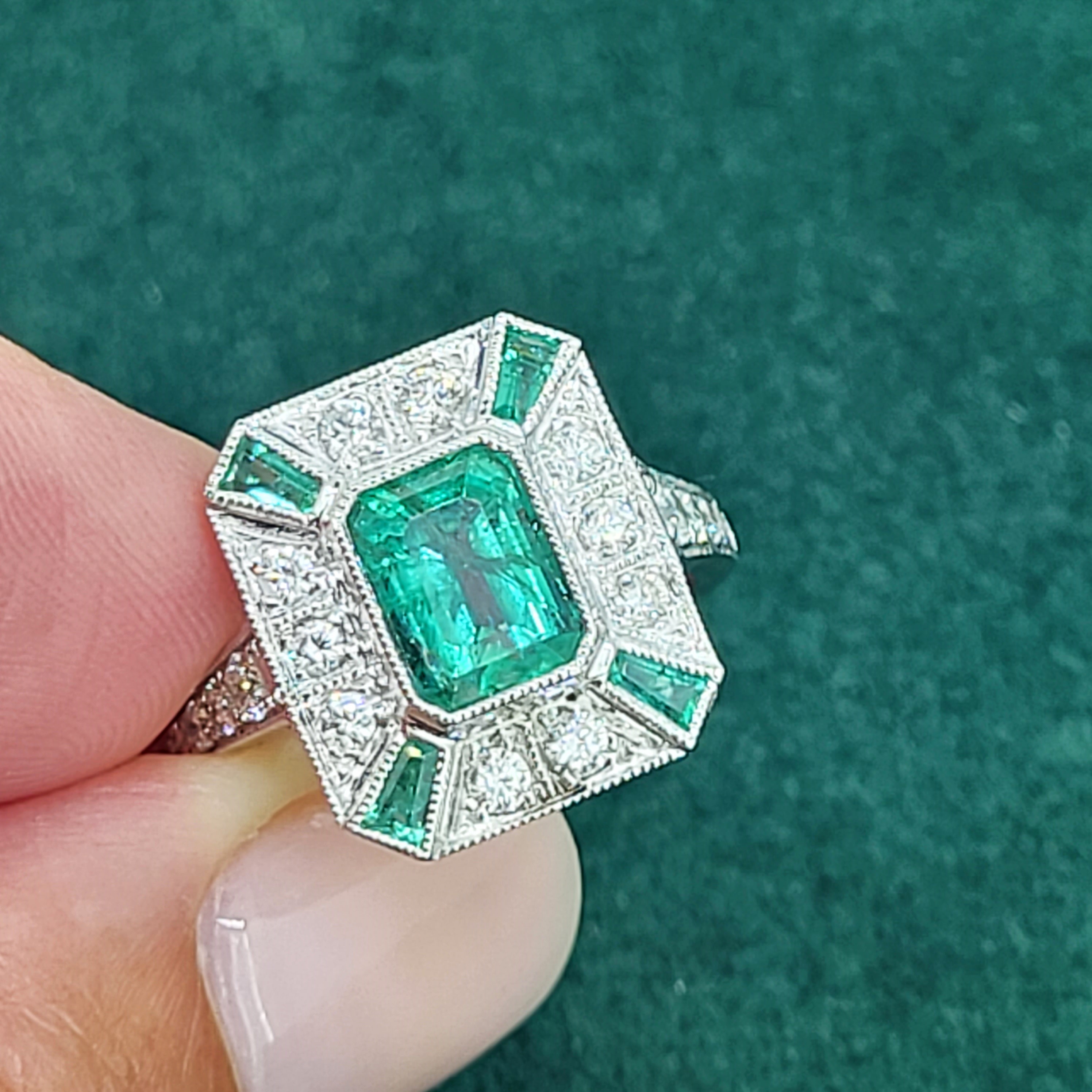 A wonderfully crafted Emerald and Diamond Art Deco Ring crafted from 18ct White Gold.