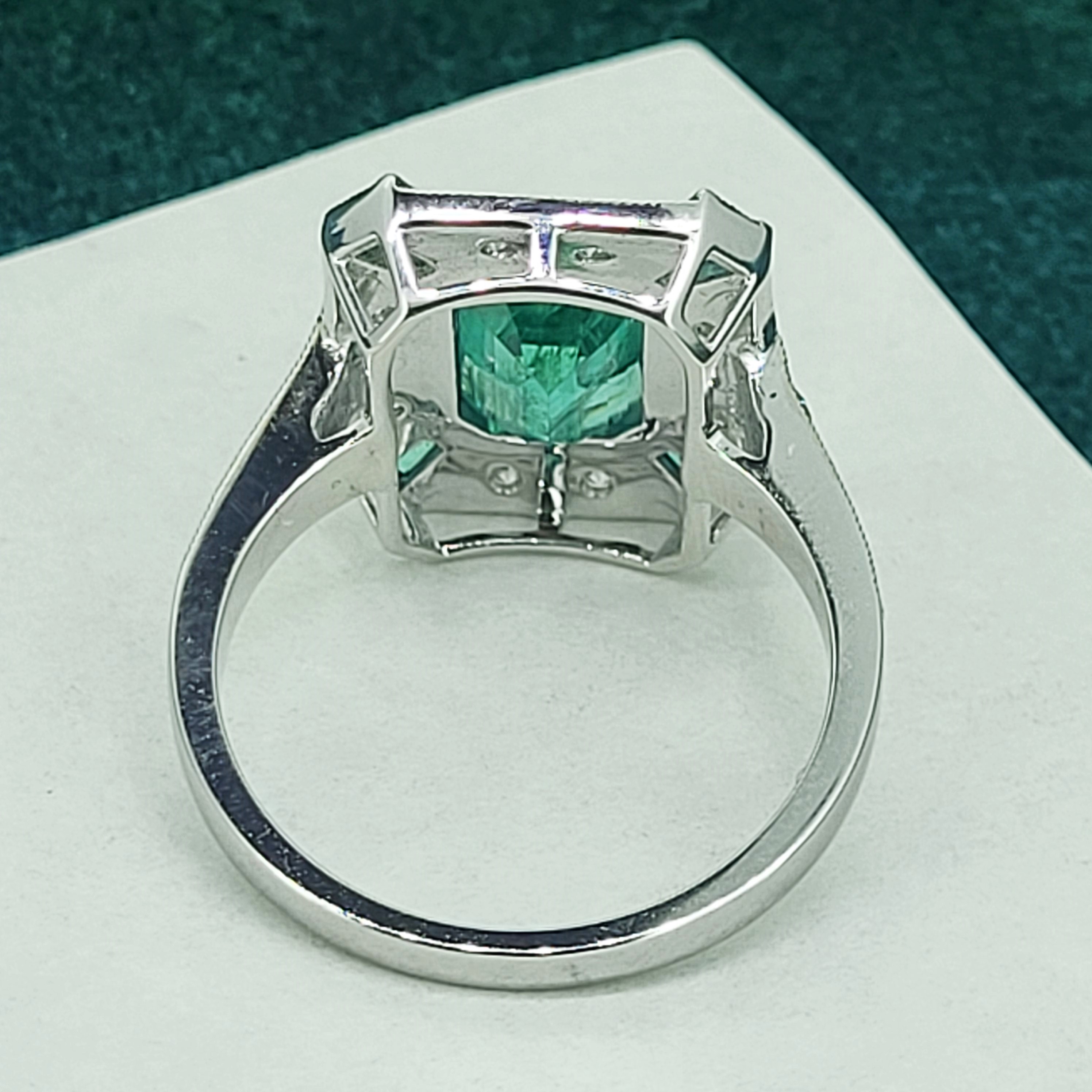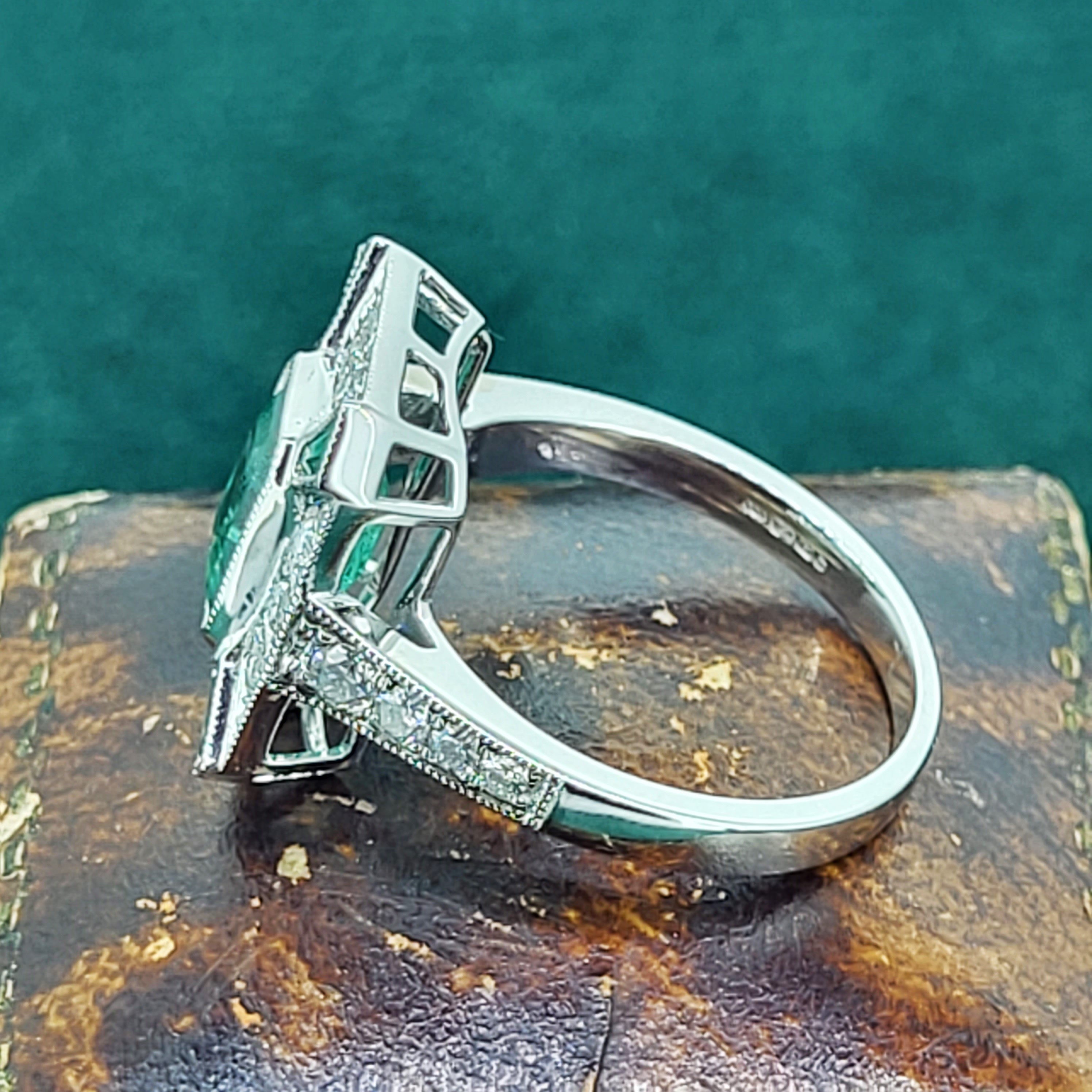 It also features tapered baguette Emeralds in each corner which give the ring its perfect symmetry. The Emeralds are surrounded by dazzling Diamonds that weigh 0.60cts and are accompanied by a fine milgrain edge.