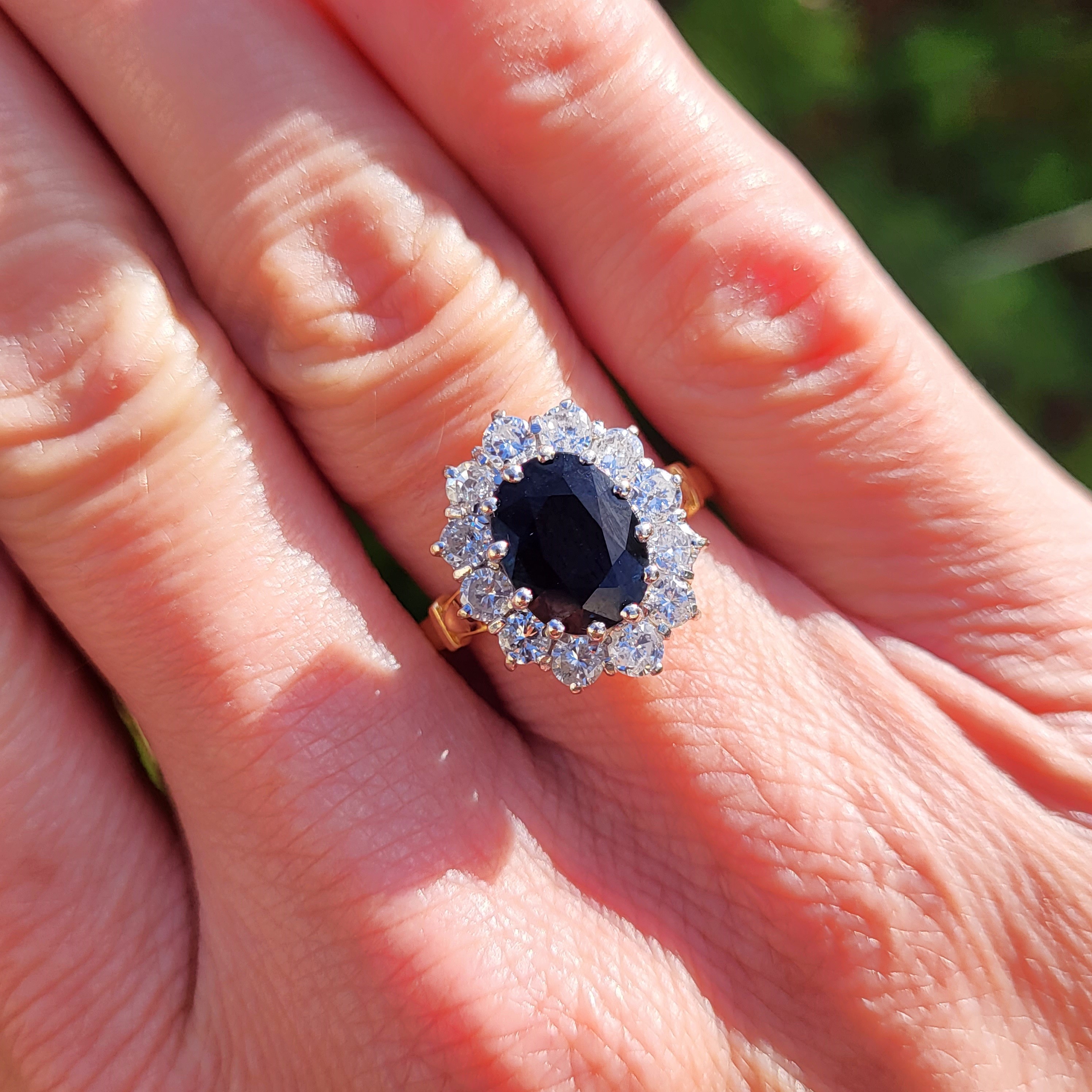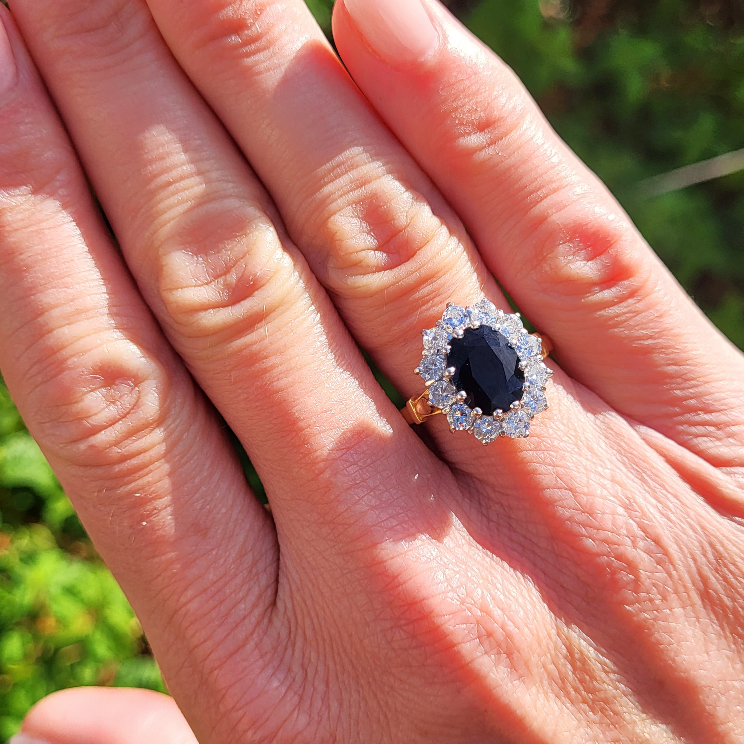 The ring features a deep blue, Oval Sapphire in the centre that measures 10.5mm by 7.5mm, weighing an estimated 3.10cts.