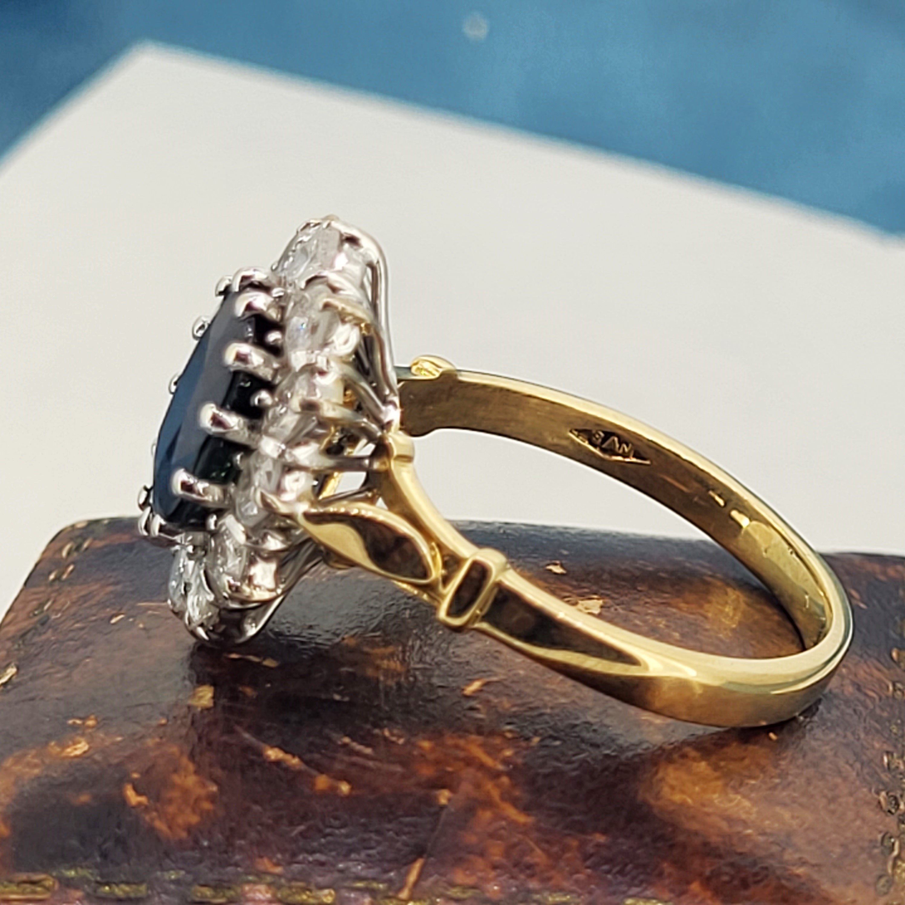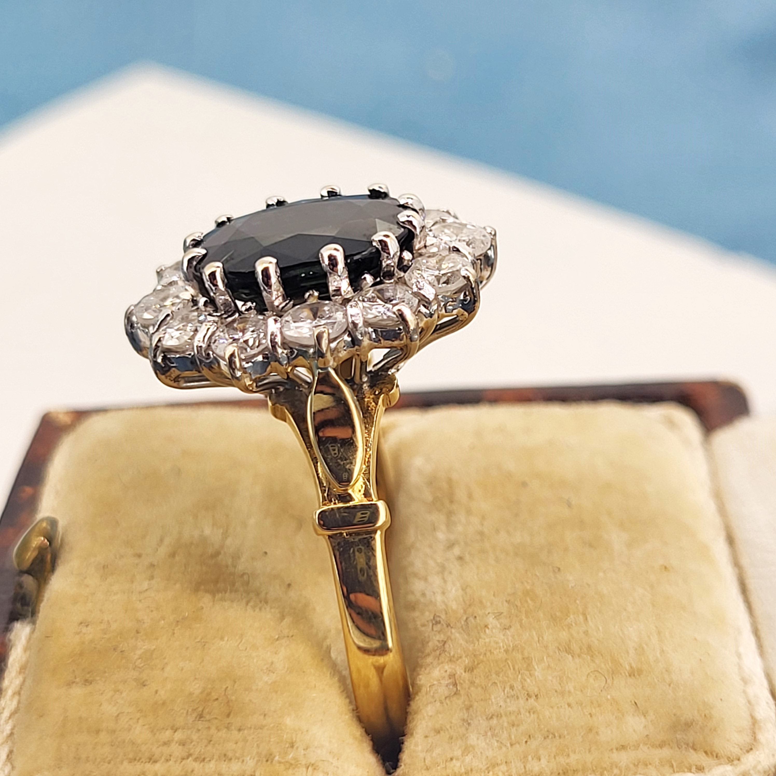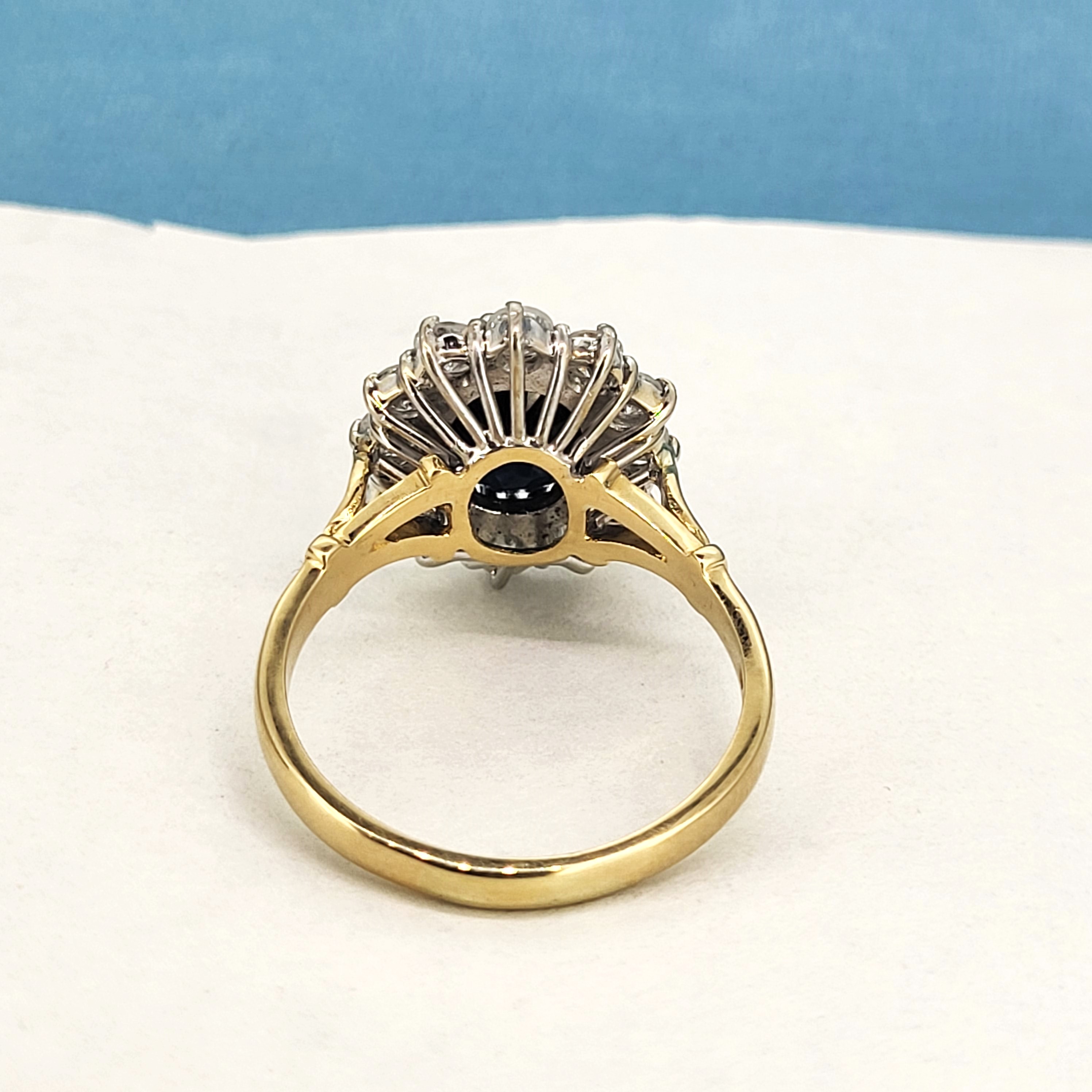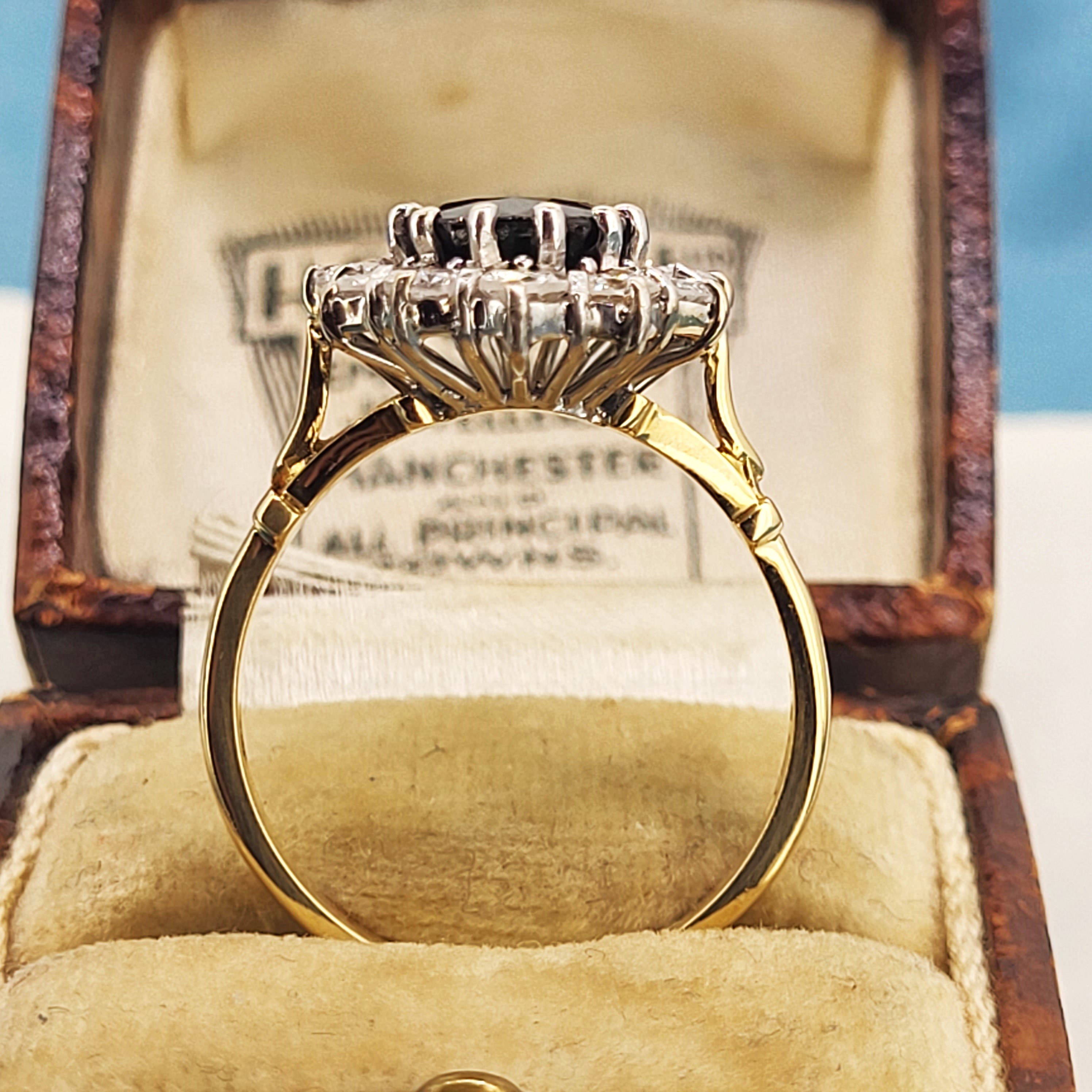 We are delighted to present this gorgeous Vintage Sapphire and Diamond Cluster Ring crafted from 18ct Yellow Gold.