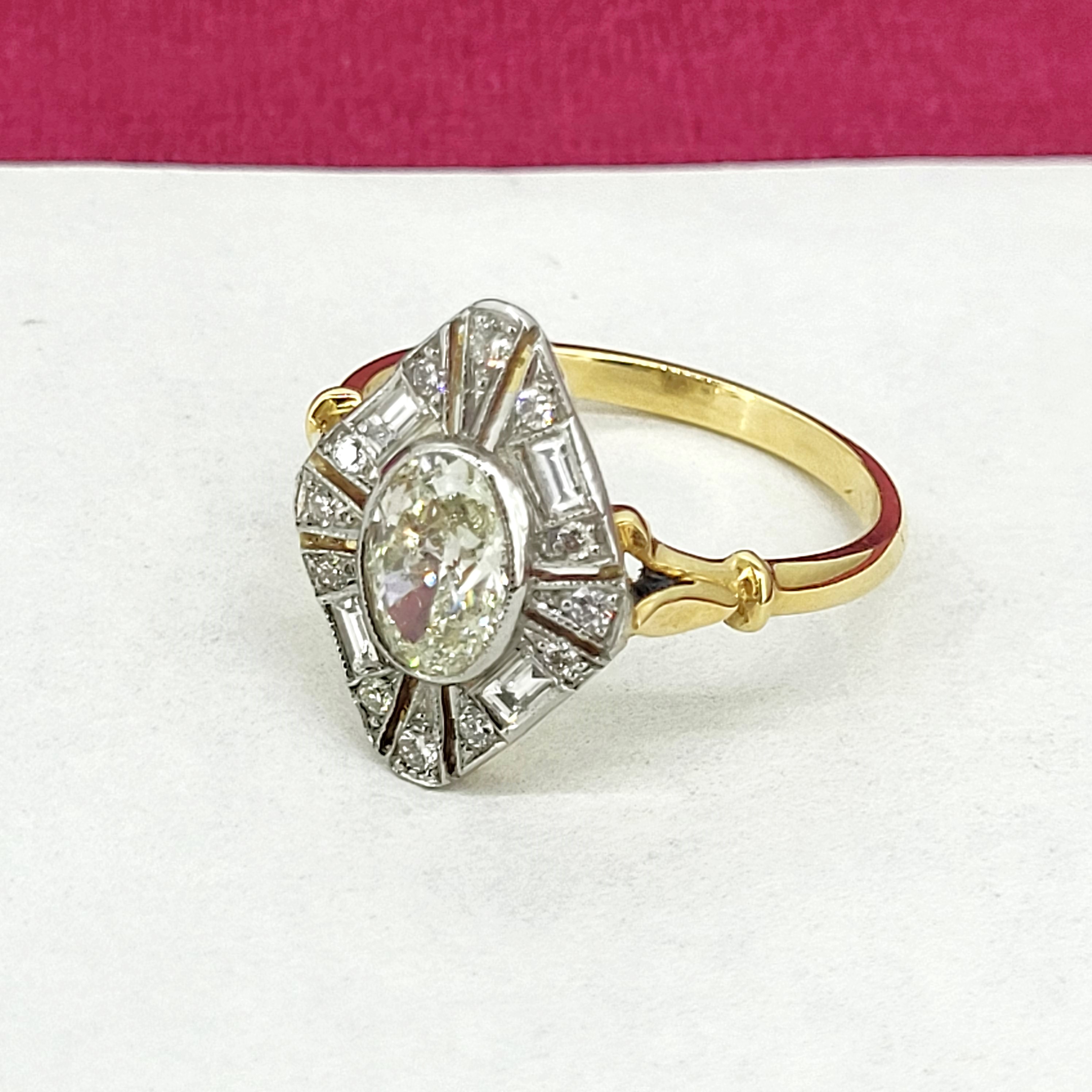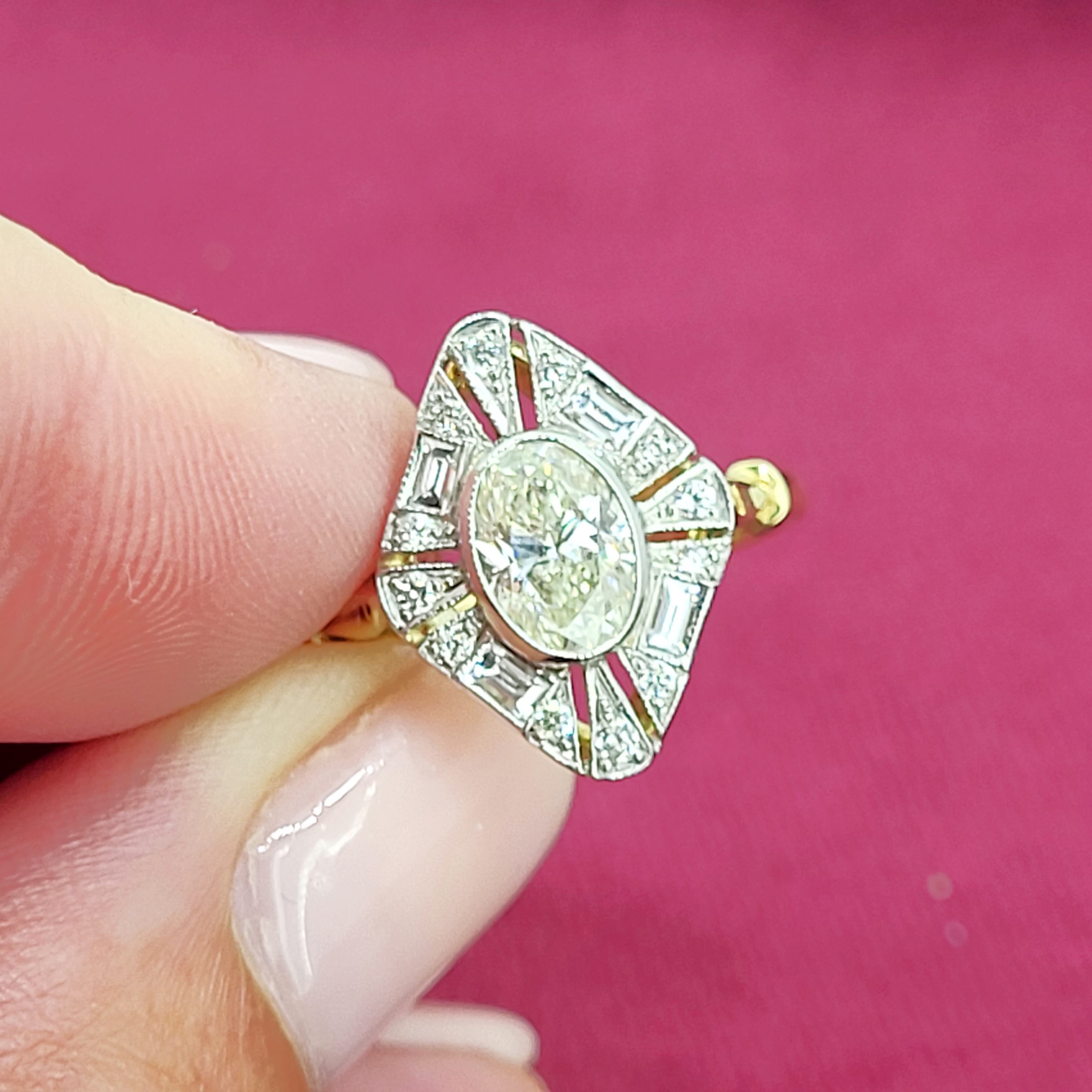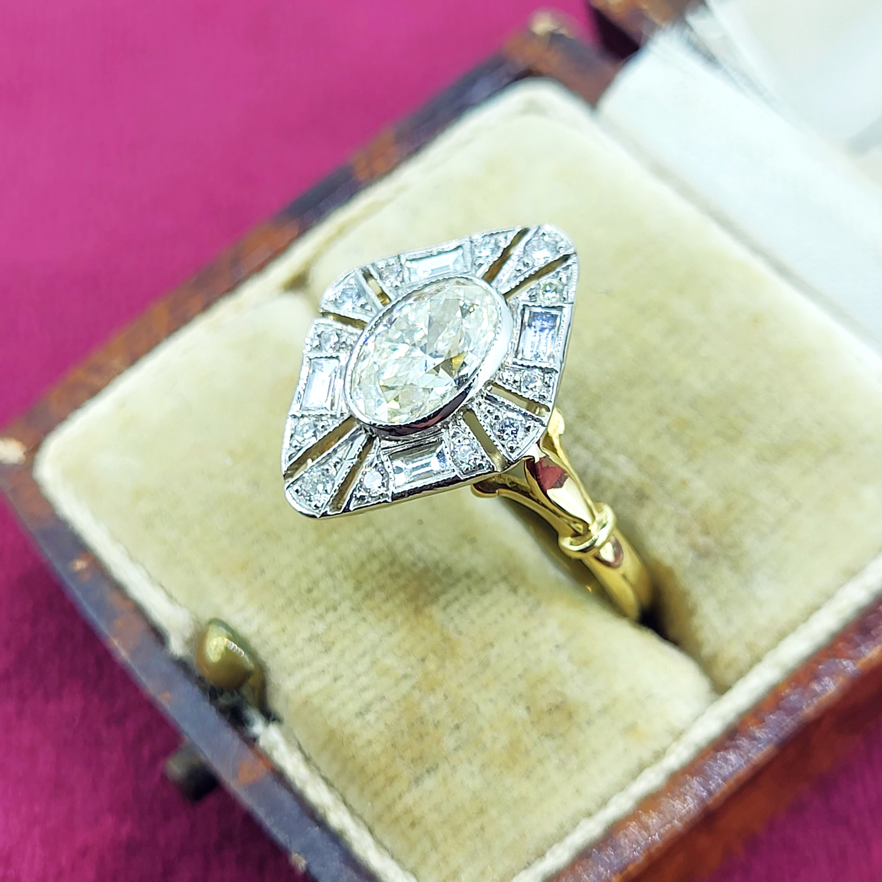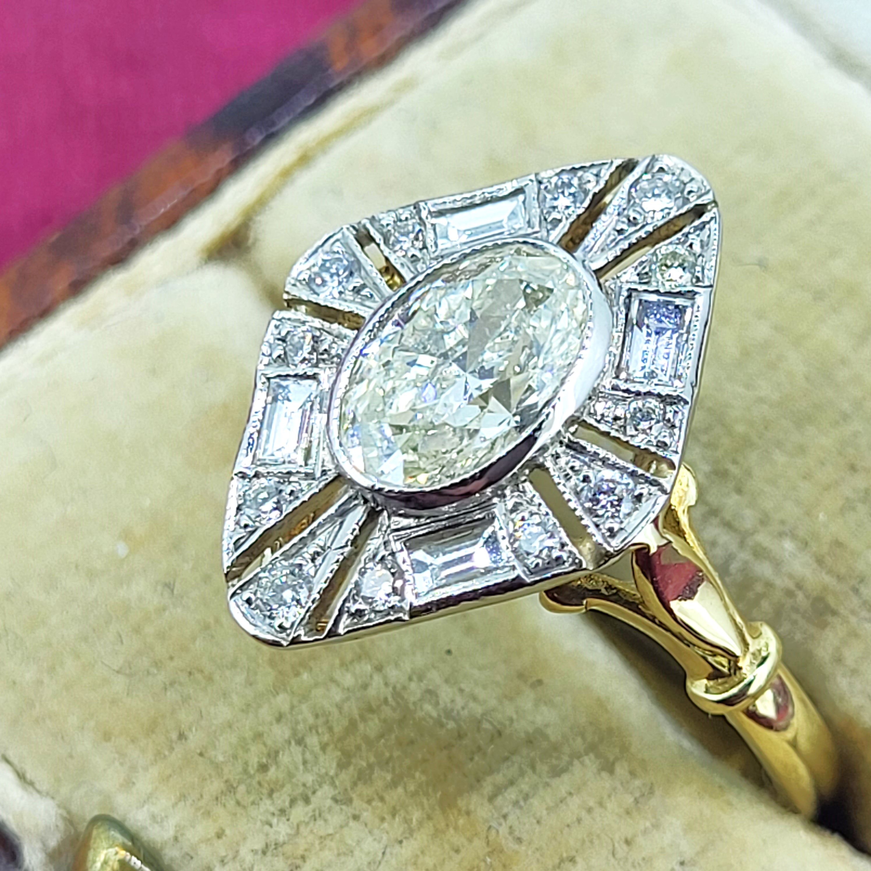 A gorgeous Art Deco Oval Cut Diamond Ring crafted from 18ct Yellow Gold and Platinum.