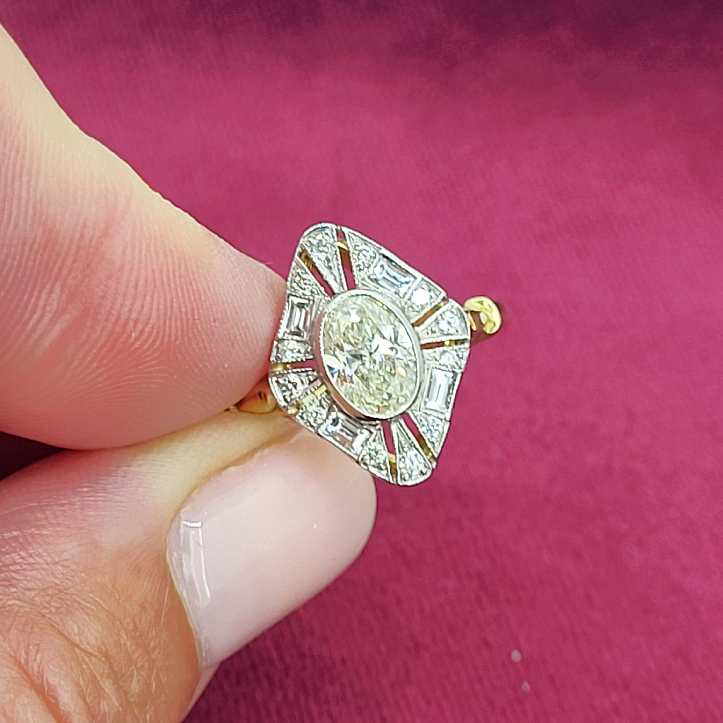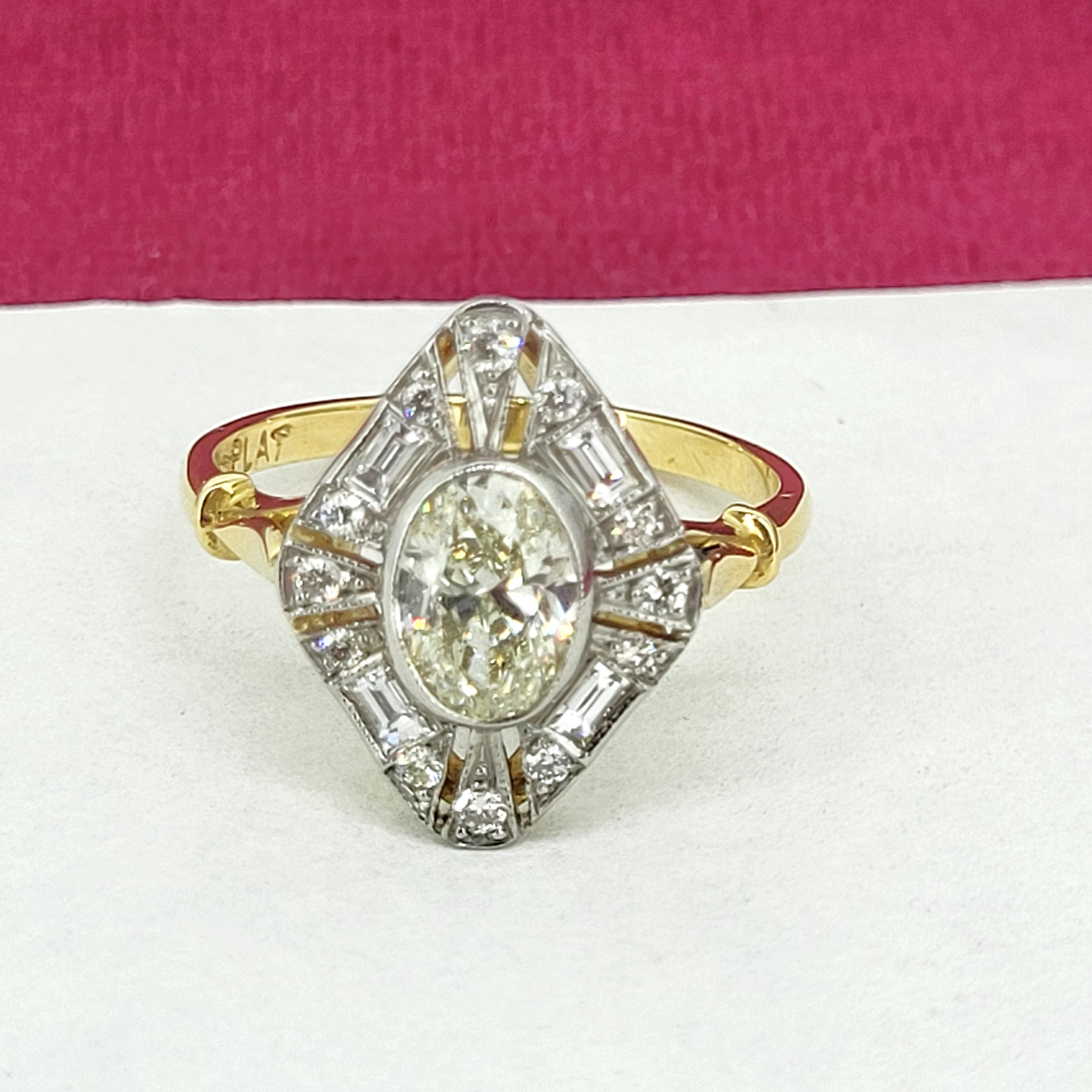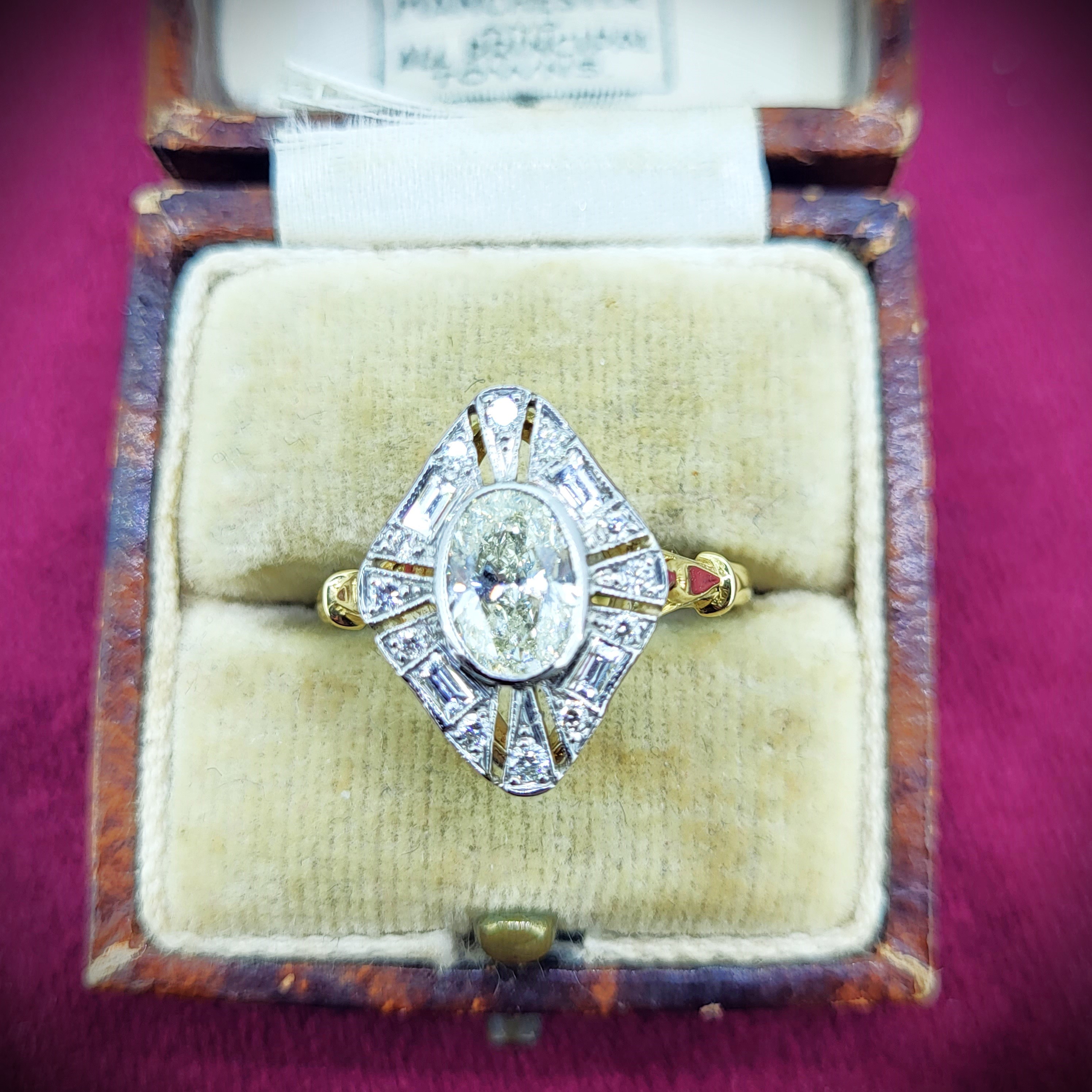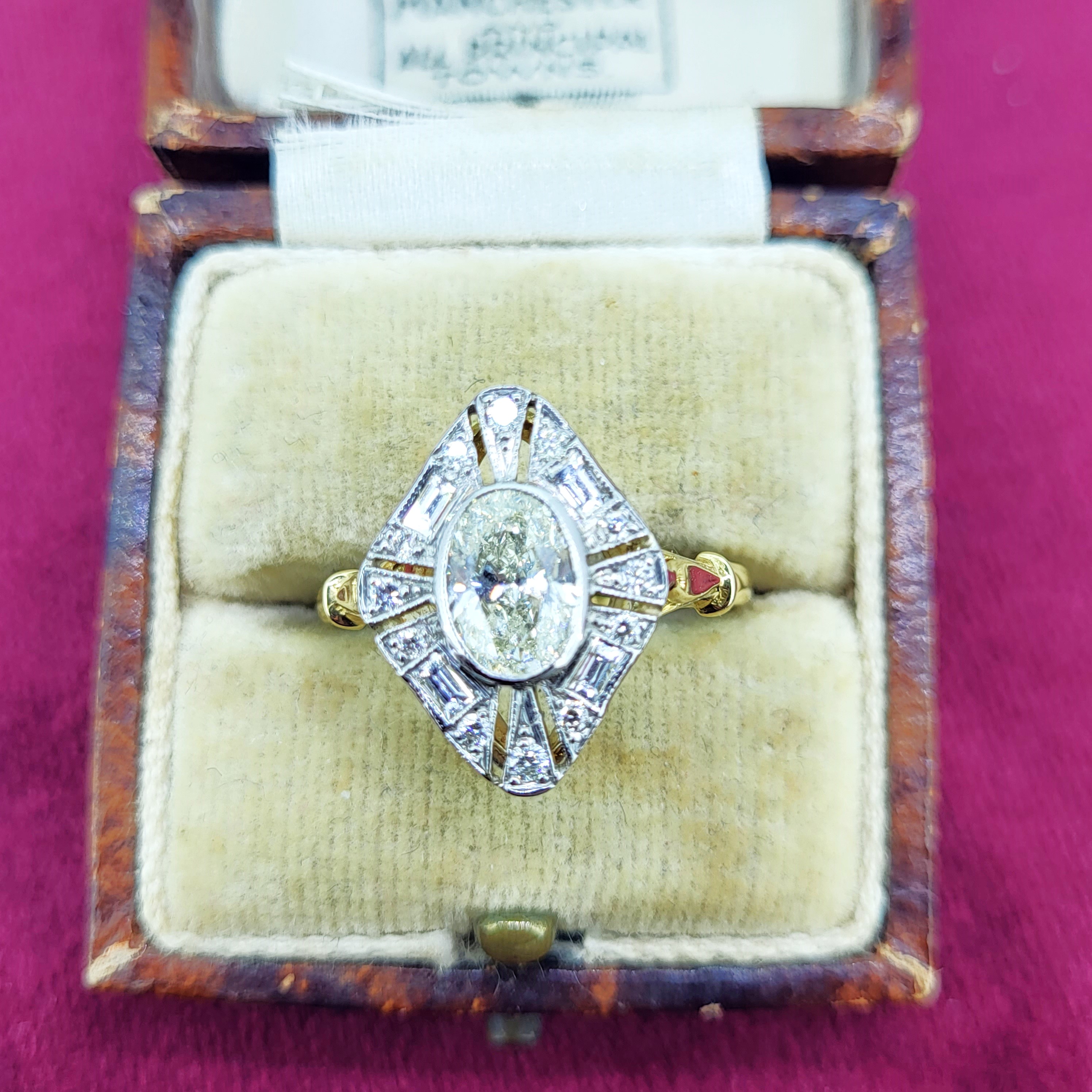 A gorgeous Art Deco Oval Cut Diamond Ring crafted from 18ct Yellow Gold and Platinum.