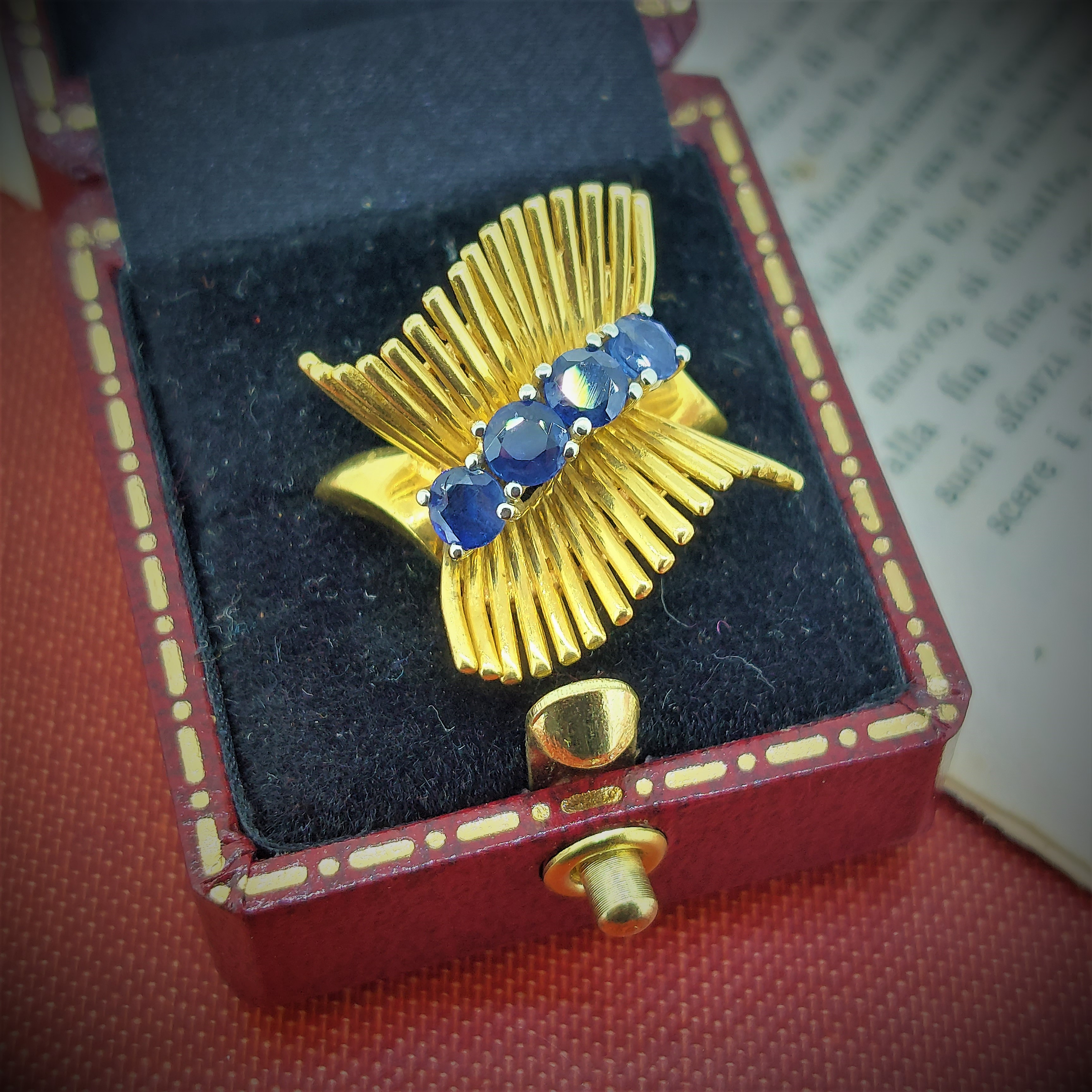 A distinctive vintage cocktail ring set with four round brilliant sapphires weighing an estimated 0.25ct each. The ring is made from 18ct yellow gold and weighs 8grams. Currently size K but can be altered to fit.