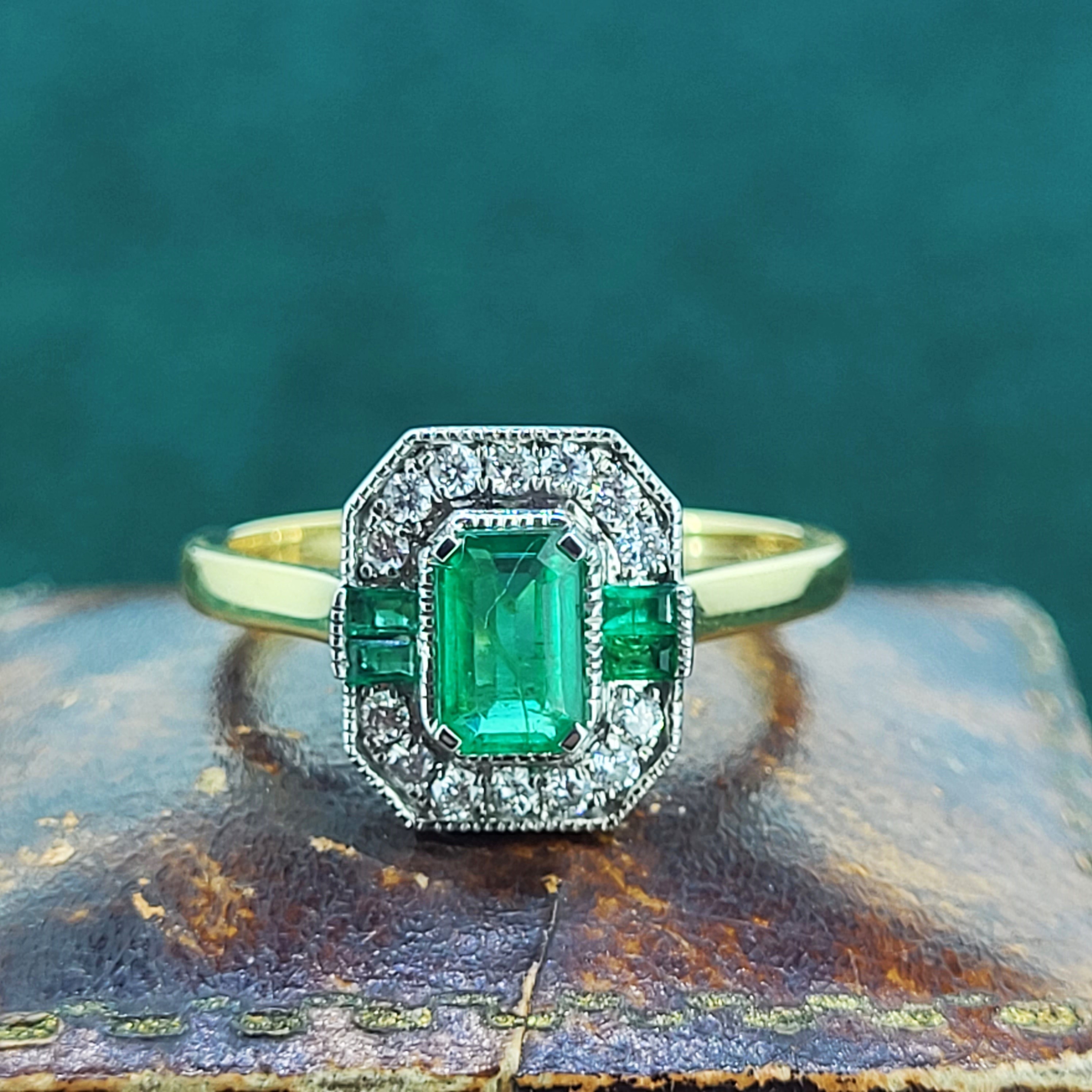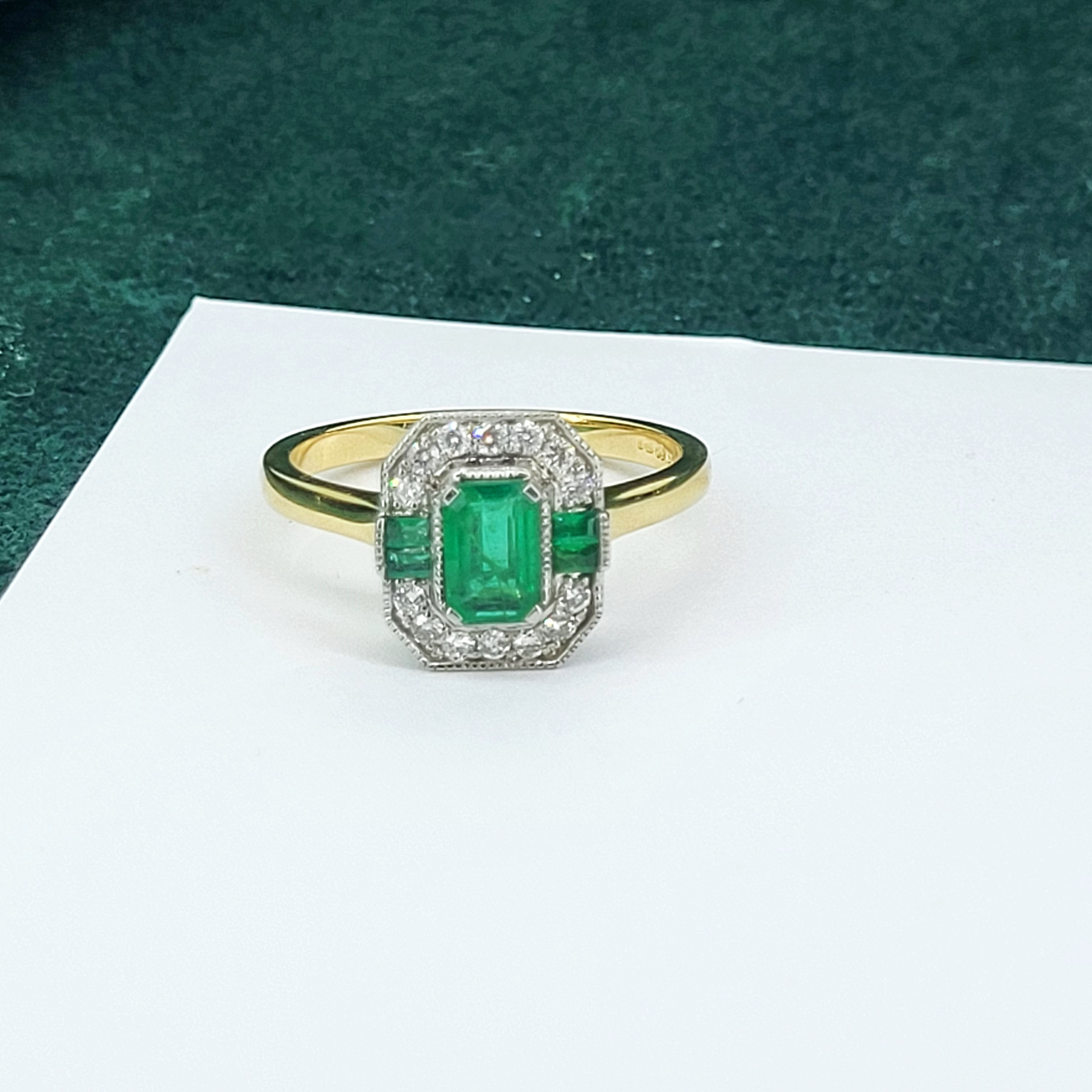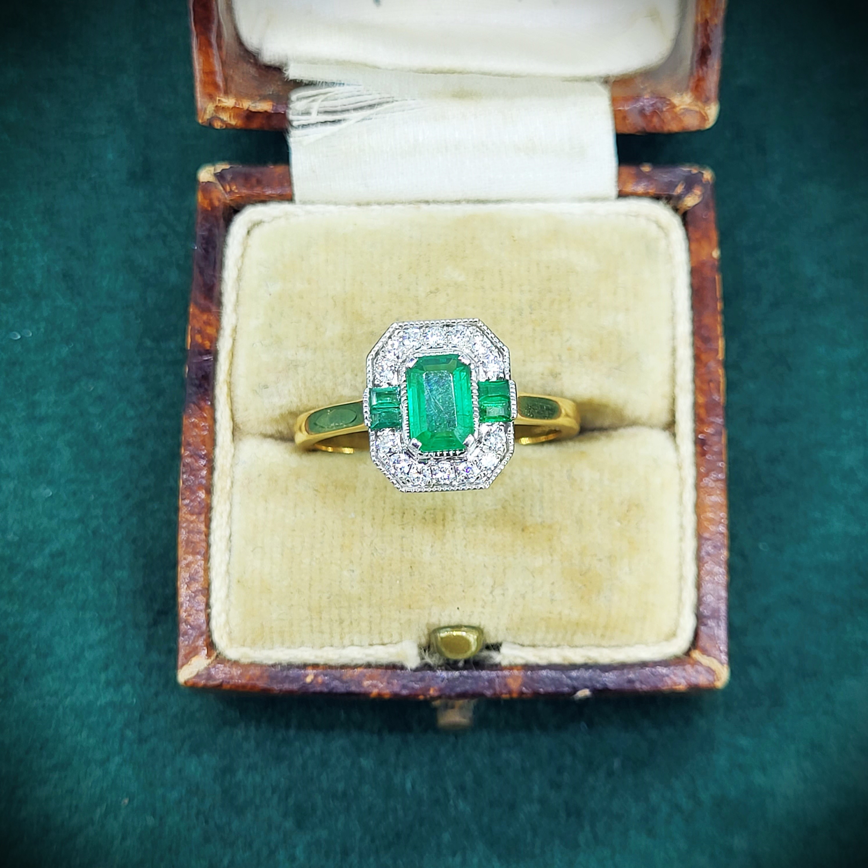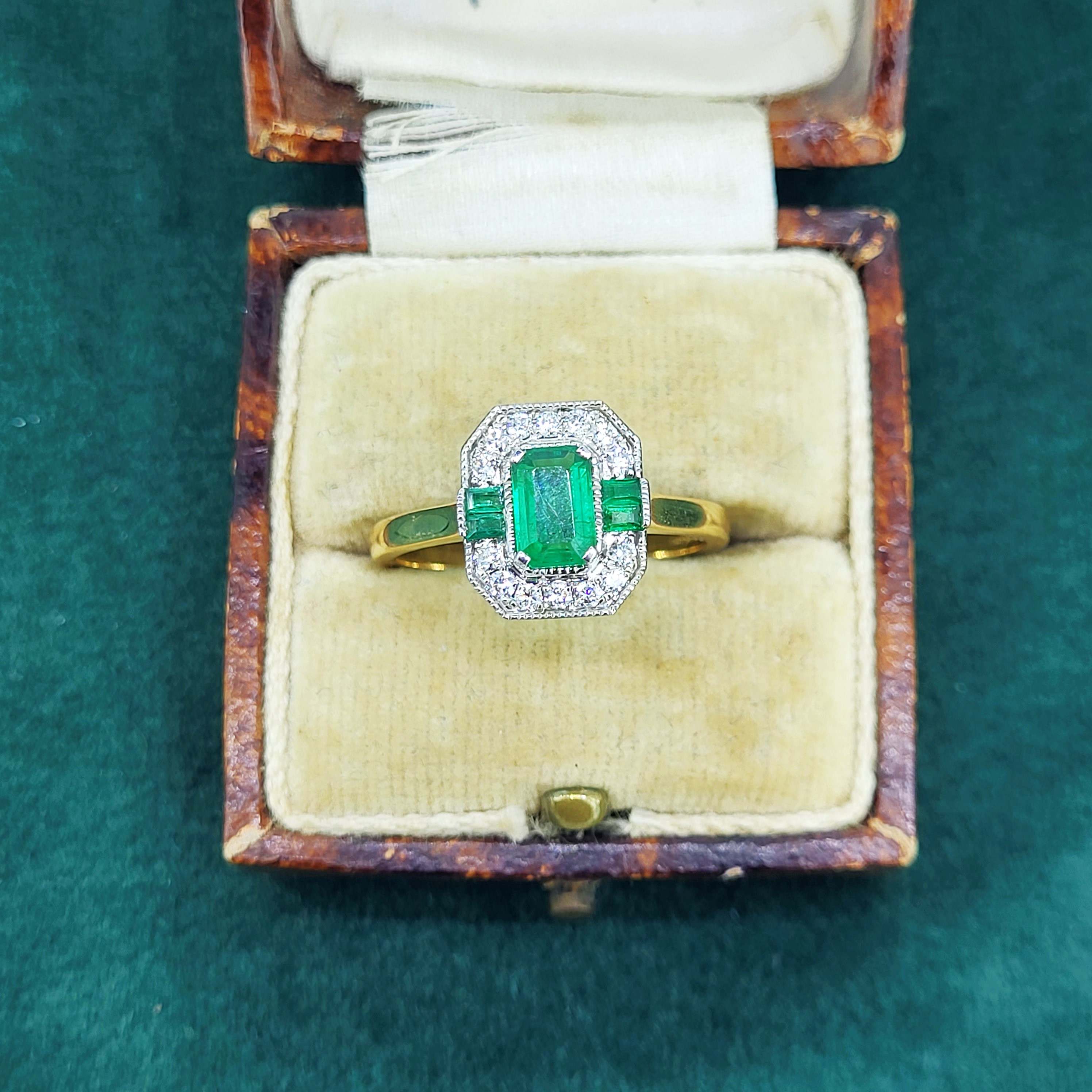 A stunning Emerald and Diamond Art Deco Ring crafted from 18ct Yellow Gold. The ring features a central Emerald Cut Emerald weighing 0.75cts which is surrounded by grain set Round Brilliant Diamonds weighing 0.20cts. There are two Baguette Emeralds either side of the central Emerald which contrast wonderfully against the Diamond surround.