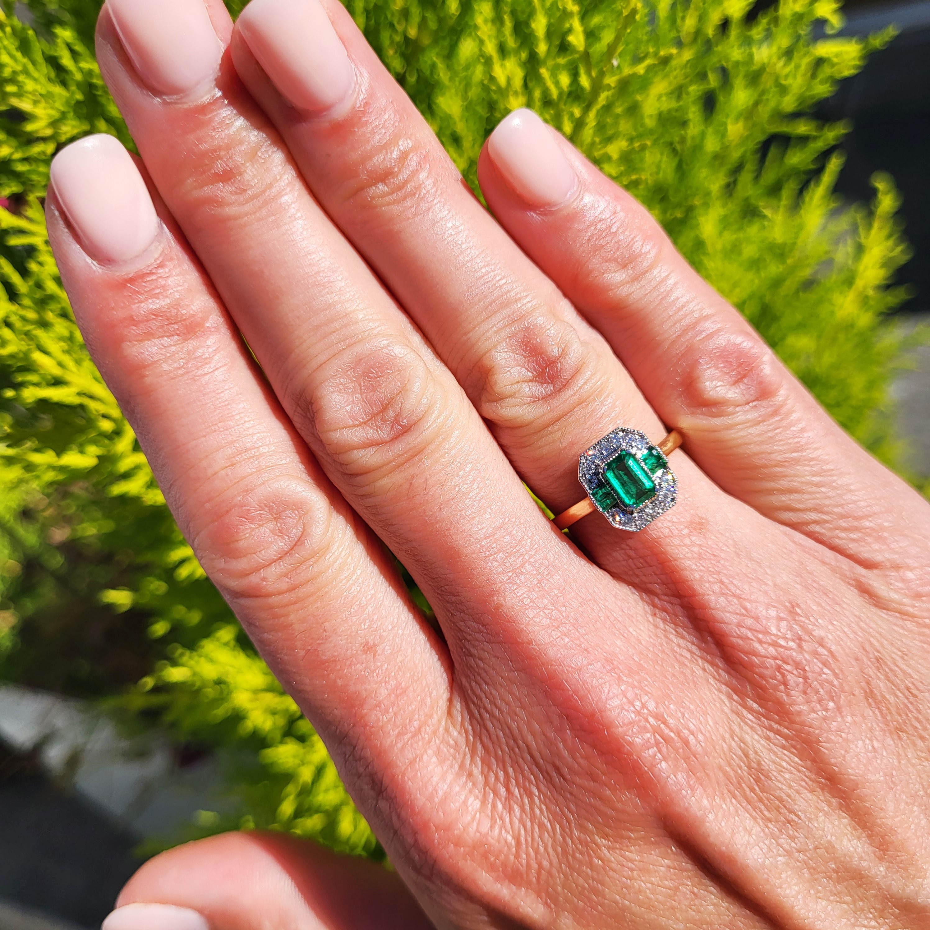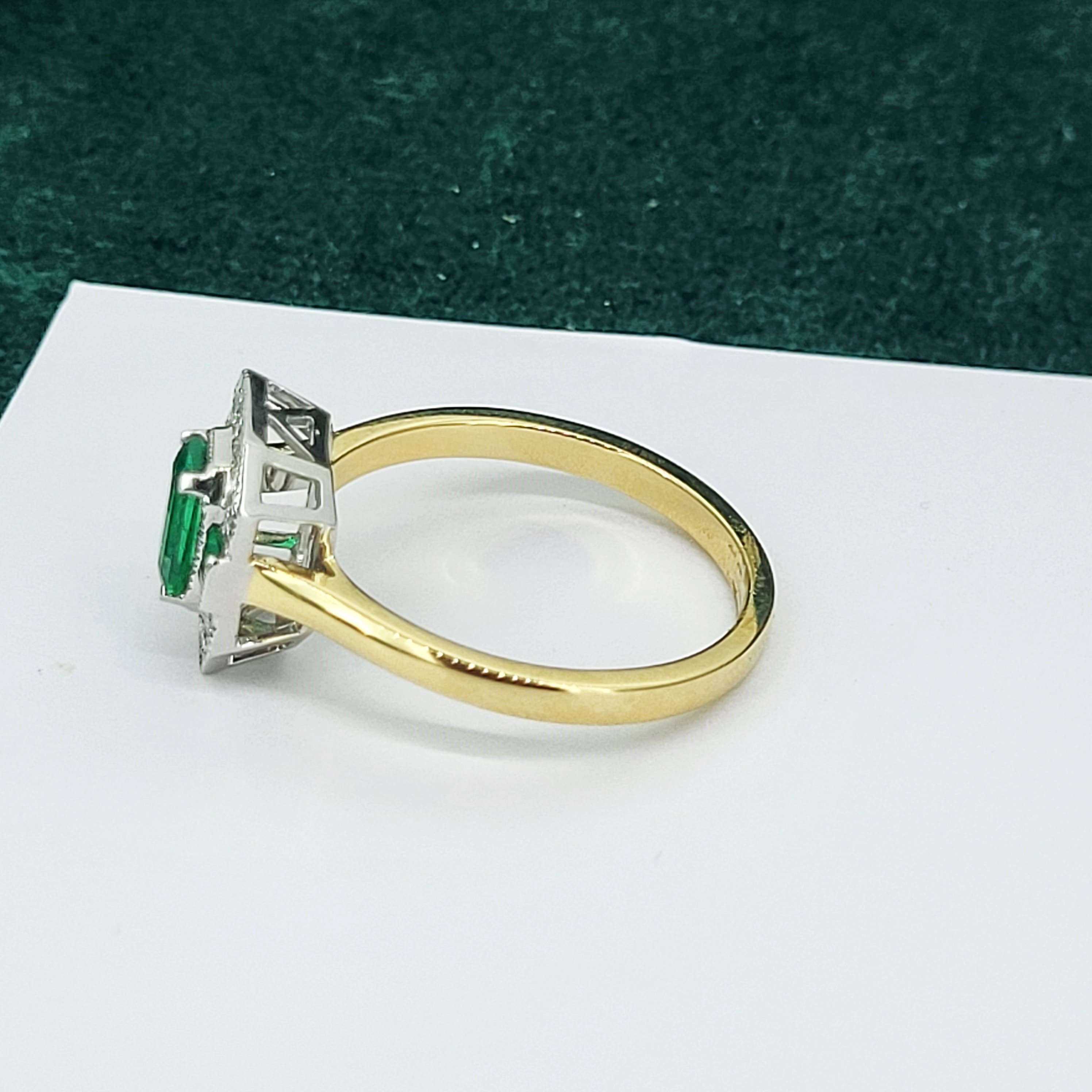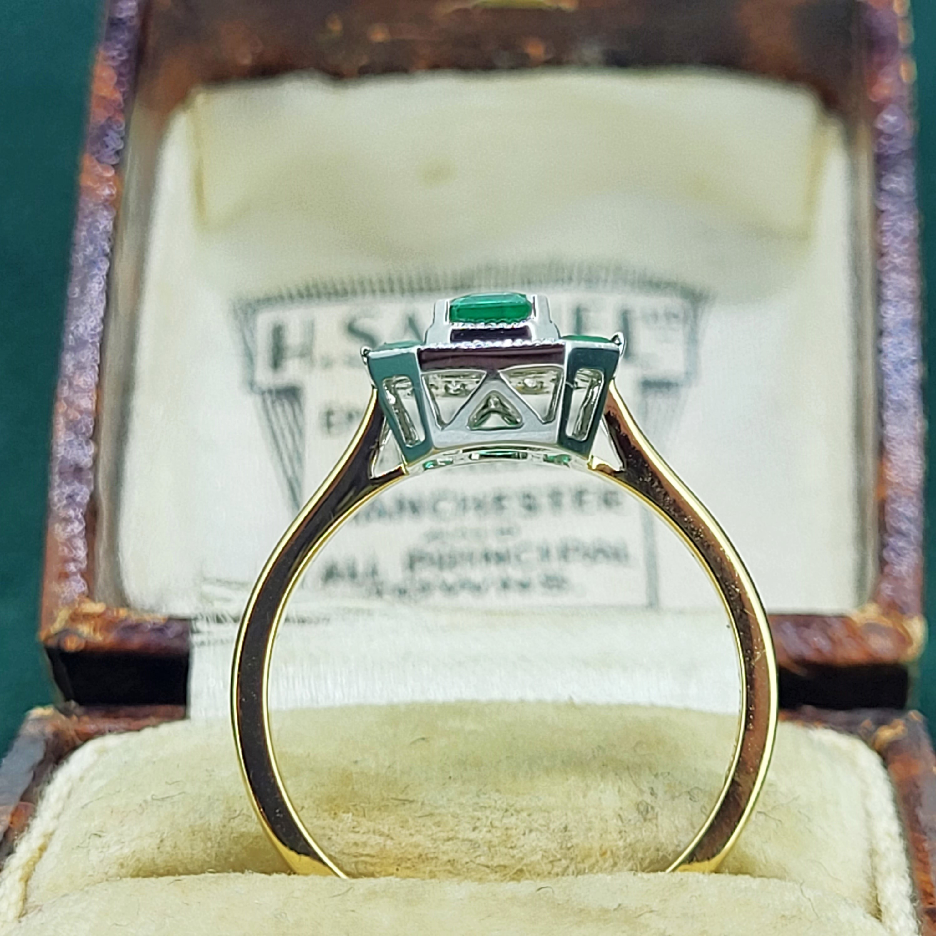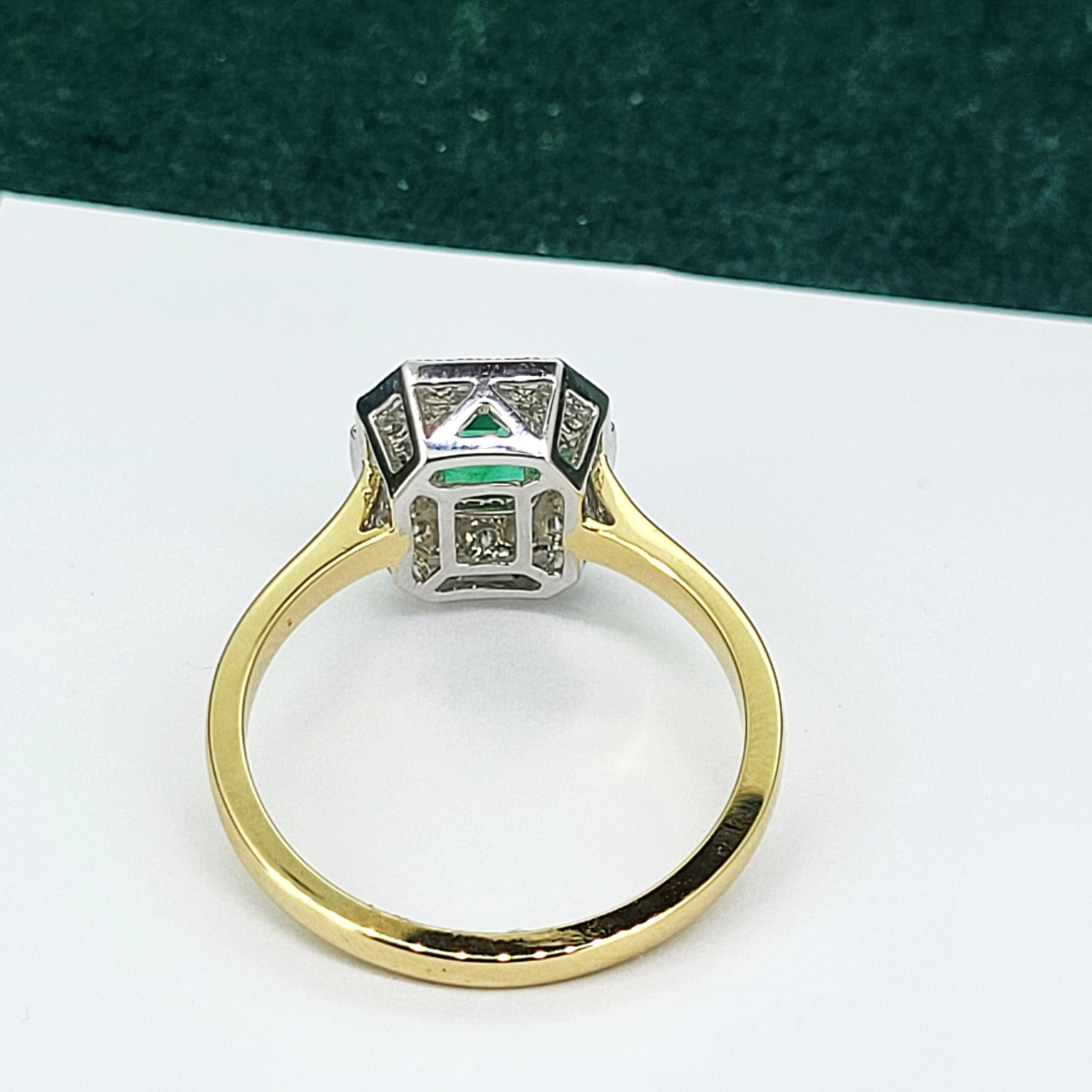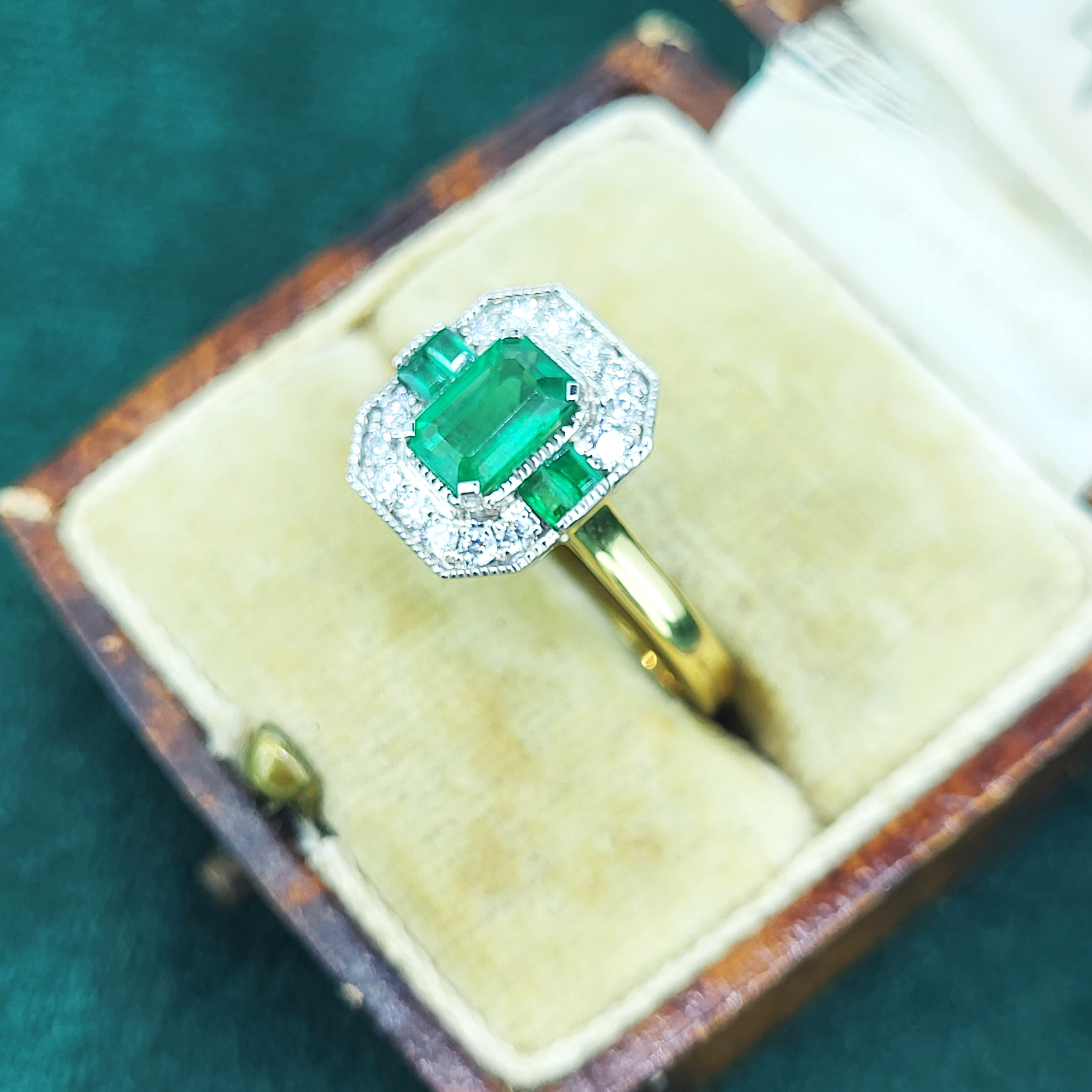 A stunning Emerald and Diamond Art Deco Ring crafted from 18ct Yellow Gold. The ring features a central Emerald Cut Emerald weighing 0.75cts which is surrounded by grain set Round Brilliant Diamonds weighing 0.20cts. There are two Baguette Emeralds either side of the central Emerald which contrast wonderfully against the Diamond surround.