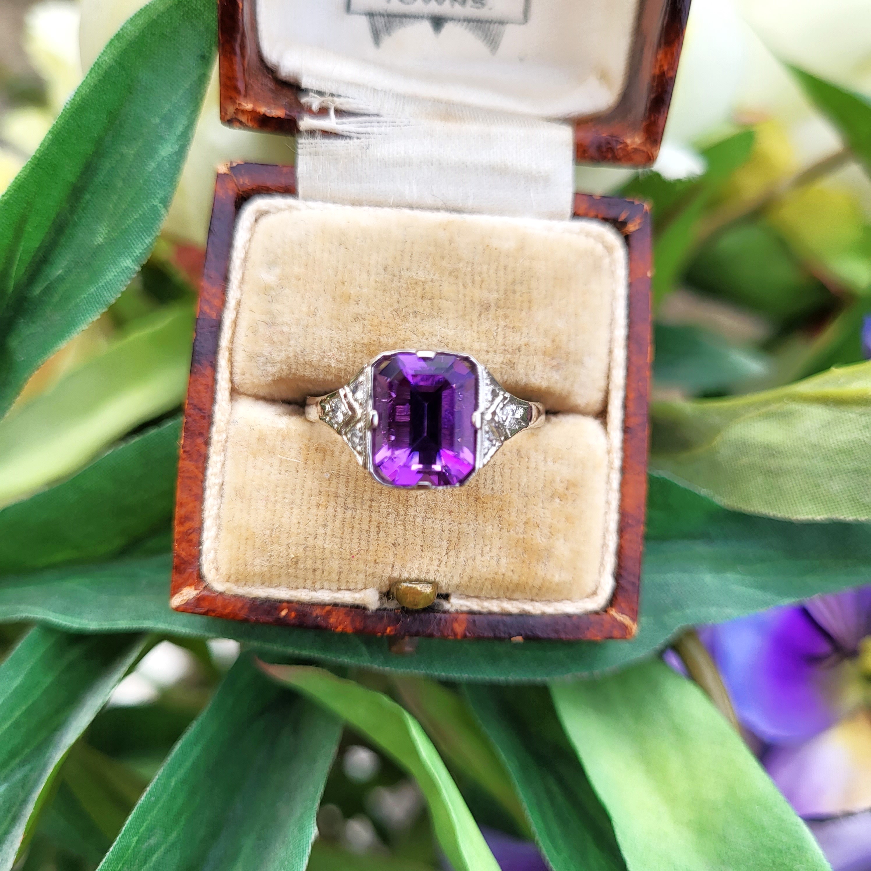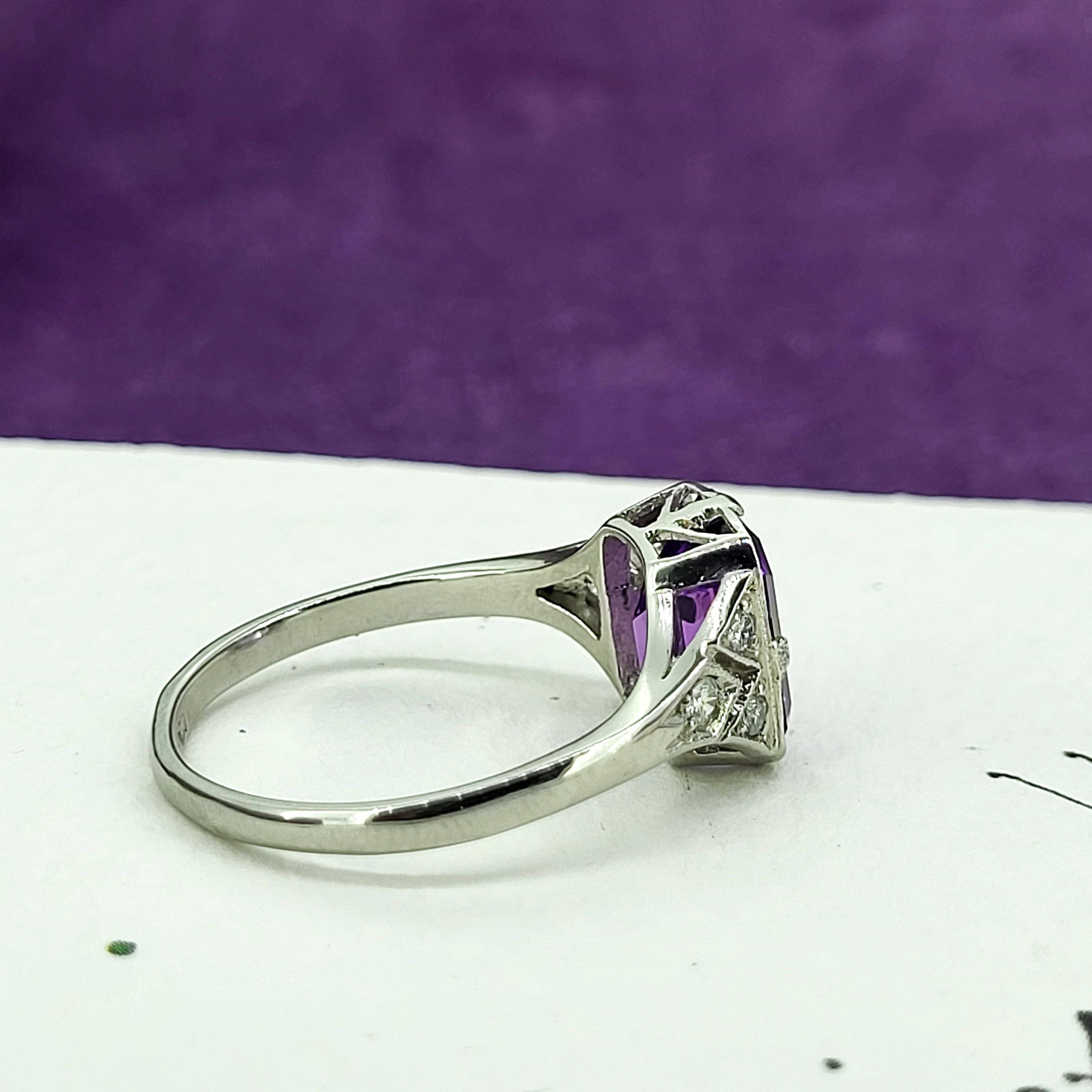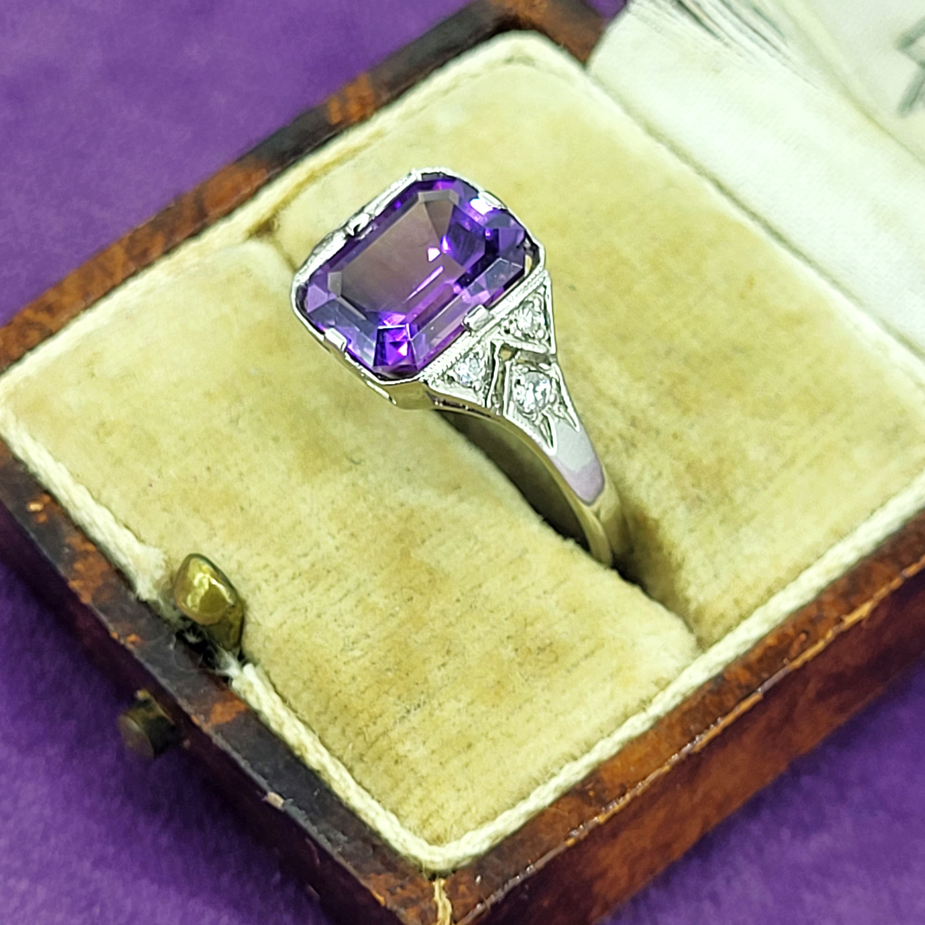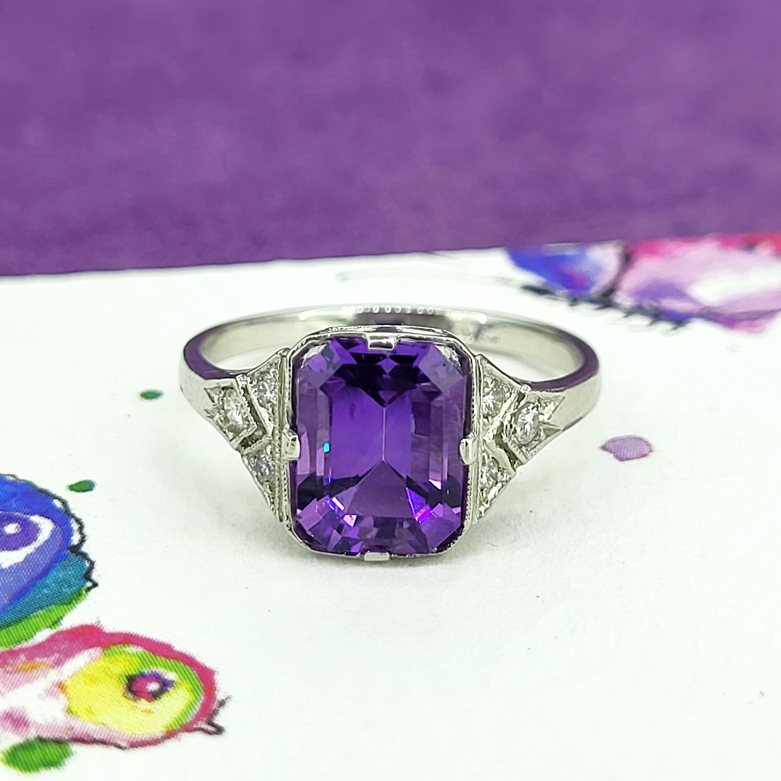A stunning Amethyst and Diamond Art Deco Ring crafted from Platinum.