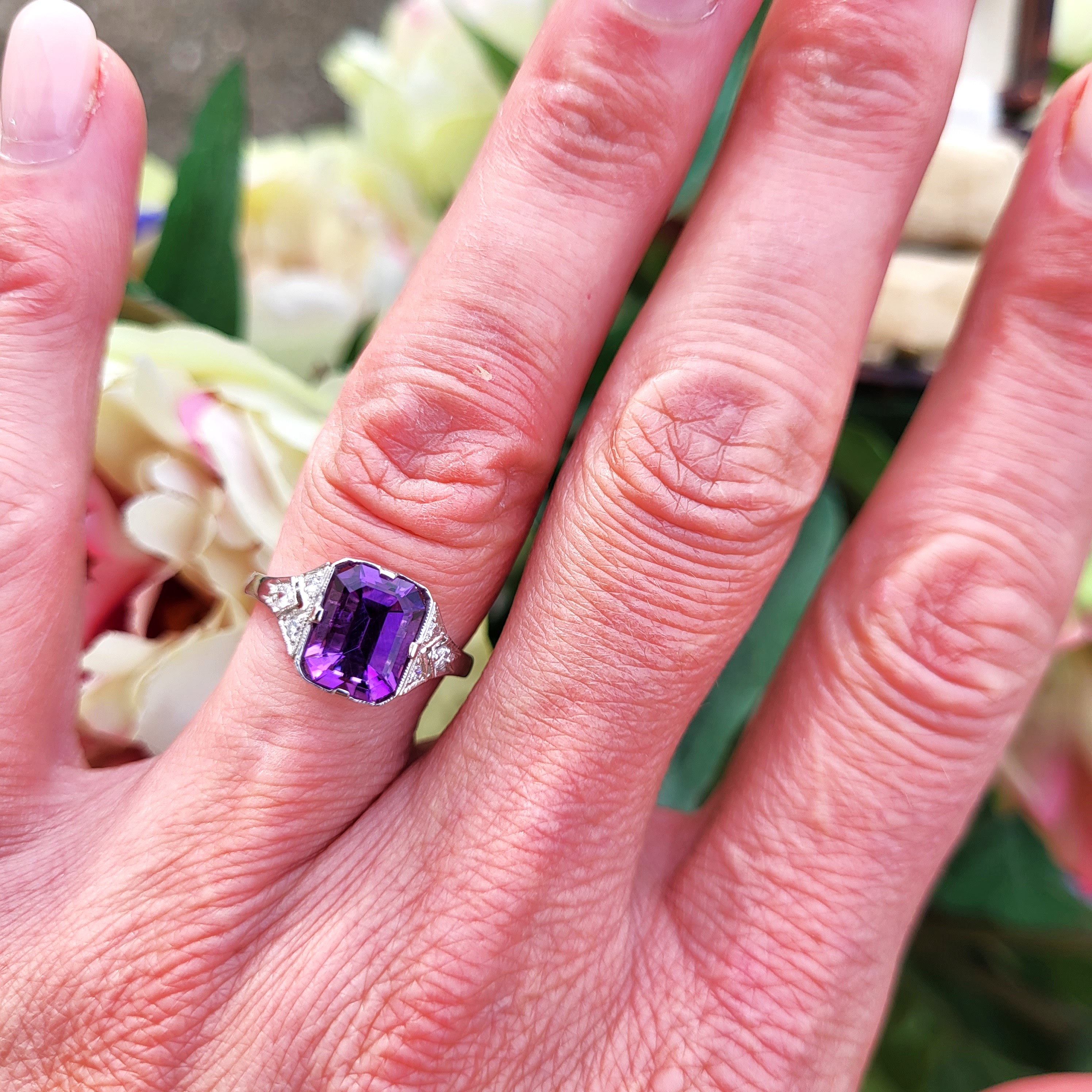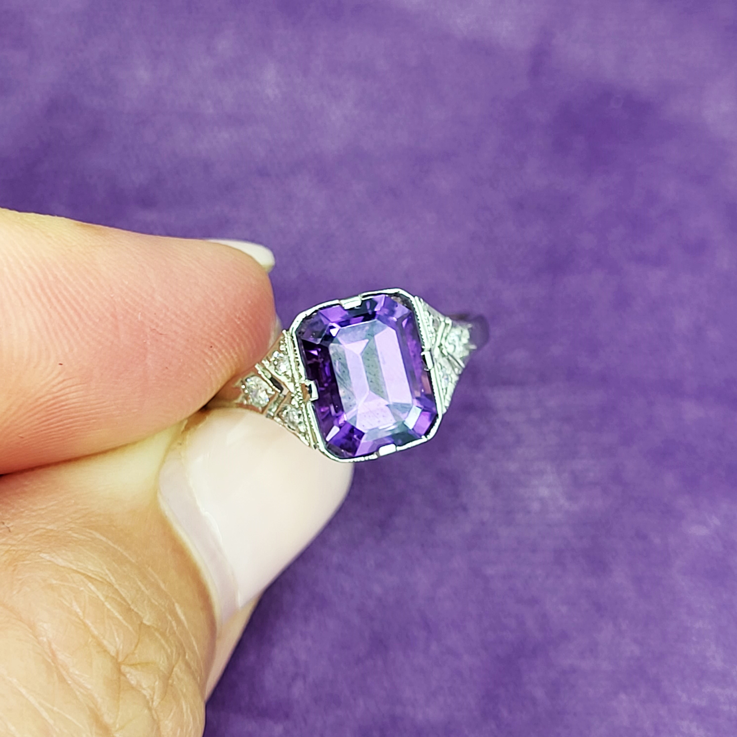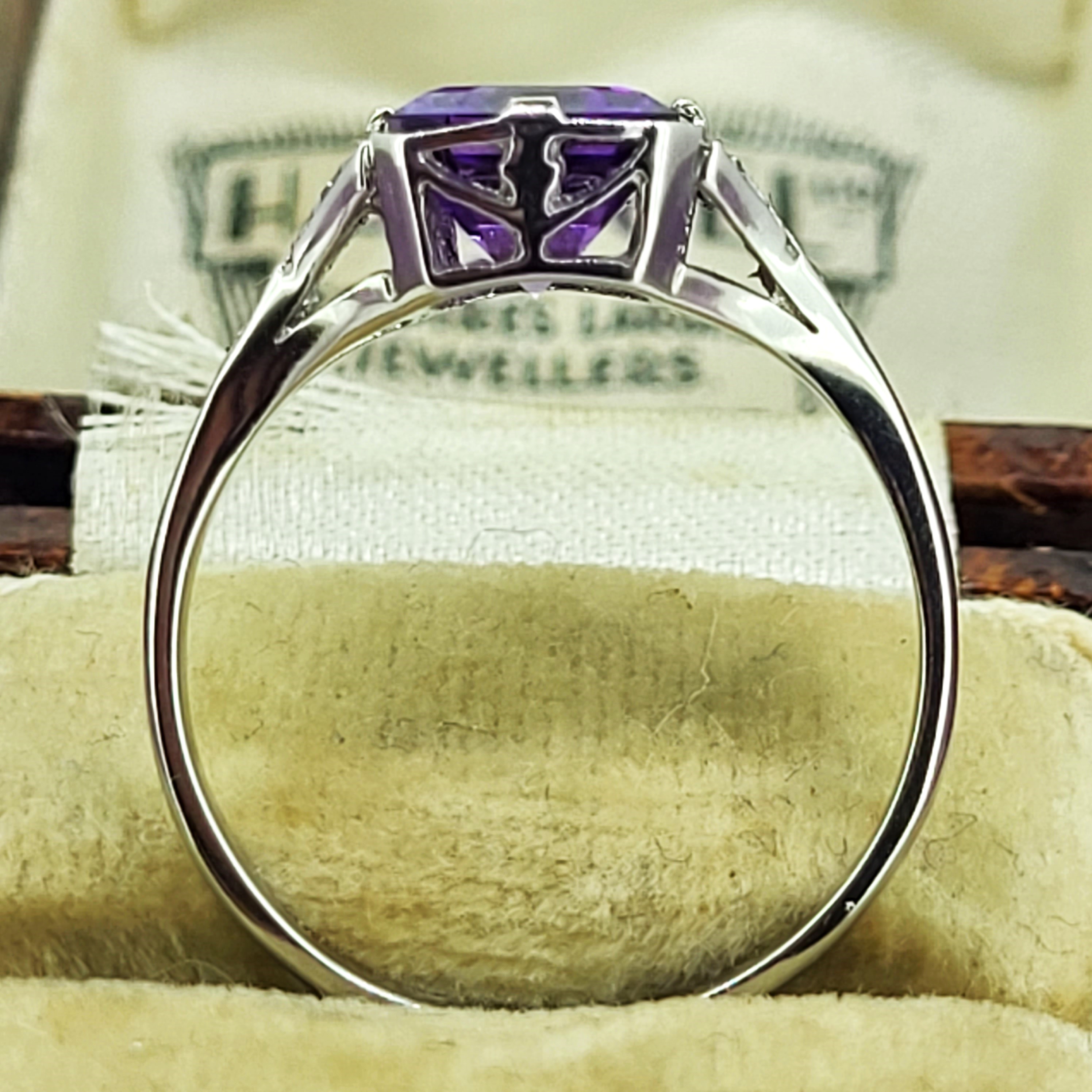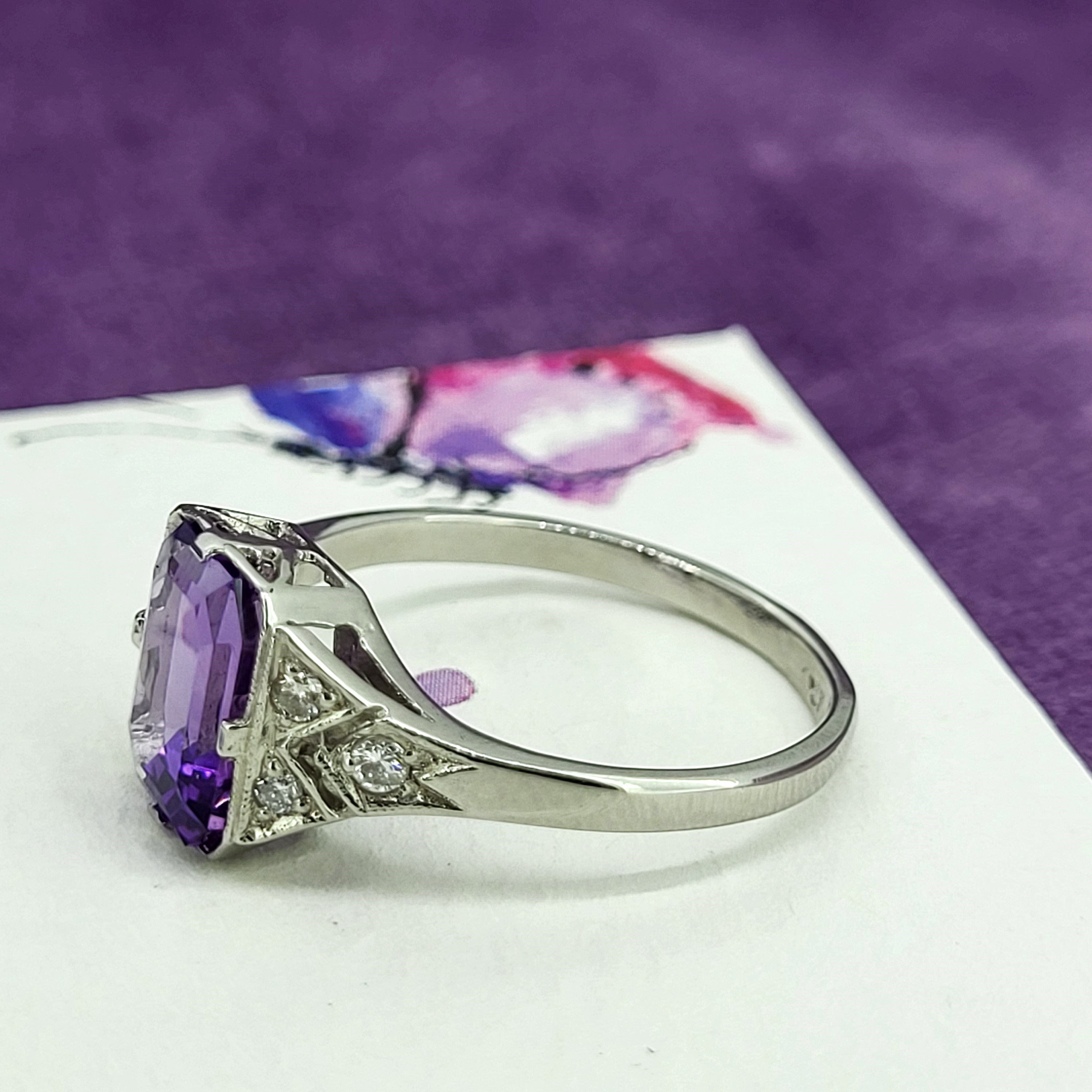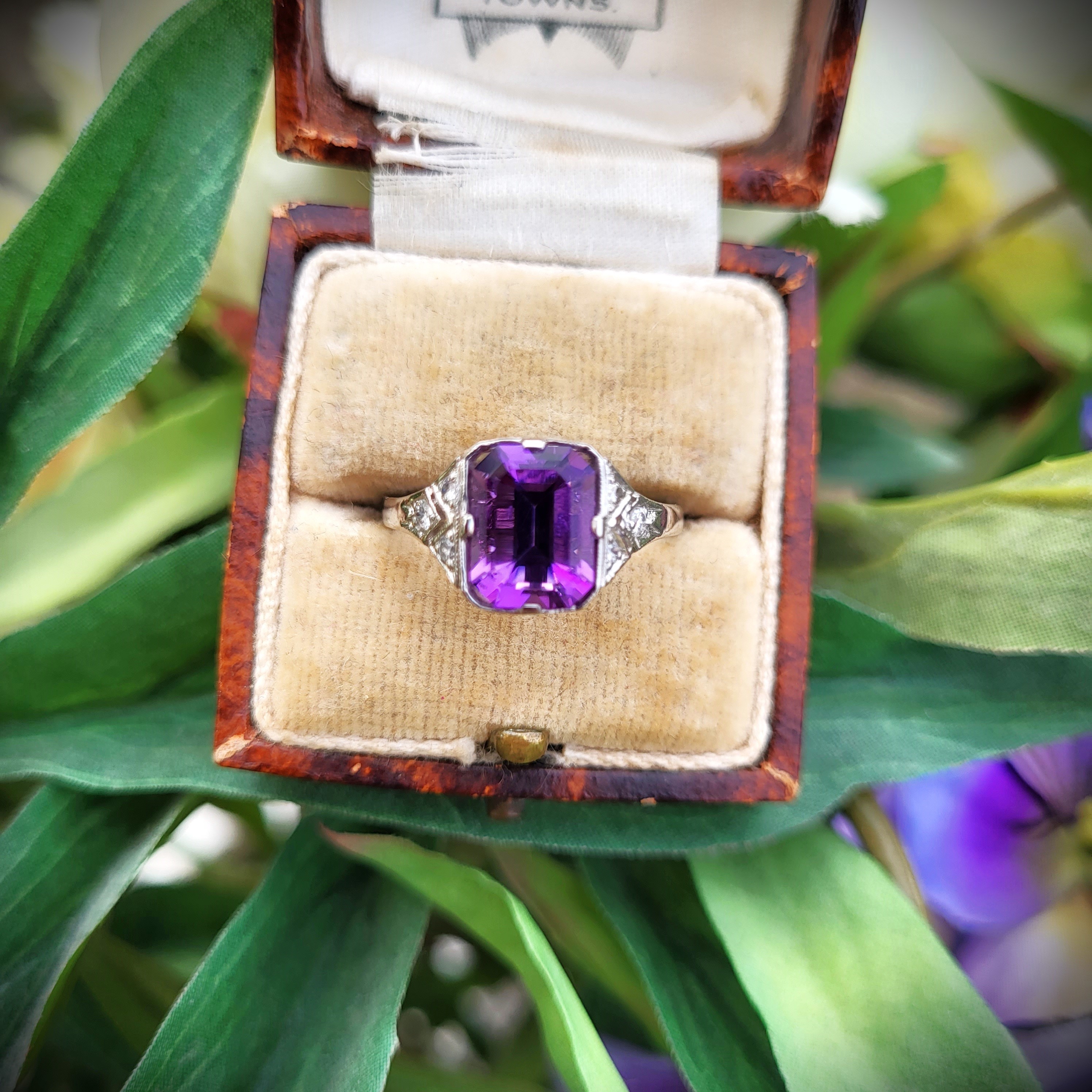 A stunning Amethyst and Diamond Art Deco Ring crafted from Platinum.