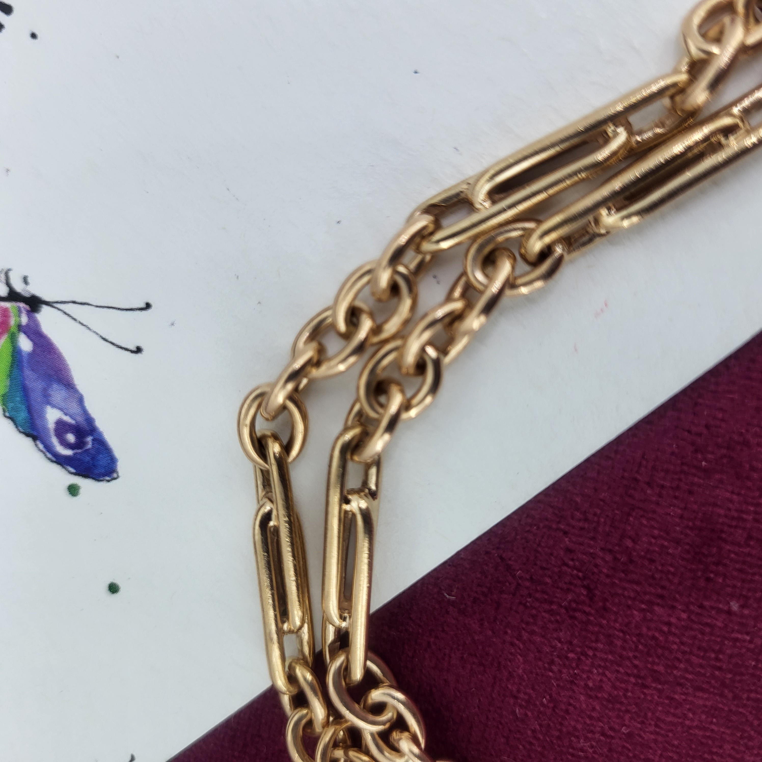 The much sought after trombone links are 5mm in width and the solid t-bar spans 34mm. This item weighs 17.9 grams and will fit a 19cm wrist. Our trombone link bracelets and necklaces are always in demand so contact us today if this gem caught your eye!