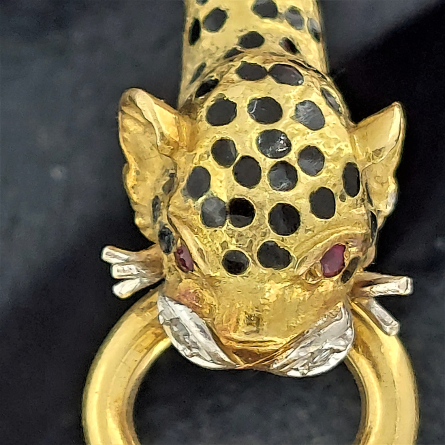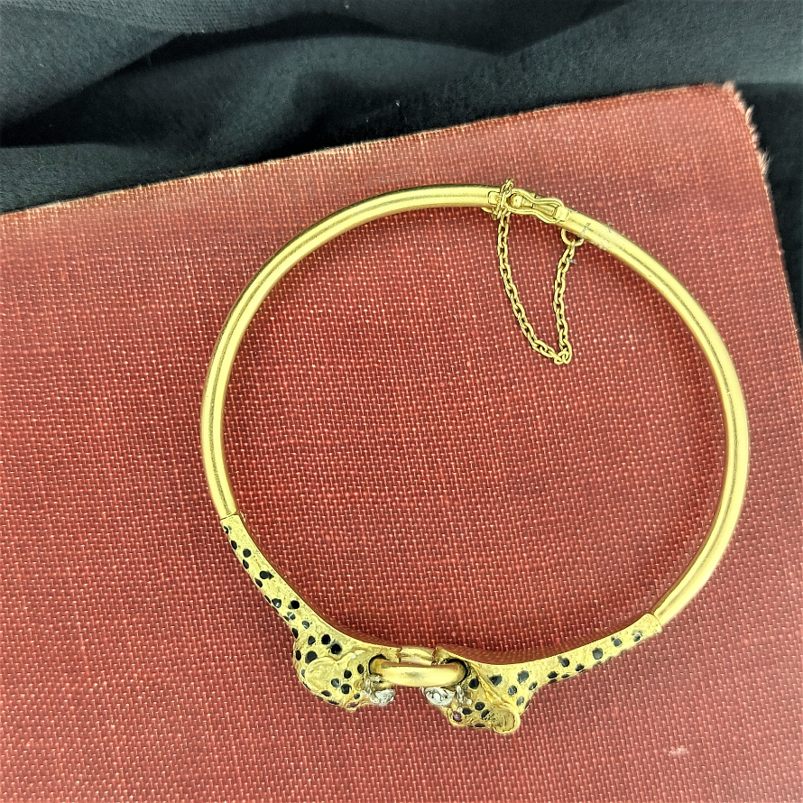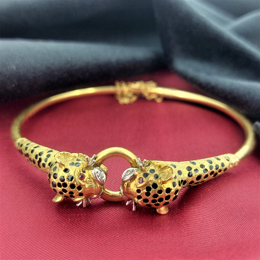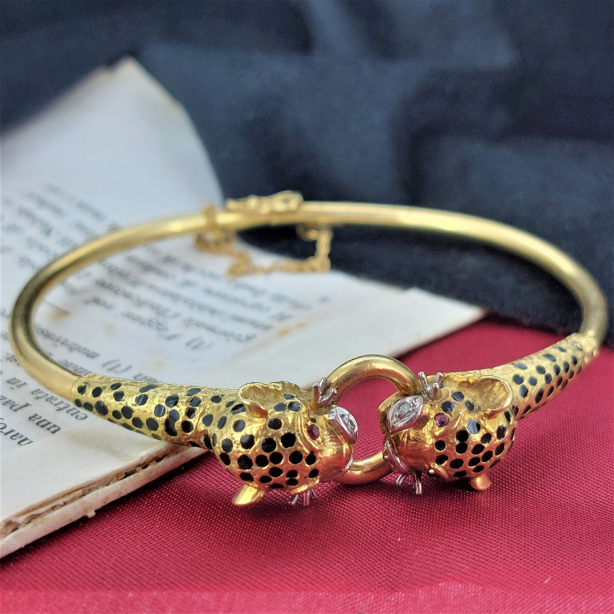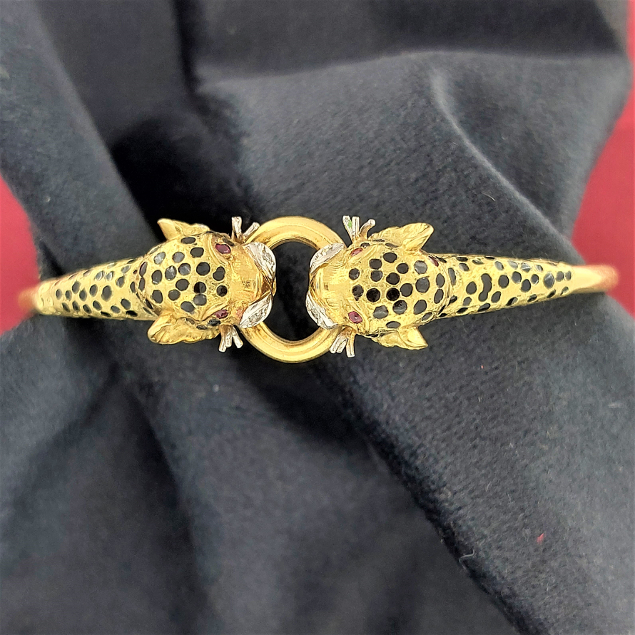 Dating back to the 1970s here we present a double jaguar head bangle adorned with ruby eyes, diamond snout and black enamel spots - ROAR!