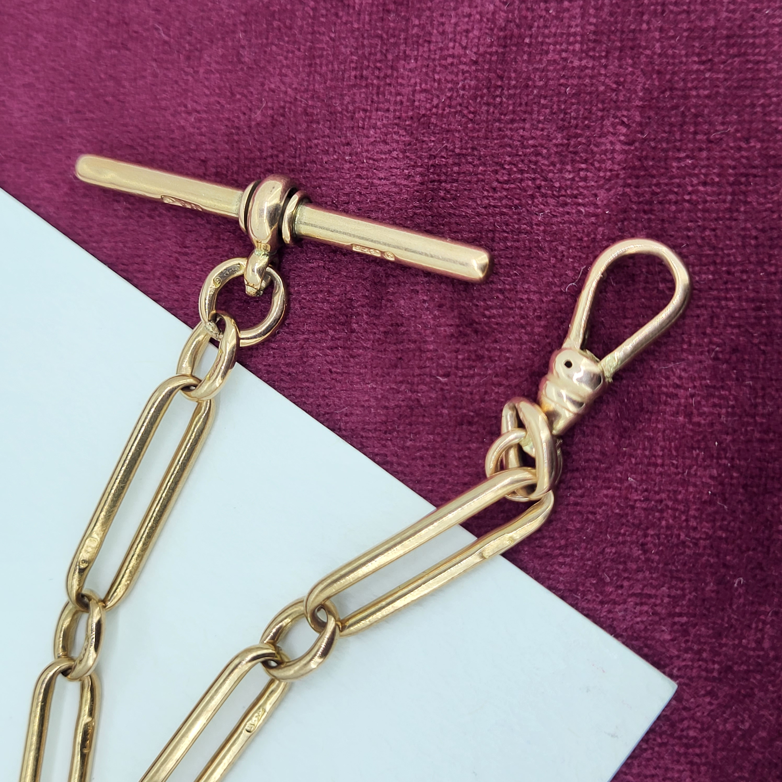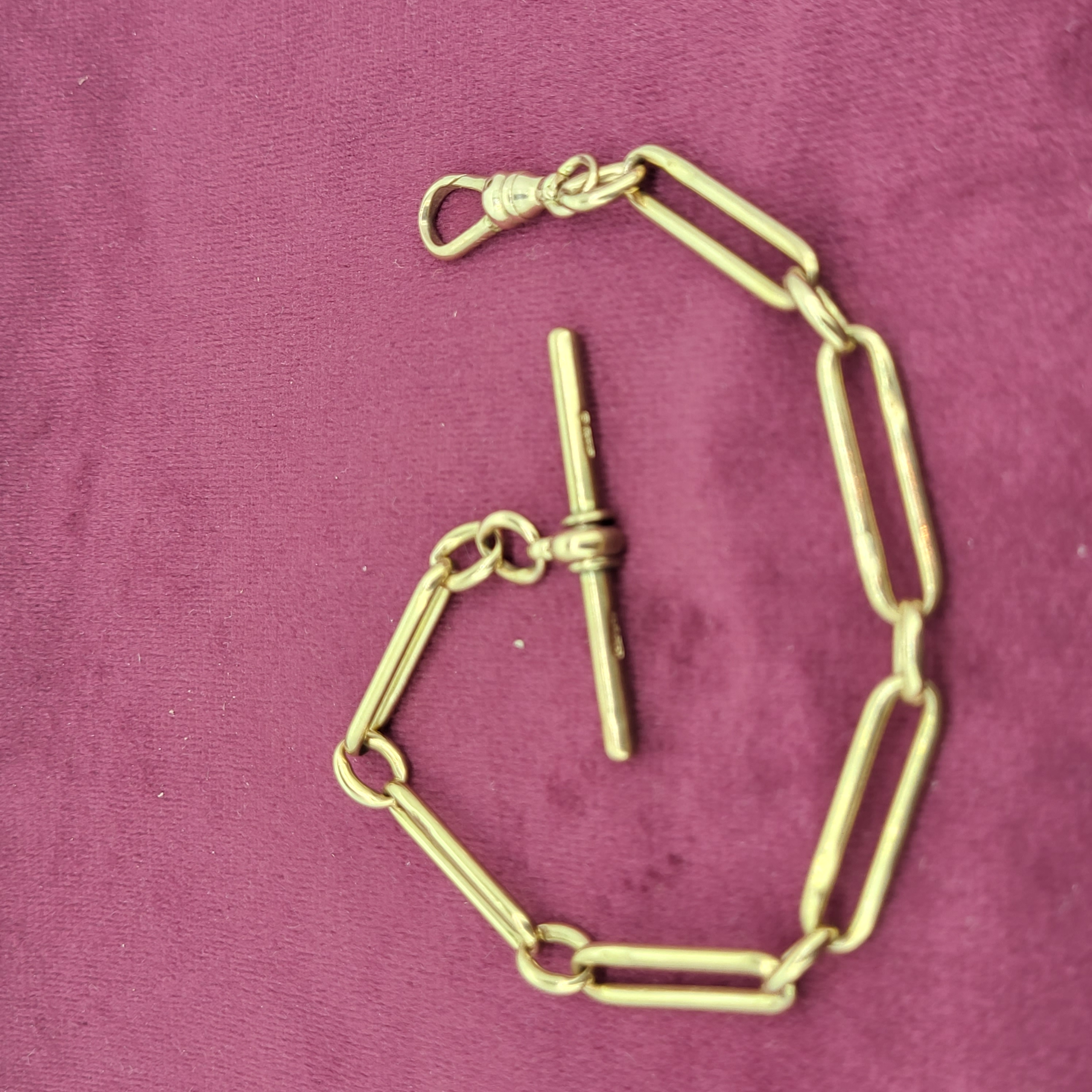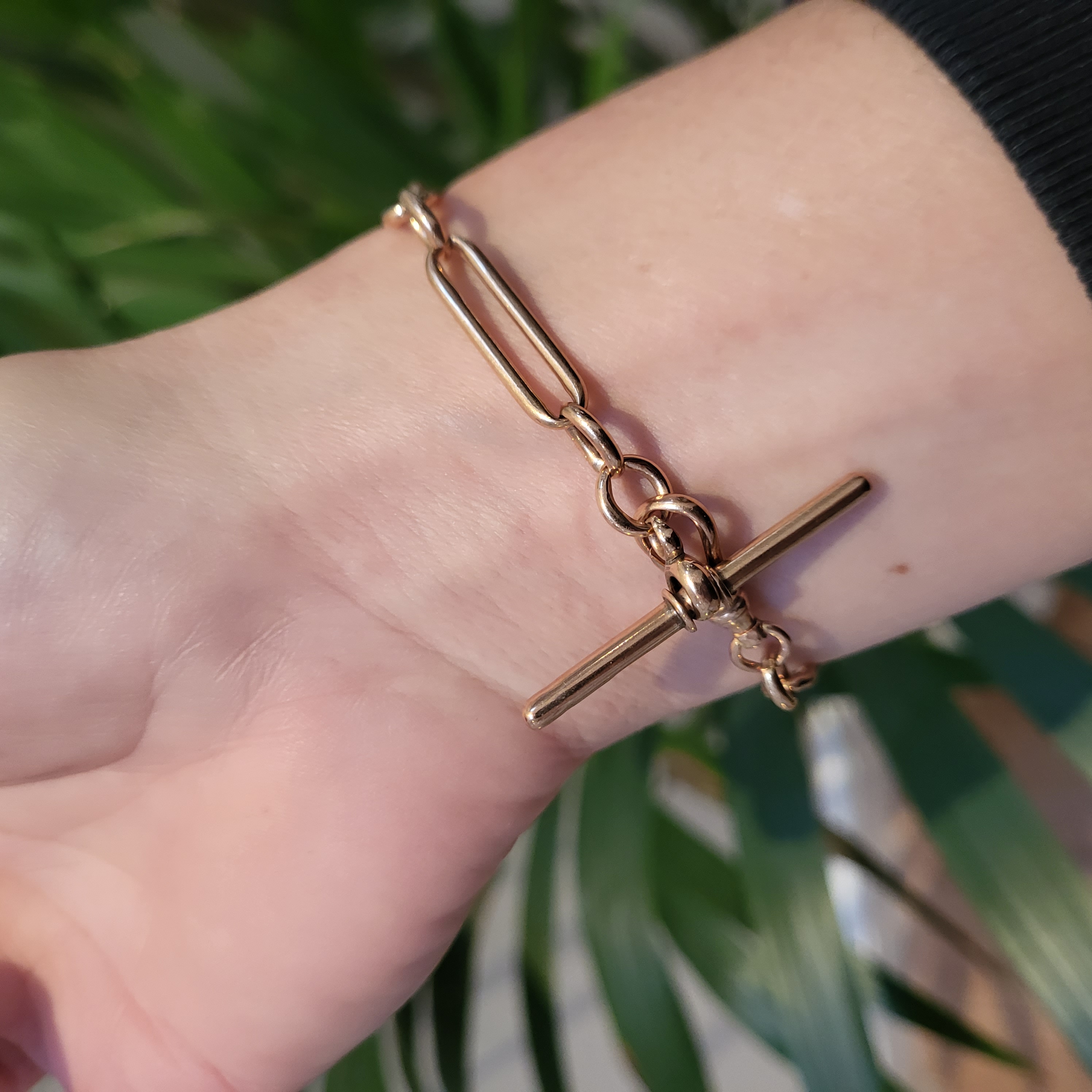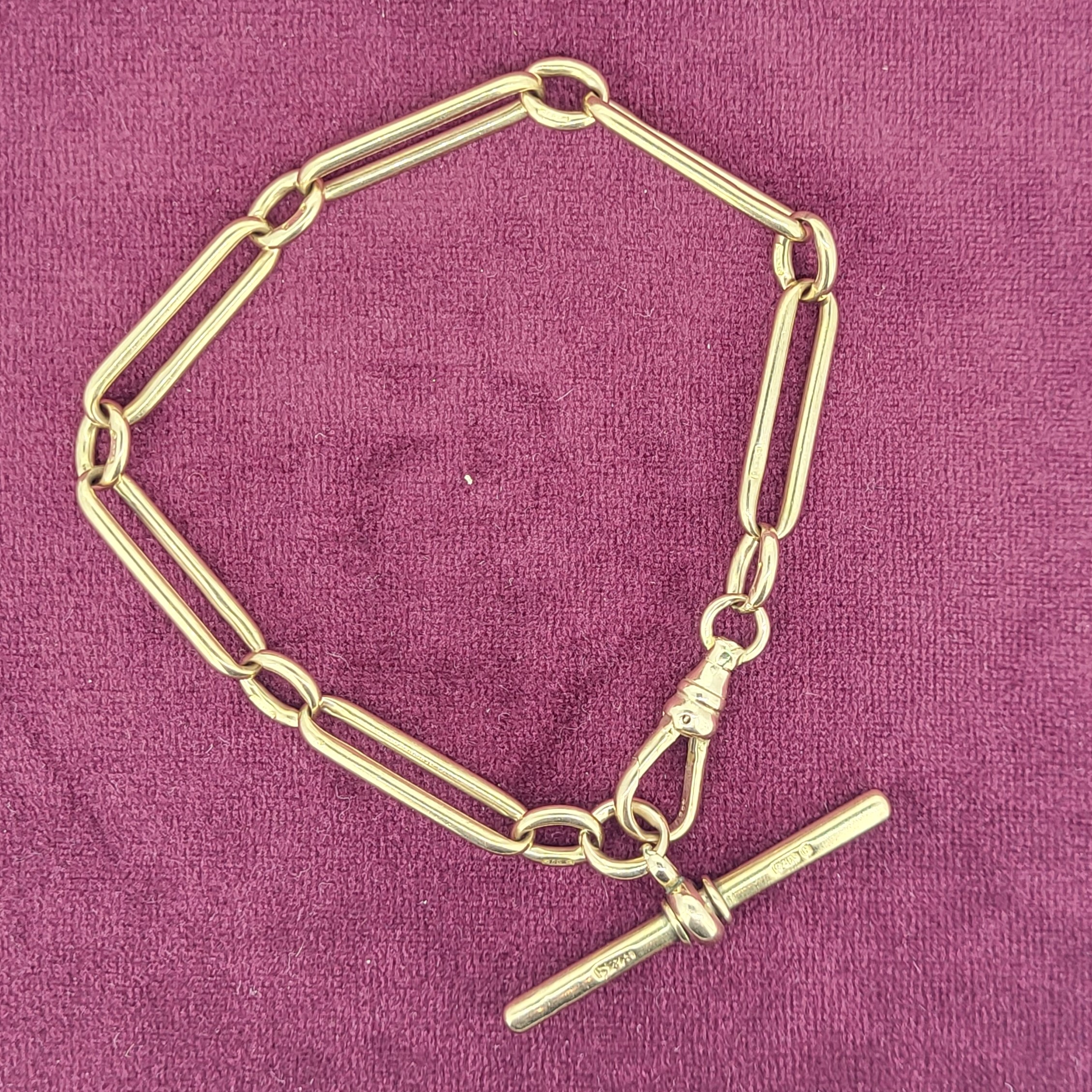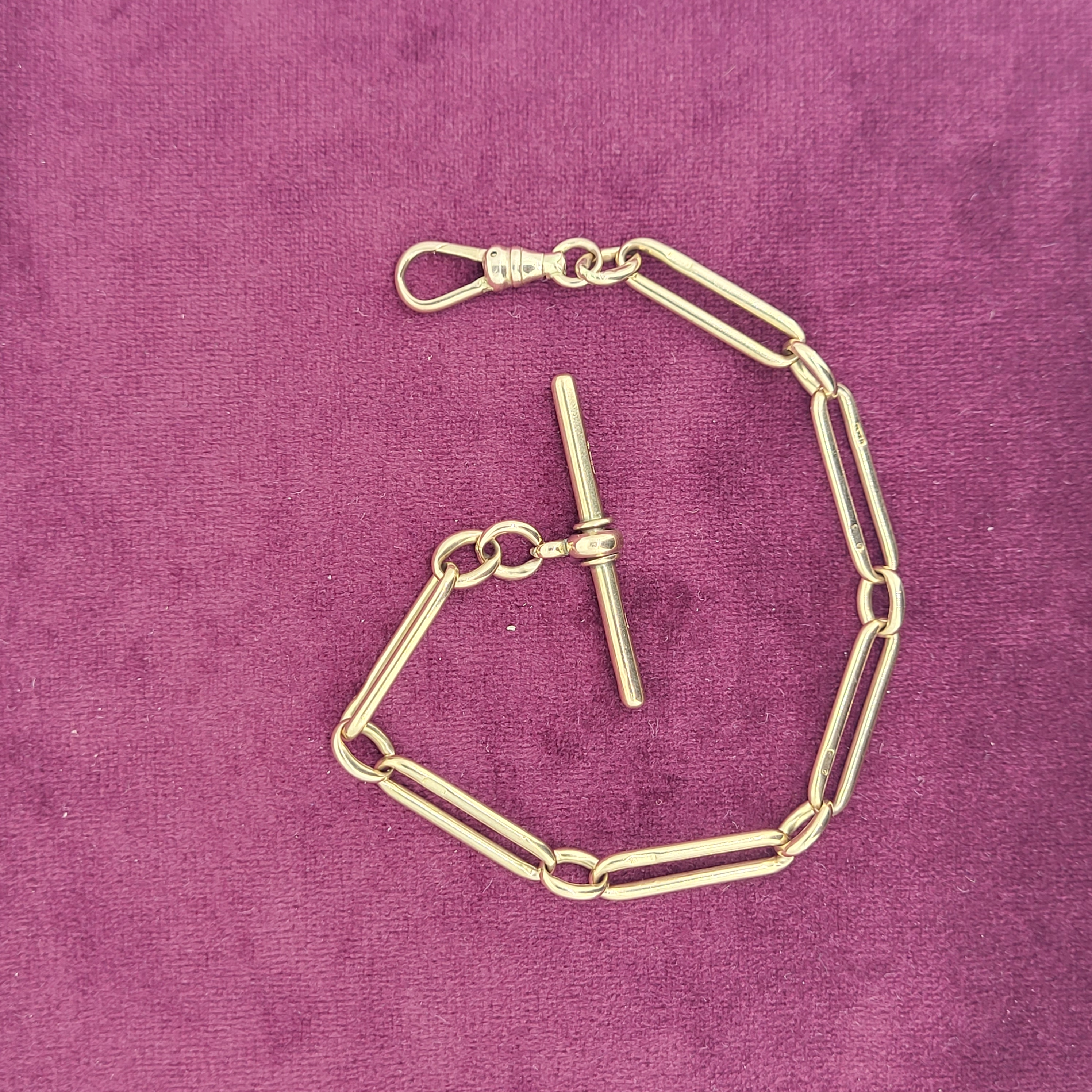 A beautiful rose gold with the ever sought after individually stamped links each spreading 6mm. The bracelet is secured by a swivel fitting and comes complete with a 38mm t-bar stamped by BH Britton & Sons who were originally registered in 1907.