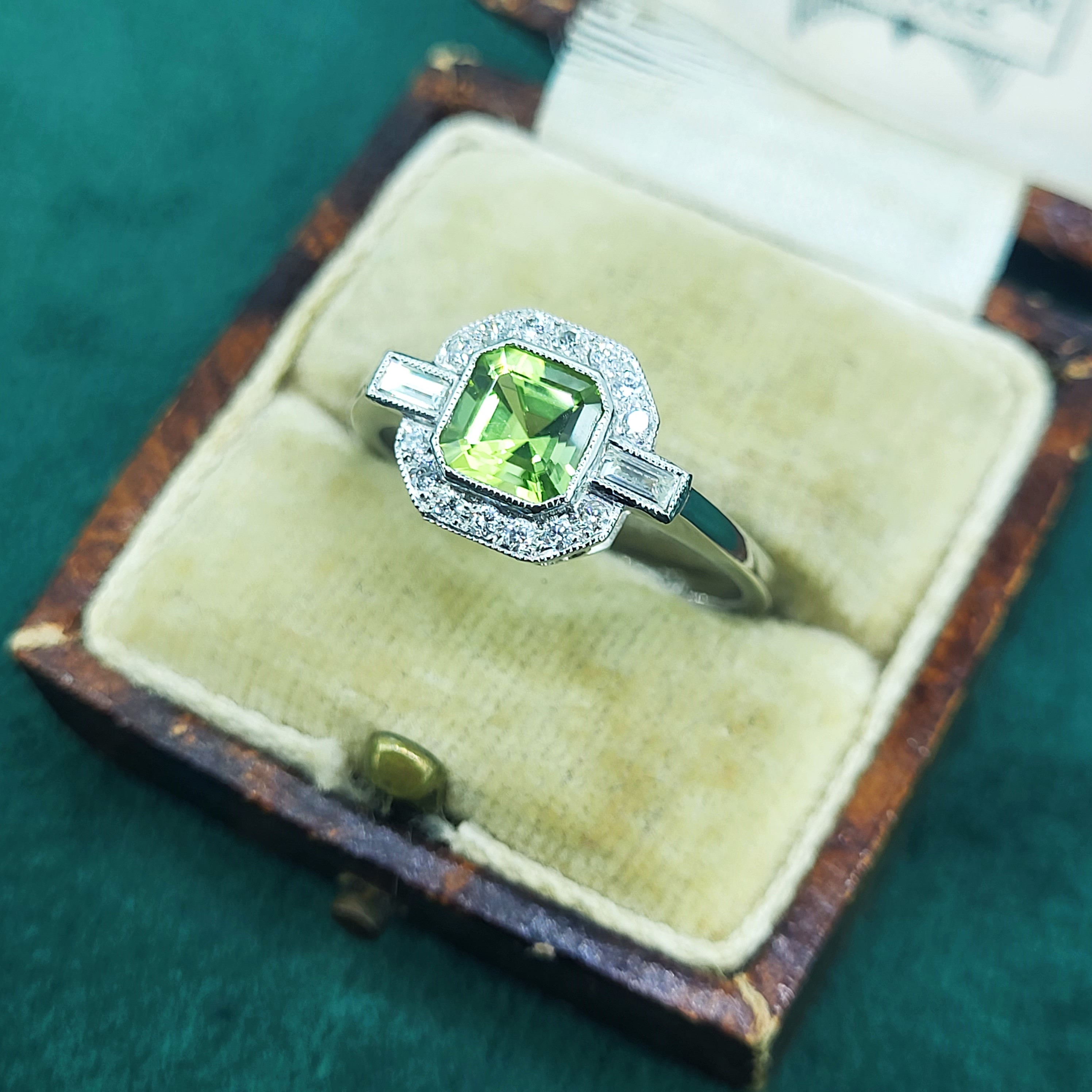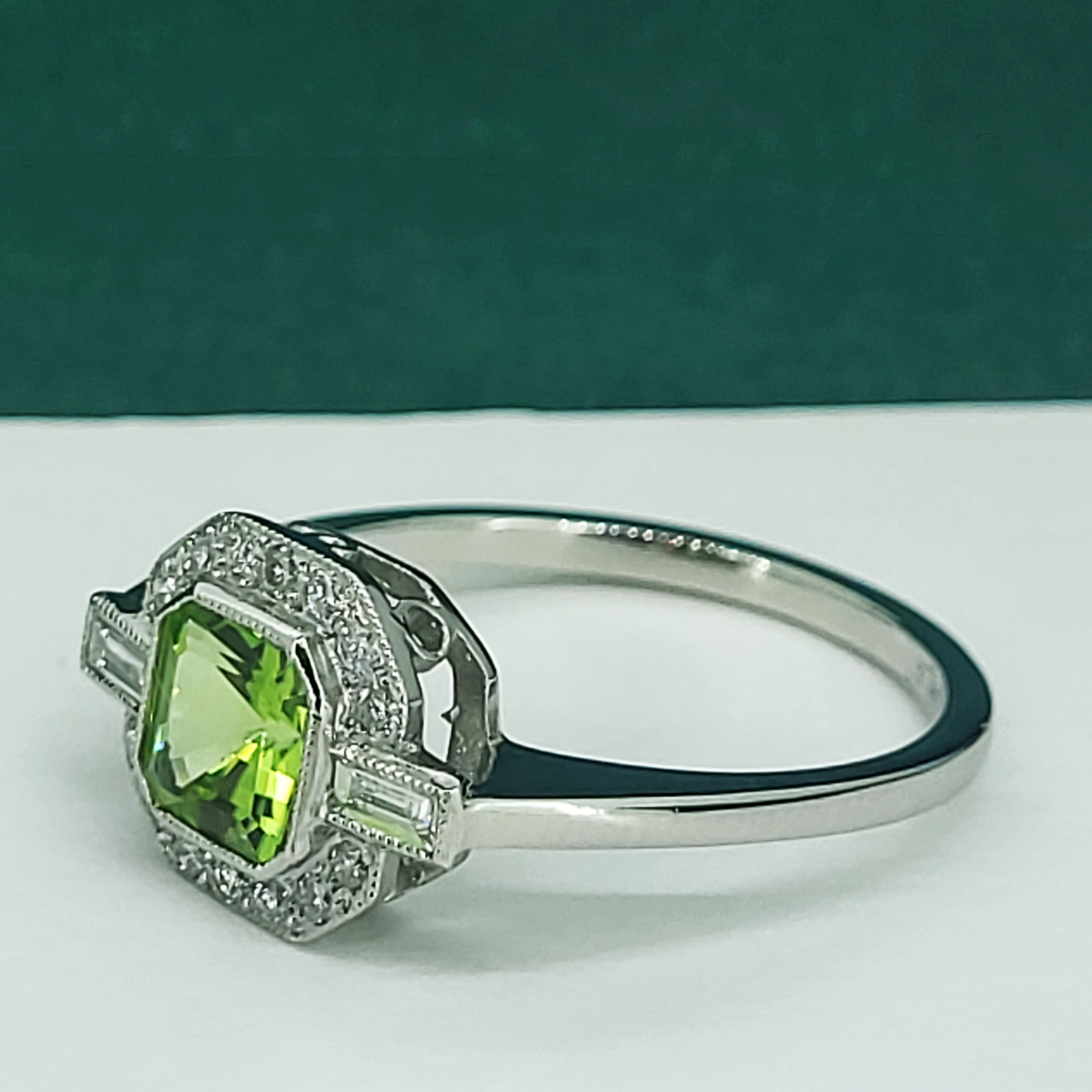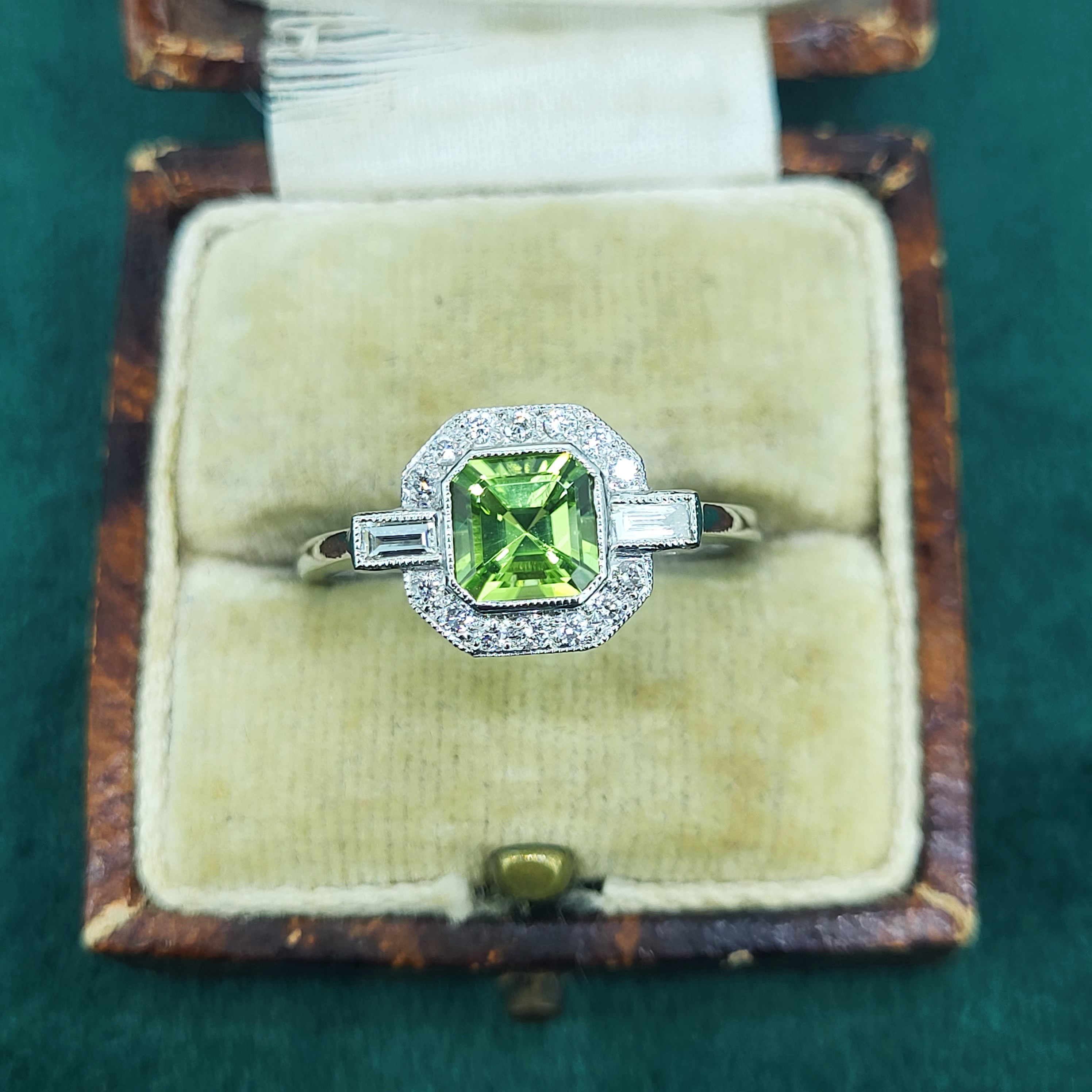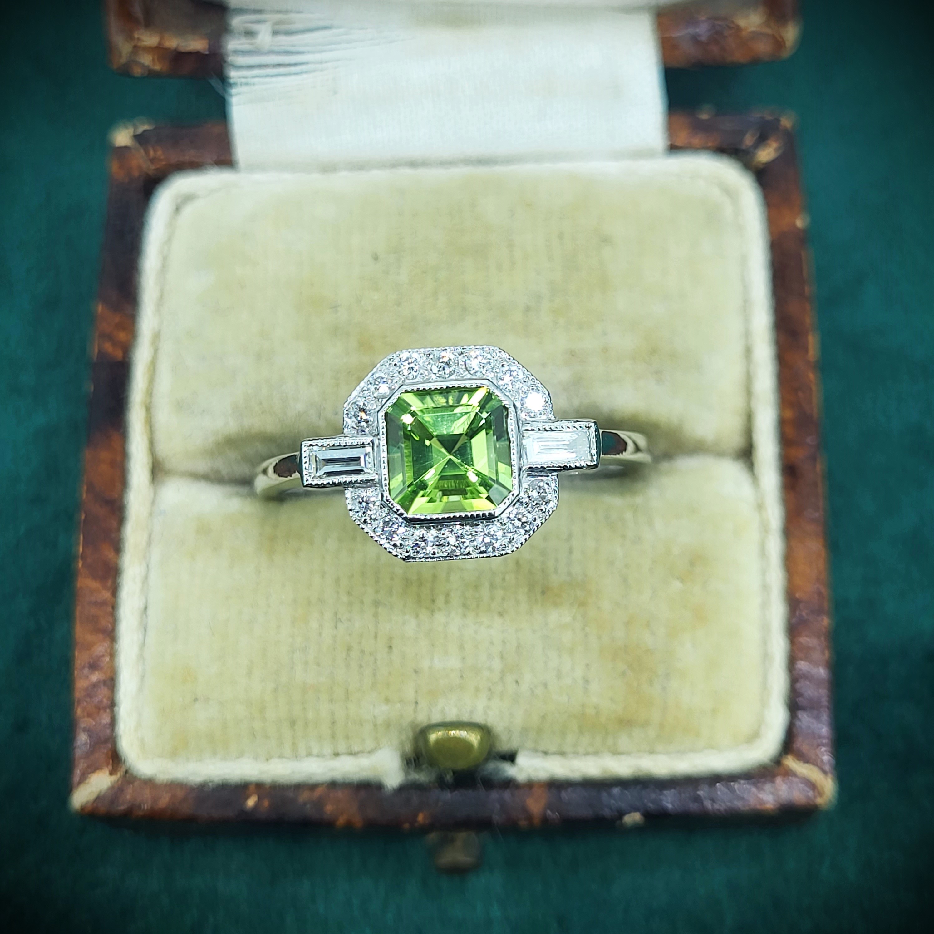 A striking Peridot and Diamond Art Deco Ring crafted from Platinum.