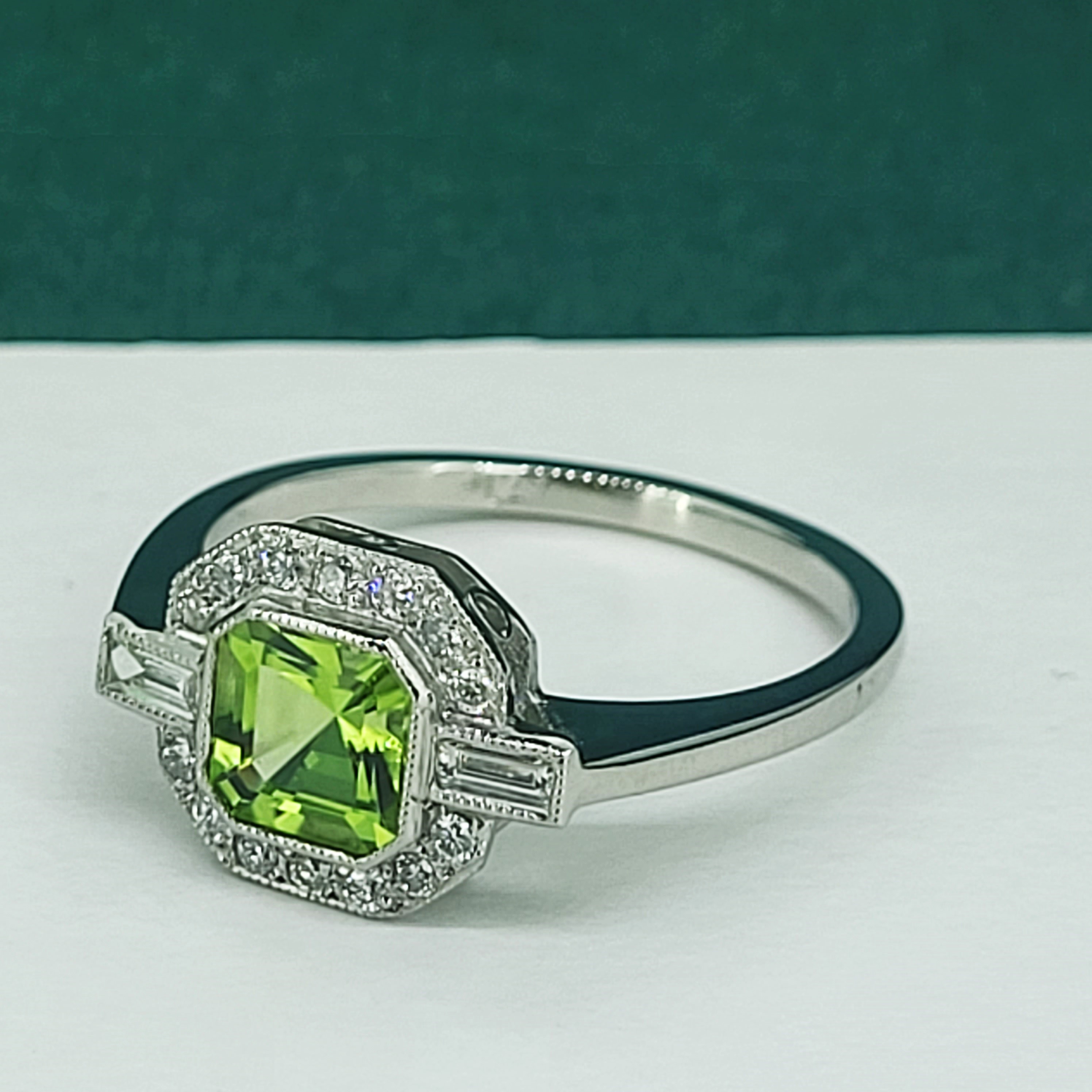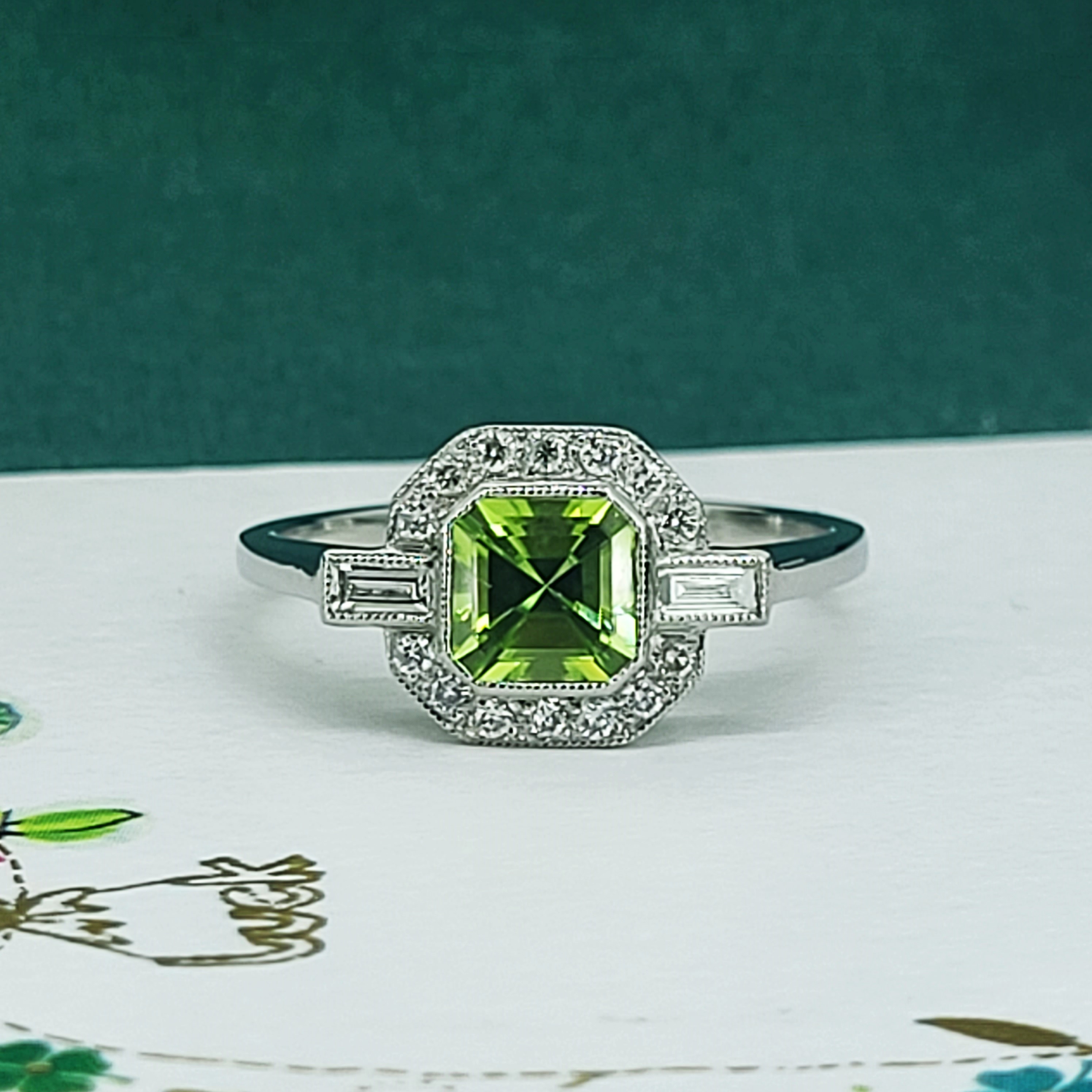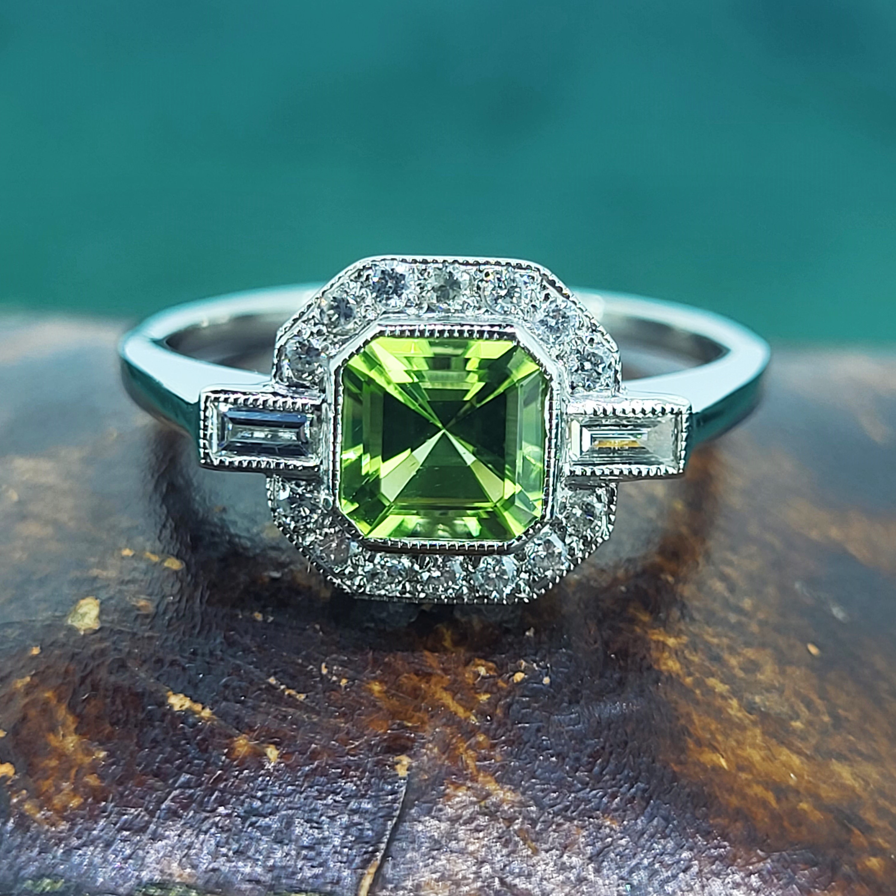 The ring features a vivid, lime green Peridot in the centre that measures 6mm by 6mm. It is further detailed by a Baguette Cut Diamond either side and is surrounded by Round Brilliant Diamonds. The Diamonds contrast wonderfully against the Peridot and they weigh 0.25cts in total with each Baguette Cut Diamond measuring 3.5mm.