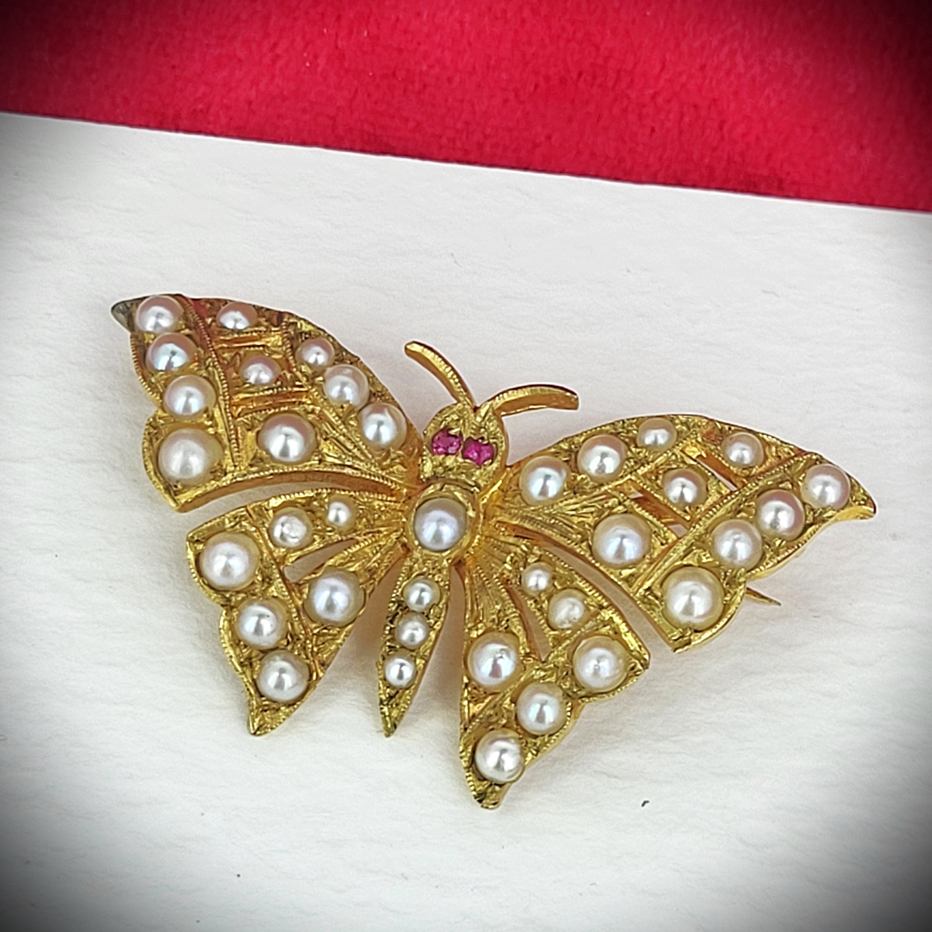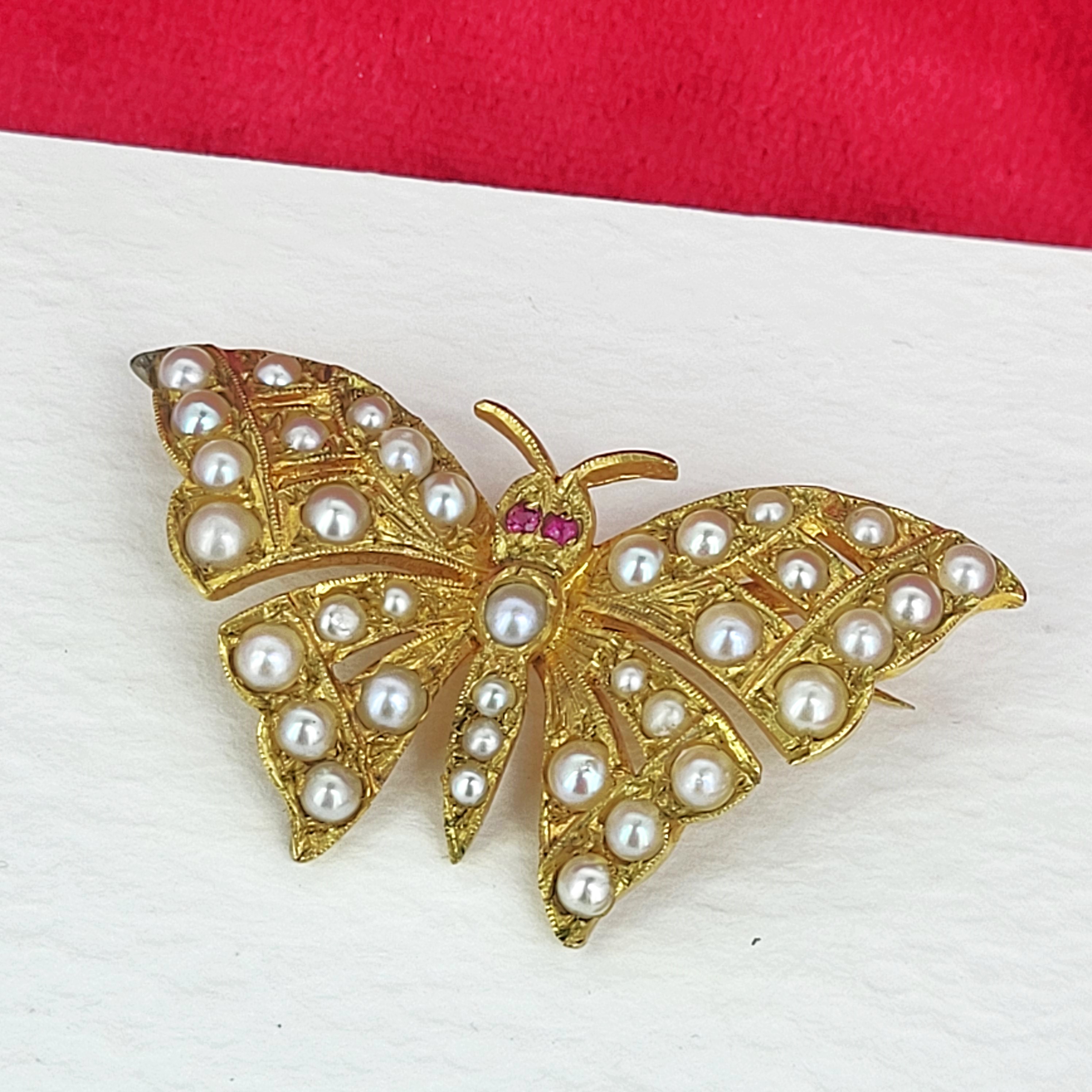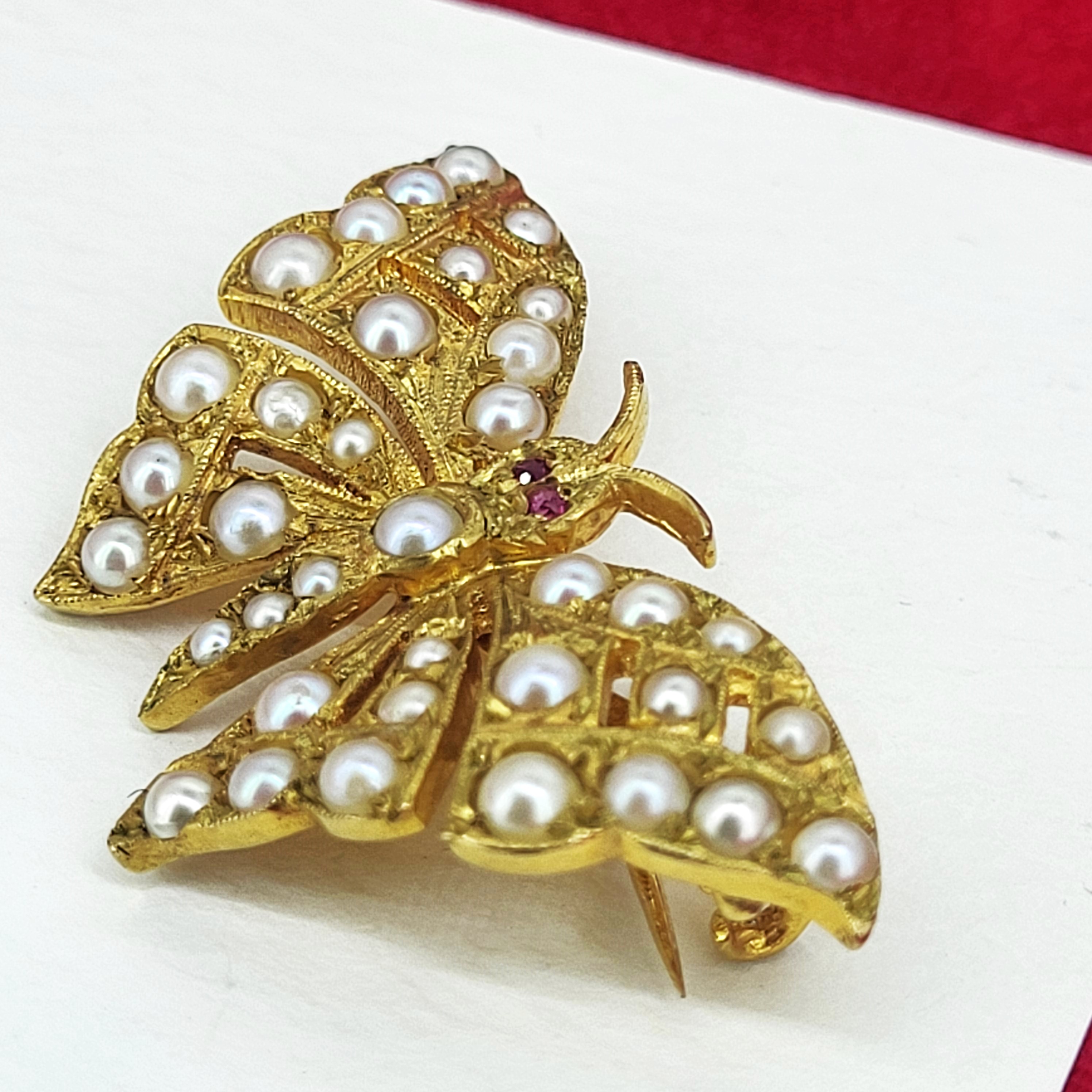The Butterfly is set with Pearls in its wings and Rubies for eyes. The Yellow Gold has been hand engraved with some extra detailing.