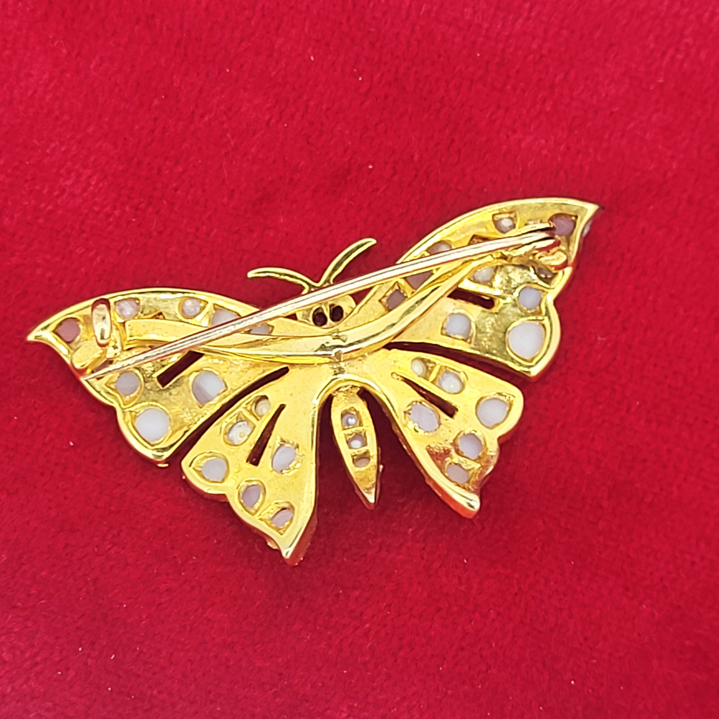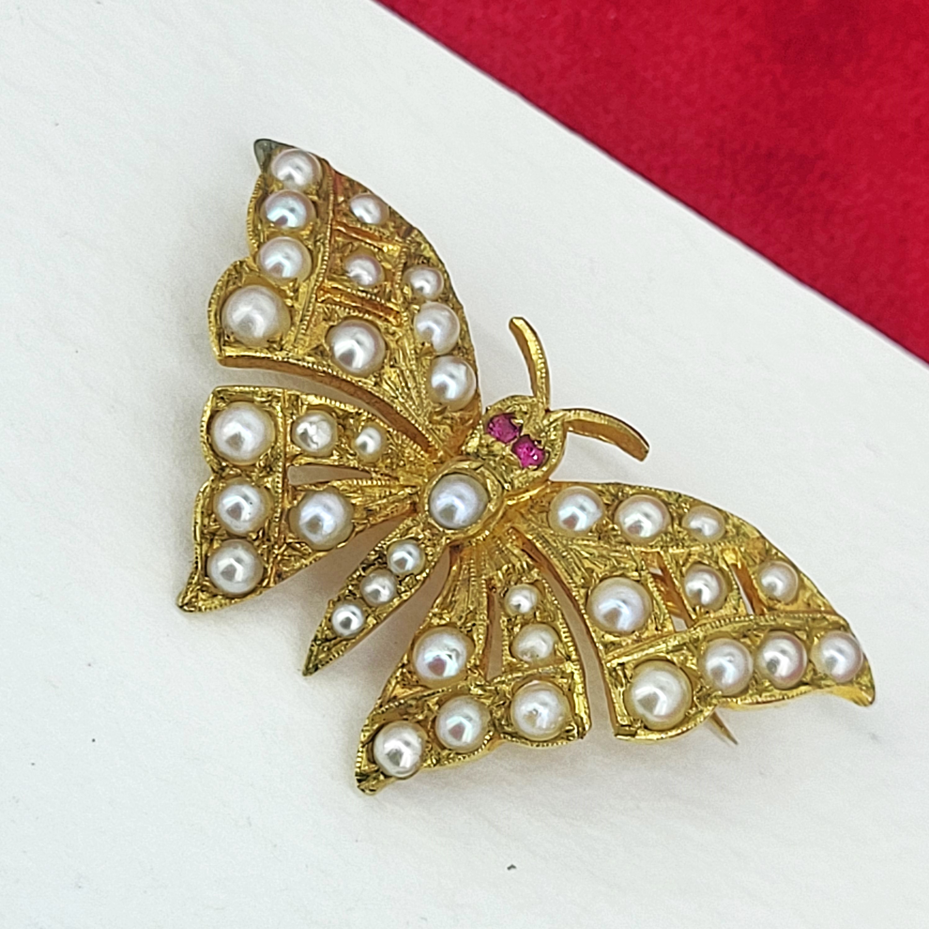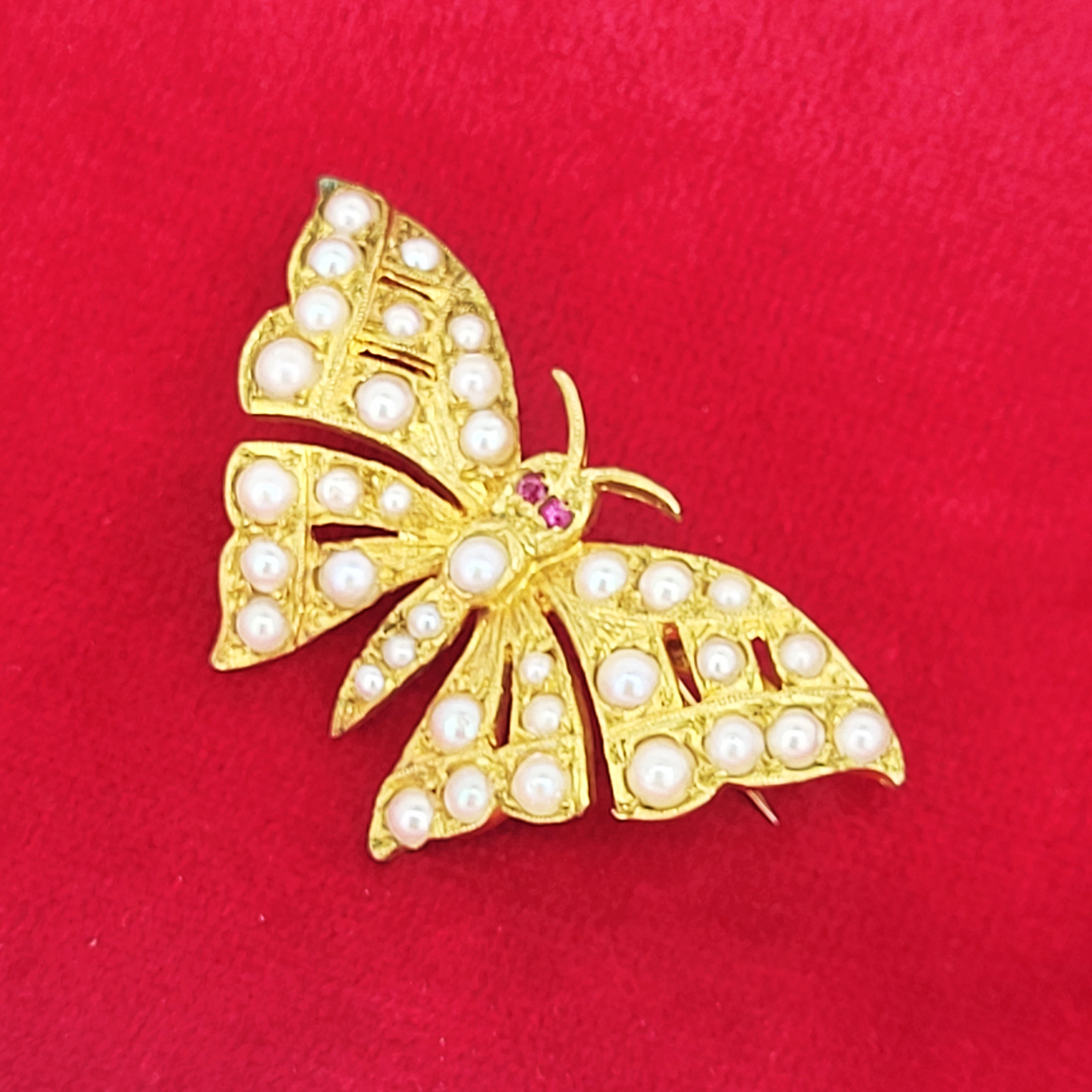 The Butterfly is set with Pearls in its wings and Rubies for eyes. The Yellow Gold has been hand engraved with some extra detailing.