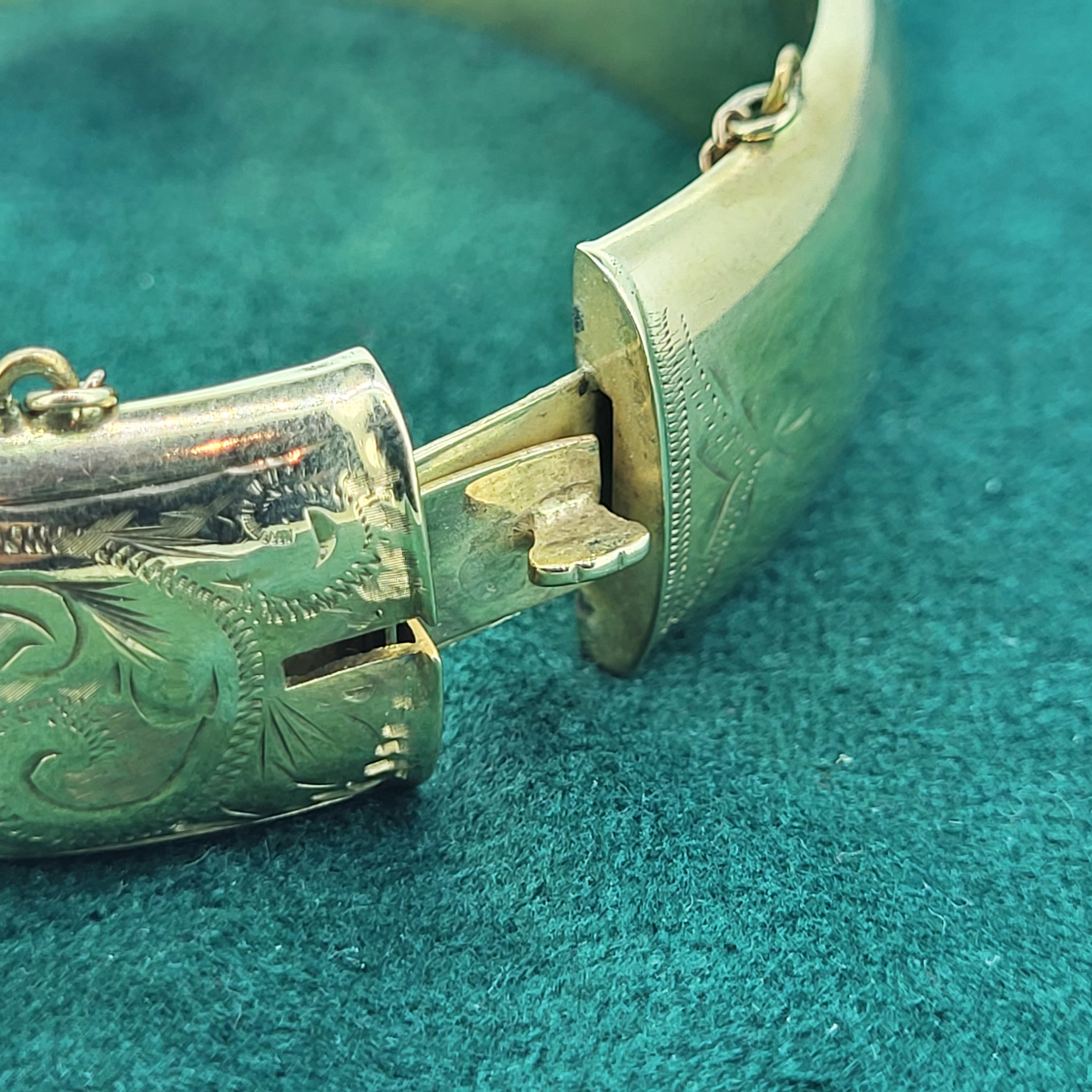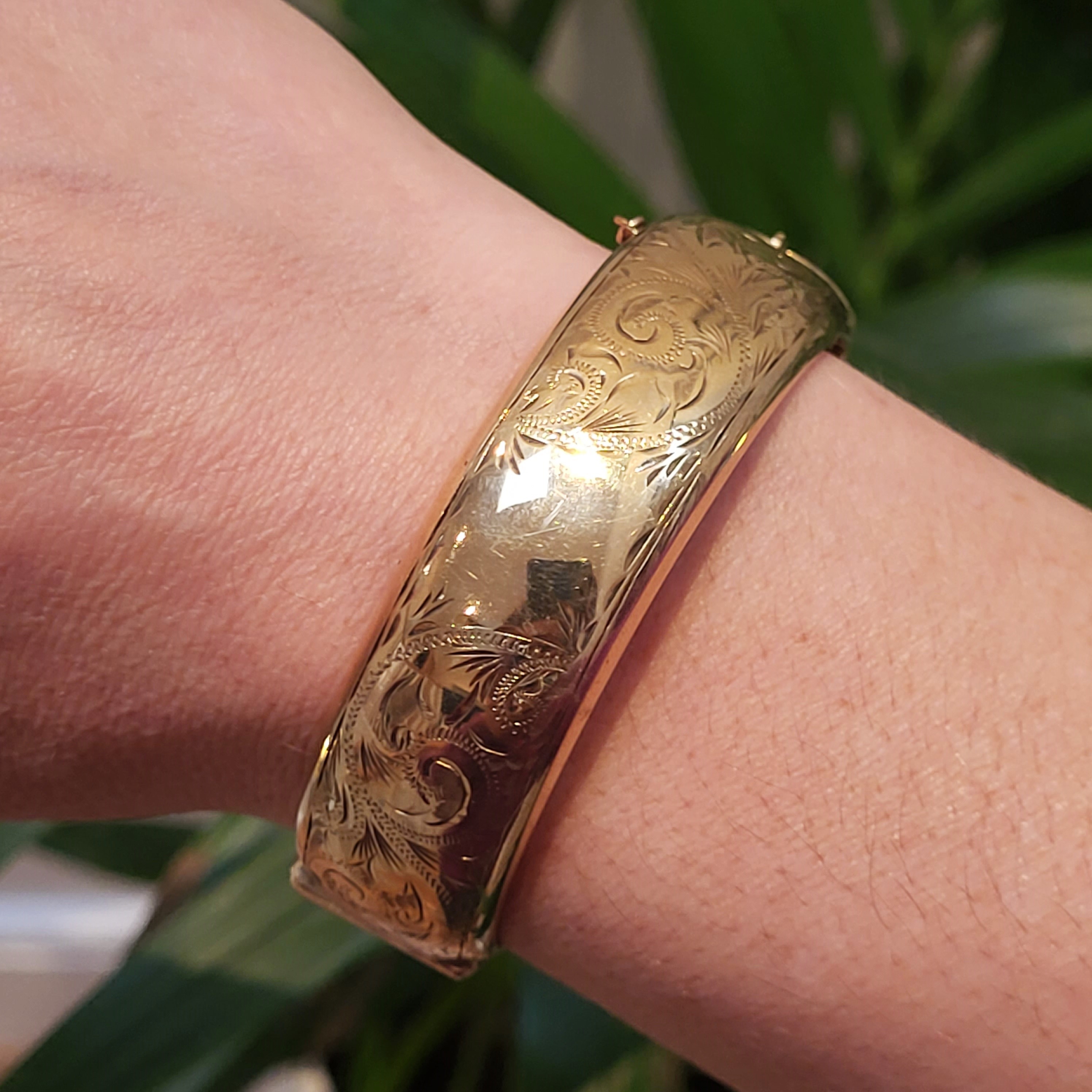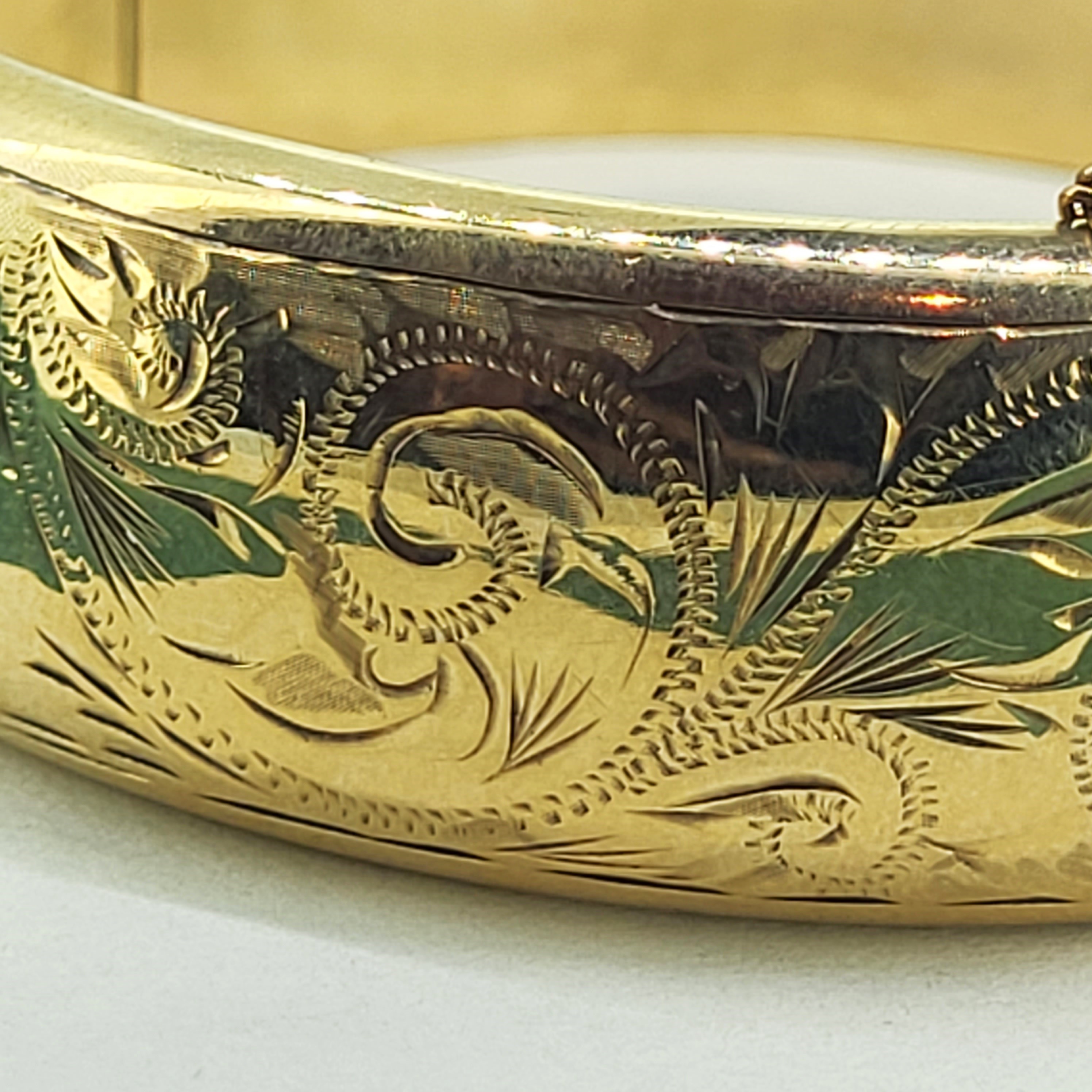 A gorgeous Hinged Bangle crafted from 9ct Yellow Gold with ornate hand engraving.
