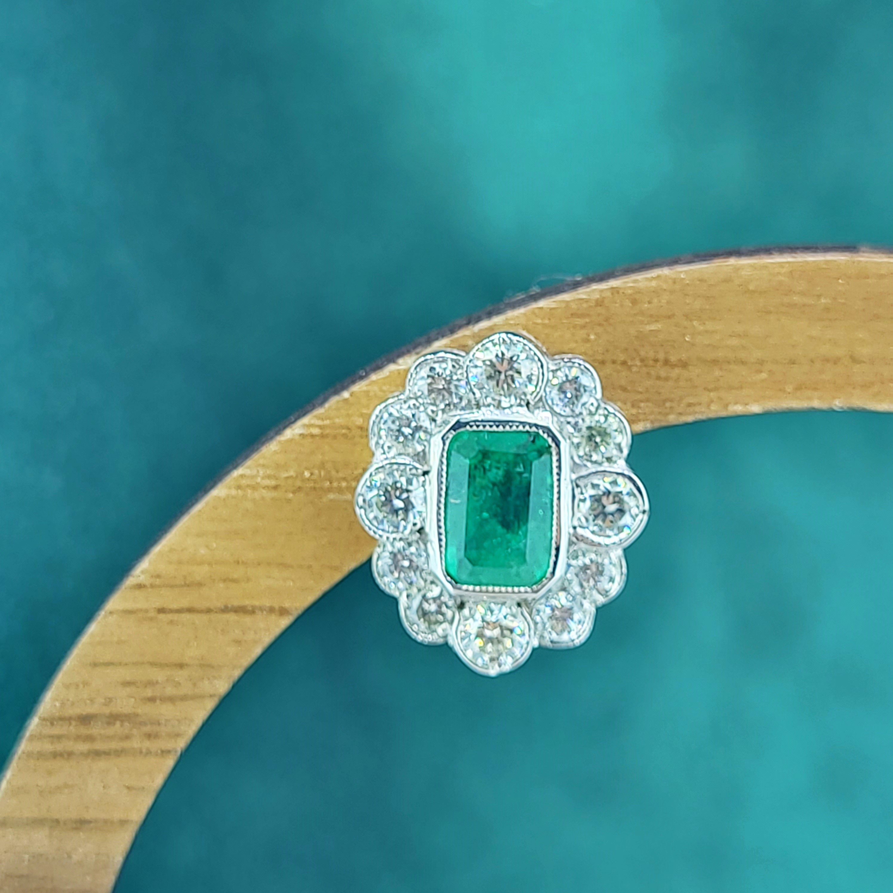 The Emerald is surrounded by Round Brilliant Diamonds in a rub-over, alternating bubble setting. The Diamonds weigh 0.50cts in total.