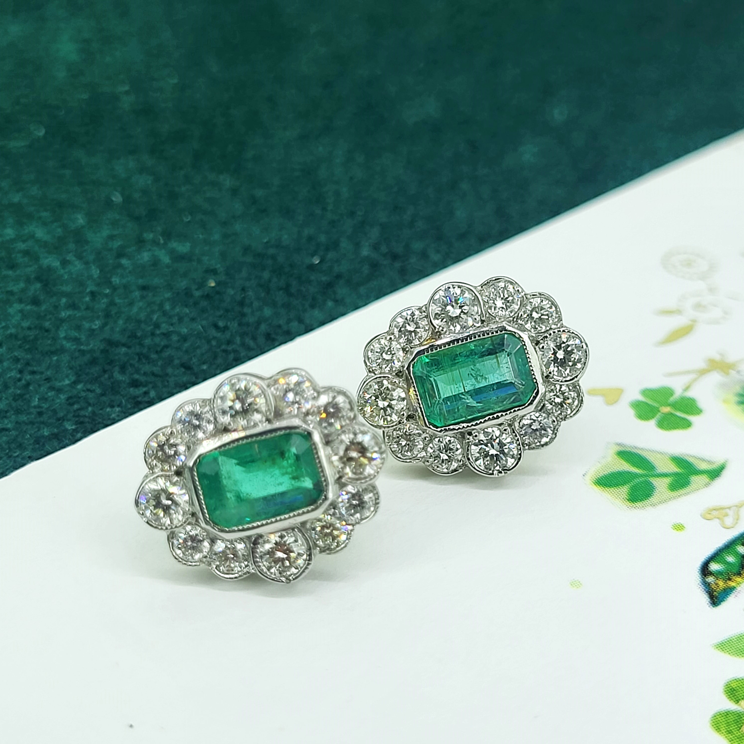 The earrings are set with a central Emerald Cut Emerald measuring 6mm by 4mm, estimated at weighing 0.55cts each.