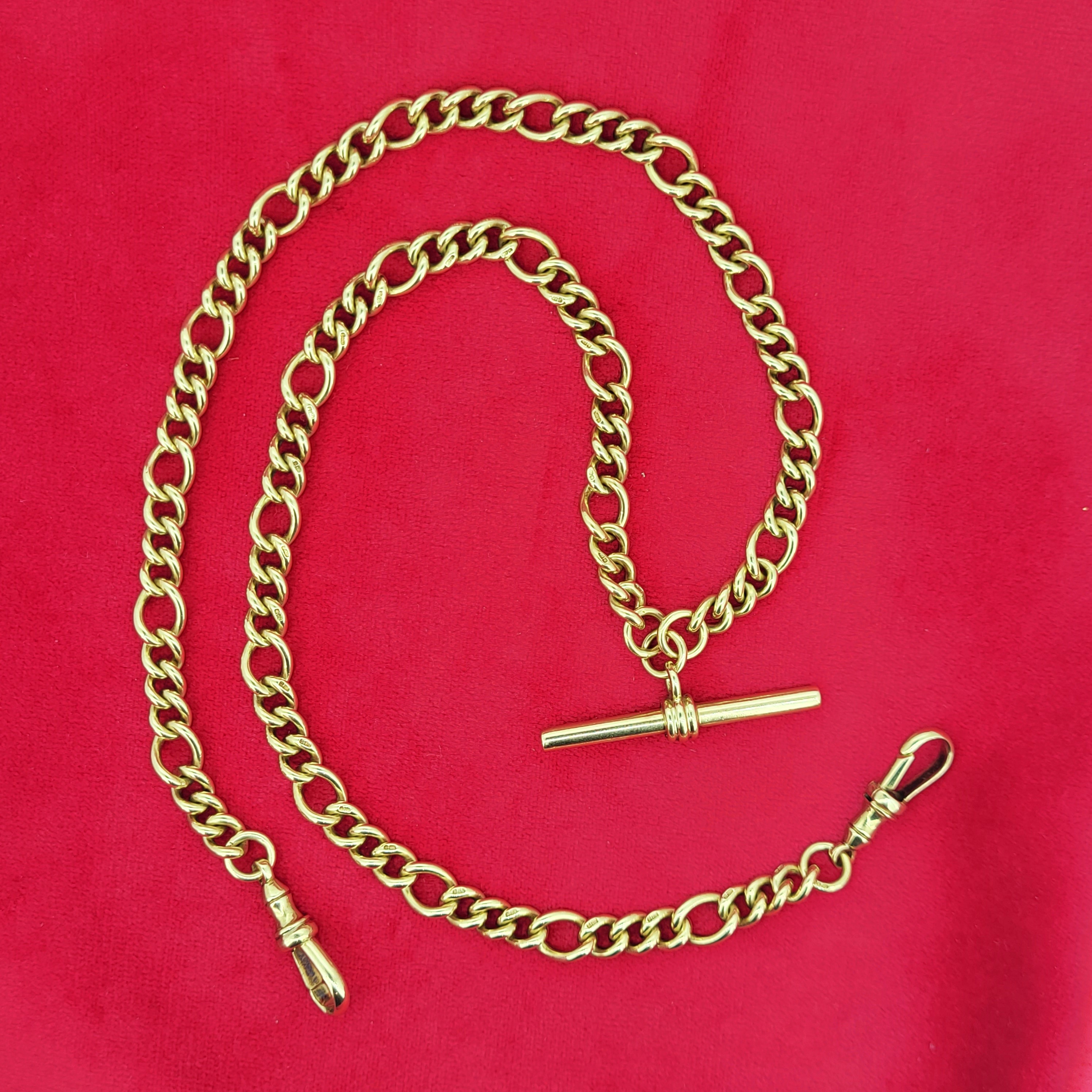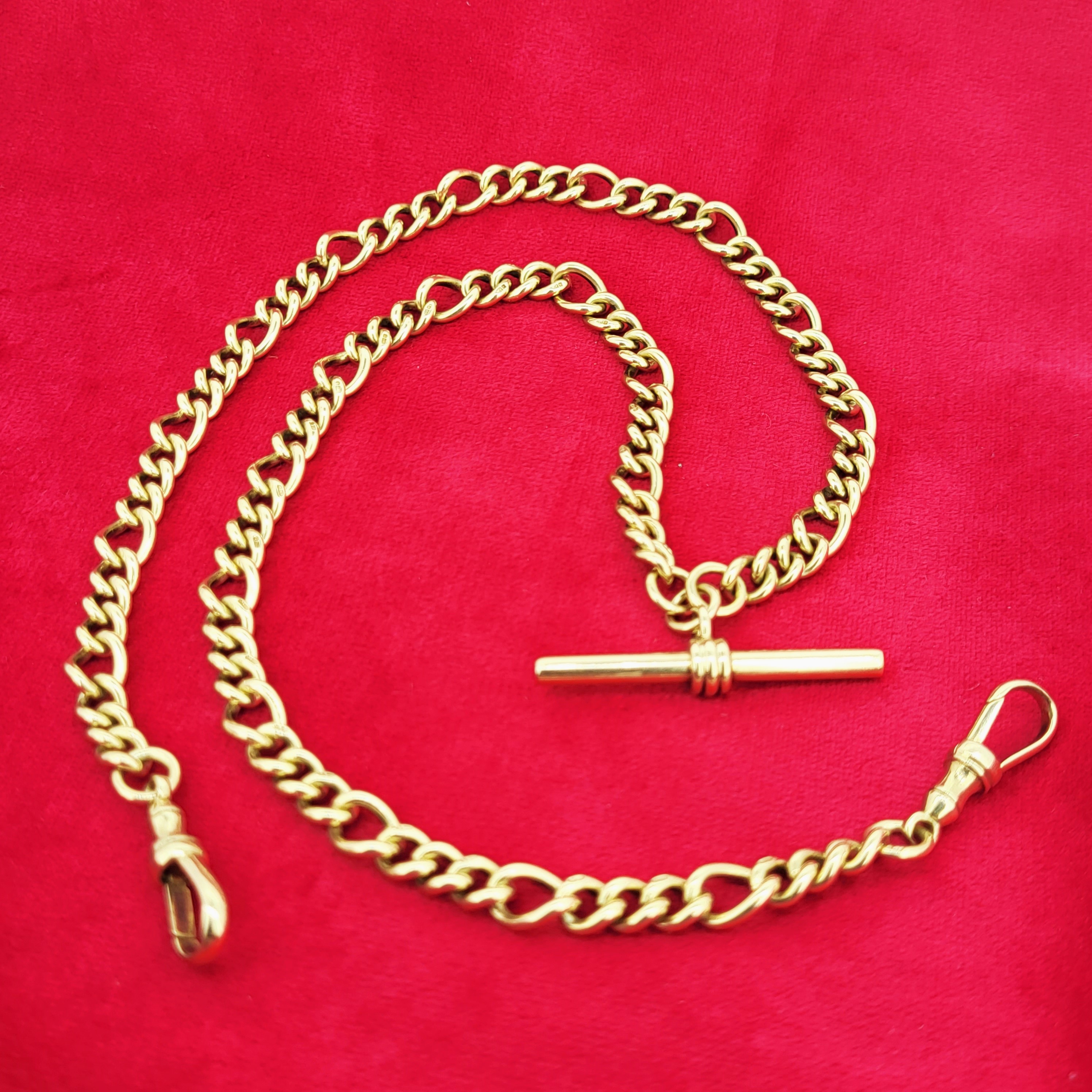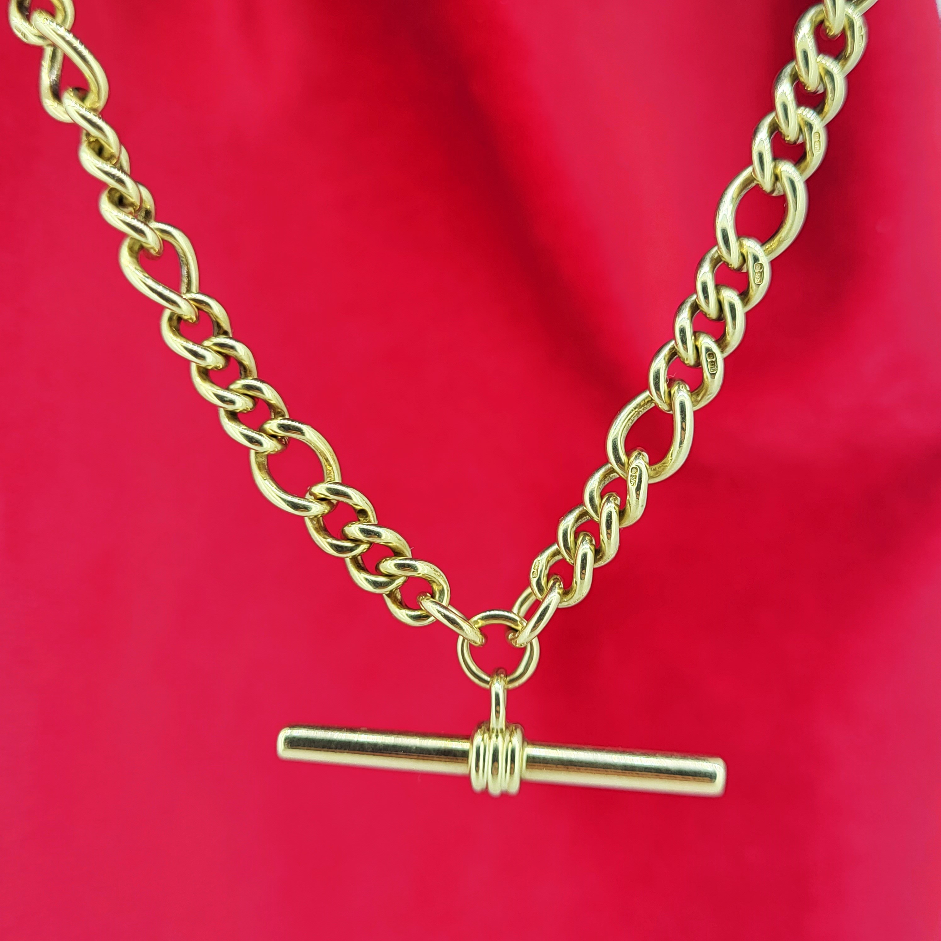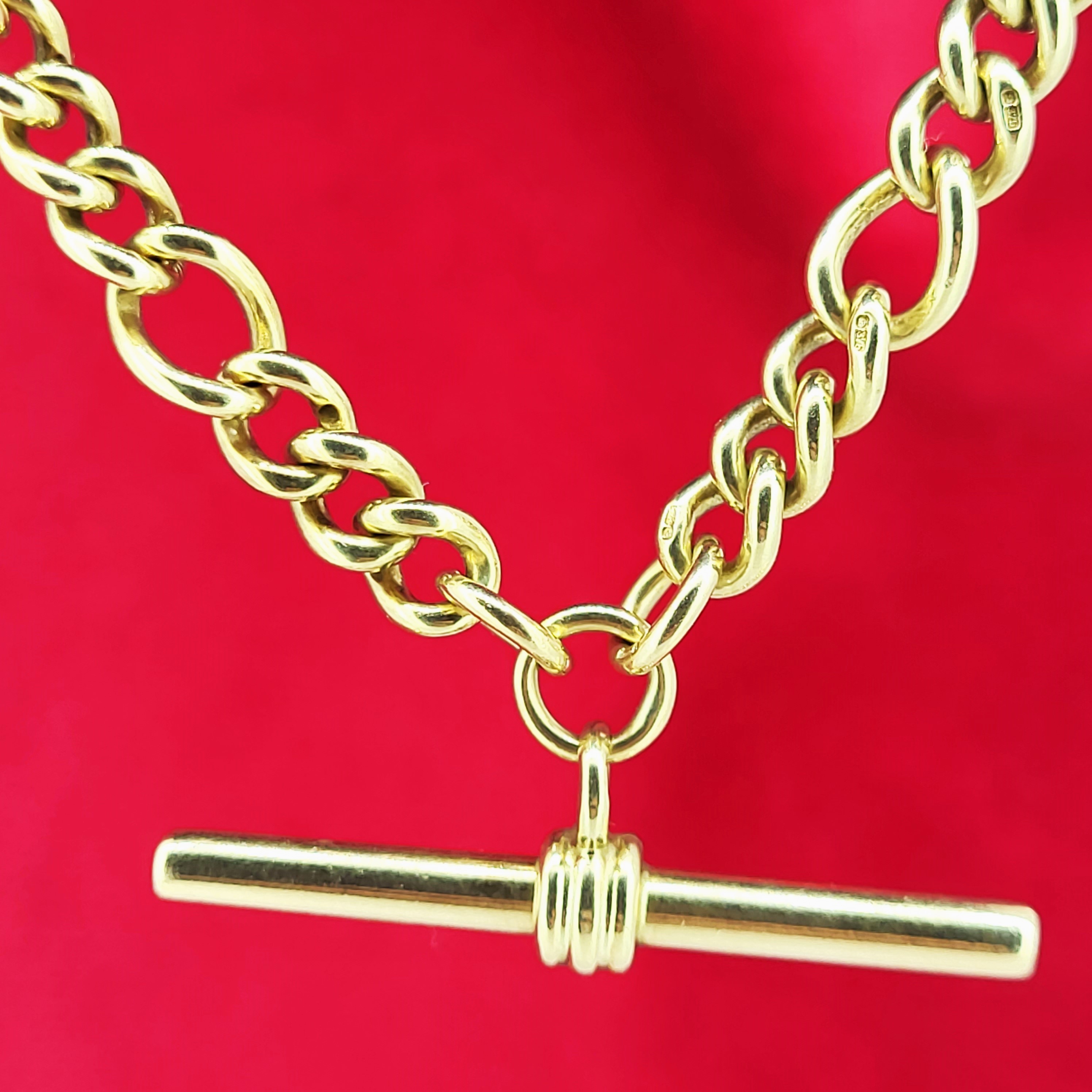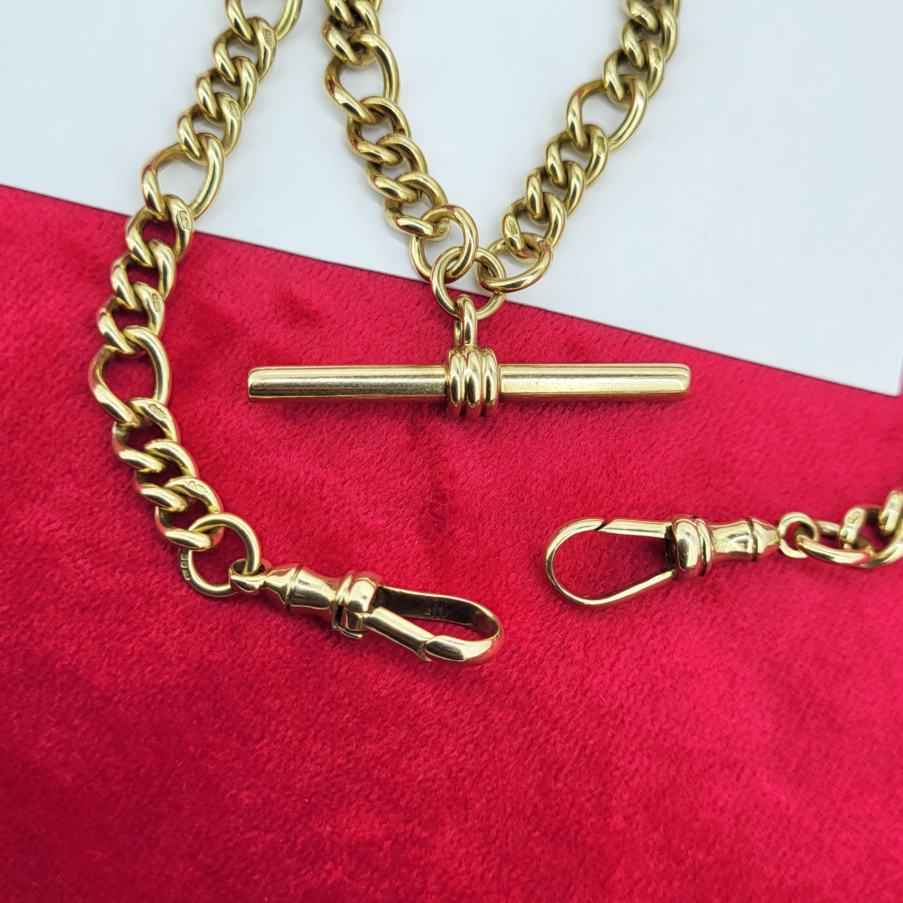 A lovely Close Figaro Link Albert Chain crafted from 9ct Yellow Gold. It is really unusual to see an albert chain with this combination of links and a pleasure to see such in yellow gold. It creates a modern vibe to an antique piece and is not one that you'll easily find replicated.