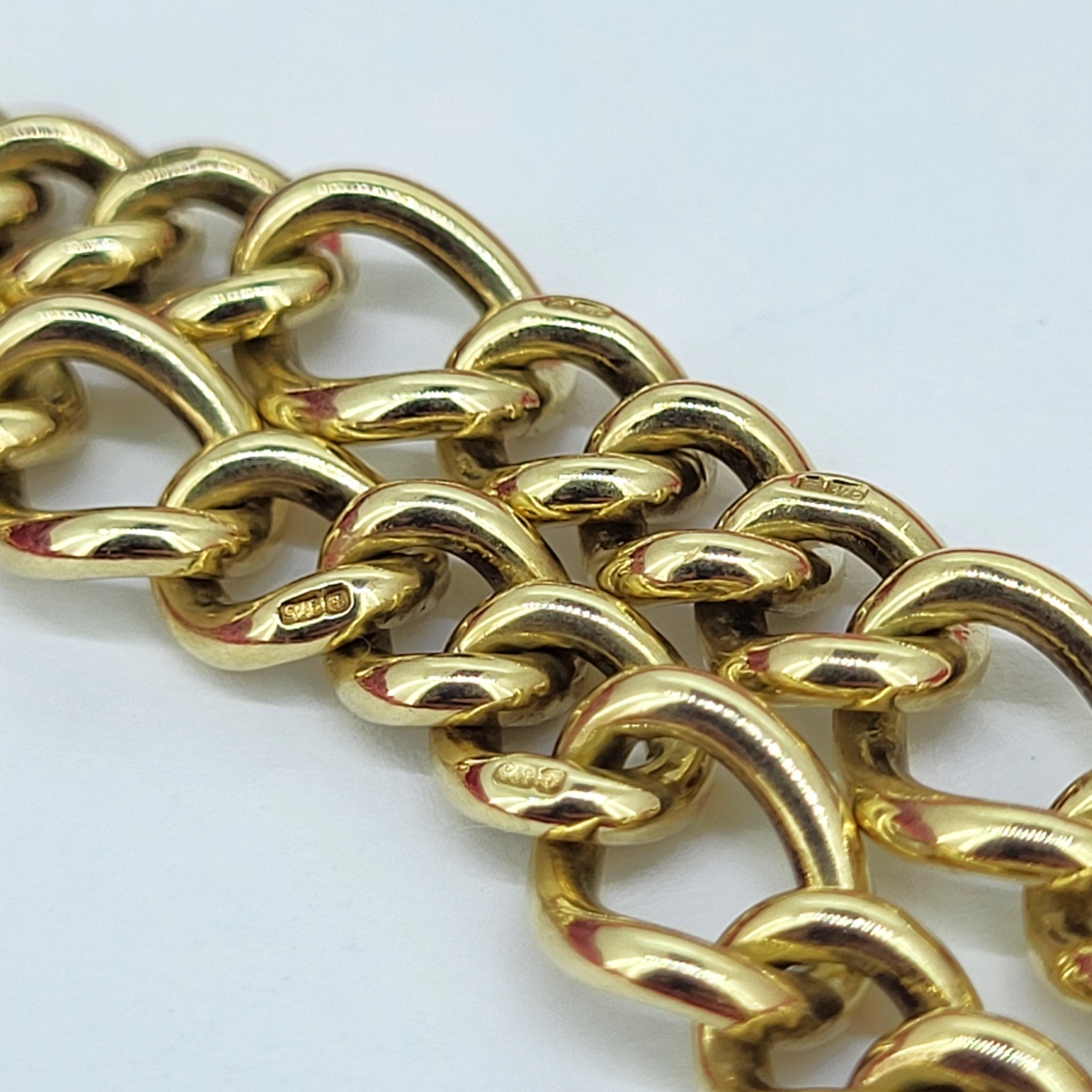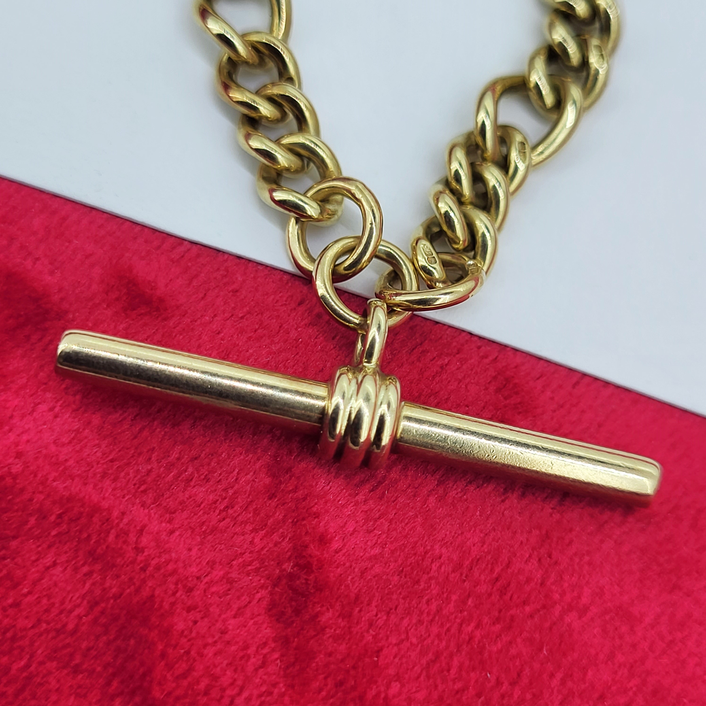 The links measure 6.5mm at their widest point and each link is individually stamped. It is fitted with a T-Bar in the centre, which measures 35mm in length ands the chain is secured by a swivel at each end.