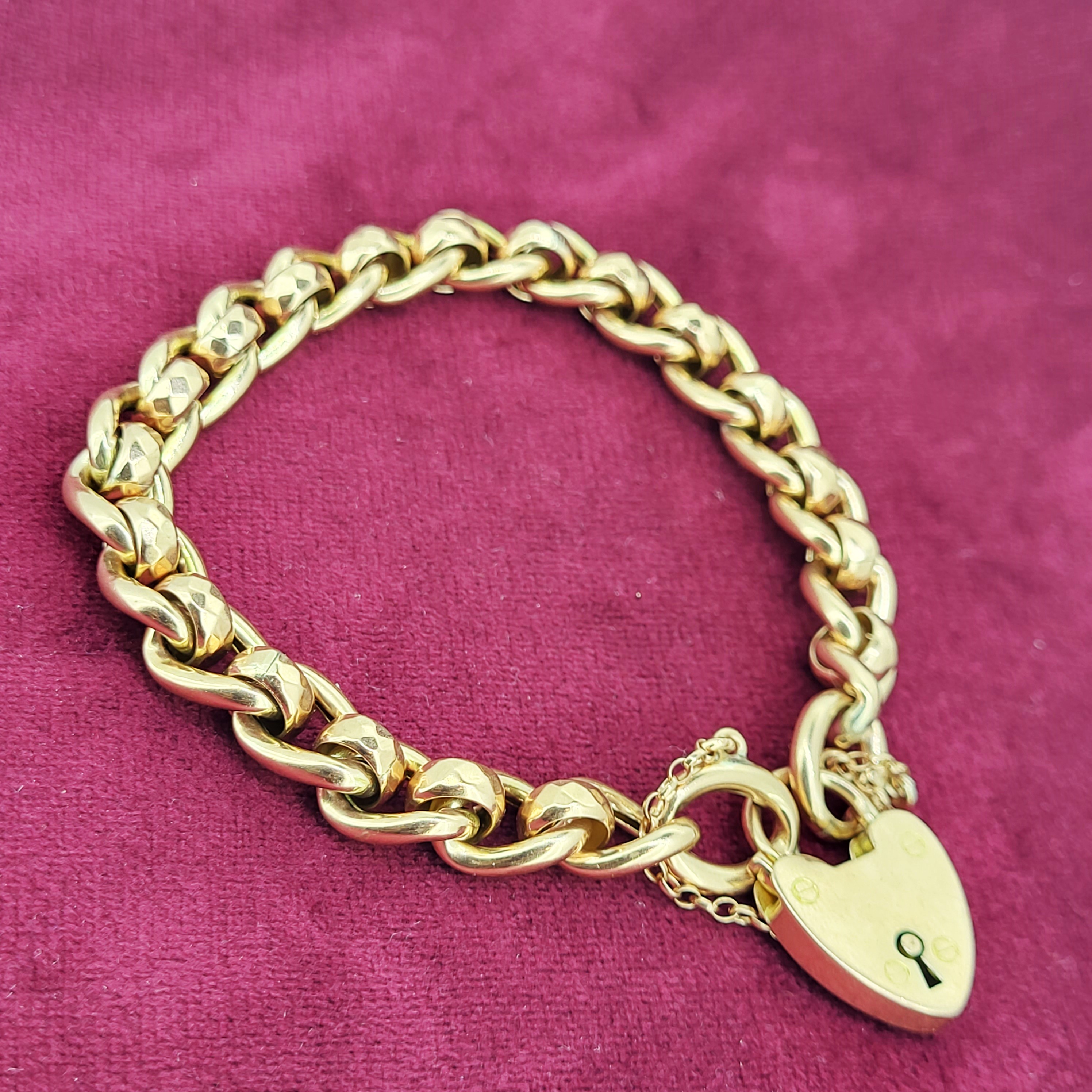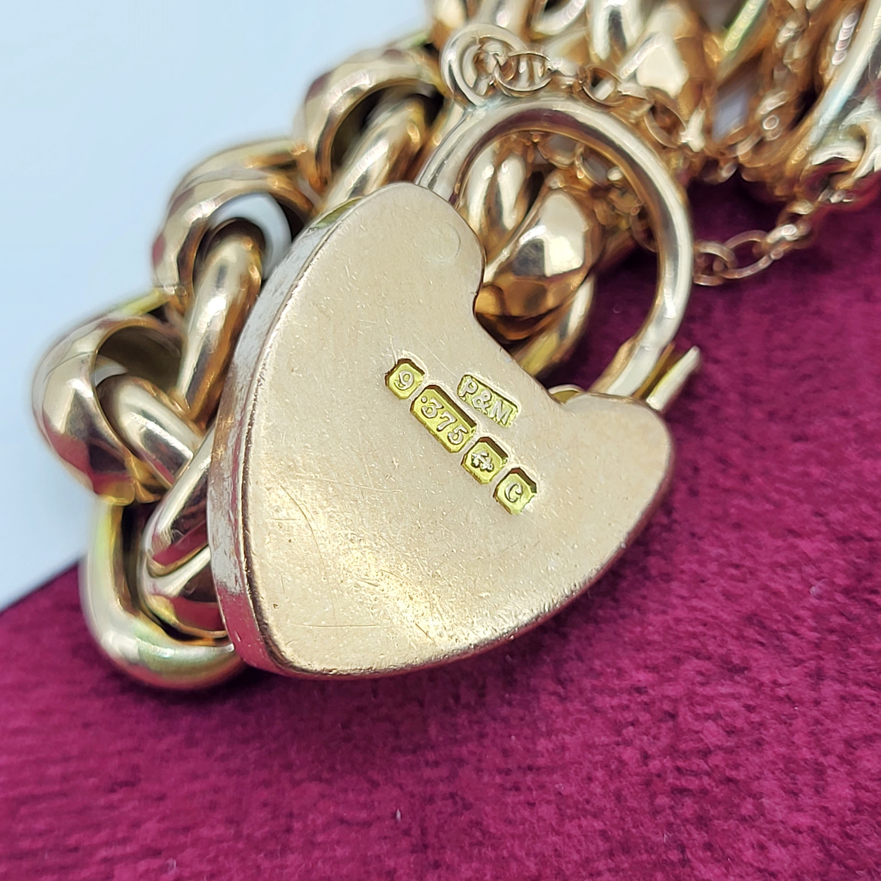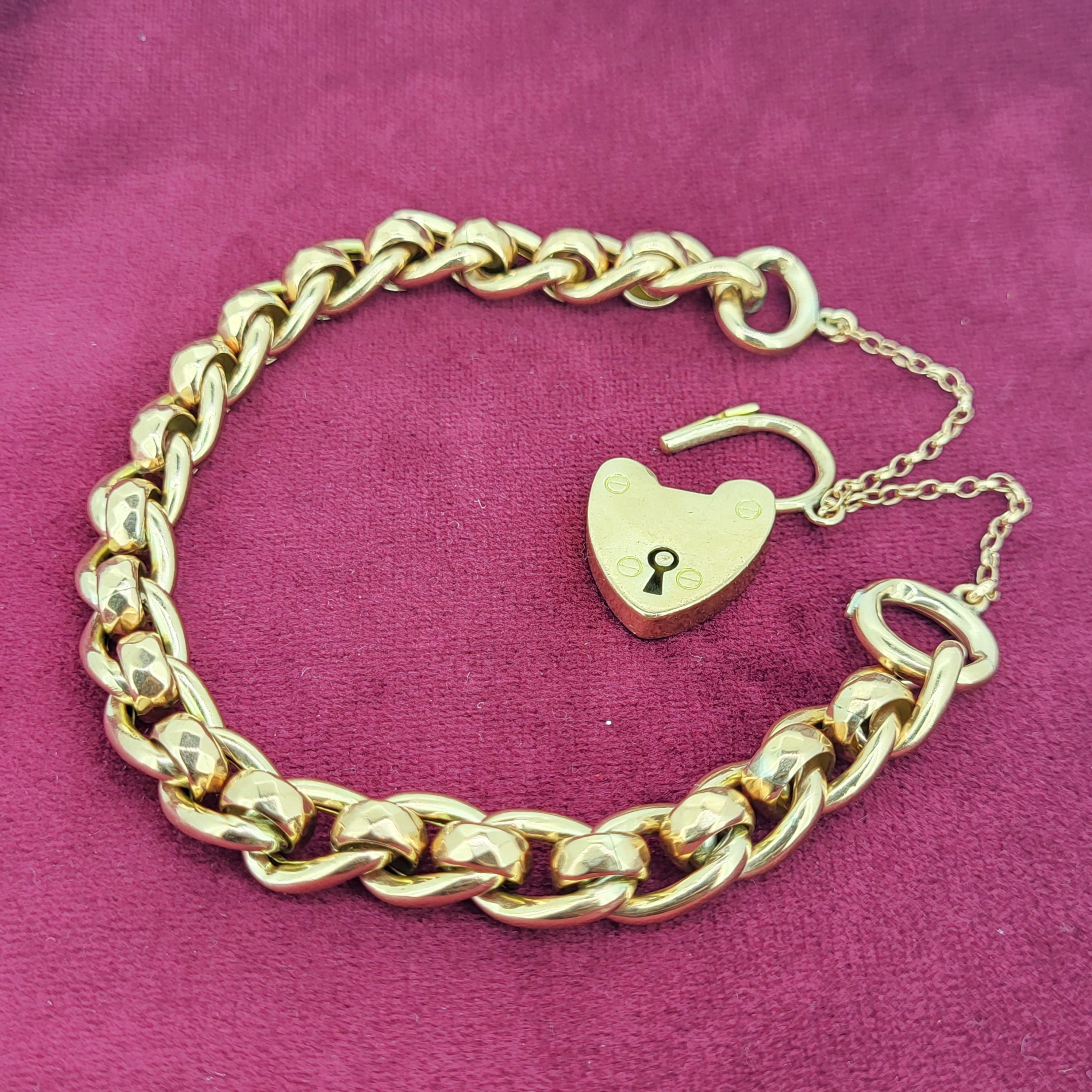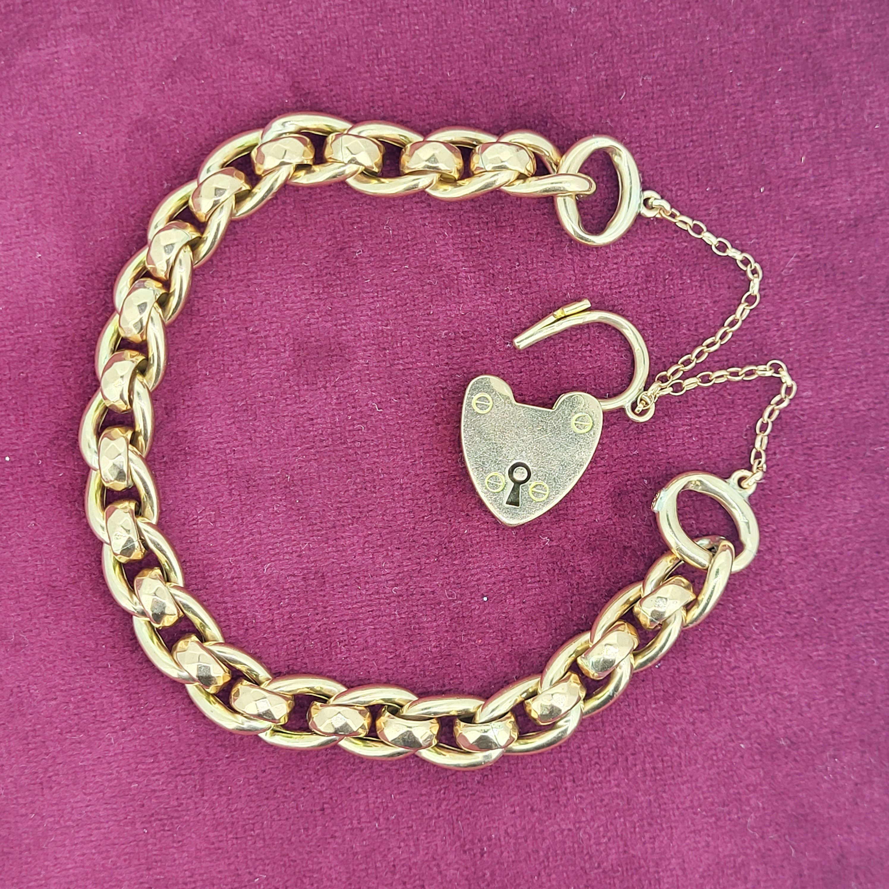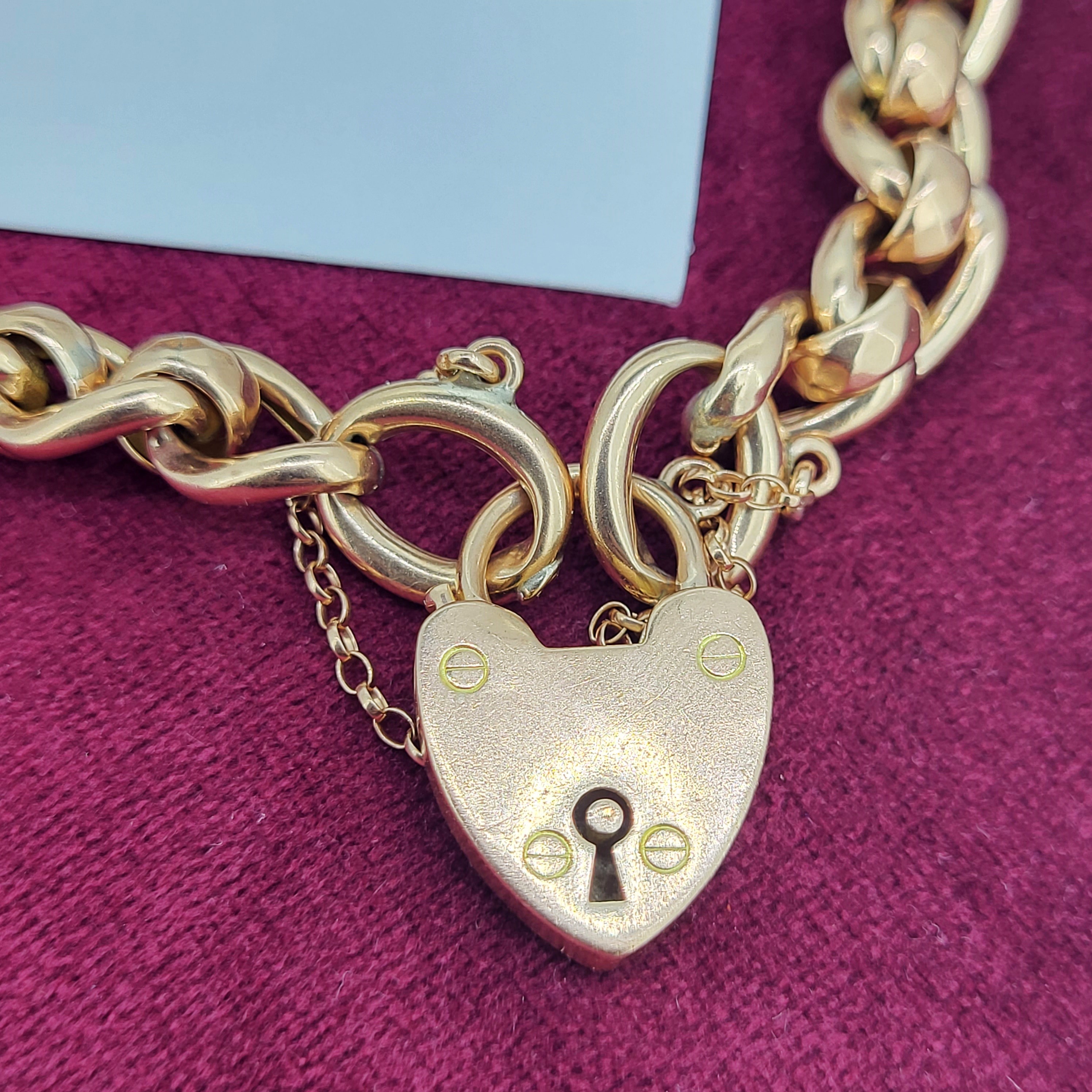 It is secured by a heart padlock and safety chain, the padlock is stamped P & M for Phillip & Mayell of Tenby Street registered in Birmingham. It was hallmarked during 1902-1903.