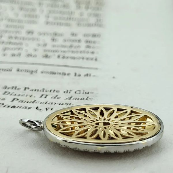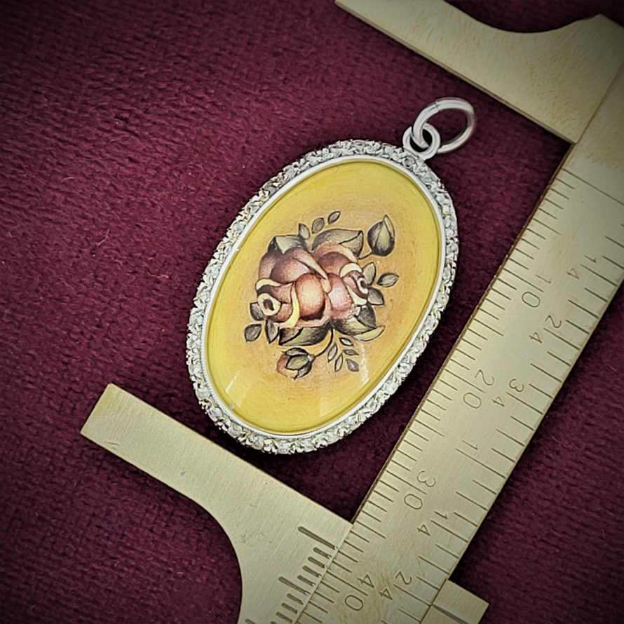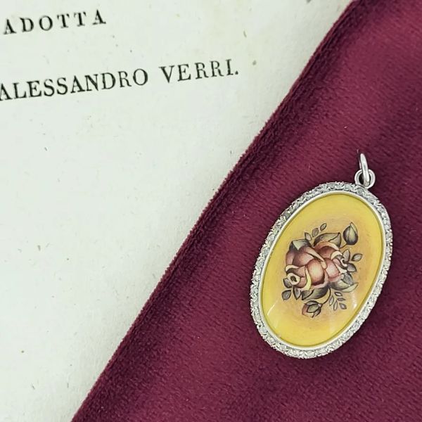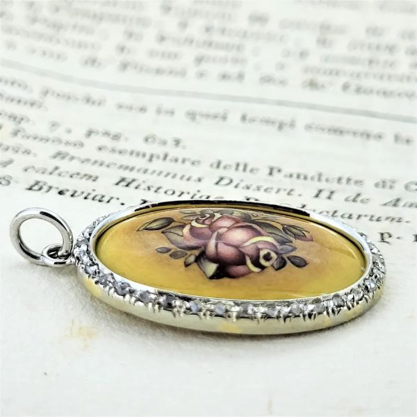 This is such a pretty pendant. A diamond border surrounds beautifully hand drawn flowers displayed on an oval 18ct Gold canvas.