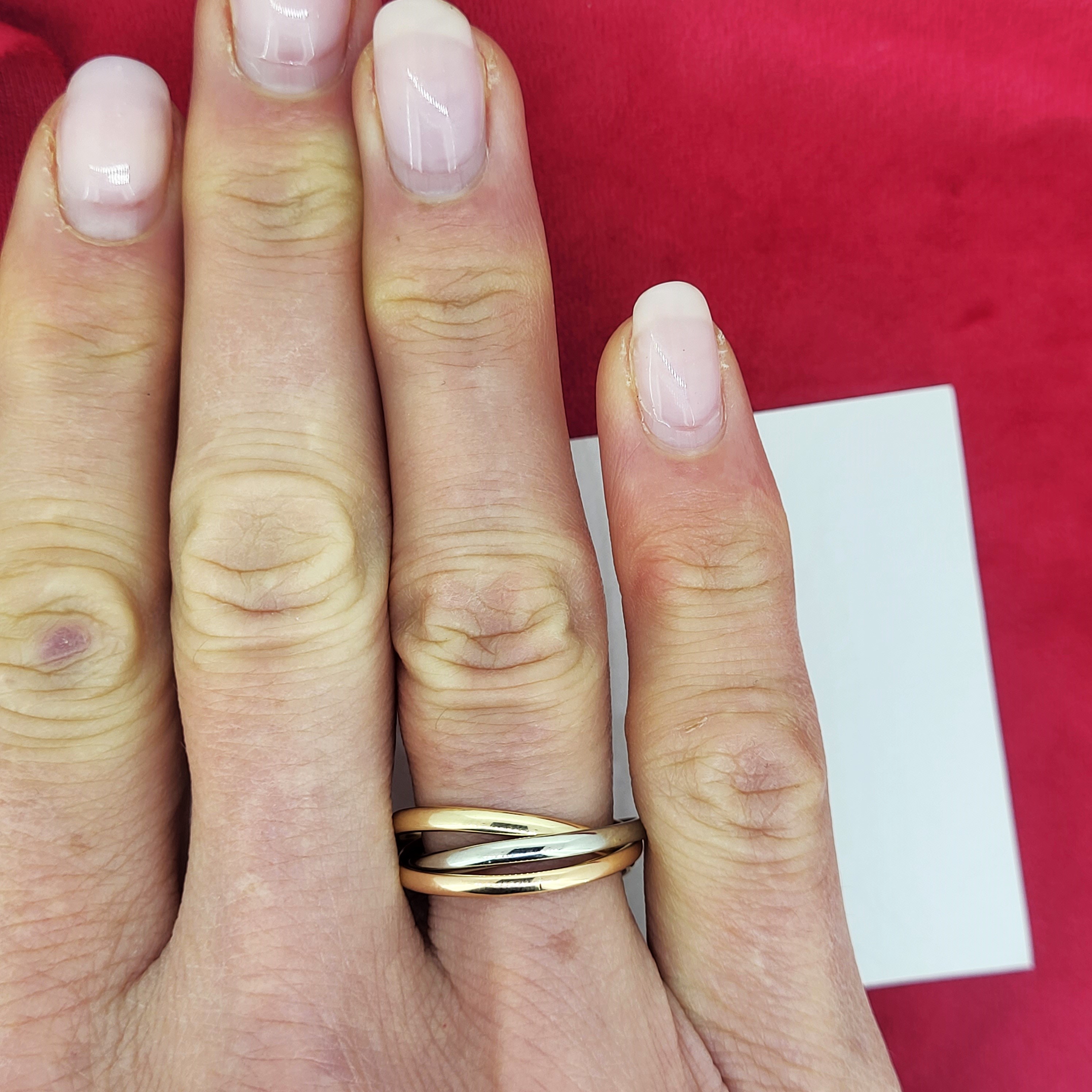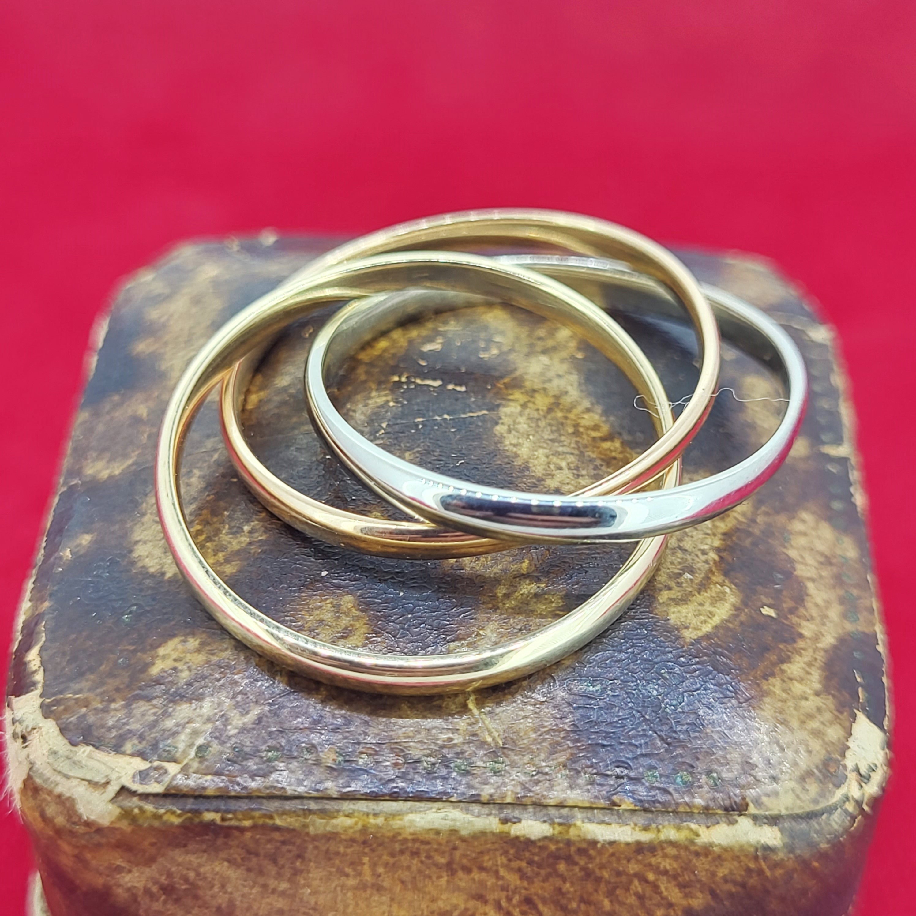 The ring comprises of three interlocking bands of Rose, White, and Yellow Gold. The three bands symbolise the symbolise the Father, Son and Holy Spirit or the past, present, and future of the couple.