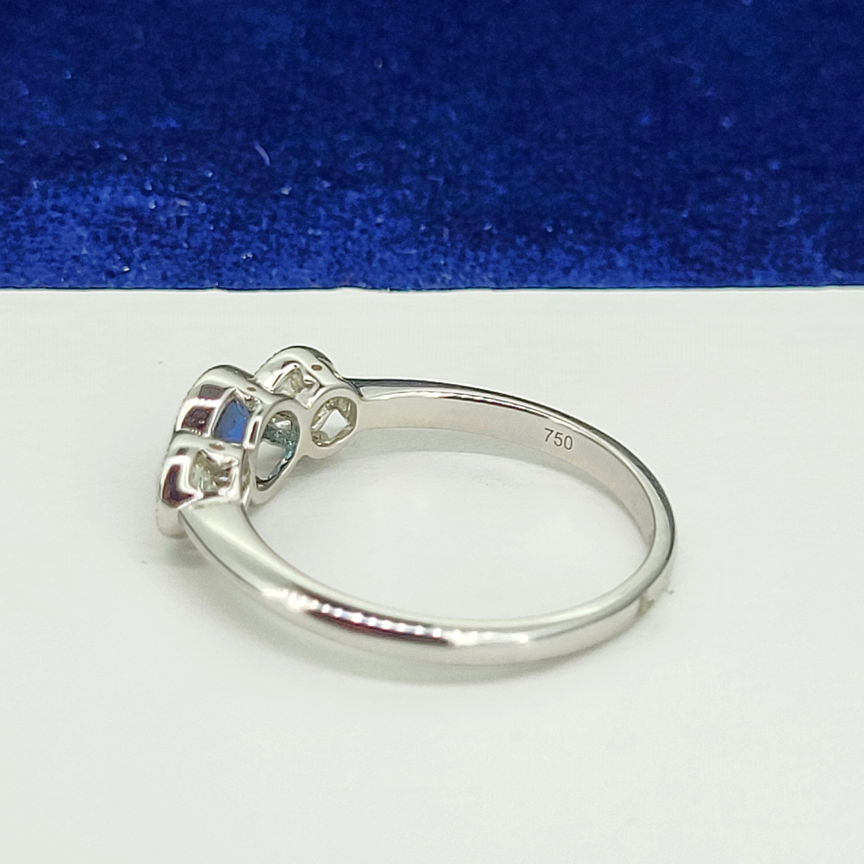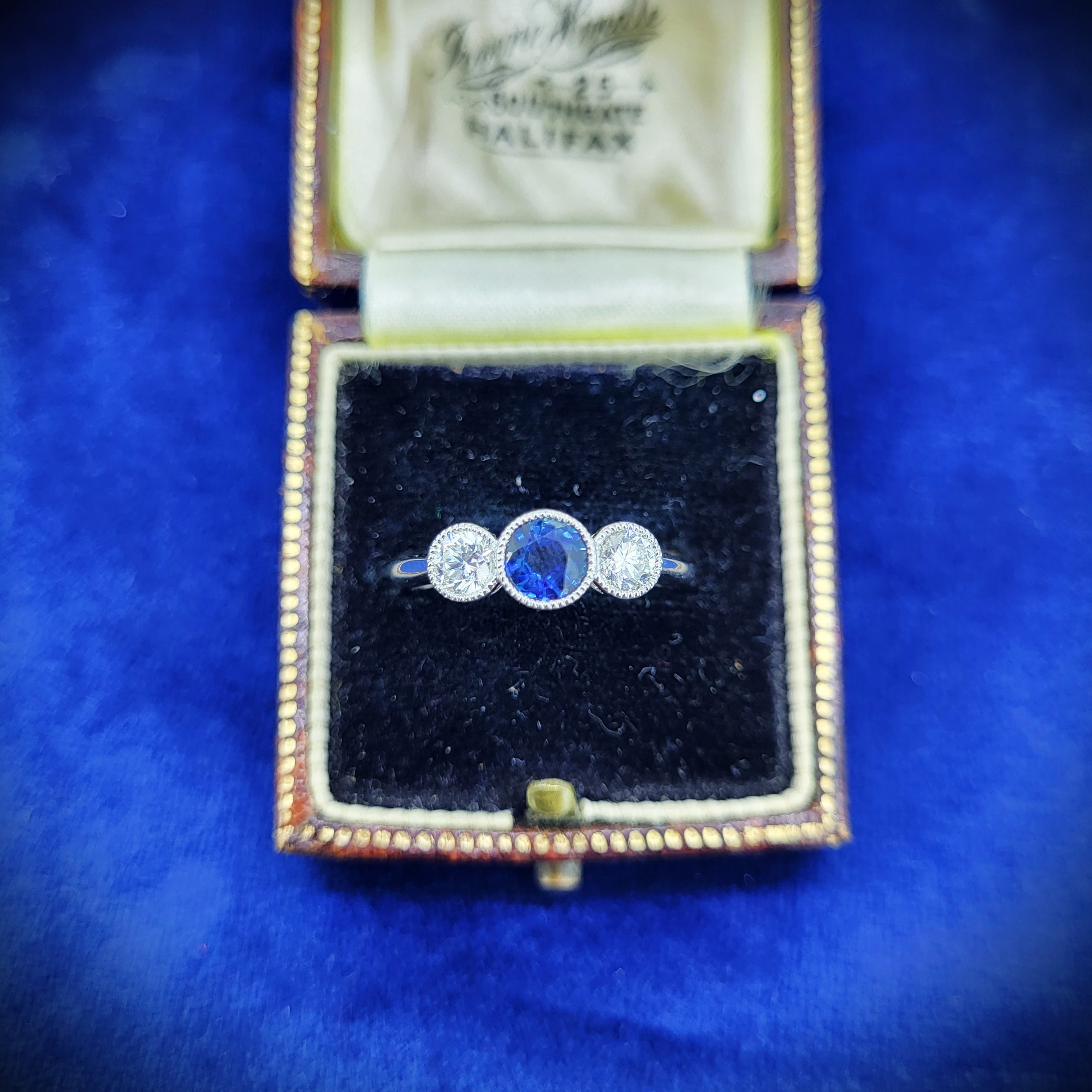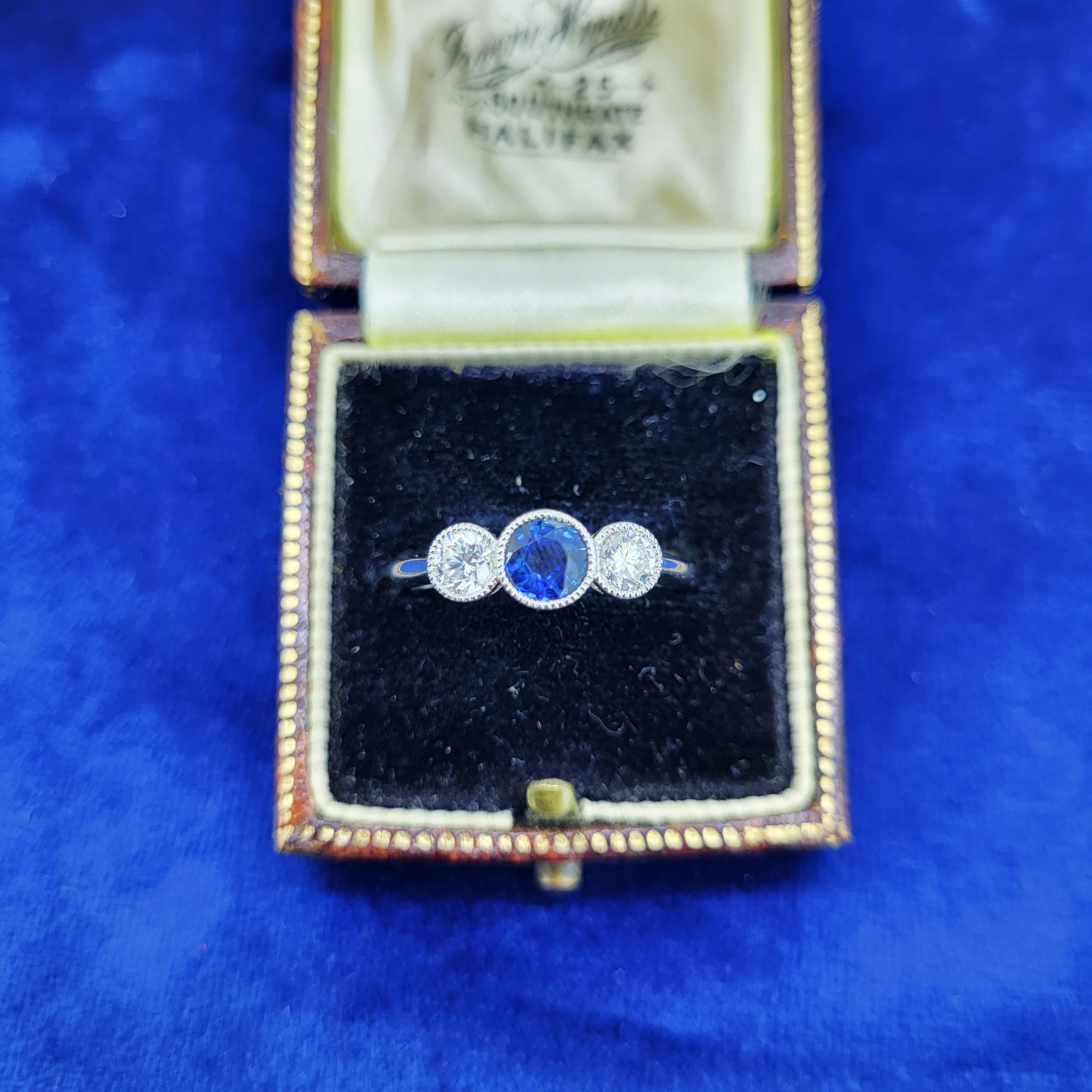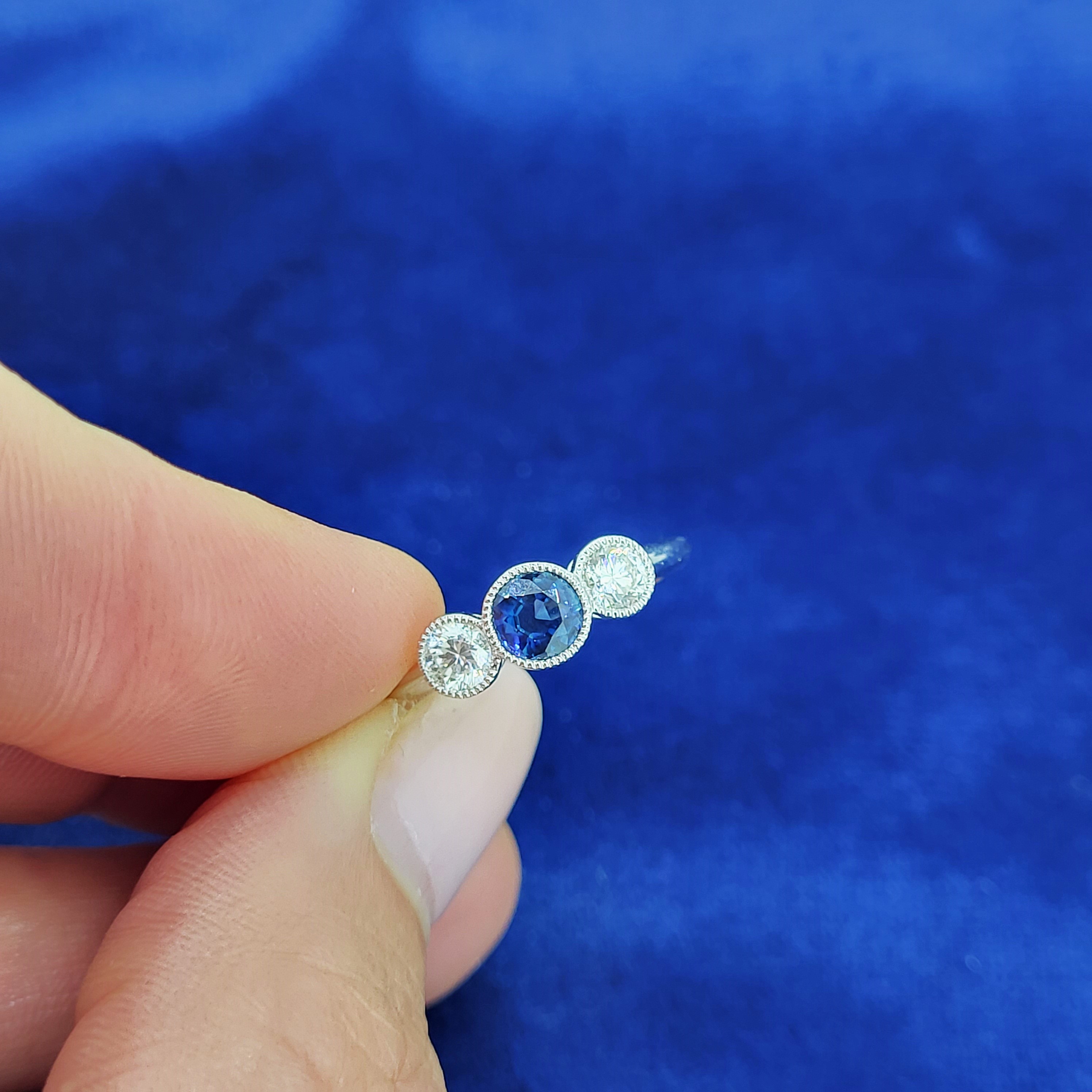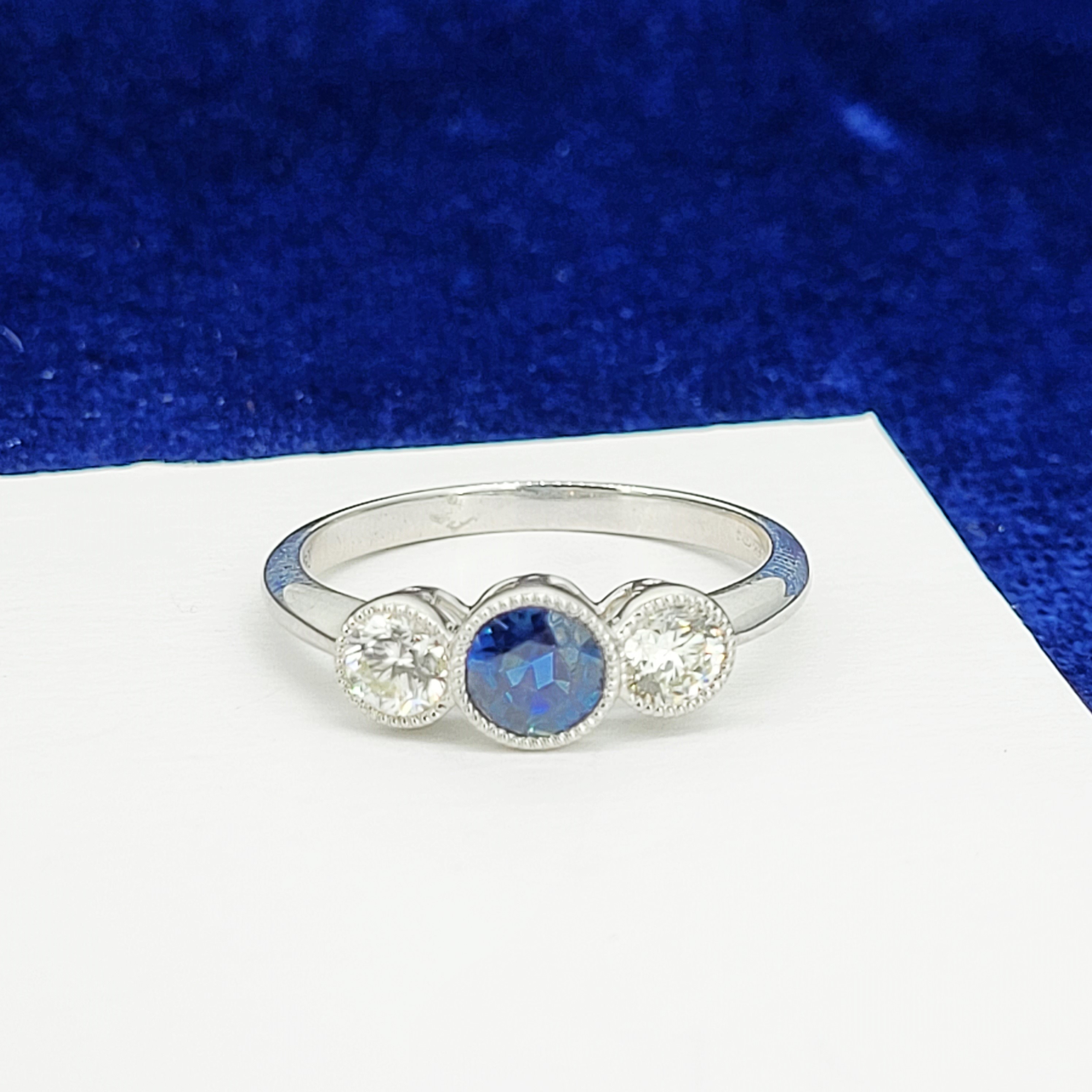 The ring features a vibrant Blue Sapphire in the centre weighing 0.60cts. The Sapphire is accompanied by a fiery Round Brilliant Diamonds either side. They weigh 0.25cts each giving this ring an impressive 0.50ct total diamond weight.