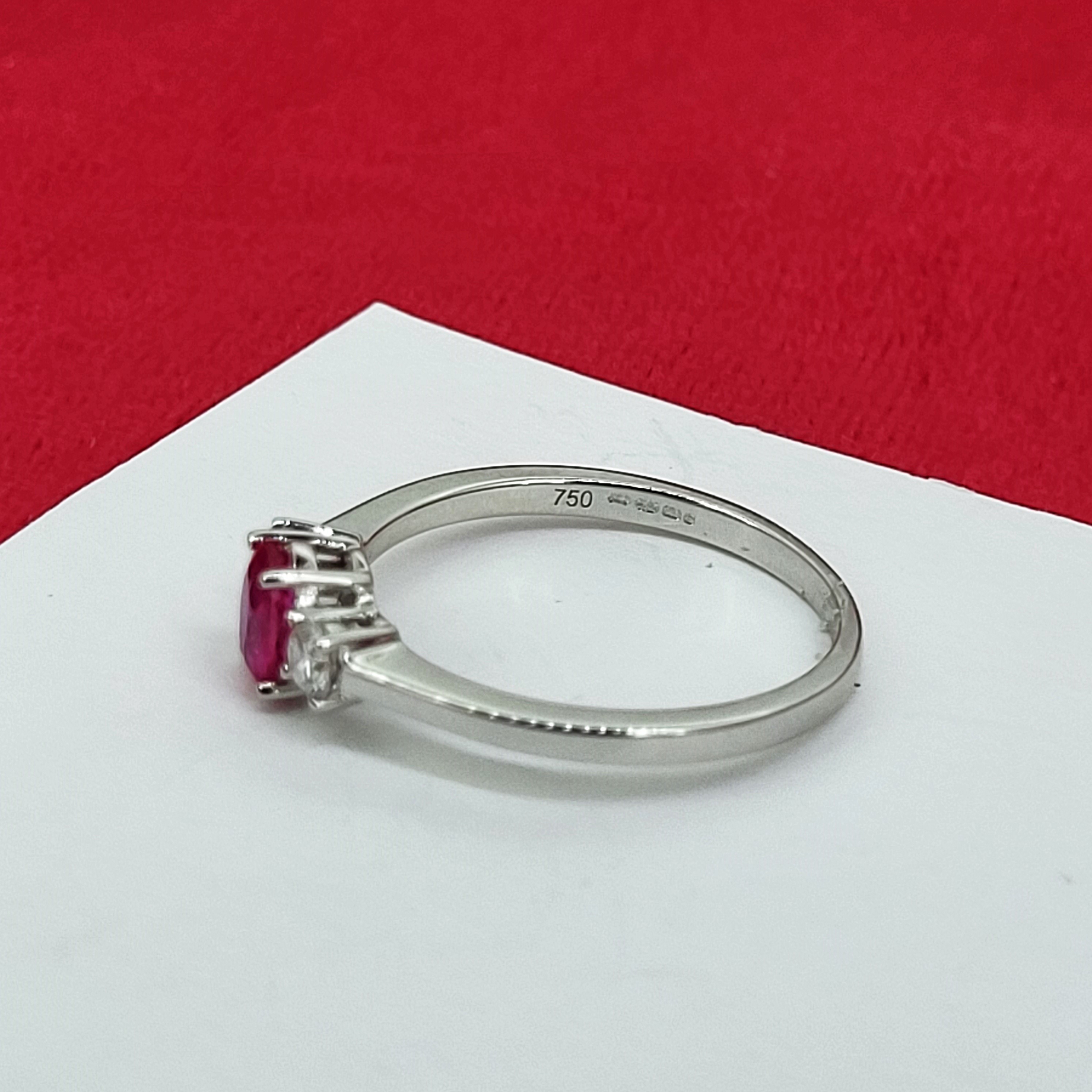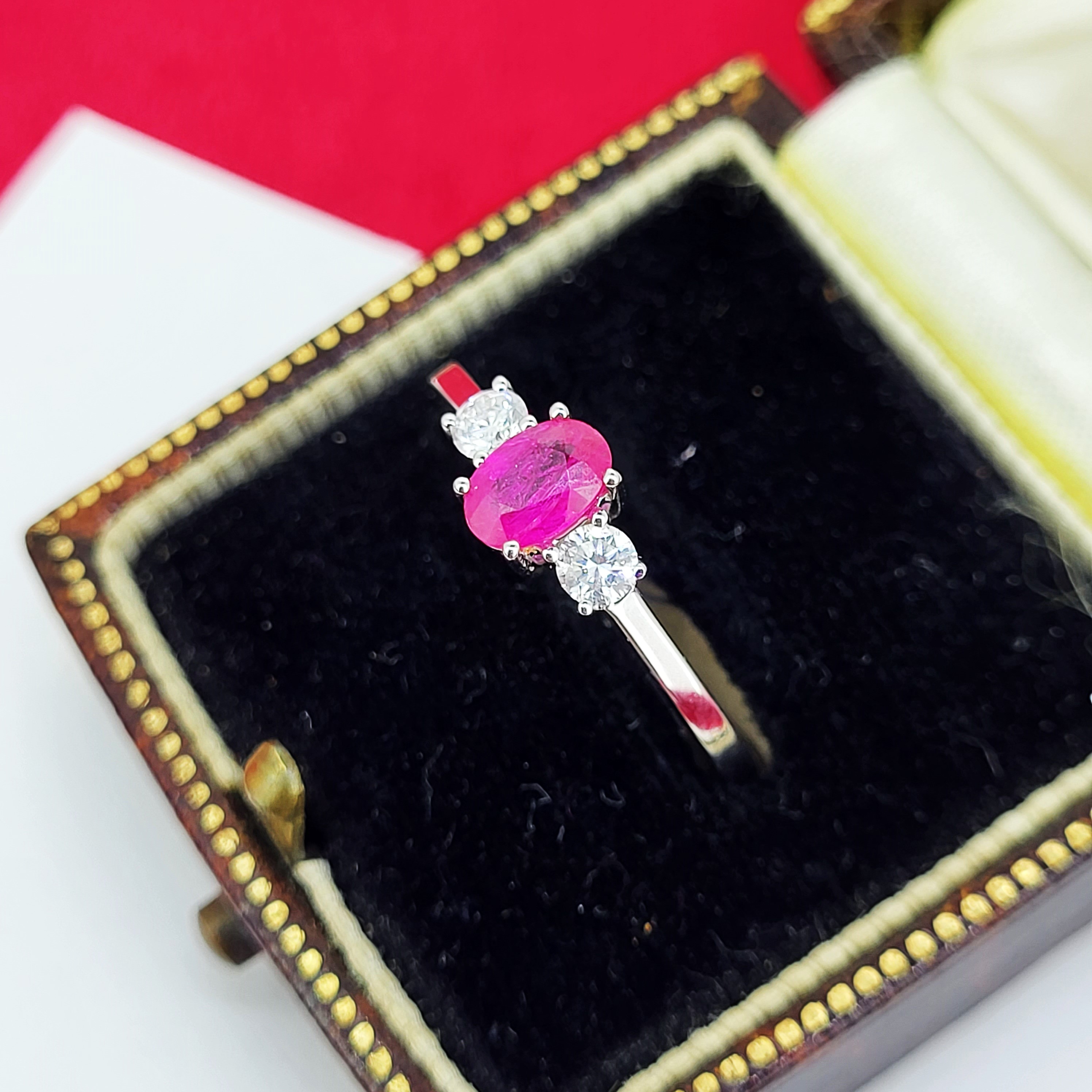 A beautiful Ruby and Diamond Three Stone Ring crafted from 18ct White Gold.