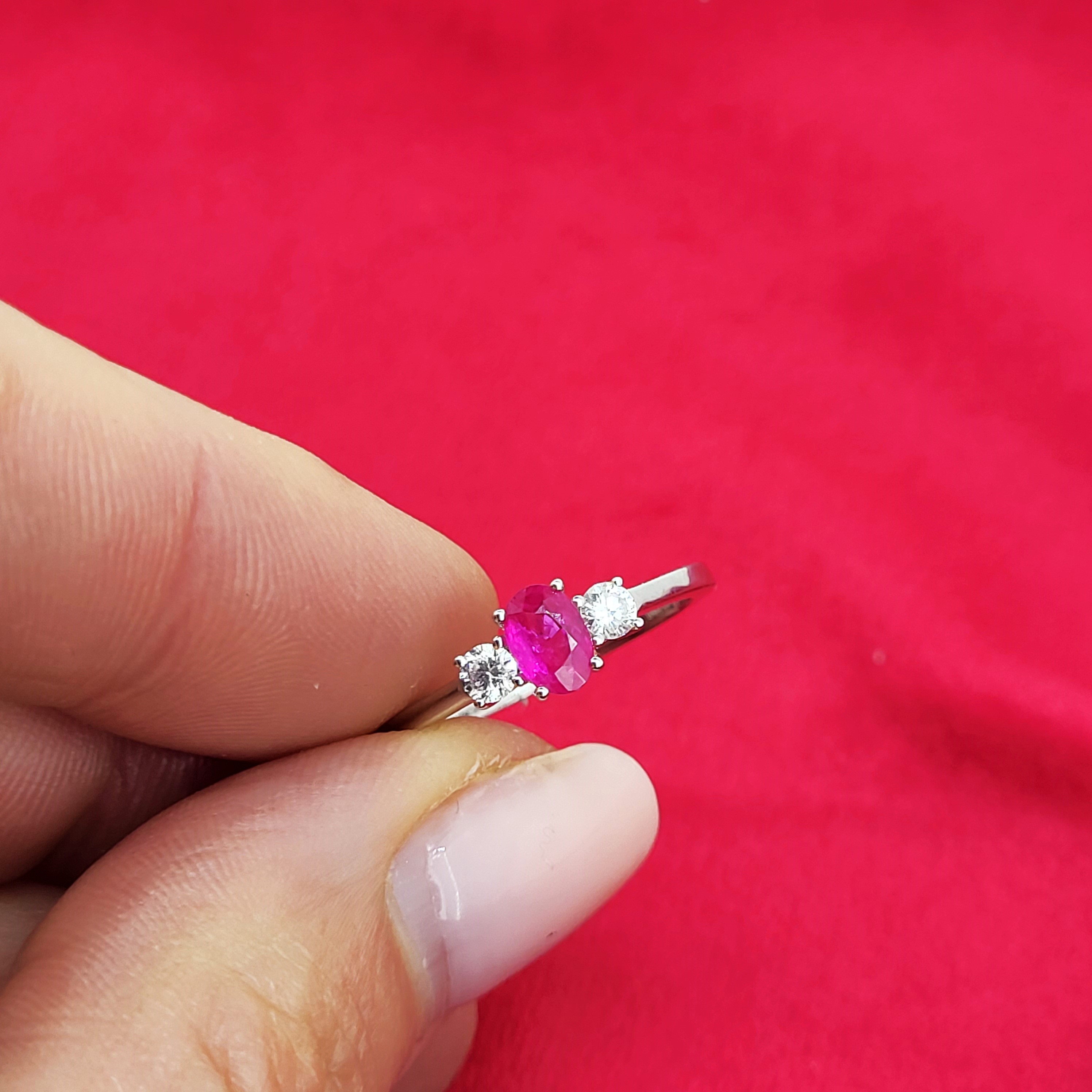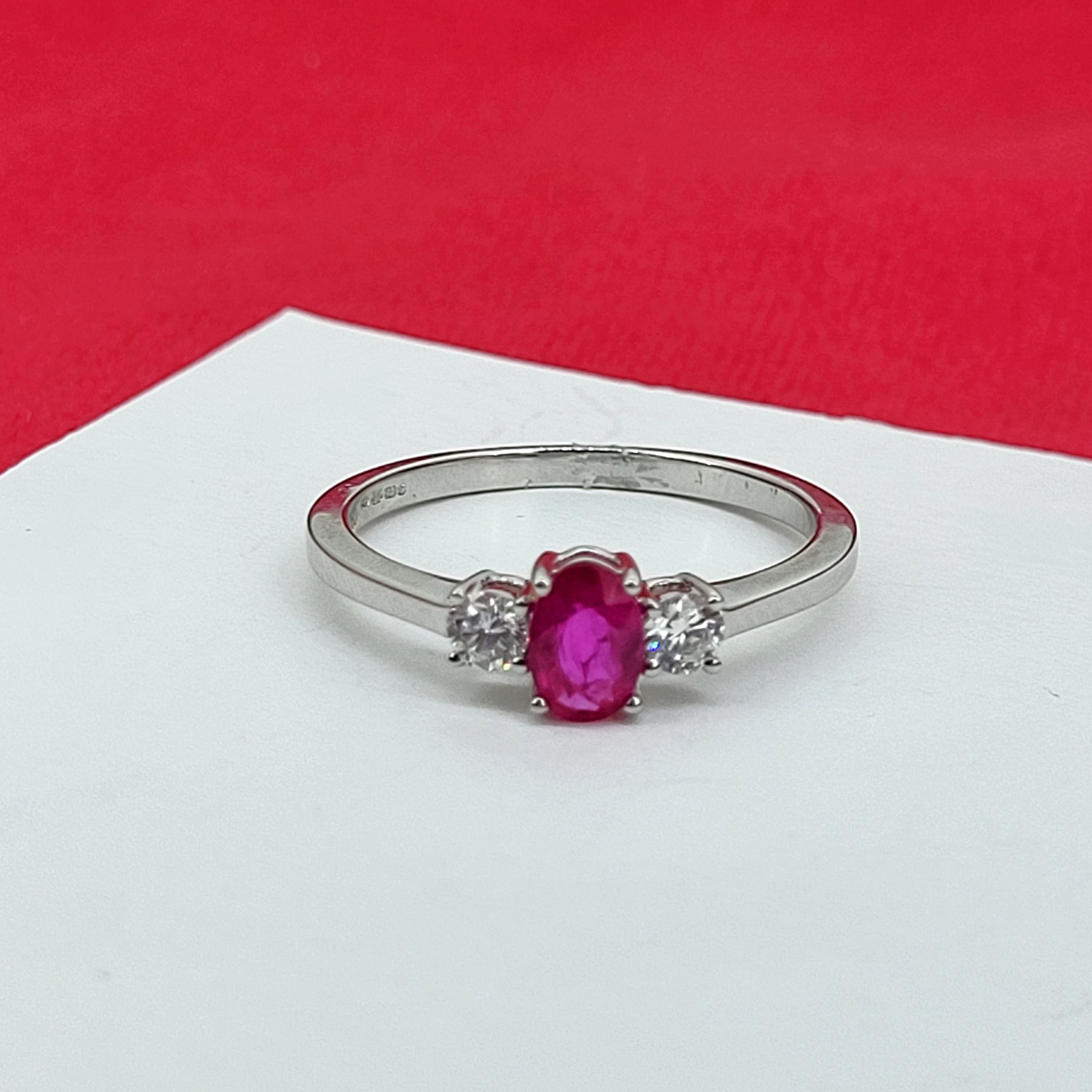 The features a central Oval Ruby which is a lovely pinky-red colour and weighs 0.65cts.