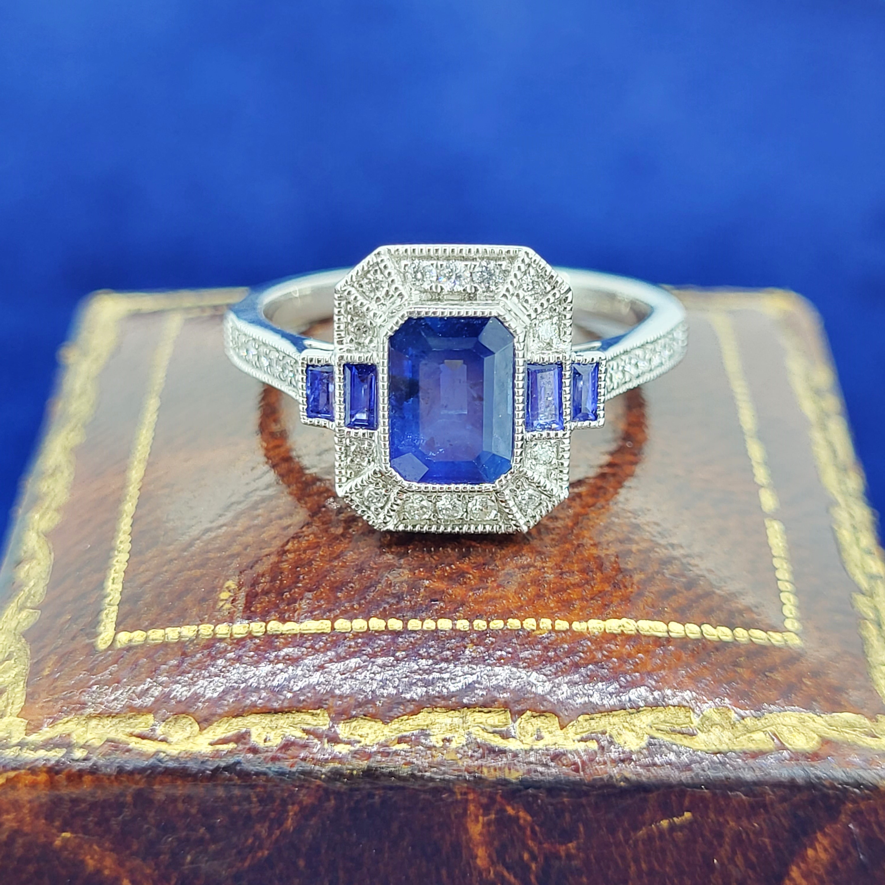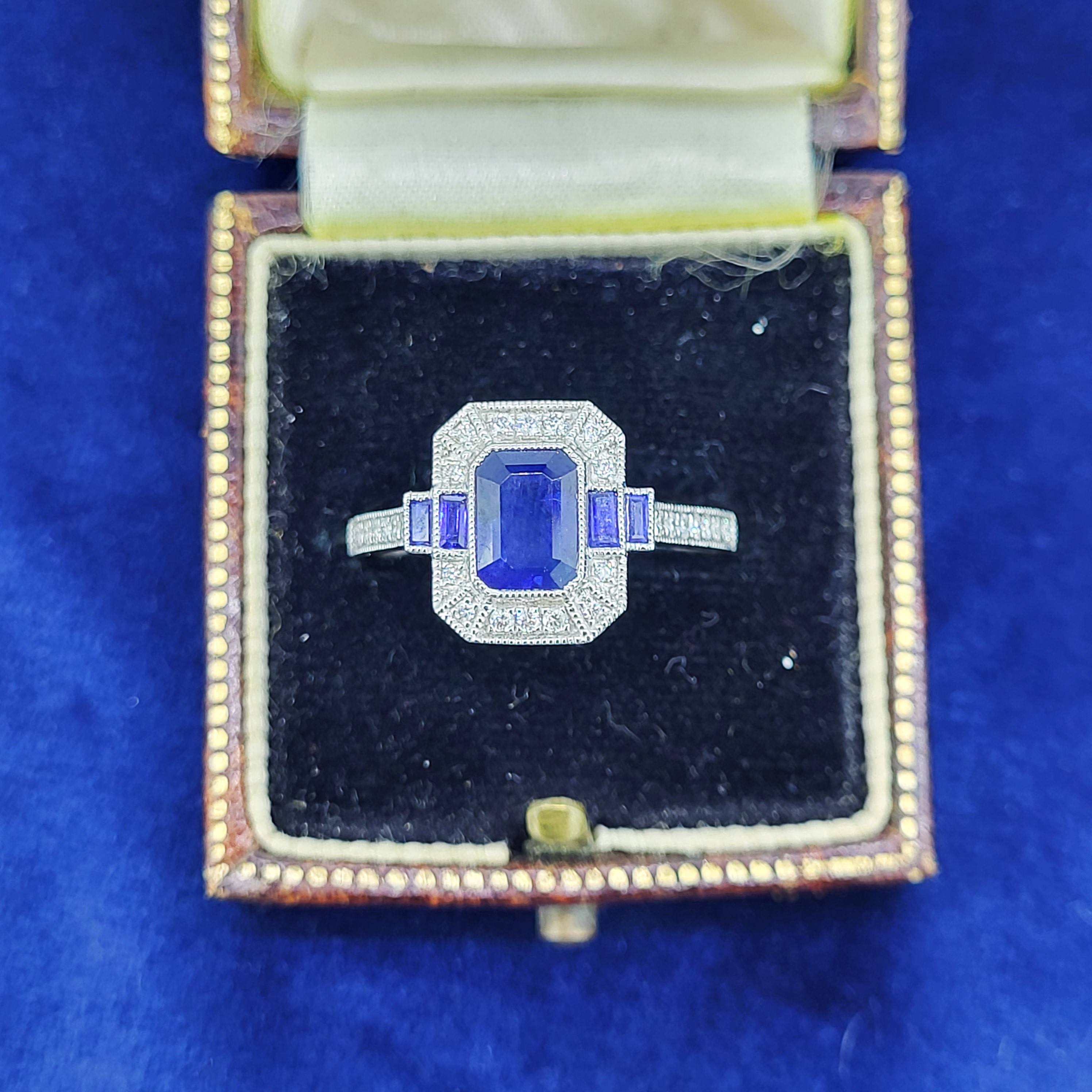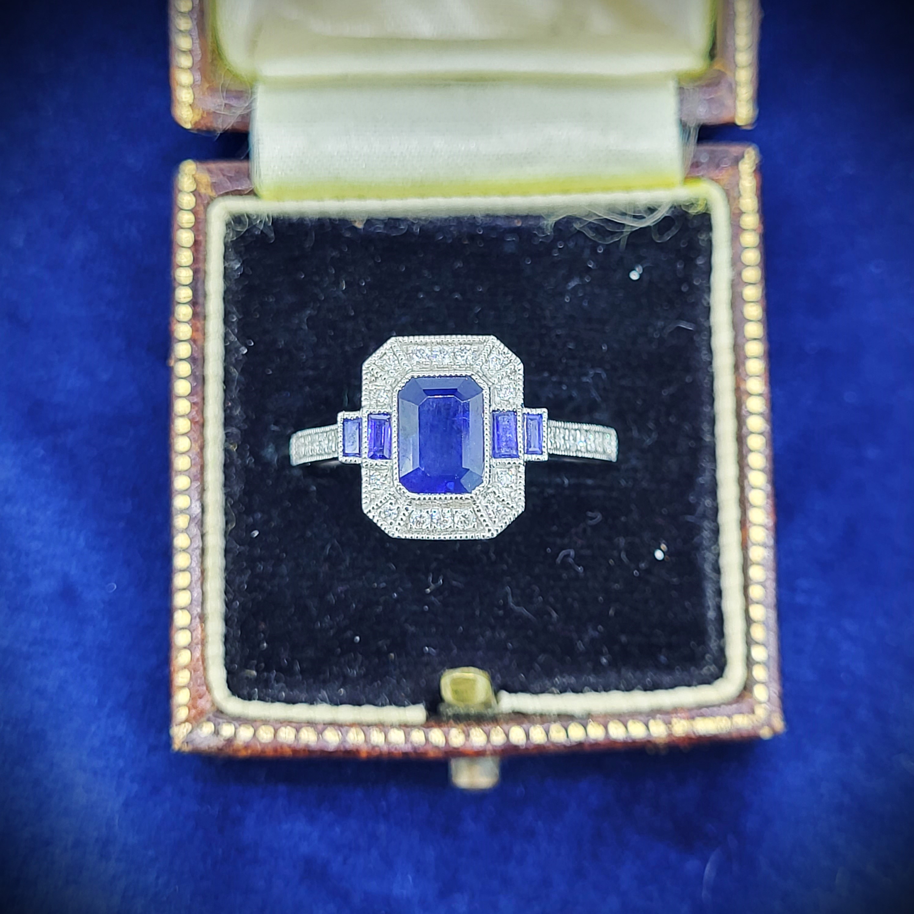 A striking Sapphire and Diamond Art Deco Ring crafted from 18ct White Gold.