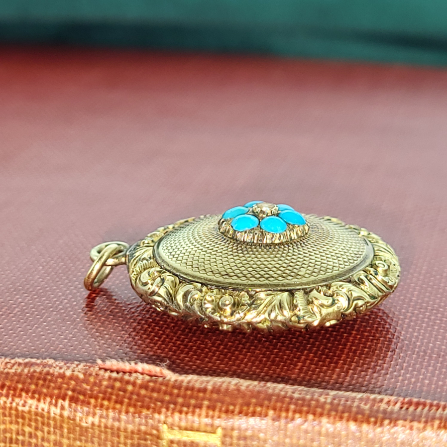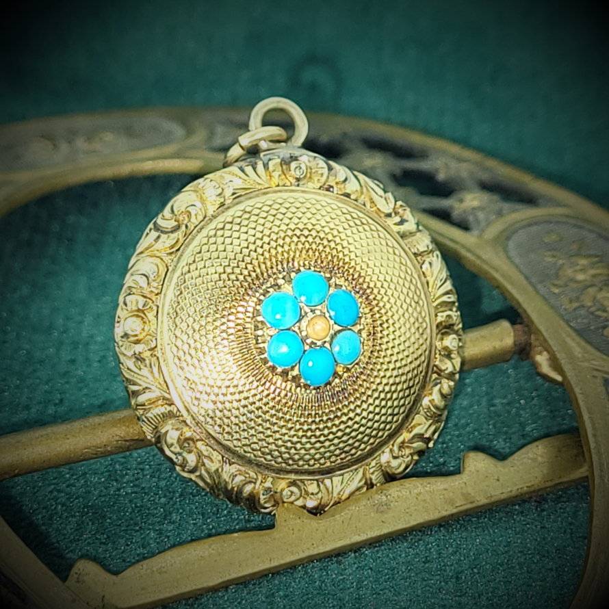 Circa 1870s this beautiful Mourning Locket has ornate engraving and chasing, with Turquoise and Seed Pearls that form the central Forget-Me-Not design.