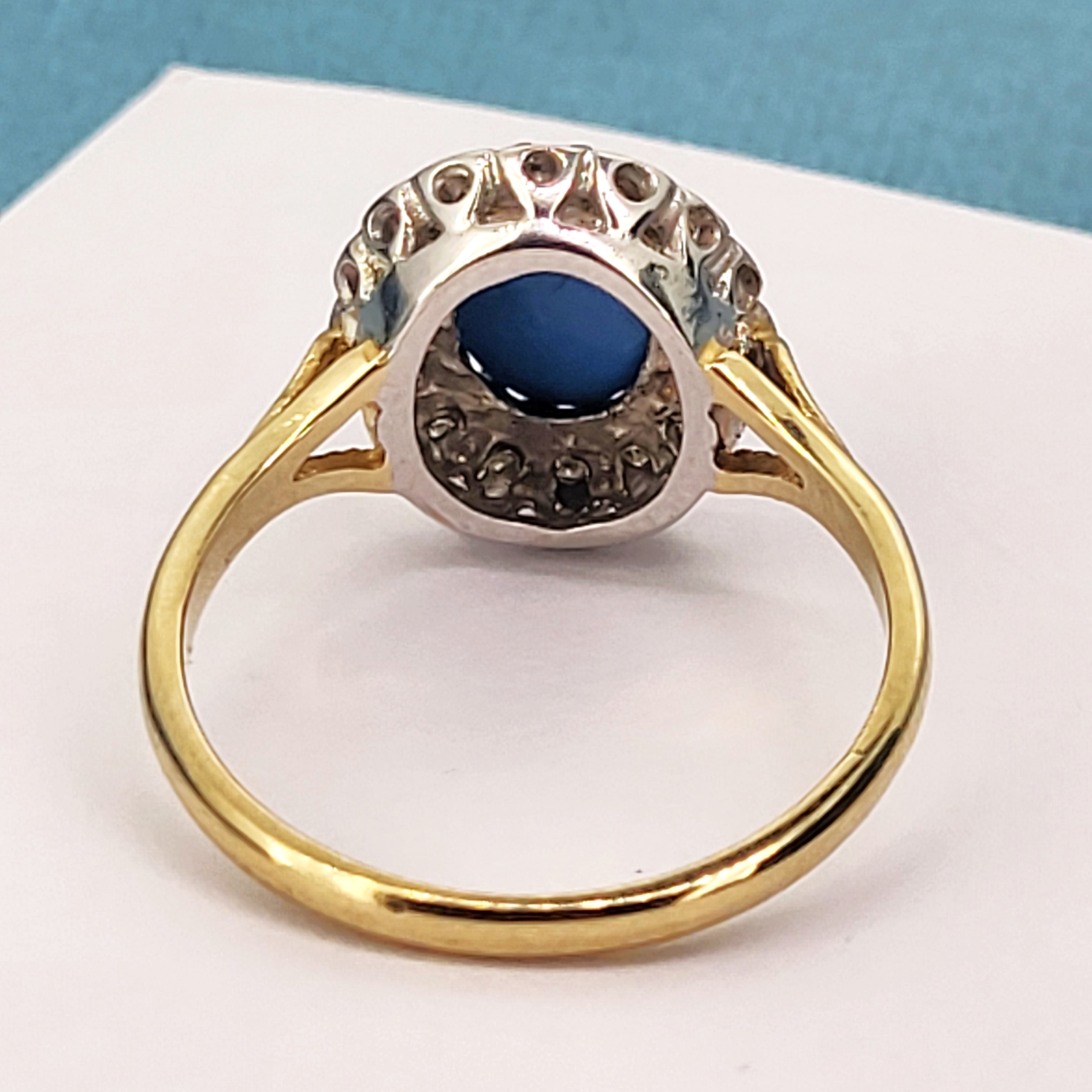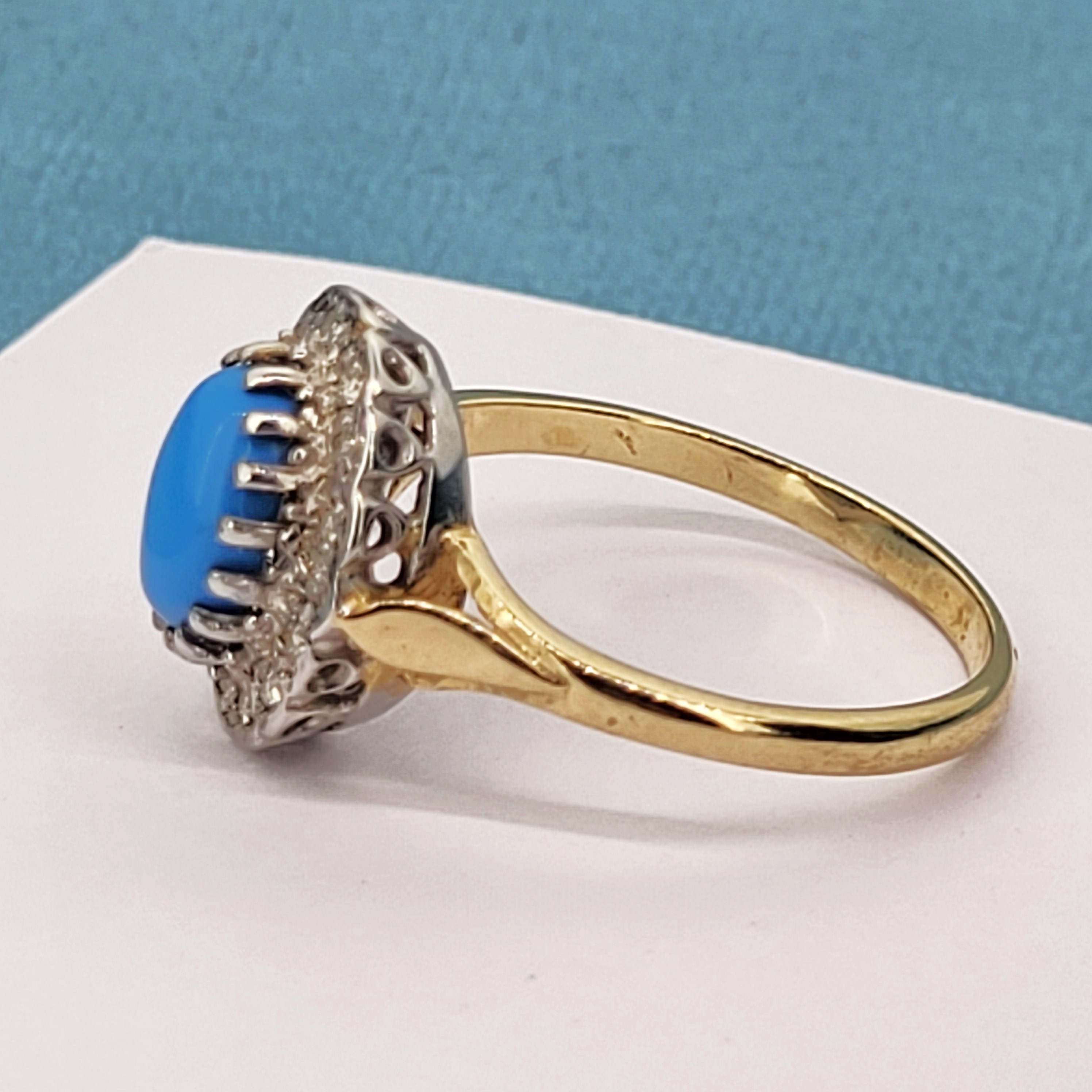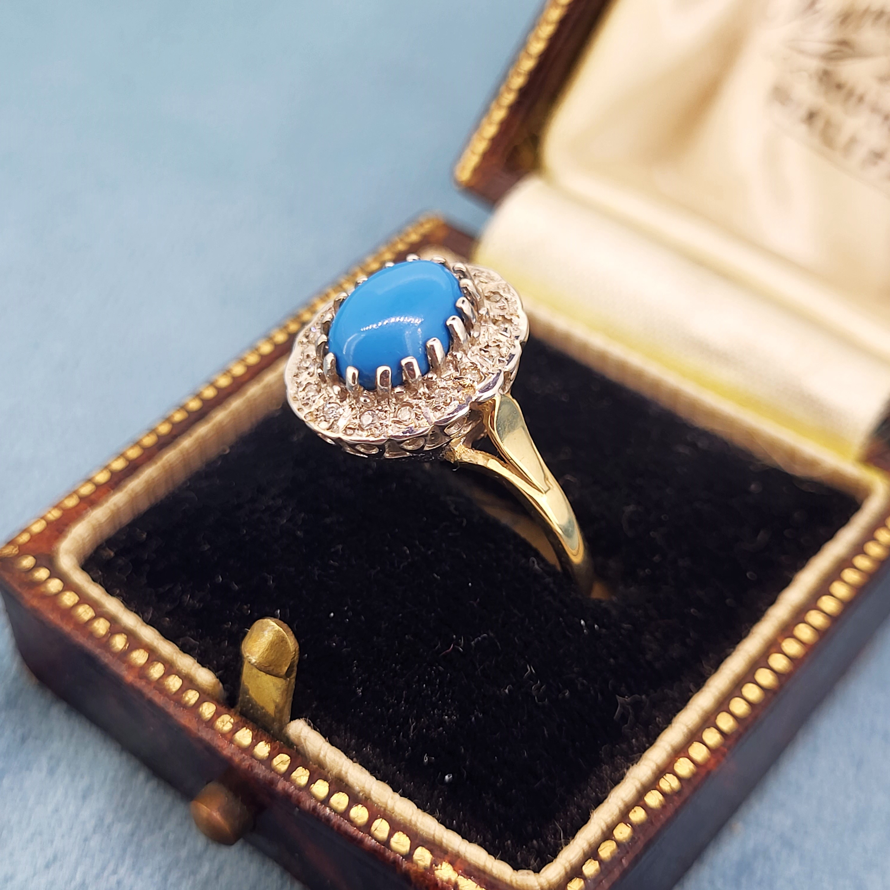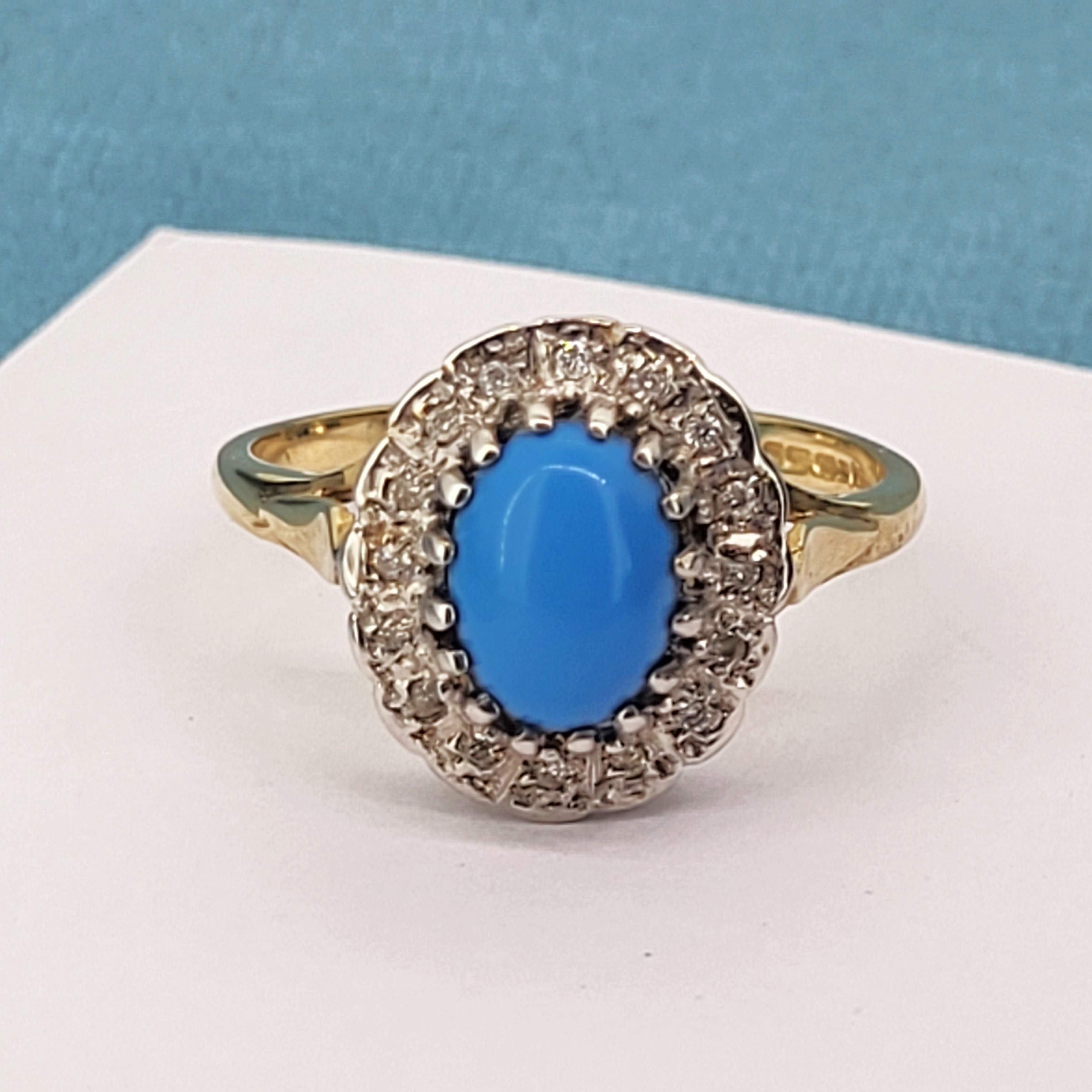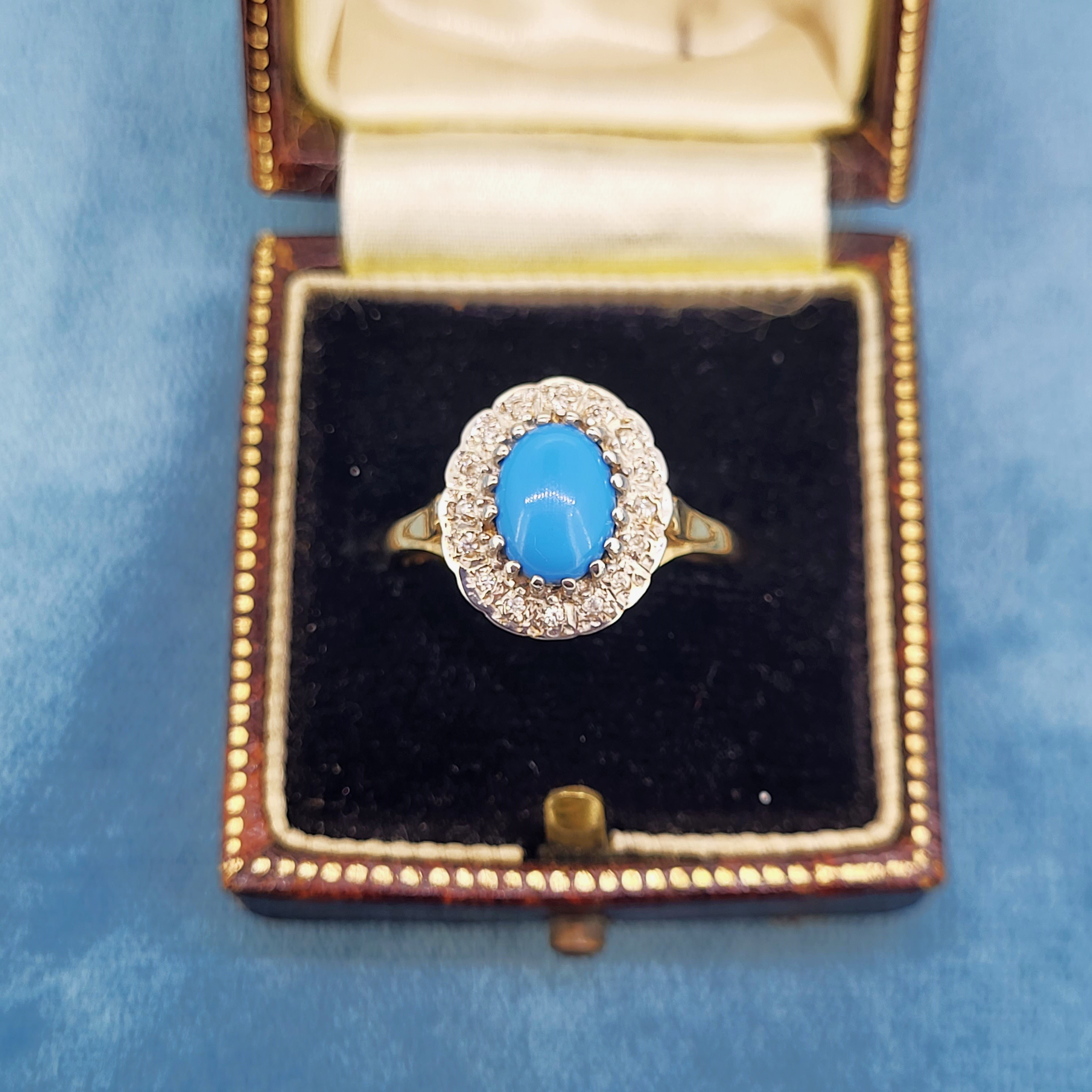 The ring has a Cabochon Turquoise set in the centre that measures 8mm by 6mm. It is surrounded by Round Brilliant Diamonds weighing 0.12cts.