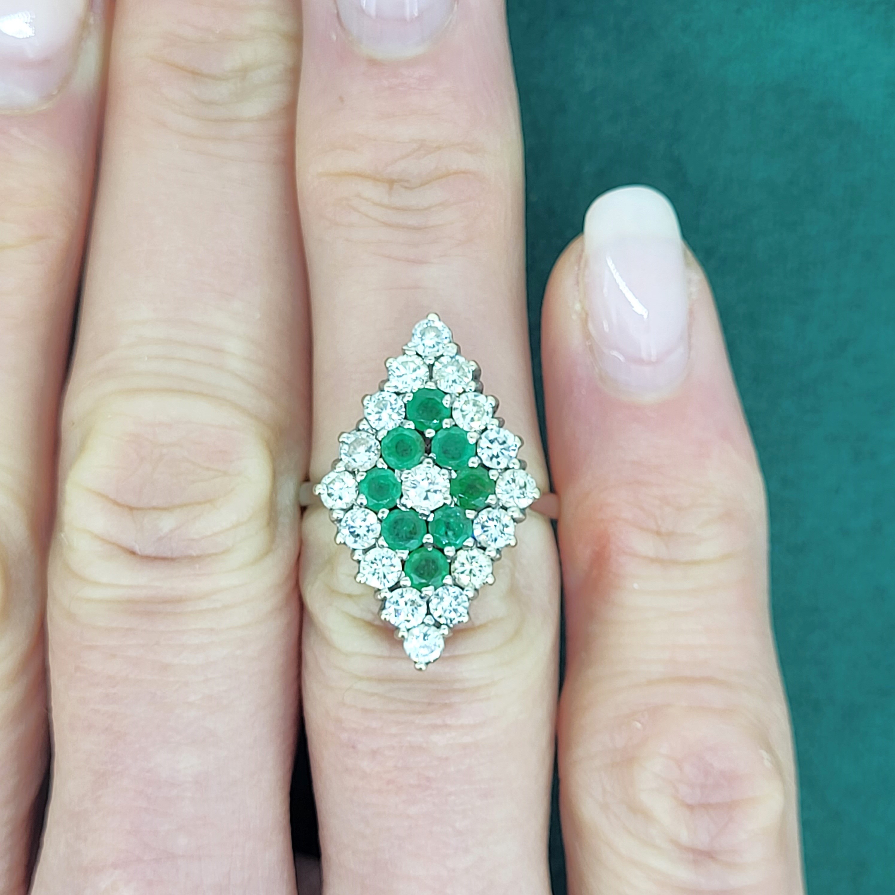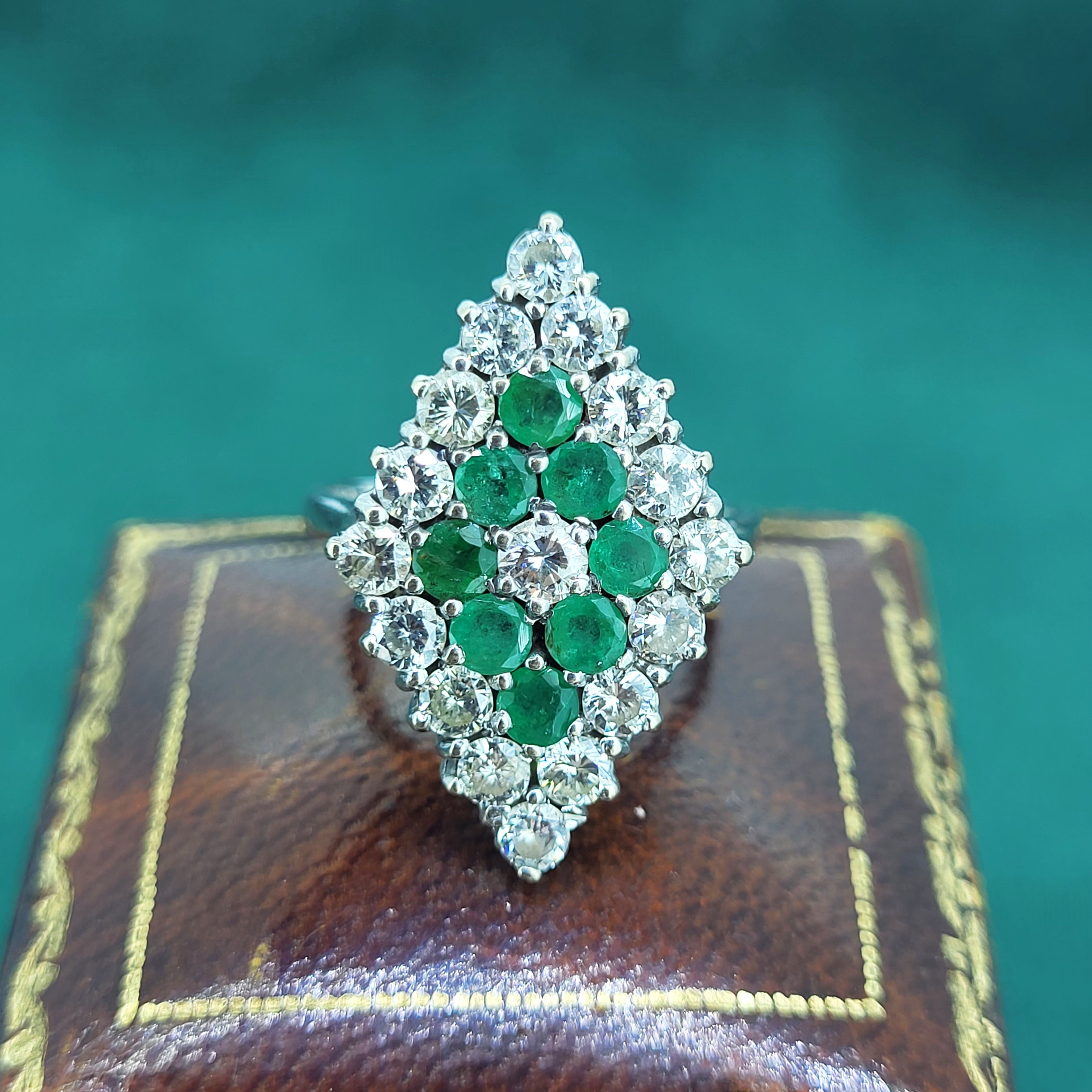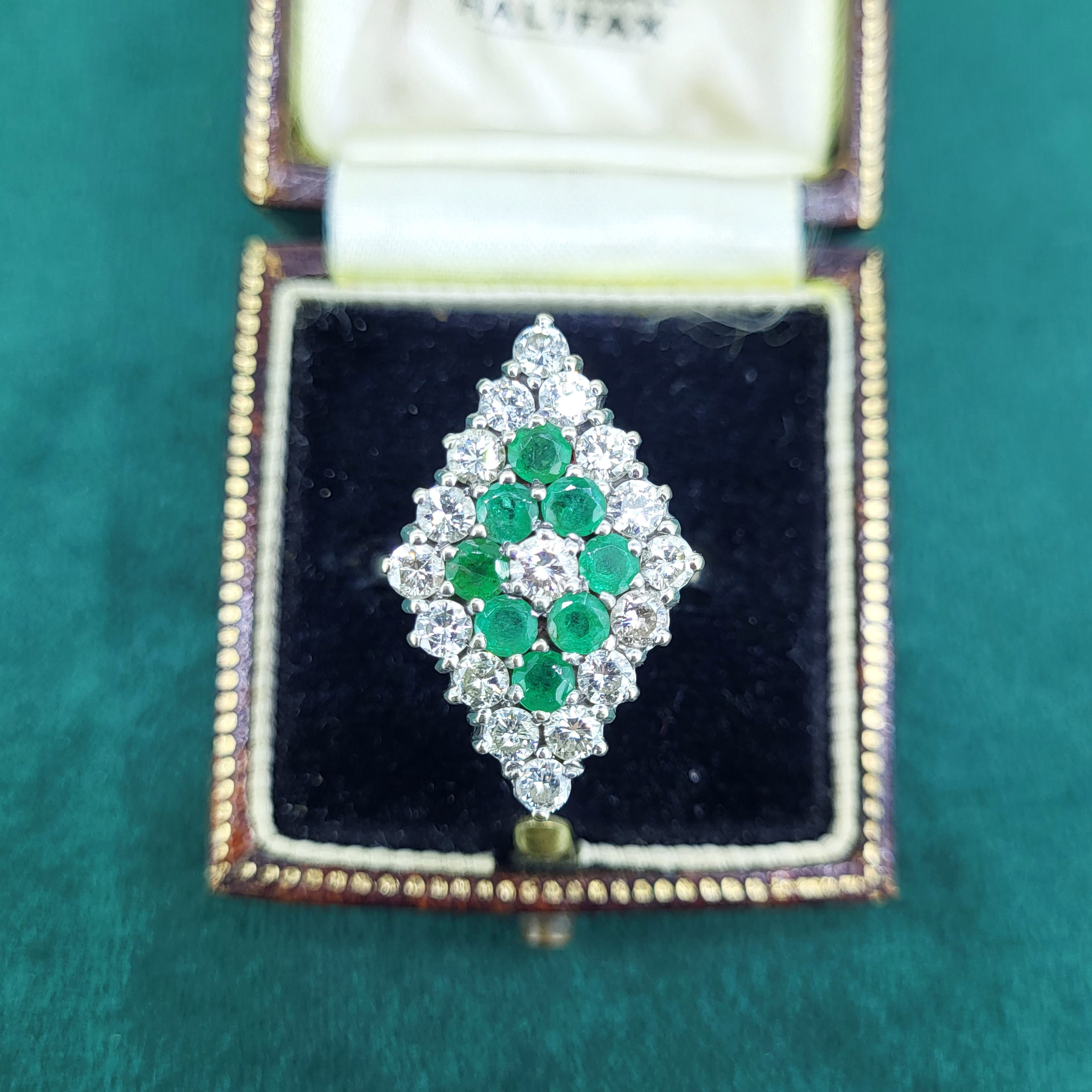 The ring features Round Brilliant Emeralds and Diamonds claw set into a diamond shape design that measures 24mm by 17mm. The Diamonds measure 3mm and weigh an estimated 1.70cts with the Emeralds also measuring 3mm and weighing an estimated weight of 1.00ct.