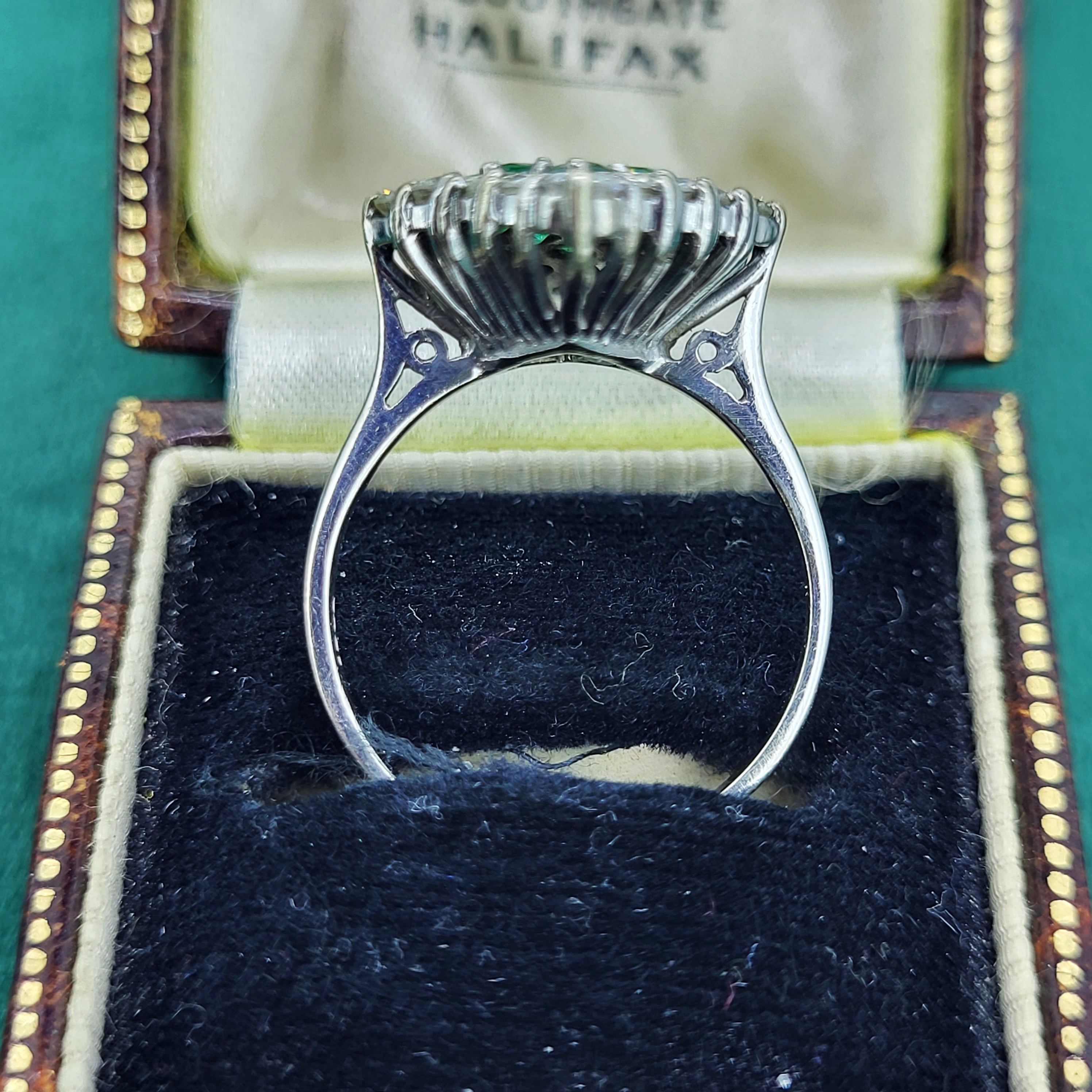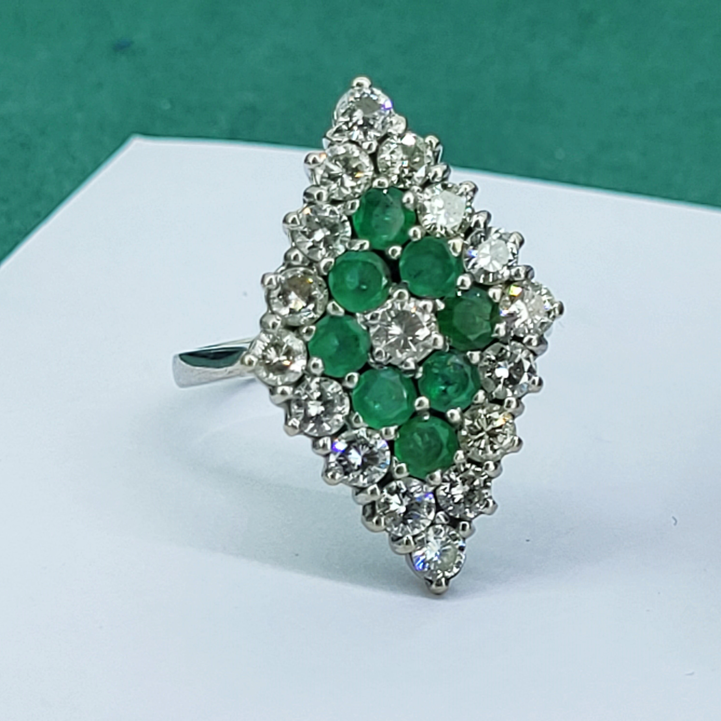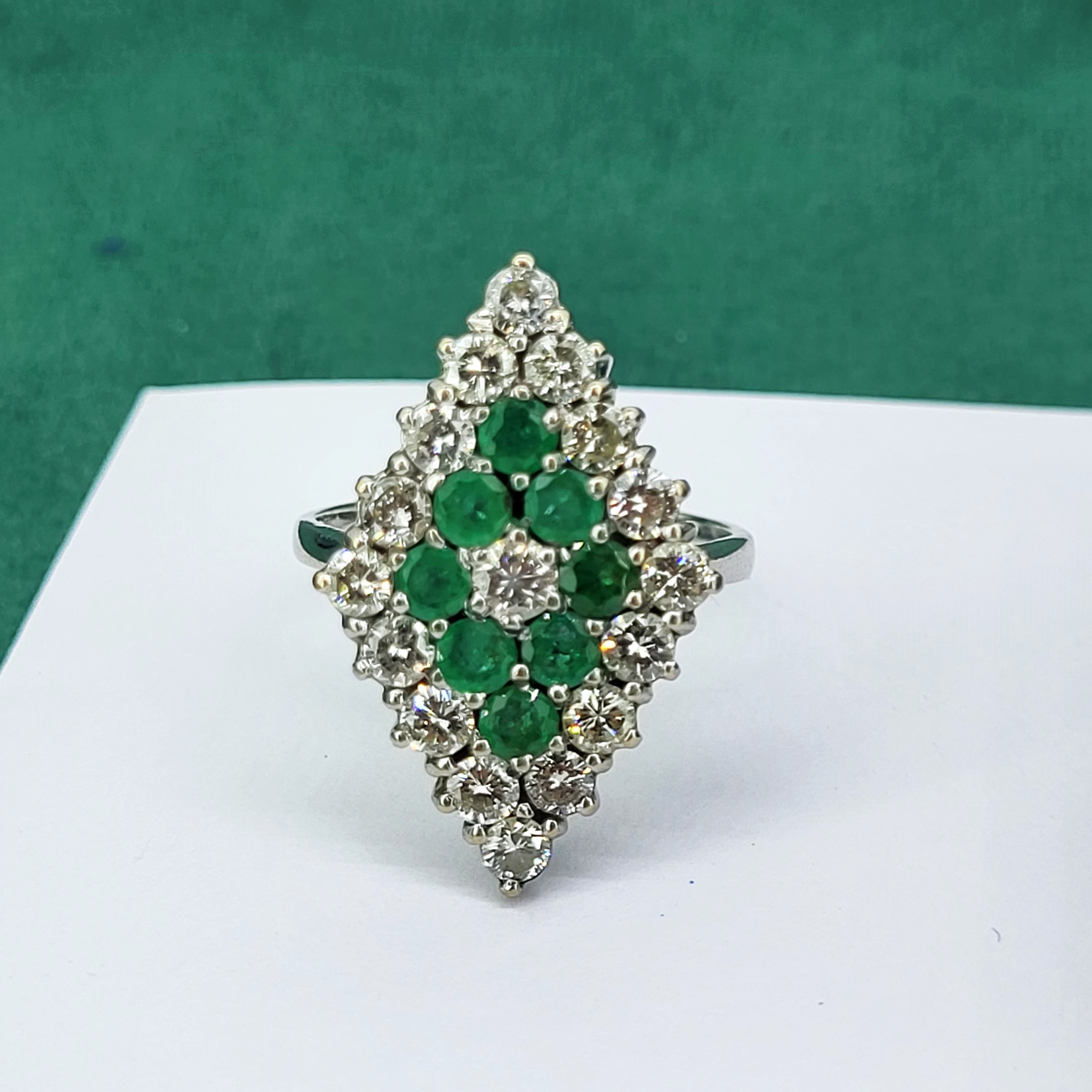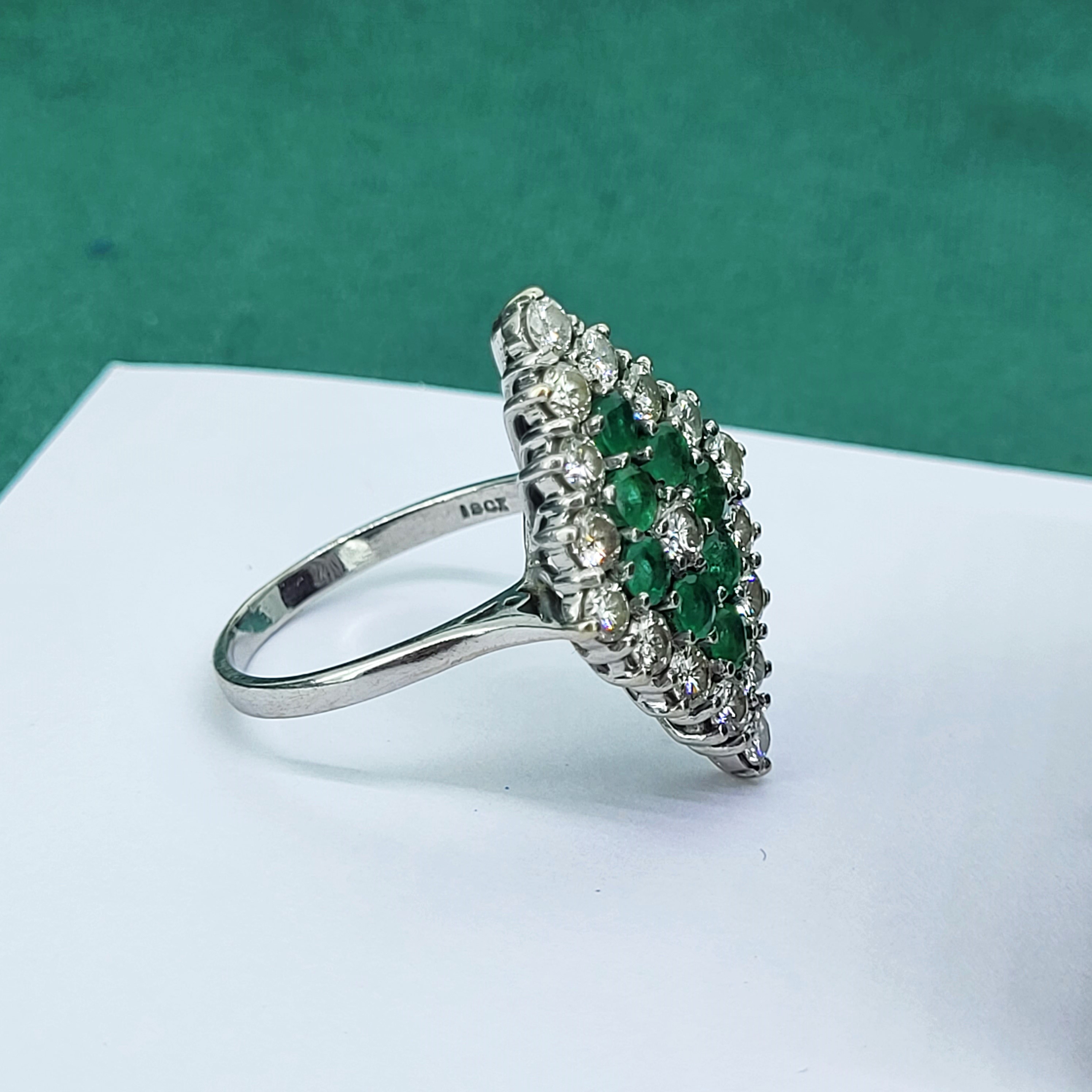 The ring features Round Brilliant Emeralds and Diamonds claw set into a diamond shape design that measures 24mm by 17mm. The Diamonds measure 3mm and weigh an estimated 1.70cts with the Emeralds also measuring 3mm and weighing an estimated weight of 1.00ct.